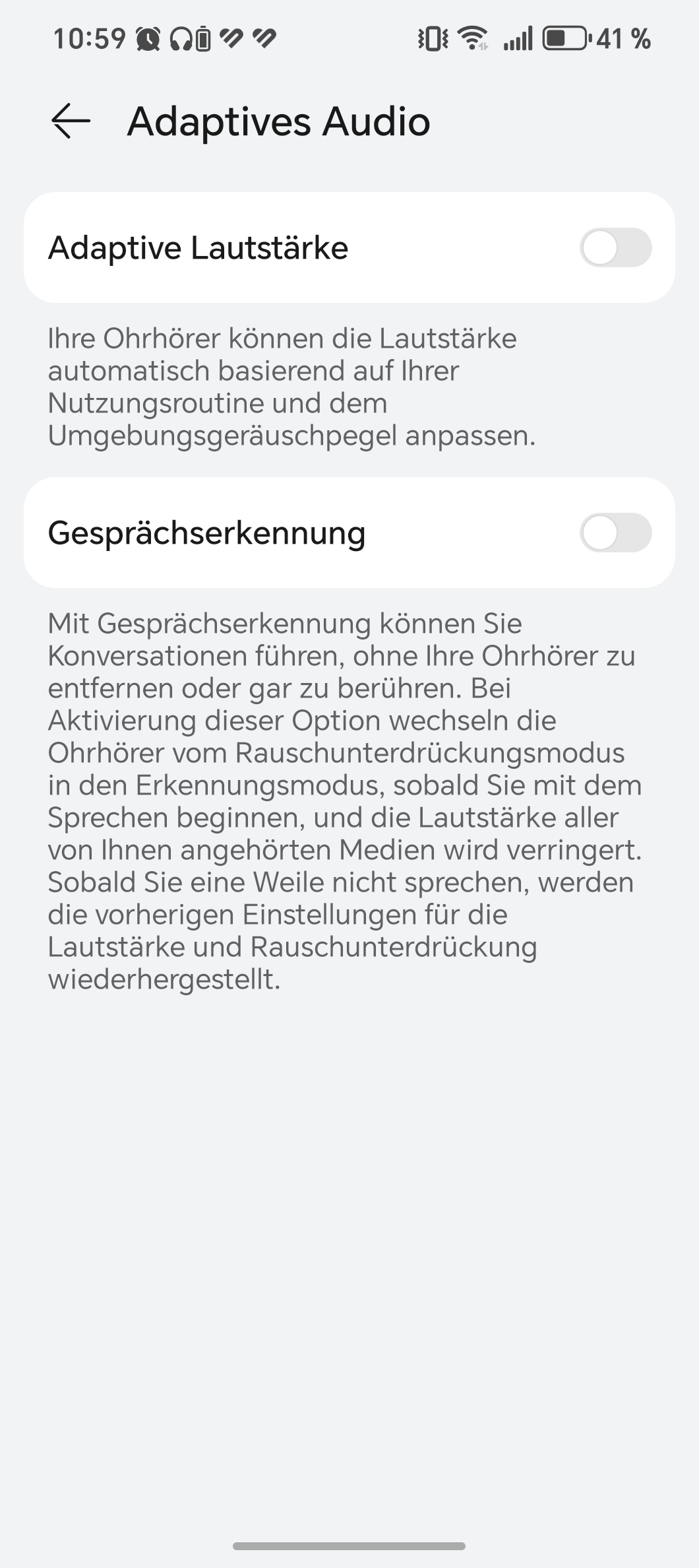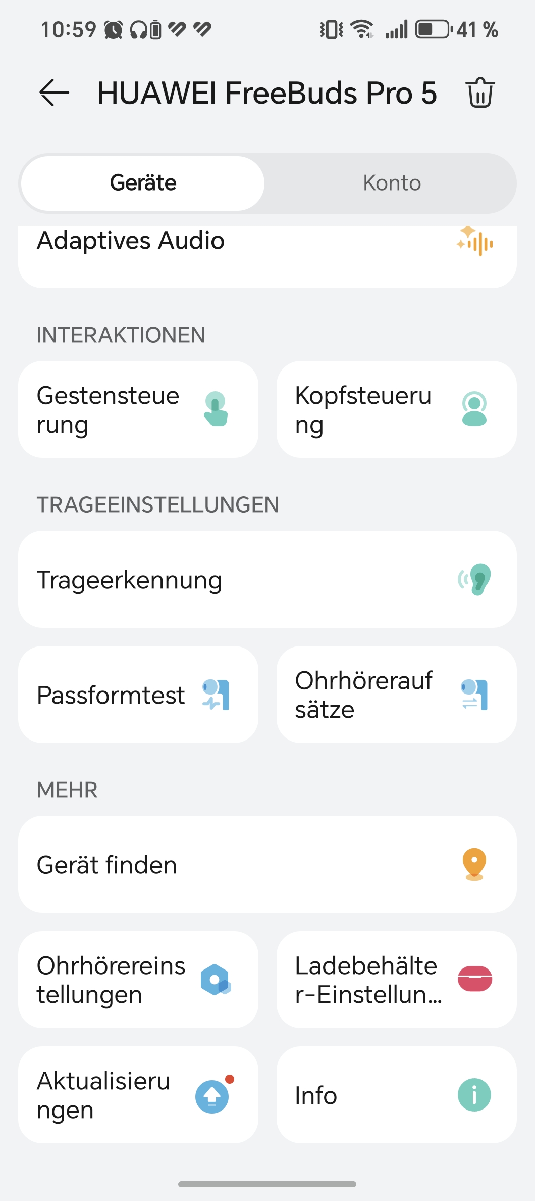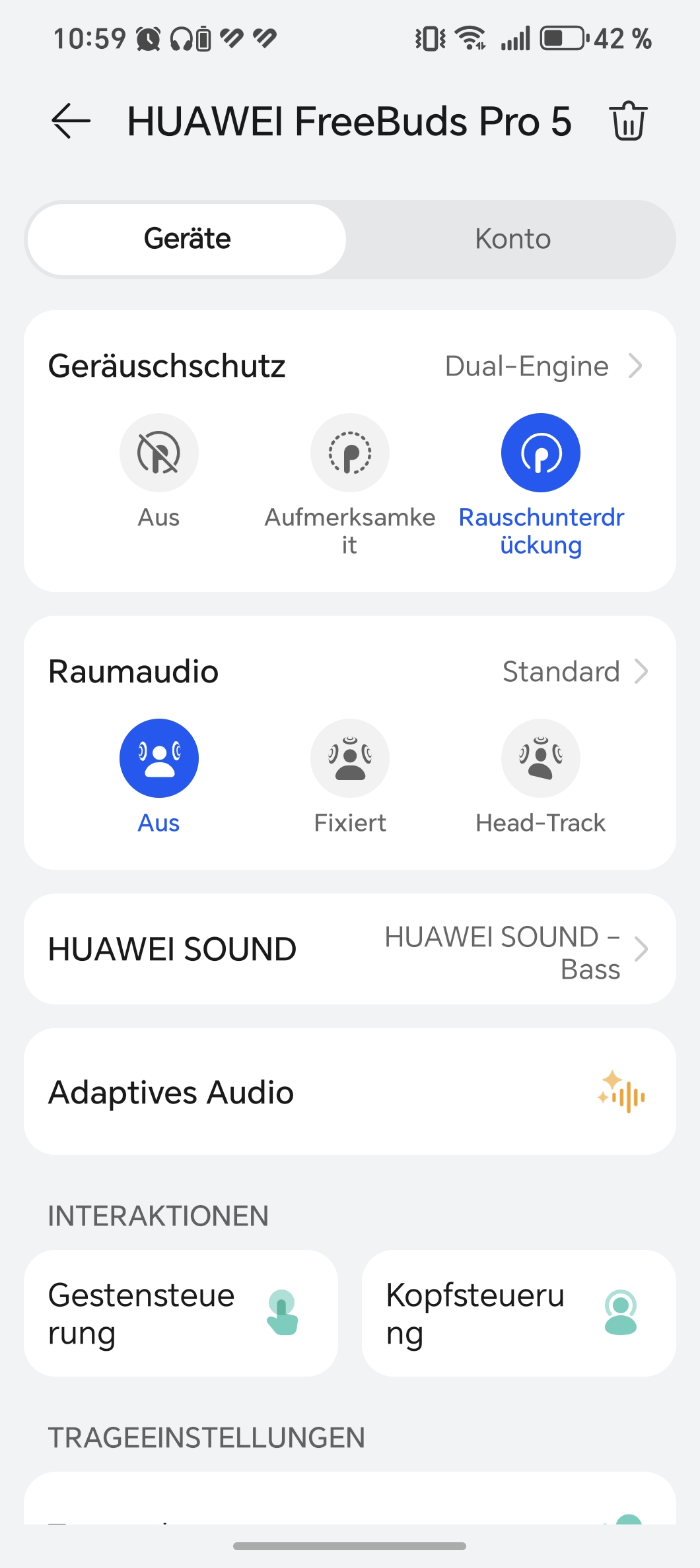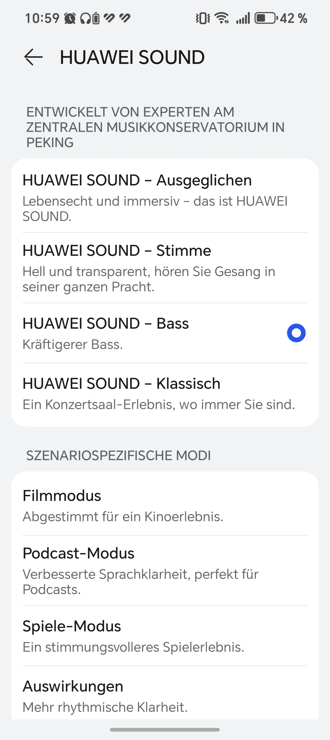 Eine App ist nicht zwingend nötig, aber empfehlenswert. Über „AI Life“ lassen sich Gesten anpassen und Extras freischalten – etwa die Kopfsteuerung, mit der man Anrufe per Nicken annimmt. Auch ein Sitztest für die Ohrhörer ist an Bord. Am Klang lässt sich in der App ebenfalls schrauben. Vier Profile stehen bereit: ausgewogen, stimmoptimiert, bassbetont sowie ein Modus für klassische Musik. Dazu kommen szenariospezifische Optionen für Filme, Spiele, Podcasts oder mehr rhythmische Klarheit – plus ein adaptiver Equalizer, der sich automatisch anpasst.
