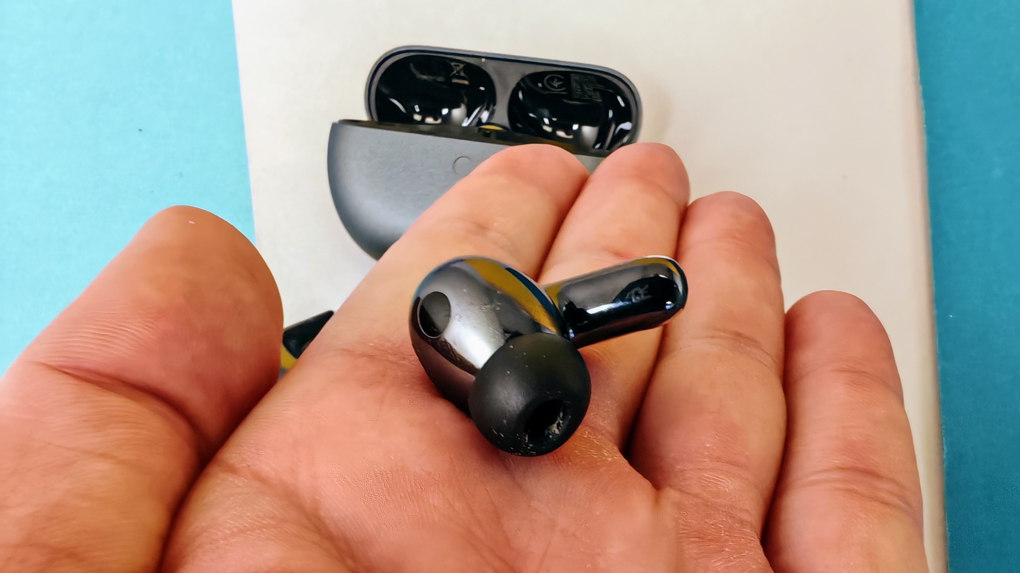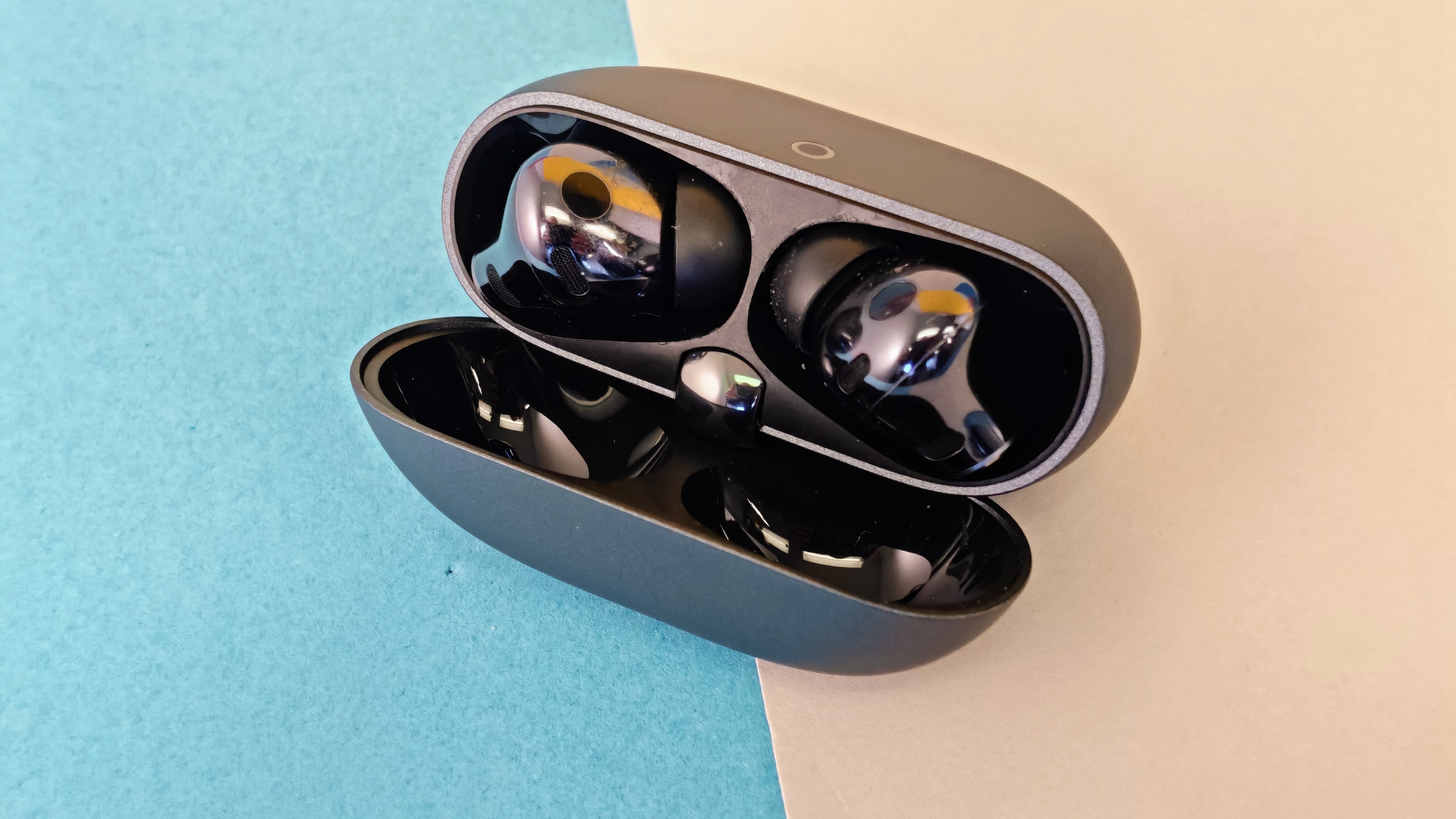 Der Deckel klappt mit sattem Schwung auf und schnappt dank Magnetverschluss ebenso zügig wieder zu – das fühlt sich ausgesprochen befriedigend an. Die Ohrhörer haften magnetisch im Gehäuse und sitzen bombenfest.