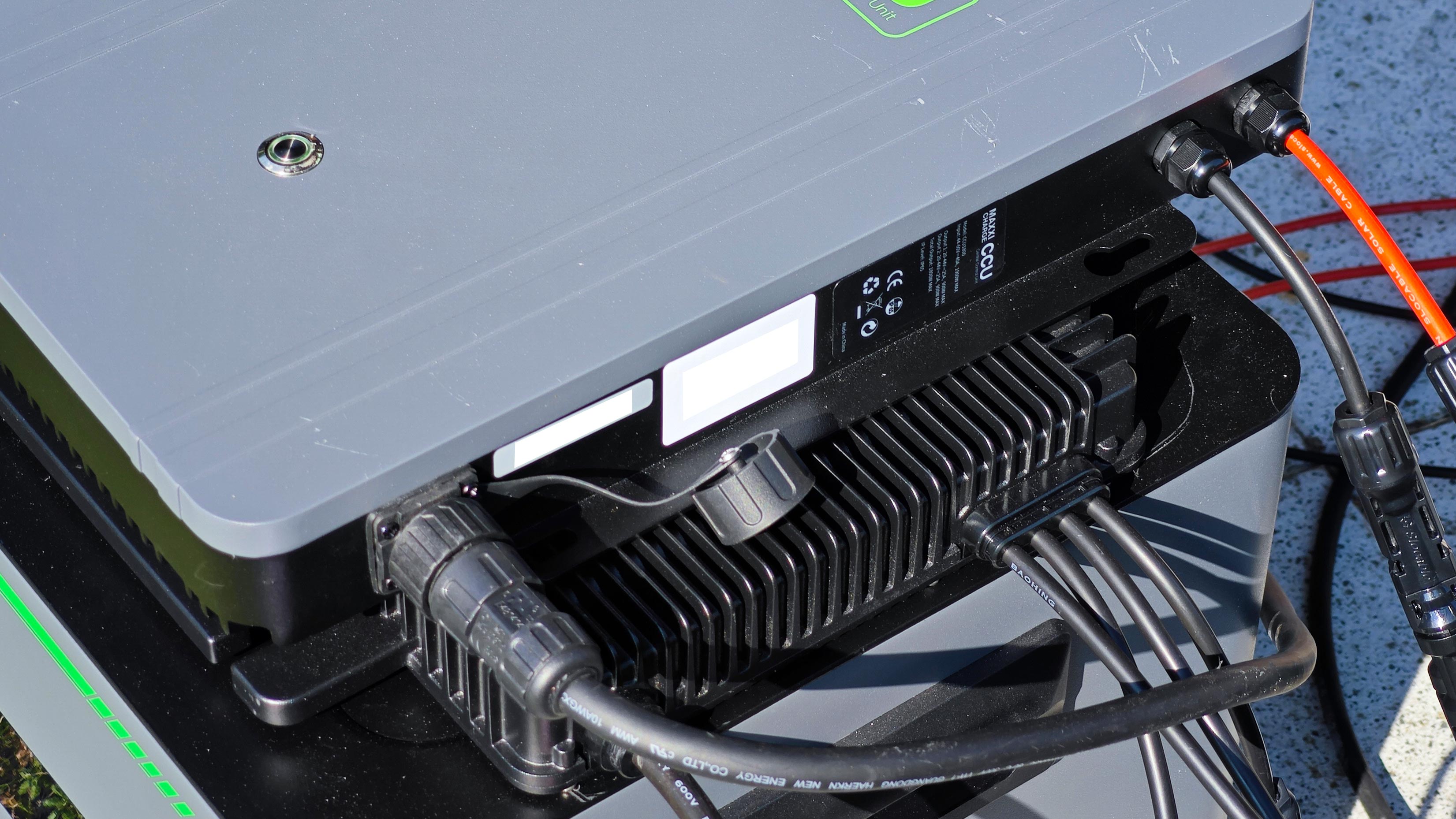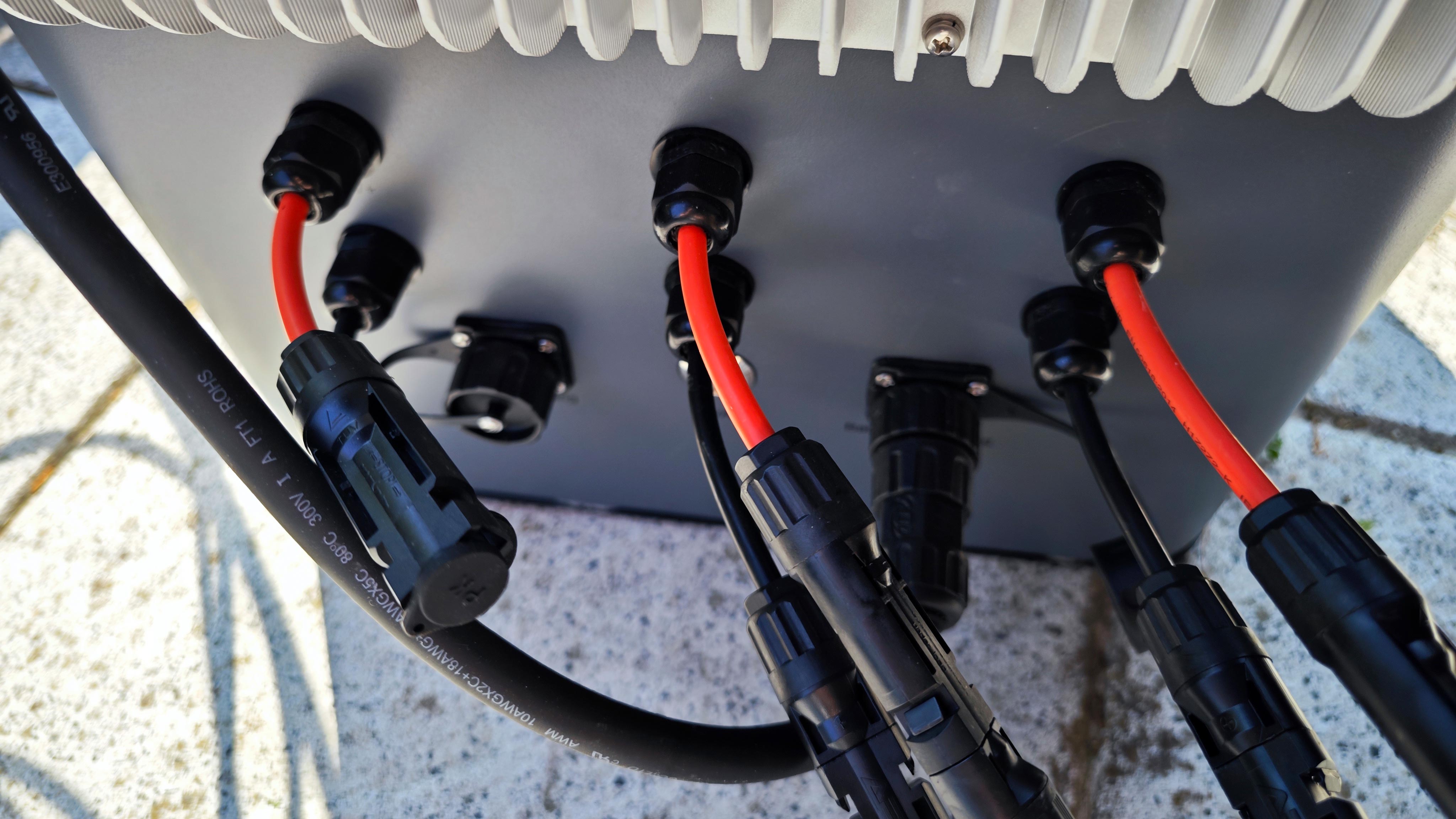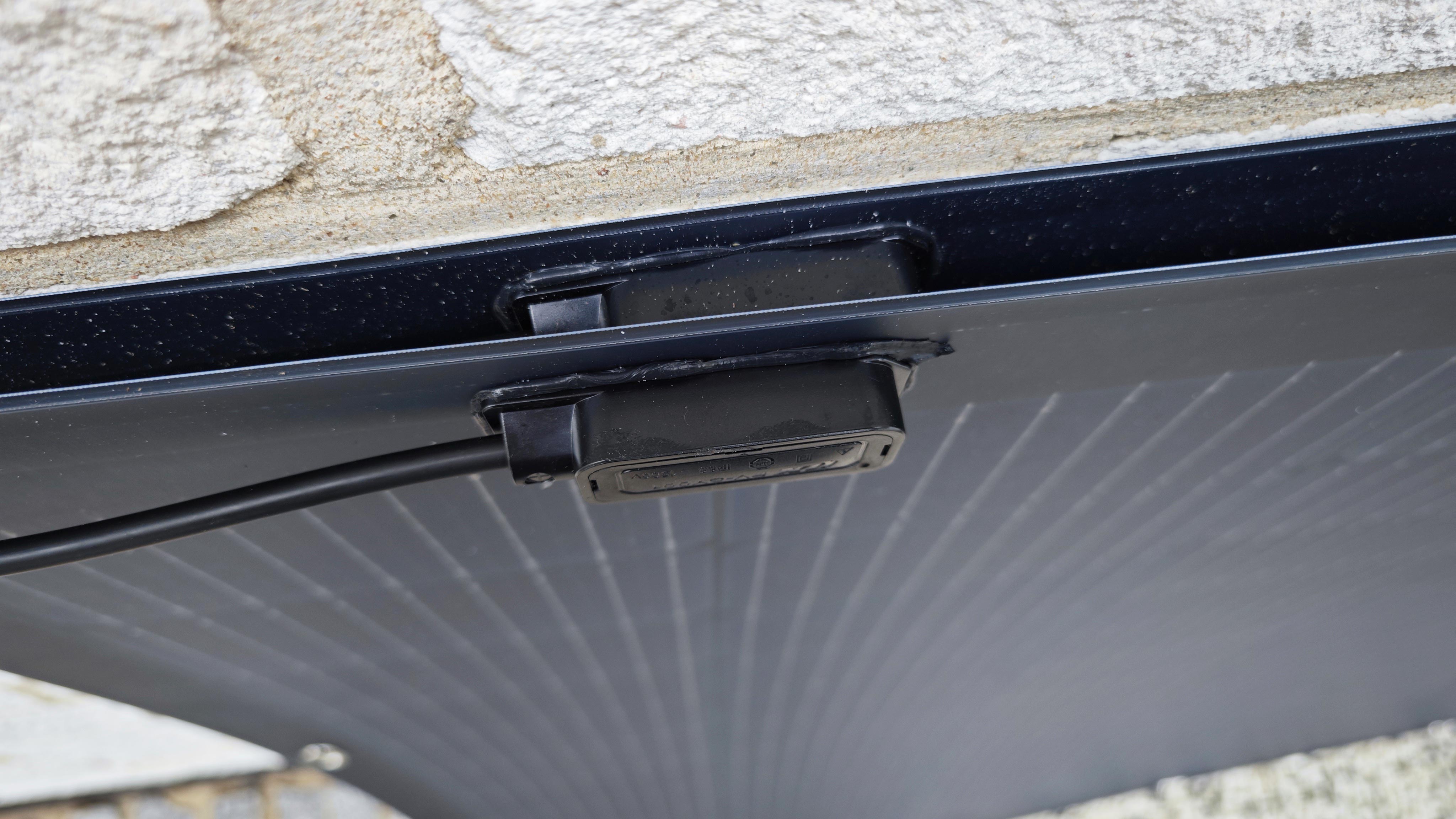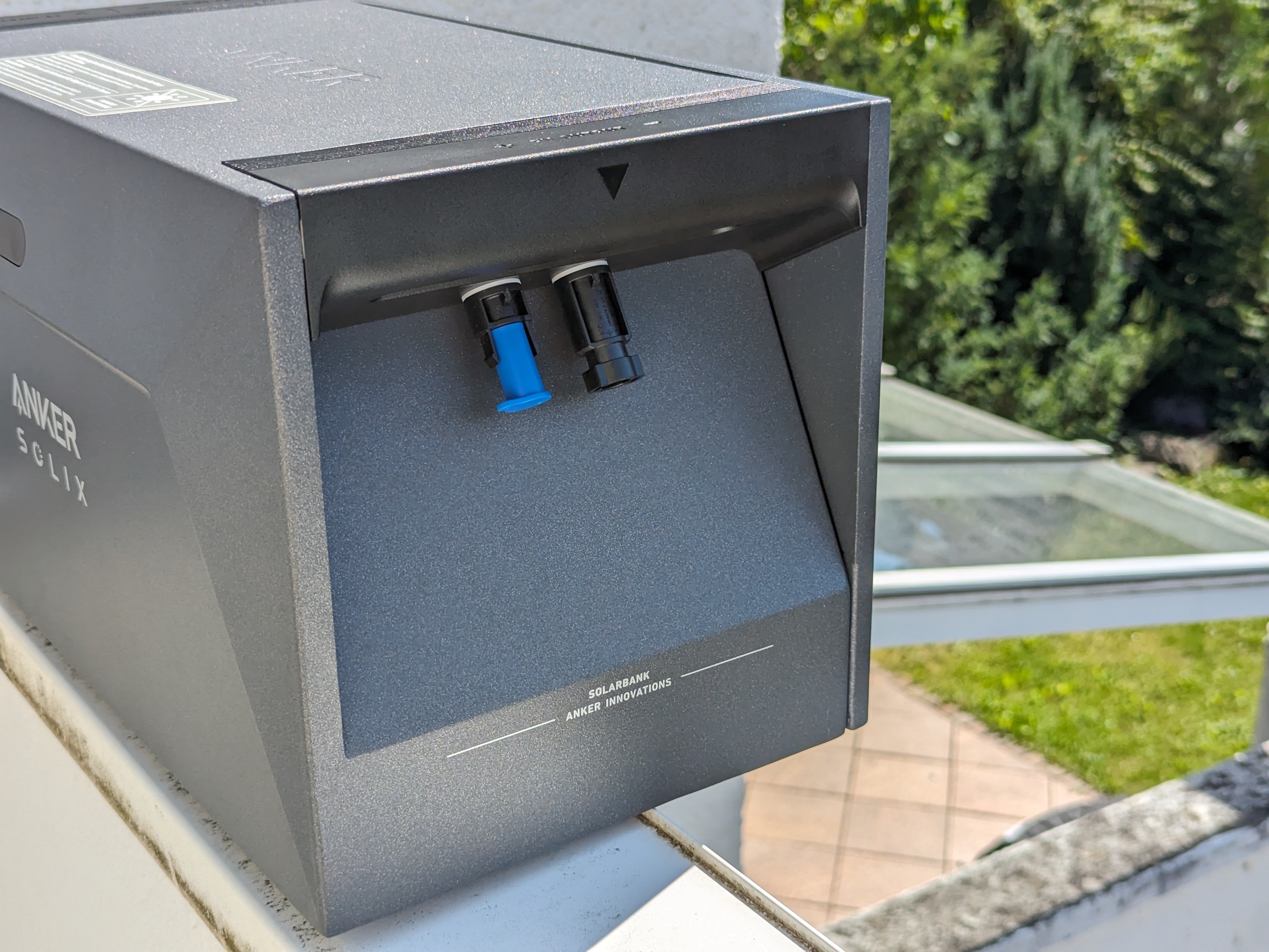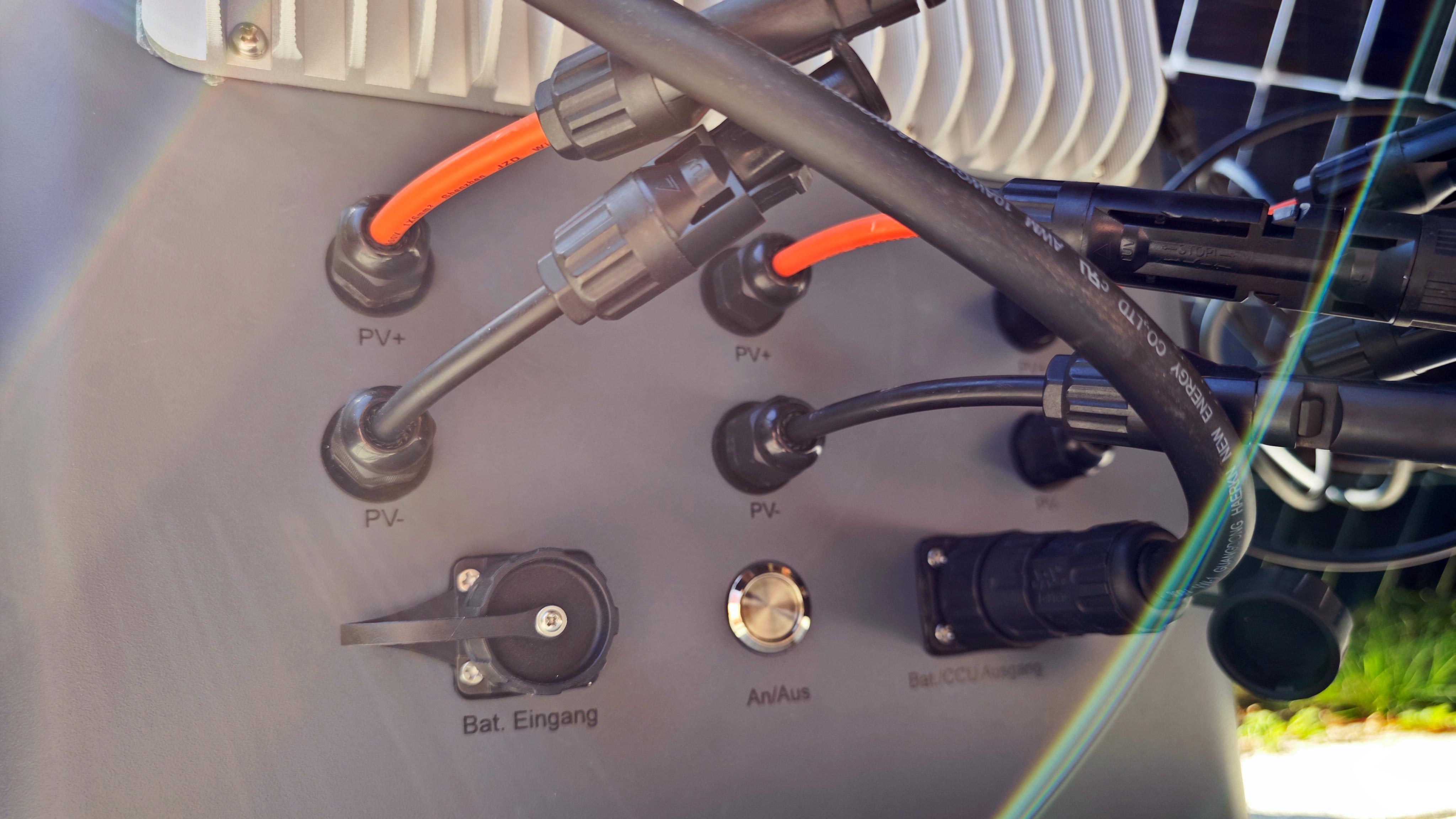 Für den Test hat uns Solakon den One inklusive einer Erweiterungseinheit zur Verfügung gestellt. Der Aufbau ist relativ schnell erledigt, da sich die Einheiten einfach stapeln lassen. Wir schrauben anschließend die externe WLAN-Antenne an den entsprechenden Anschluss und verbinden vier Solarmodule (2x 500 Watt und 2x 420 Watt) mit den vier MPP-Trackern an der Steuerungseinheit und das Schukokabel mit der Steckdose und dem Solakon One. Beim Anschluss des Solarpanels ist darauf zu achten, dass man nicht zwei in Reihe an einen MPP-Tracker verbindet, da dies dazu führt, dass die Eingangsspannung 60 Volt überschreitet und das Gerät beschädigt wird. Wer mehr als vier Module mit dem Solakon One verbinden möchte, benötigt Y-Kabel für einen parallelen Anschluss. Das Vorgehen erläutert auch das deutschsprachige Handbuch.