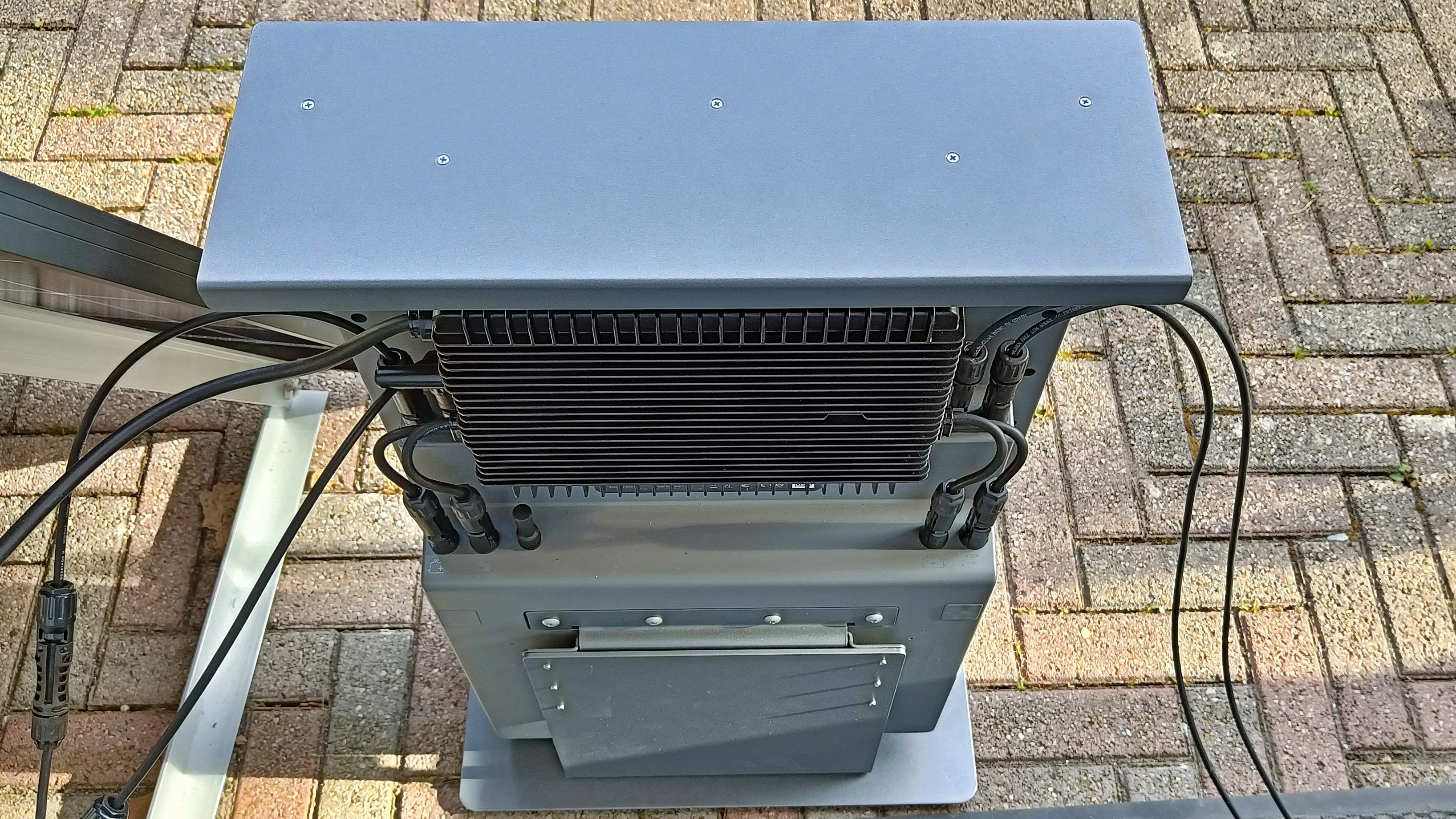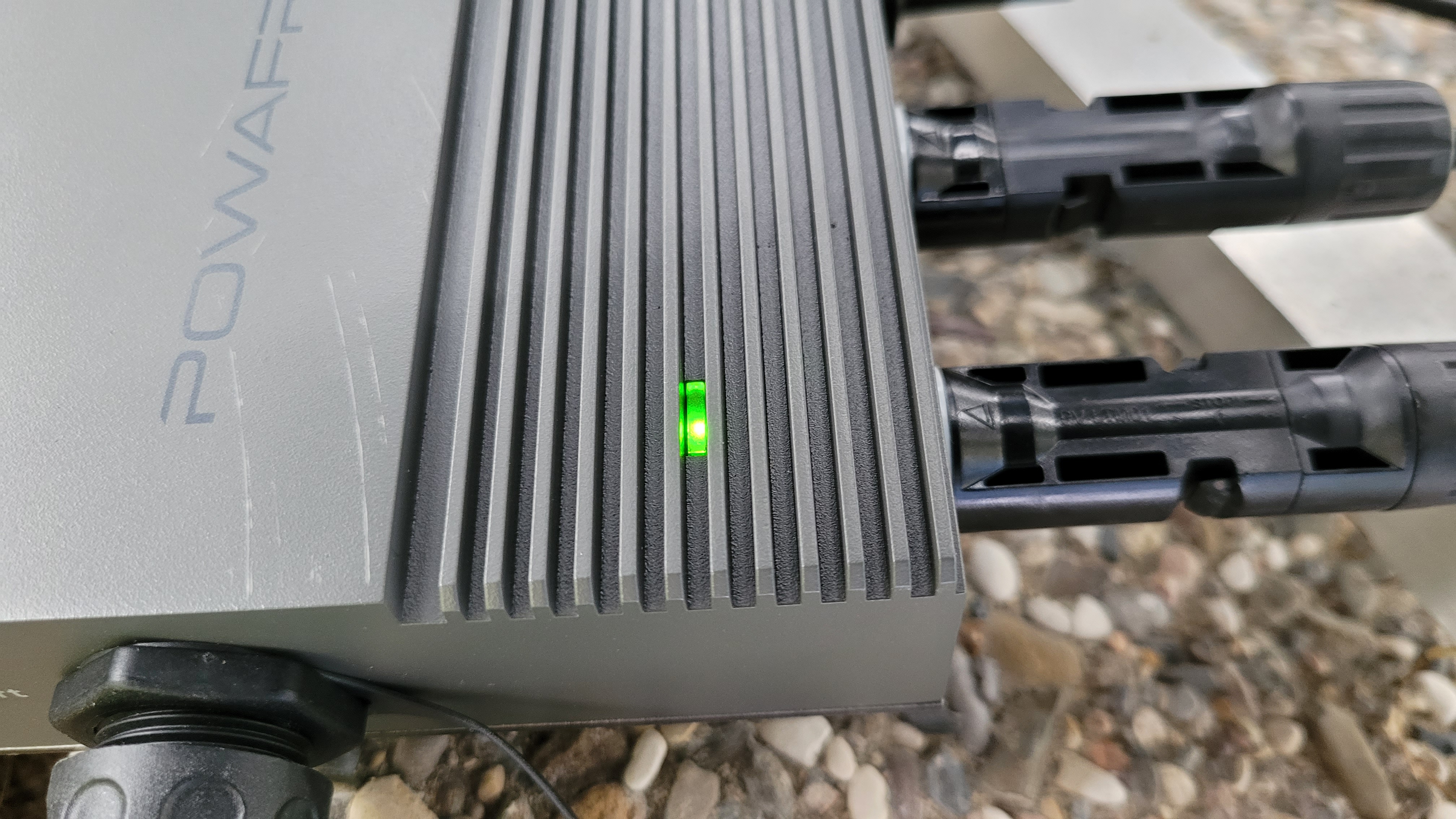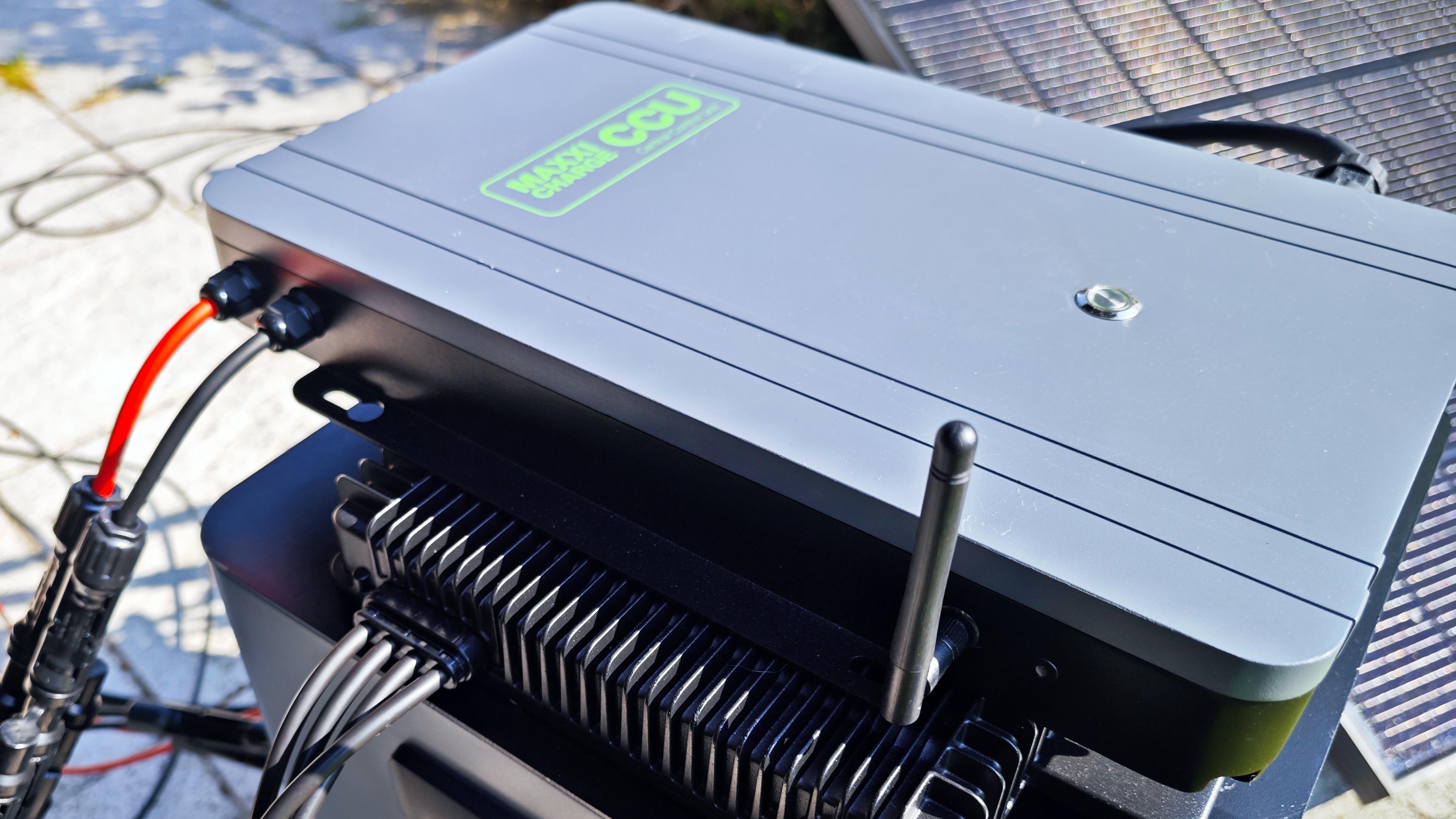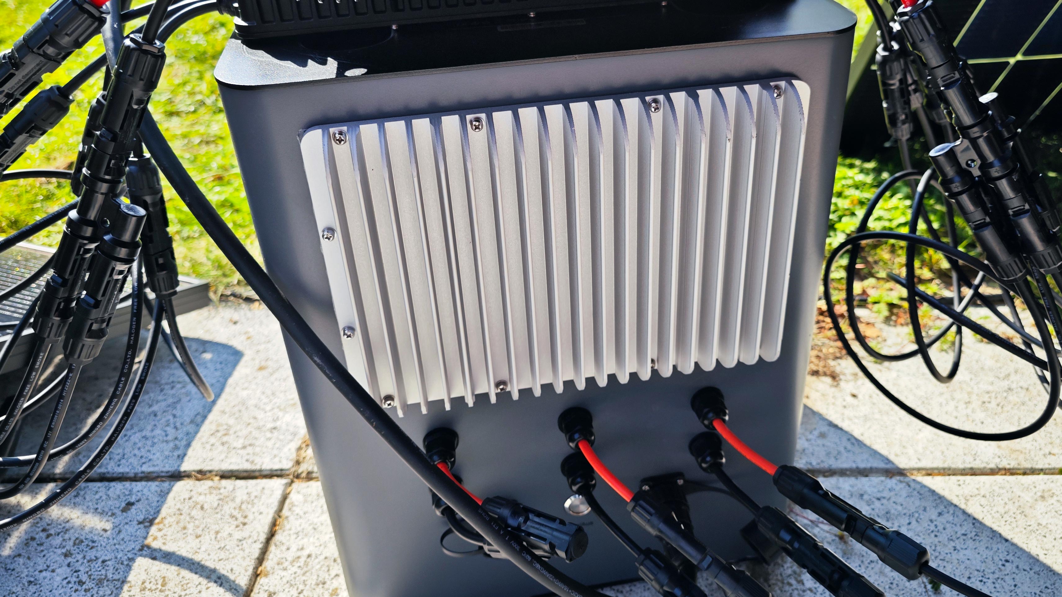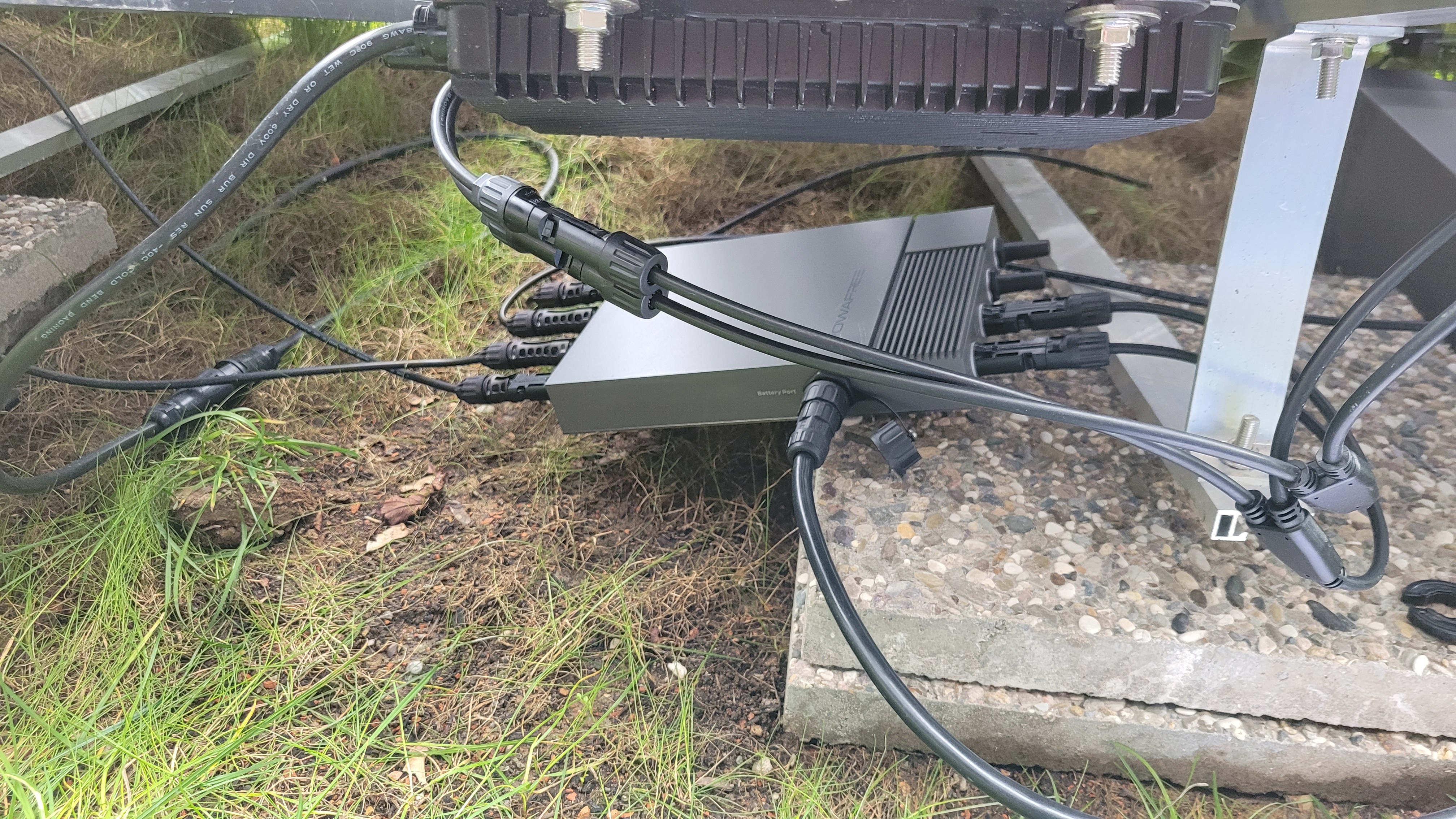 Für den Test hat uns Solakon den One inklusive einer Erweiterungseinheit zur Verfügung gestellt. Der Aufbau ist relativ schnell erledigt, da sich die Einheiten einfach stapeln lassen. Wir schrauben anschließend die externe WLAN-Antenne an den entsprechenden Anschluss und verbinden vier Solarmodule (2x 500 Watt und 2x 420 Watt) mit den vier MPP-Trackern an der Steuerungseinheit und das Schukokabel mit der Steckdose und dem Solakon One. Beim Anschluss des Solarpanels ist darauf zu achten, dass man nicht zwei in Reihe an einen MPP-Tracker verbindet, da dies dazu führt, dass die Eingangsspannung 60 Volt überschreitet und das Gerät beschädigt wird. Wer mehr als vier Module mit dem Solakon One verbinden möchte, benötigt Y-Kabel für einen parallelen Anschluss. Das Vorgehen erläutert auch das deutschsprachige Handbuch.