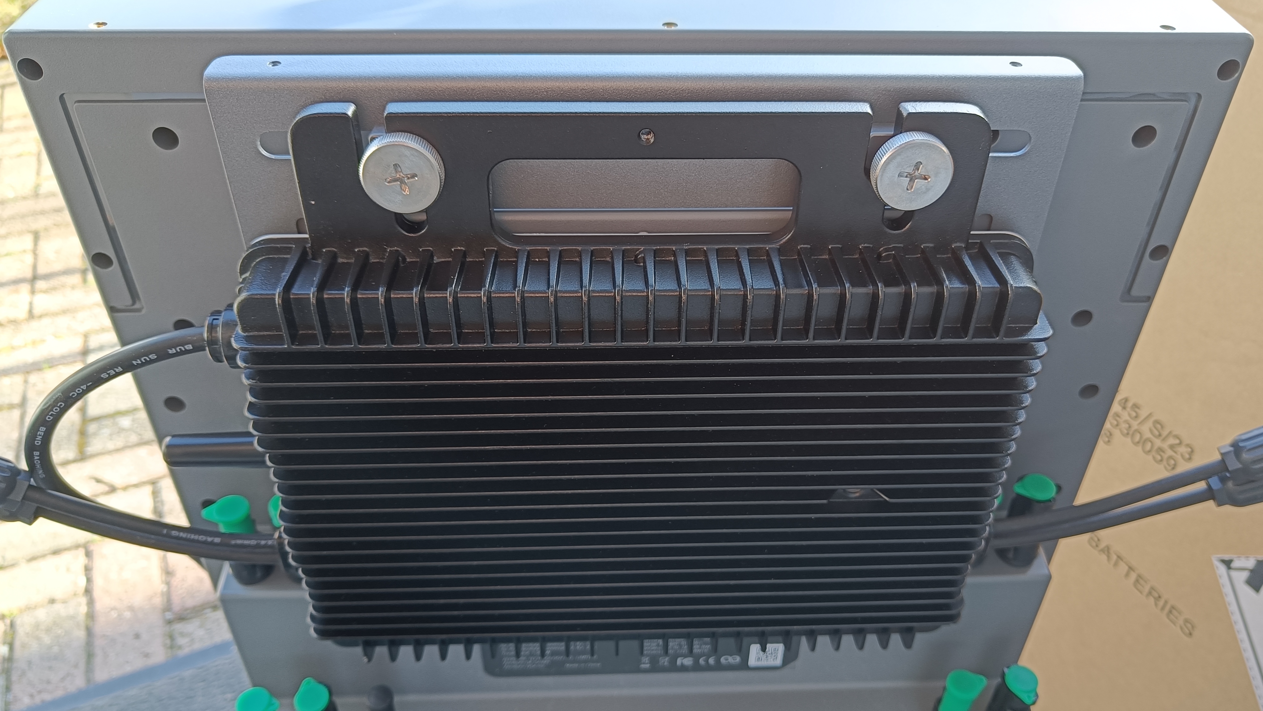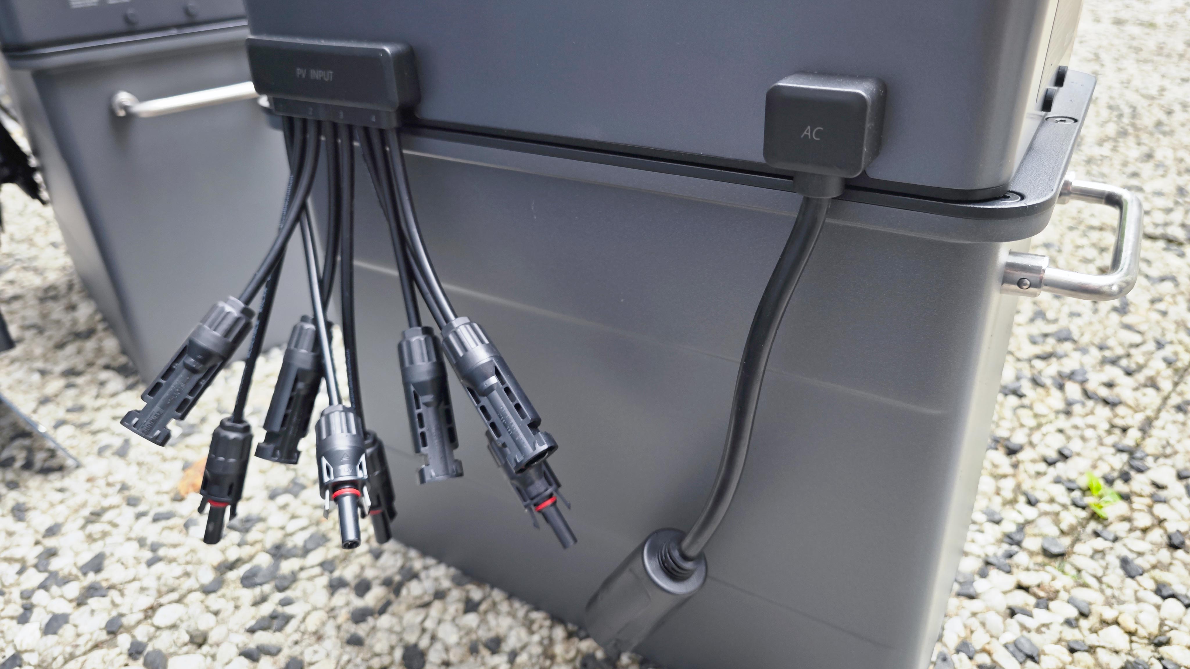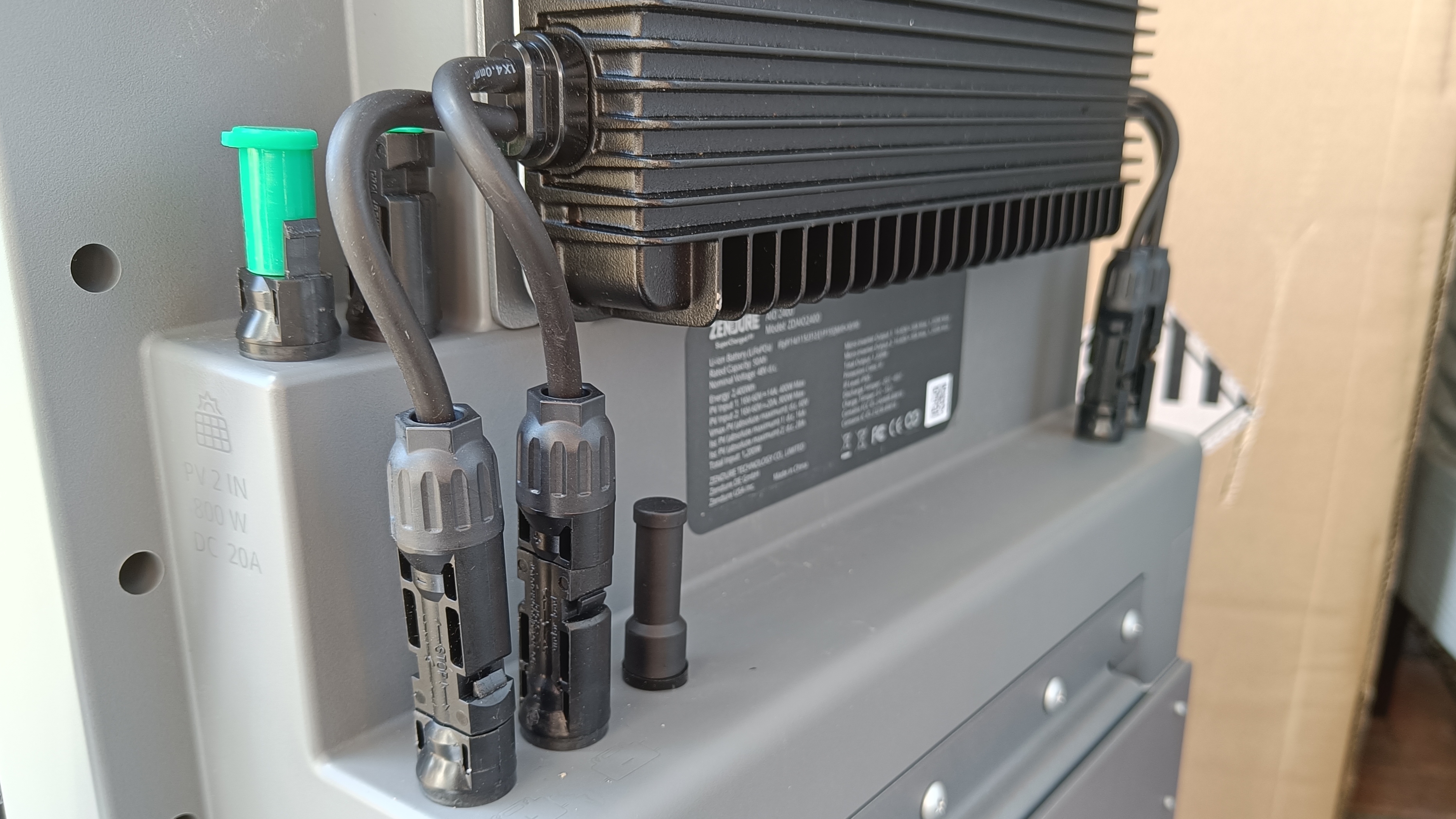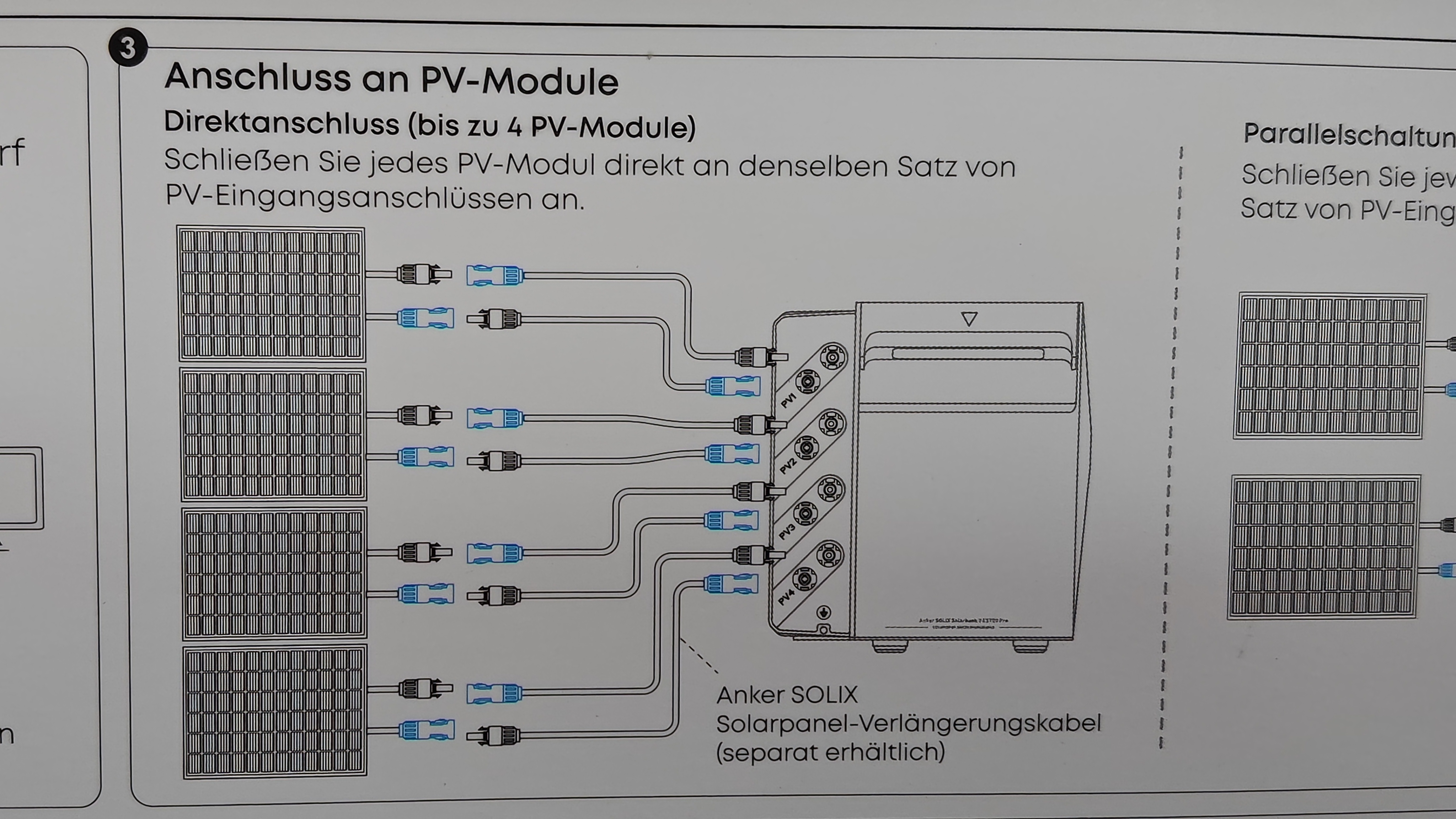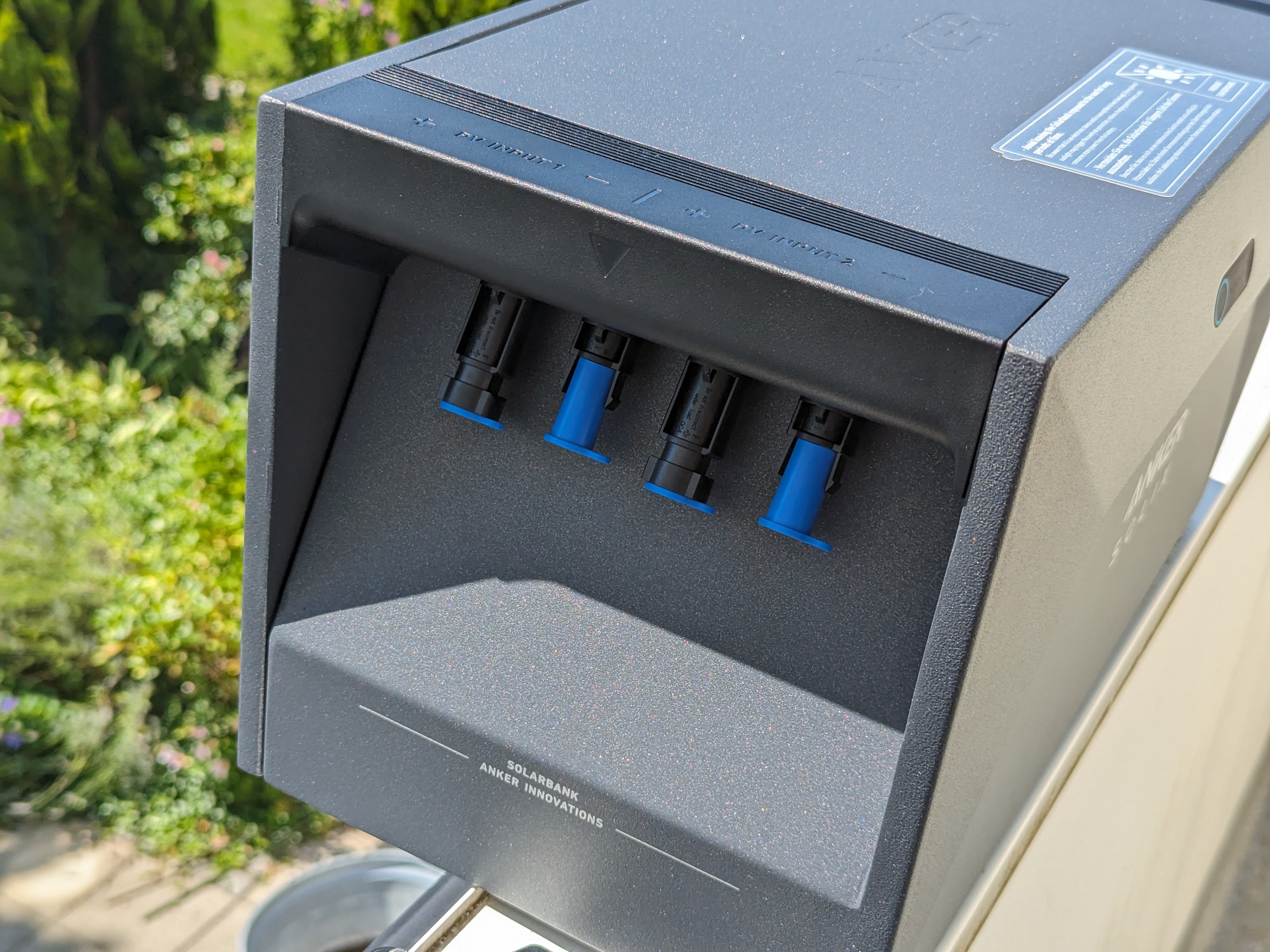 Für den Test hat uns Solakon den One inklusive einer Erweiterungseinheit zur Verfügung gestellt. Der Aufbau ist relativ schnell erledigt, da sich die Einheiten einfach stapeln lassen. Wir schrauben anschließend die externe WLAN-Antenne an den entsprechenden Anschluss und verbinden vier Solarmodule (2x 500 Watt und 2x 420 Watt) mit den vier MPP-Trackern an der Steuerungseinheit und das Schukokabel mit der Steckdose und dem Solakon One. Beim Anschluss des Solarpanels ist darauf zu achten, dass man nicht zwei in Reihe an einen MPP-Tracker verbindet, da dies dazu führt, dass die Eingangsspannung 60 Volt überschreitet und das Gerät beschädigt wird. Wer mehr als vier Module mit dem Solakon One verbinden möchte, benötigt Y-Kabel für einen parallelen Anschluss. Das Vorgehen erläutert auch das deutschsprachige Handbuch.