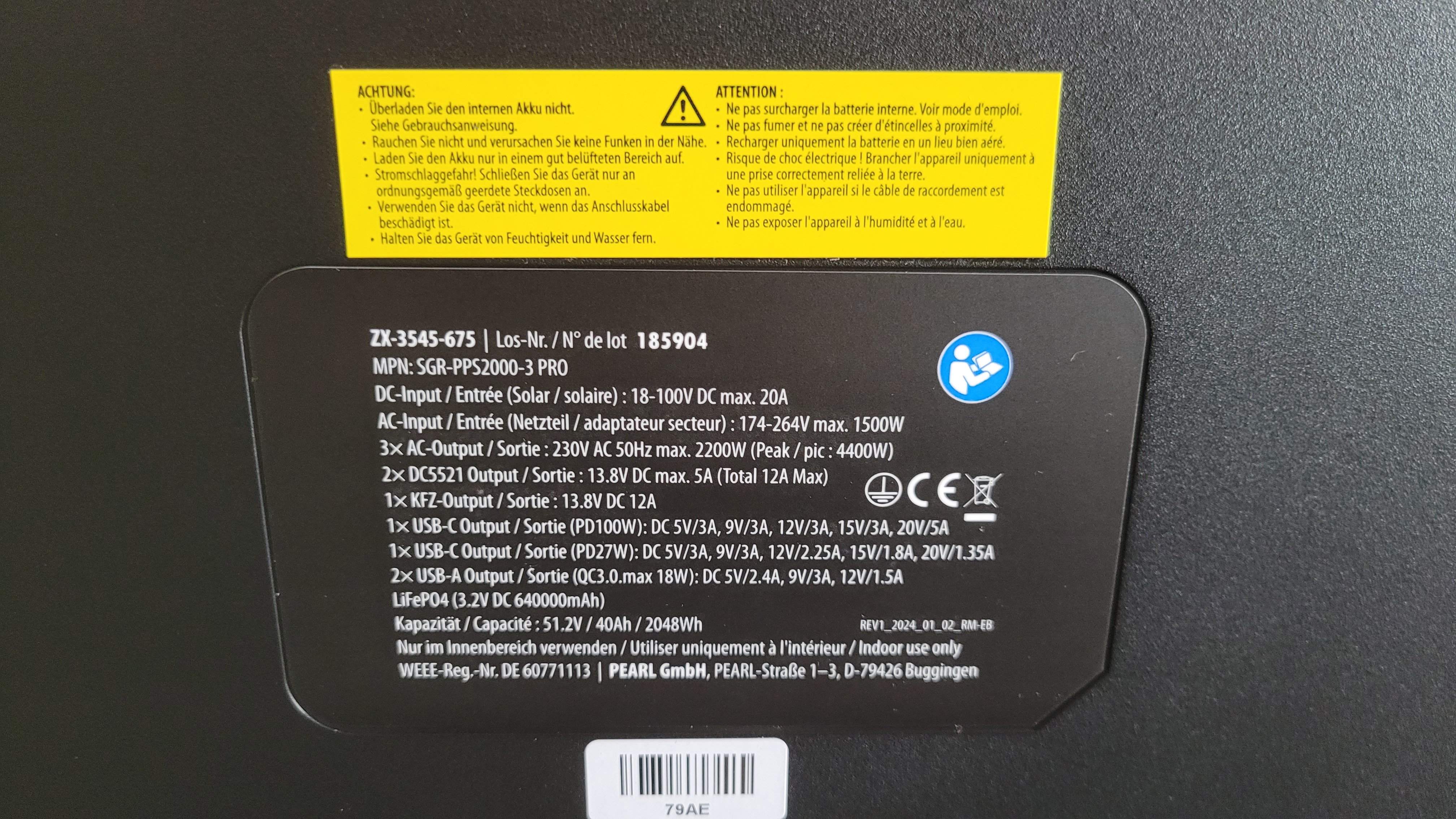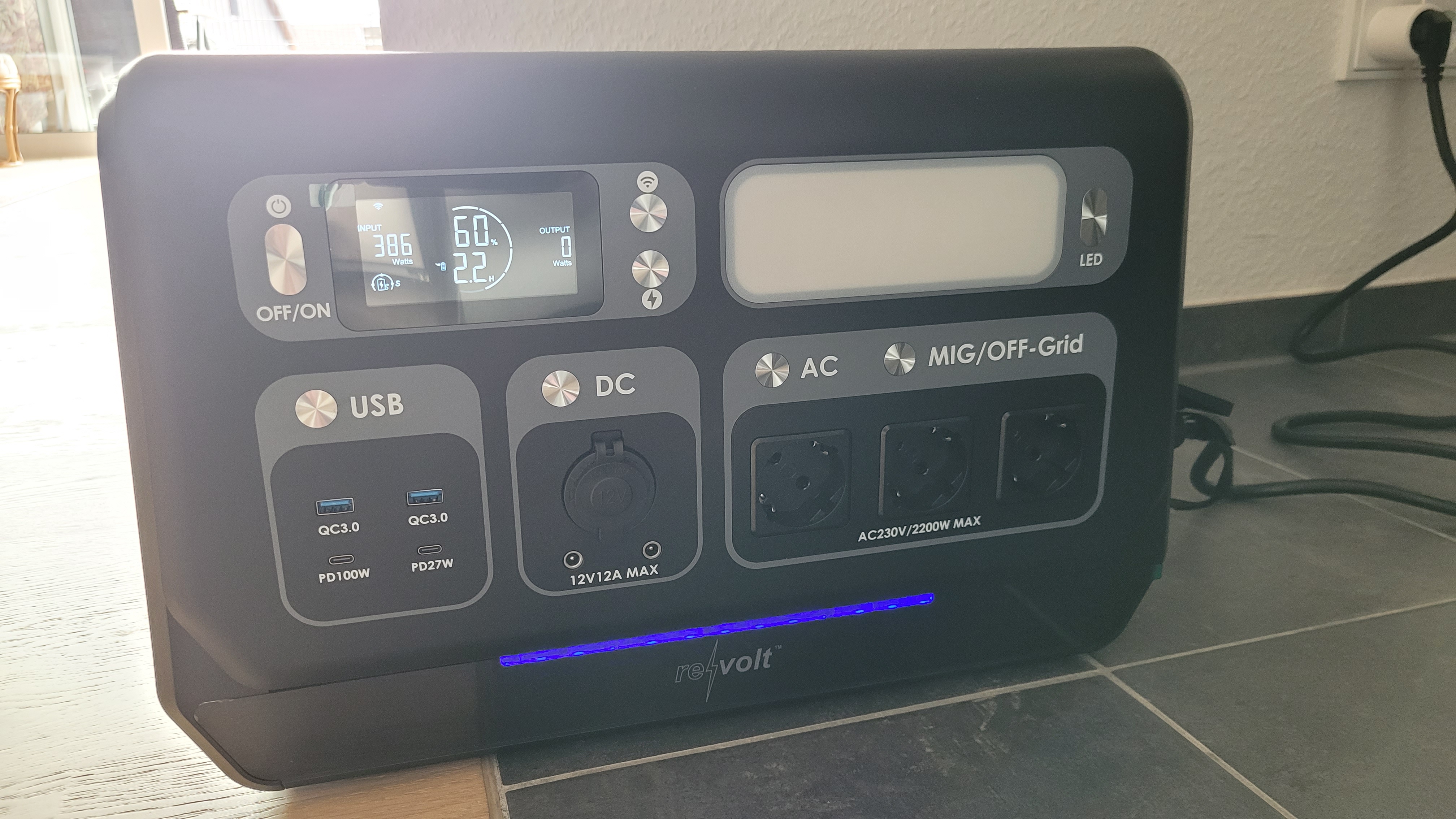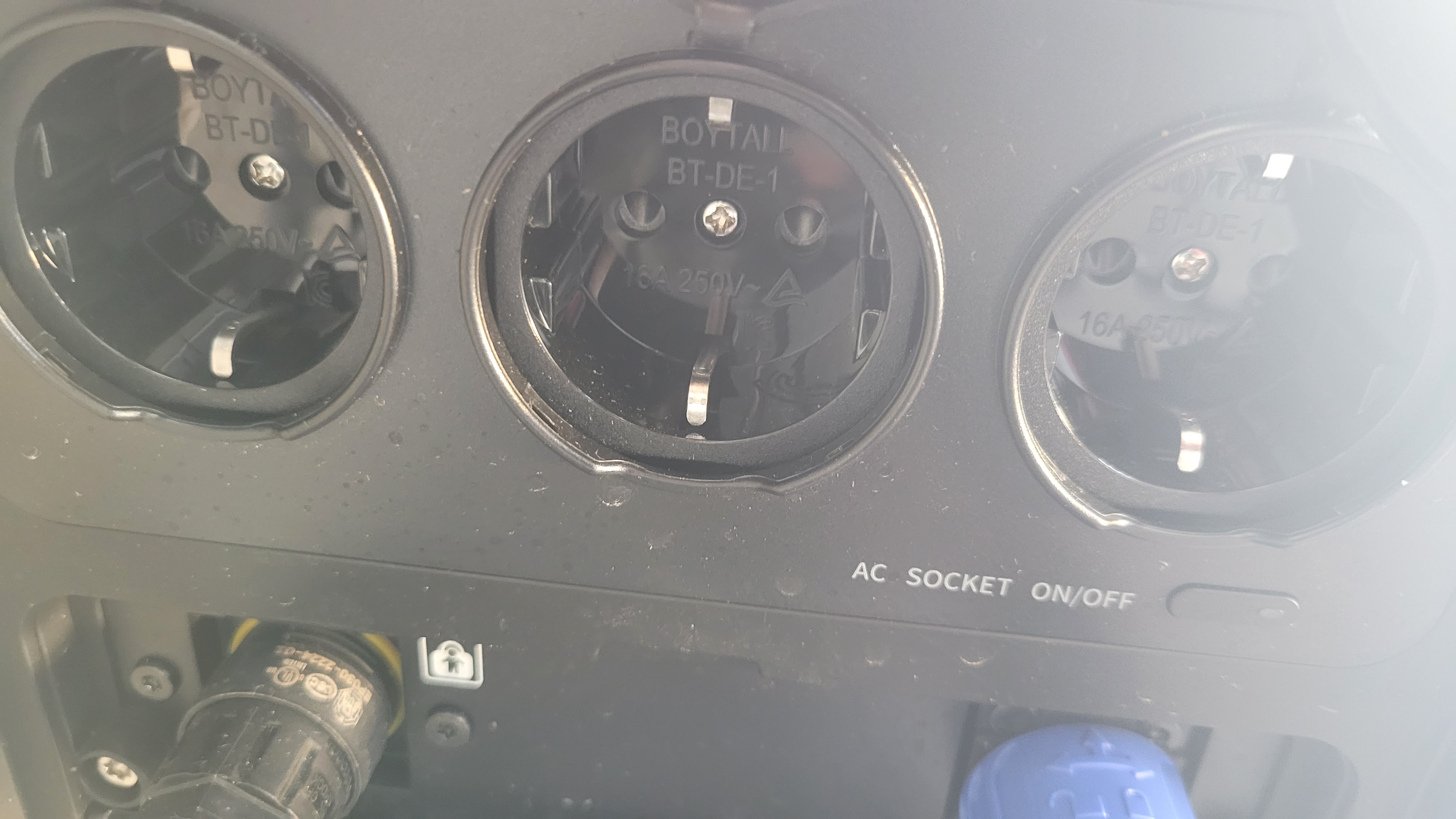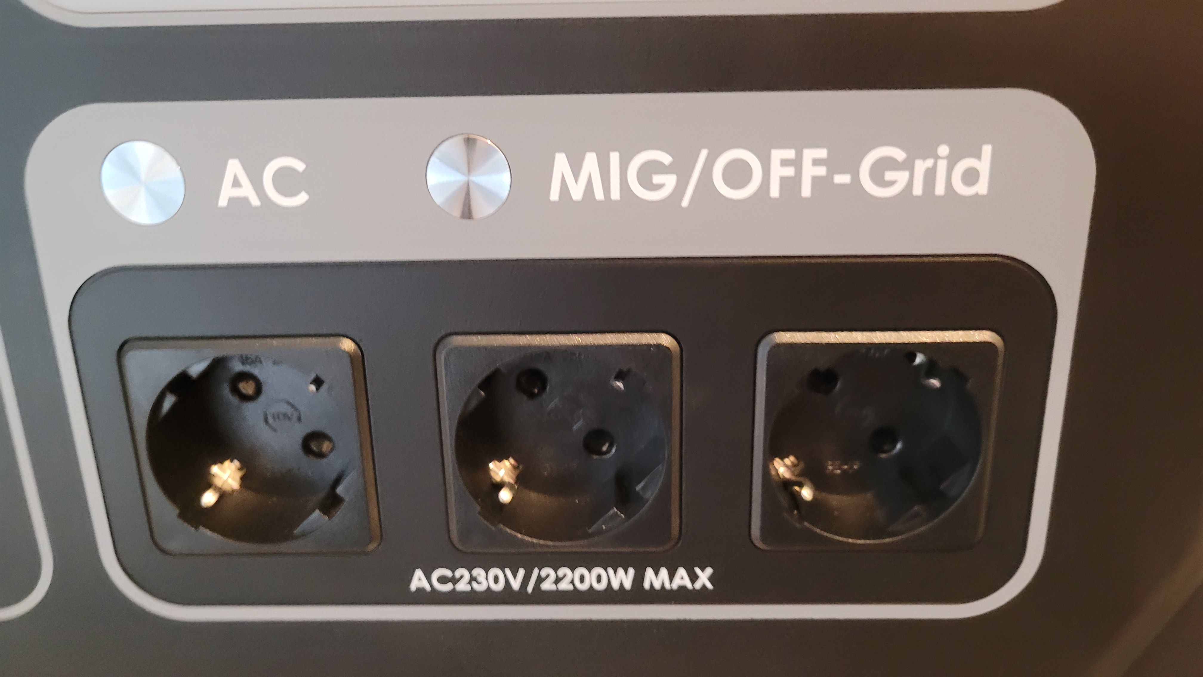 Die Zusatzfunktion des BKW-Speichers ist die Rolle einer Powerstation. Diese kann unterwegs oder etwa bei Stromausfall als mobile Steckdose benutzt zu werden. Die Schukosteckdosen leisten dauerhaft bis zu 2200 Watt, was auch für Verbraucher wie Wasserkocher oder Kaffeemaschine ausreichend ist. Die Kapazität von 2048 Wh ist zwar nicht riesig, reicht aber locker, um etwa die Kühlbox übers Wochenende zu versorgen oder das E-Bike zu laden.