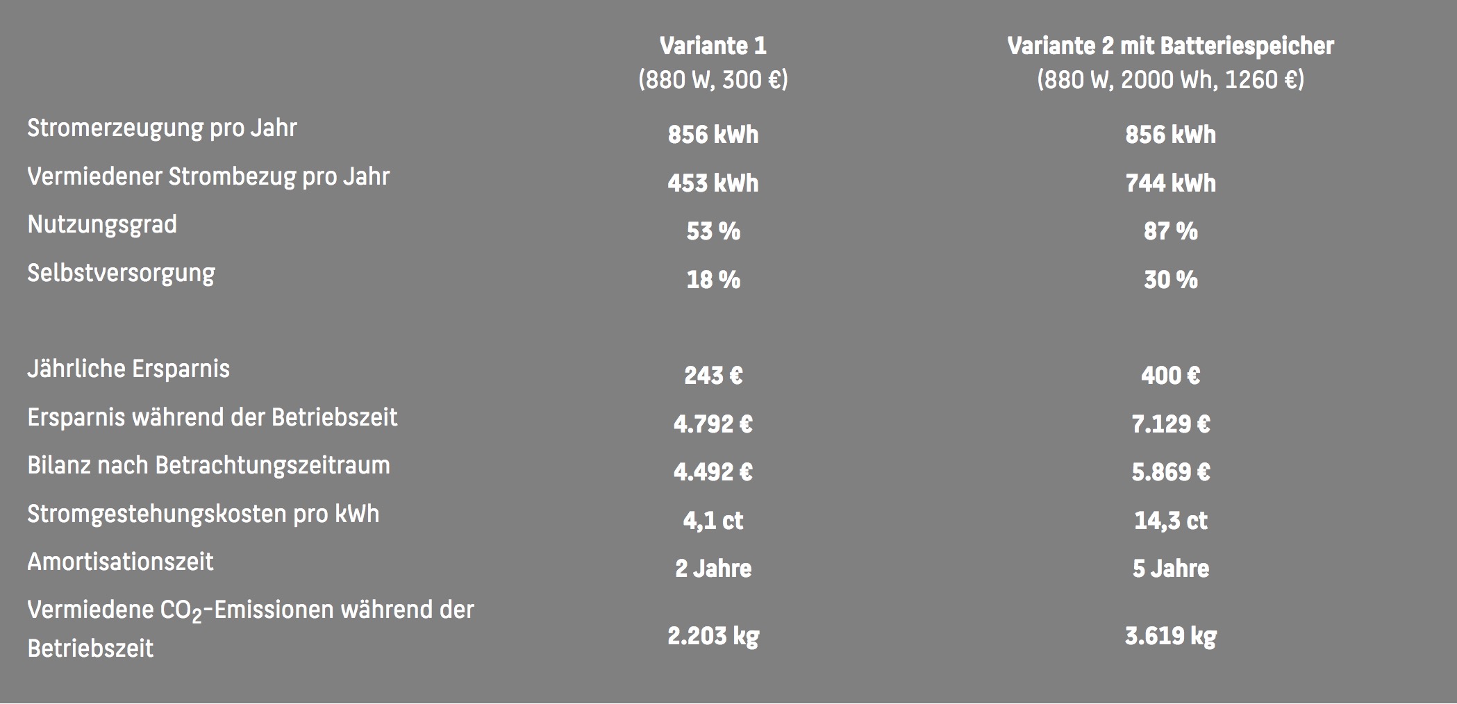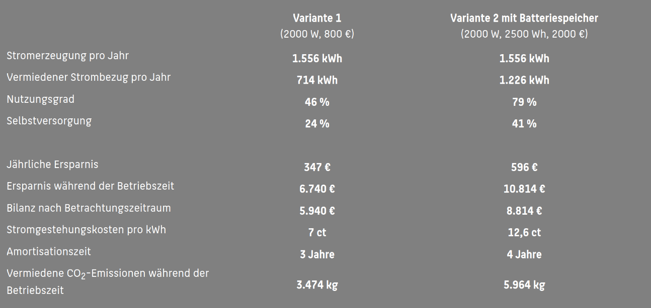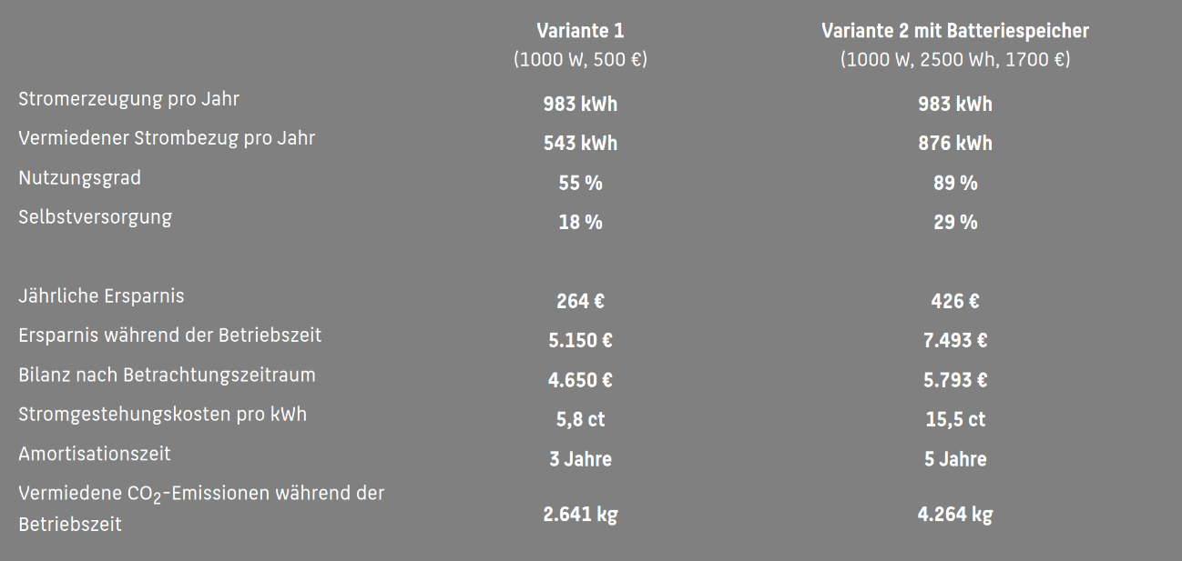 Im Fall der Vitapower ergibt sich in einem Haushalt mit zwei Personen, einem Strombedarf von 2500 kWh pro Jahr bei einem Preis von 40 Cent pro kWh und einer jährlichen Teuerungsrate von 3 Prozent folgendes Bild: Während sich ein Balkonkraftwerk mit zwei 440 Watt starken Solarpanels und einem Wechselrichter zum Preis von 300 Euro bereits nach zwei Jahren amortisiert hat, dauert es bei der Vitapower mit einem Zusatzakku und 2 kWh Kapazität mit zwei 440-Watt-Modulen zum Preis von 160 Euro (Gesamtpreis 1260 Euro) etwa fünf Jahre. Bei einer Nutzungszeit von 20 Jahren erwirtschaftet die Vitapower-Anlage einen mit 5869 Euro um 1377 Euro höheren Gewinn als das BKW ohne Speicher, das 4792 Euro Gewinn erzielt.