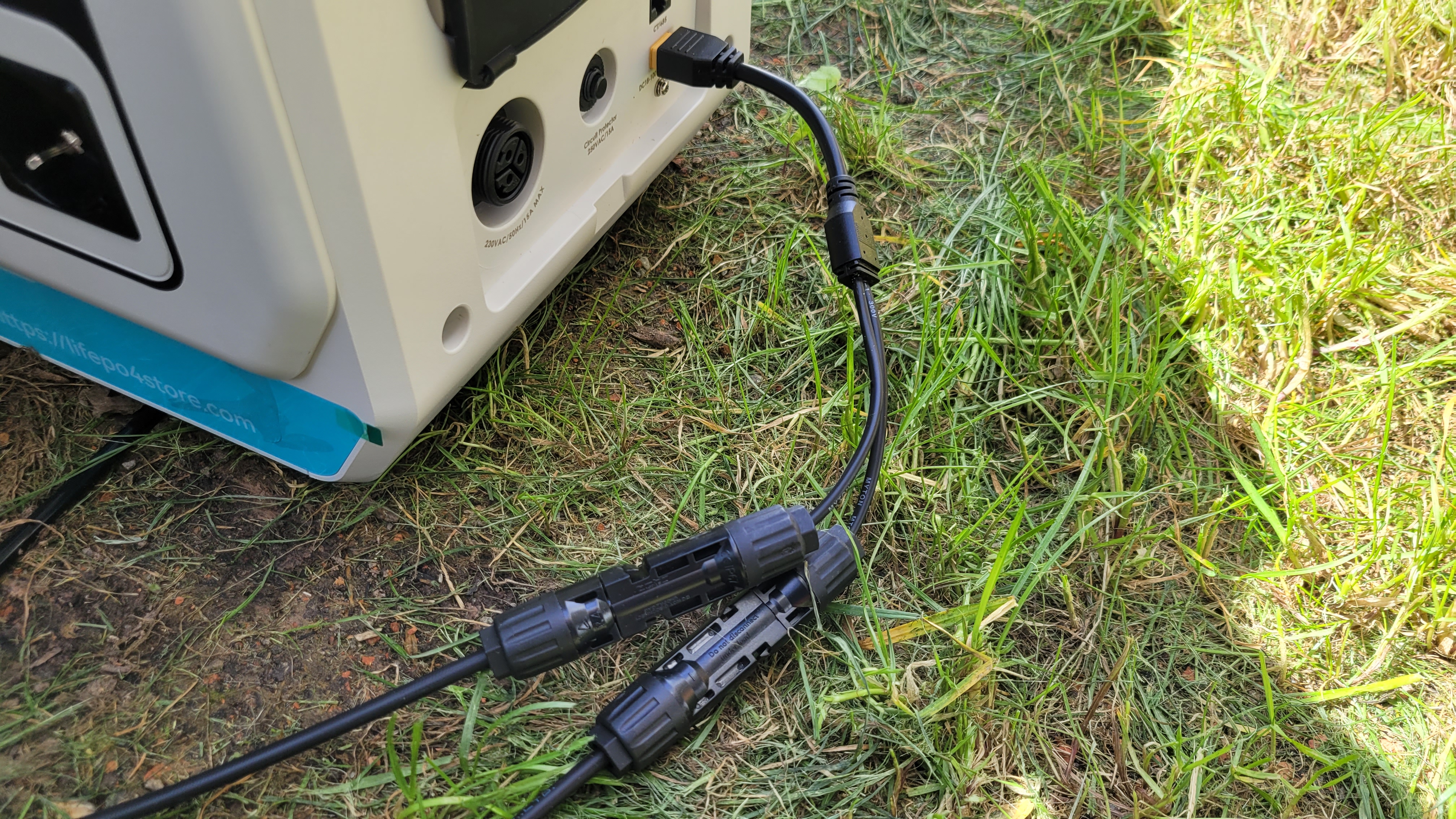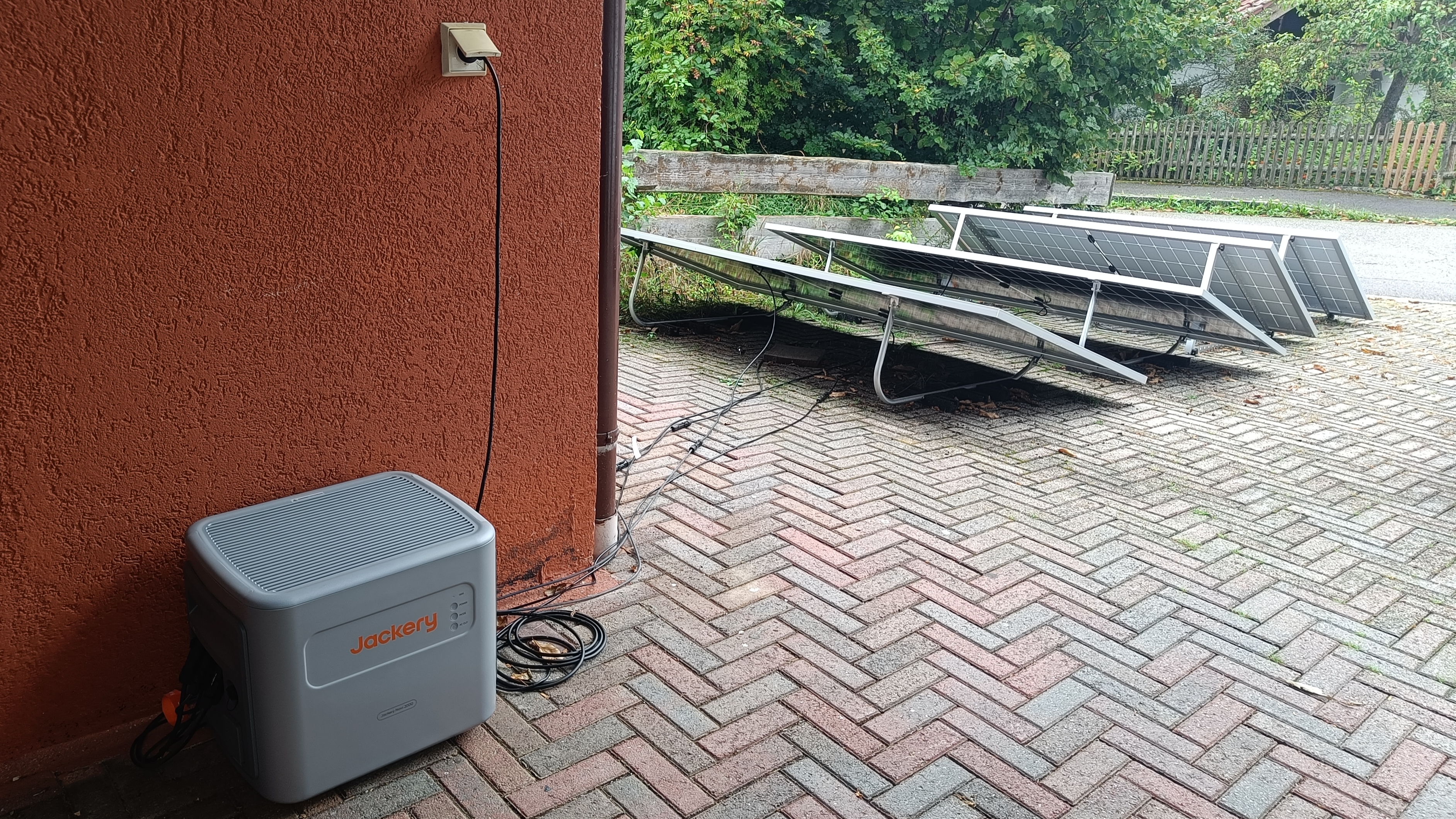 Sobald die Solarmodule aufgestellt und ausgerichtet sind, verbinden wir sie mit unseren Verlängerungskabeln und dem beigelegten XT60-Adapter mit der Powerstation und verbinden diese per Schukokabel mit unserer Außensteckdose am Carport. Theoretisch ist das Set nun einsatzbereit. Da der Speicher allerdings nicht wasserdicht ist, funktioniert unser Aufbau nur provisorisch. Für eine dauerhafte Nutzung muss der Speicher geschützt in Innenräumen aufgestellt werden. Damit das funktioniert, benötigt man eine nicht im Set enthaltene Fensterdurchführung für die Solarkabel.