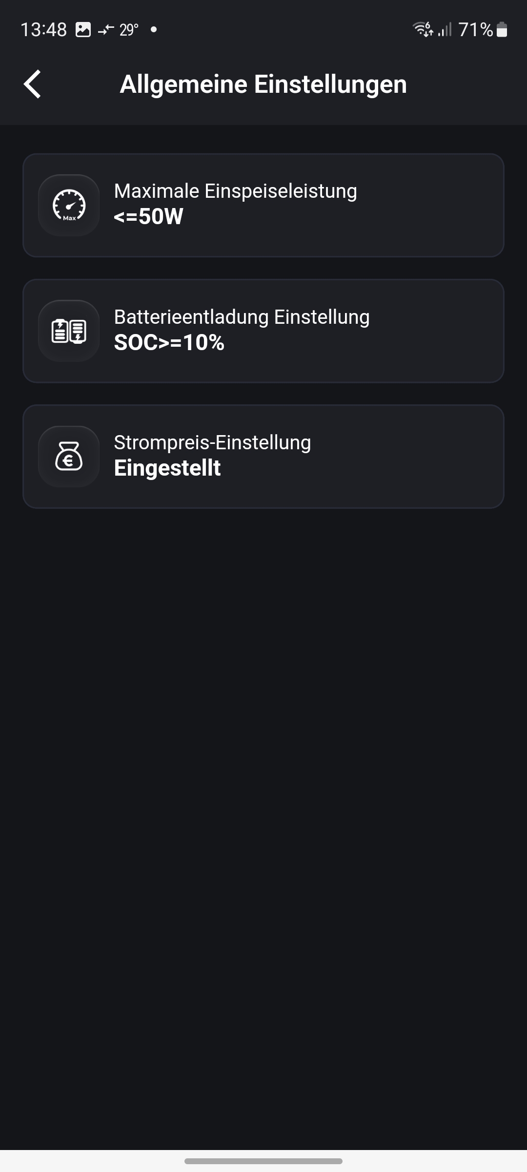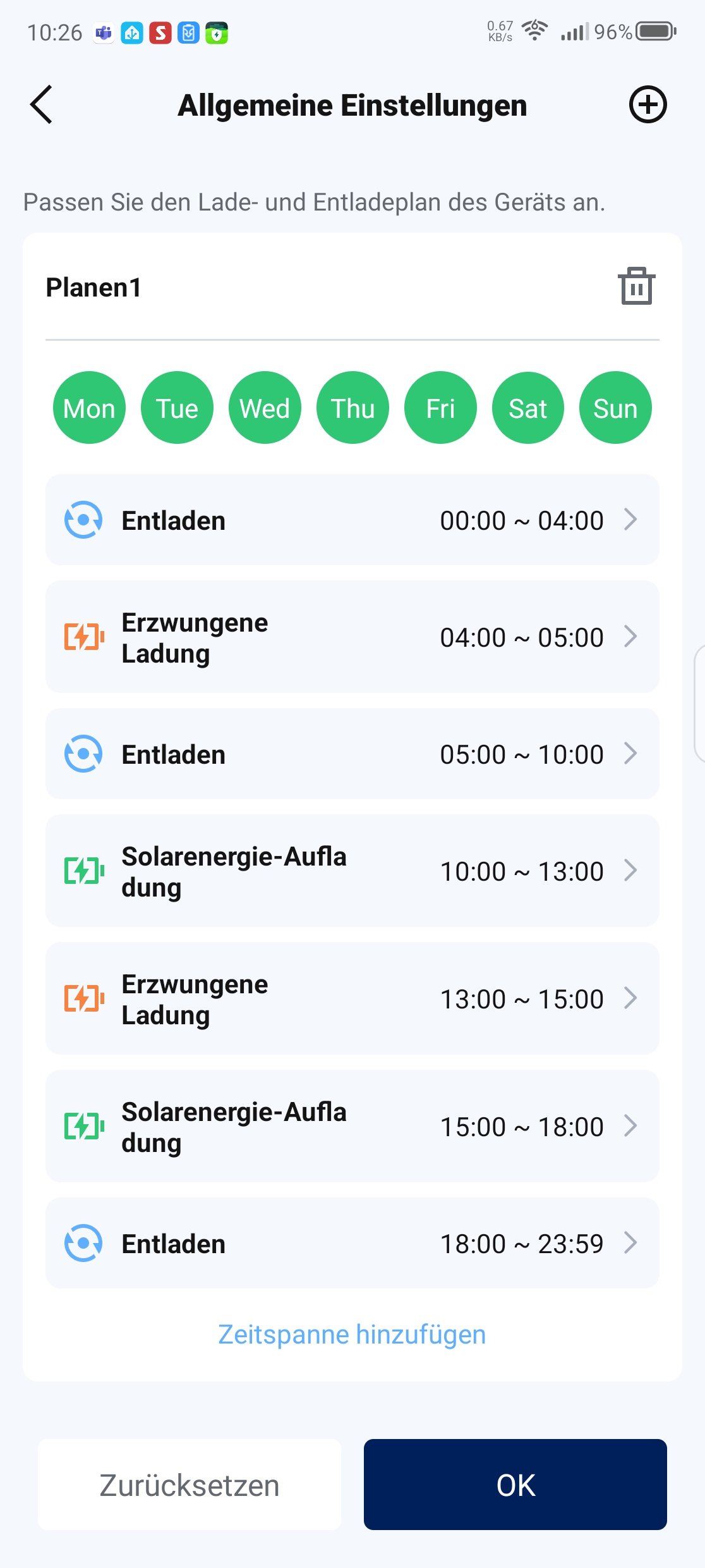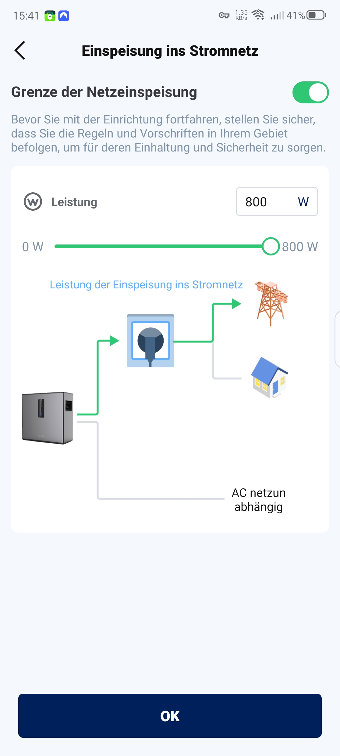 Derzeit gibt es noch einen Fehler in der Solakon-App, der beim Wechsel der Einspeisemöglichkeiten Smart Meter und Energieplan auftritt. Die zuvor eingestellten Werte für den Energieplan muss man leider neu eingeben, da sie nicht abgespeichert werden. Solakon kennt den Fehler und arbeitet bereits an einer Lösung.