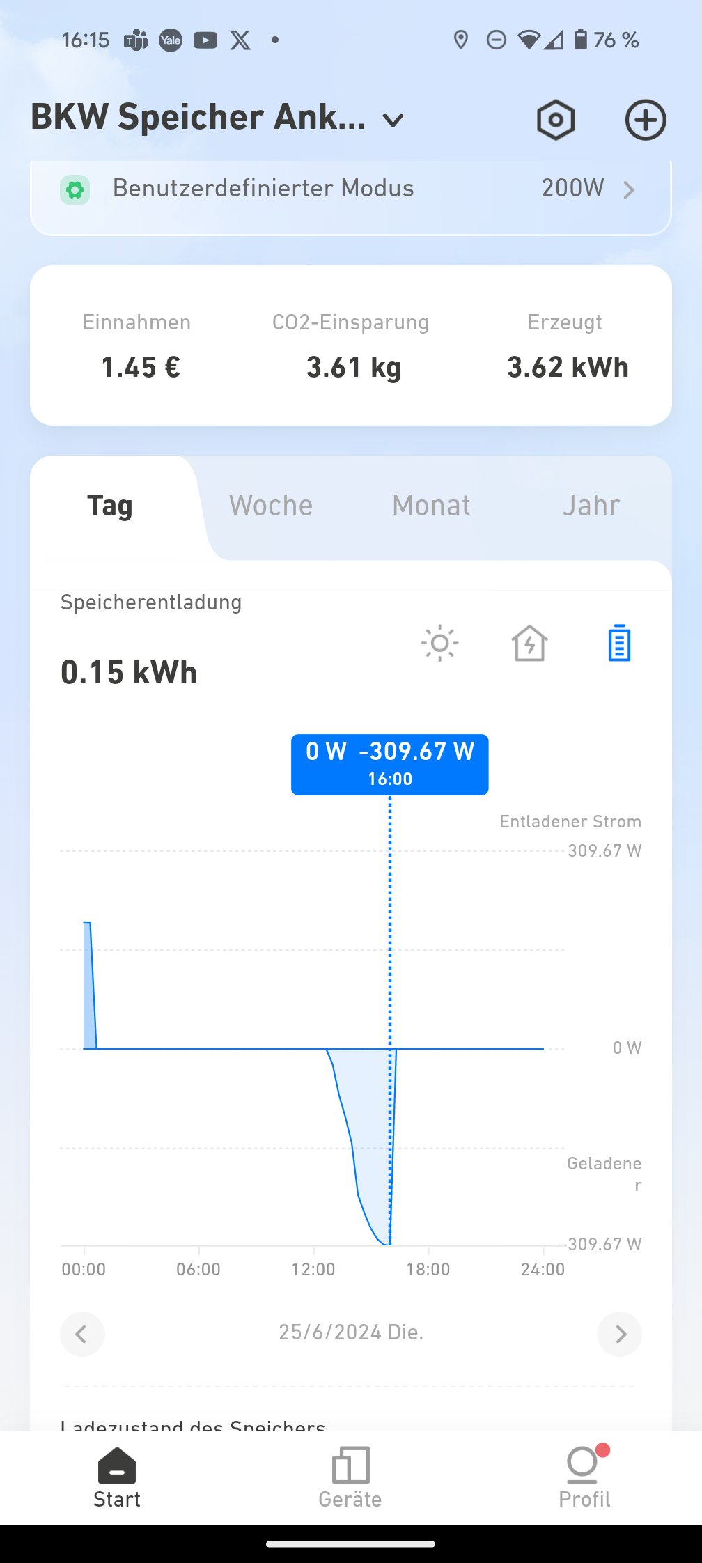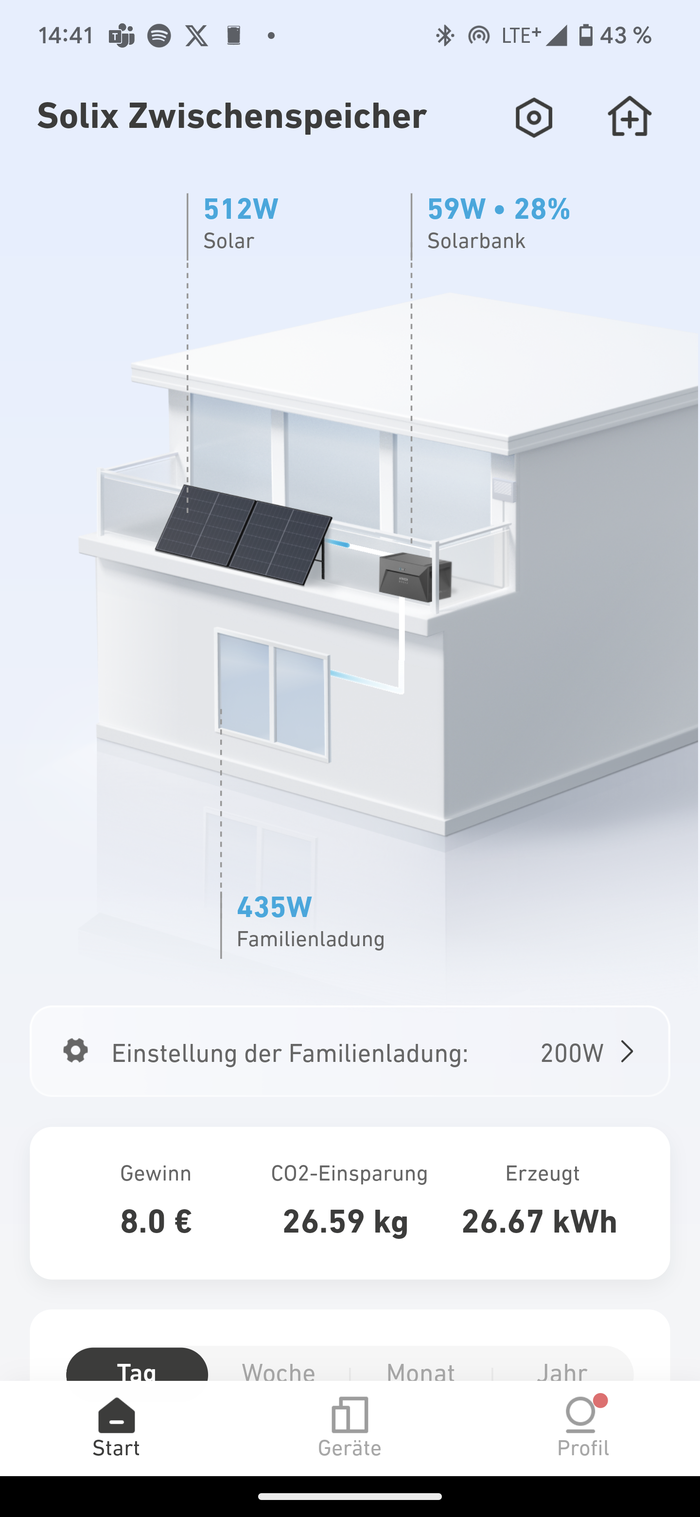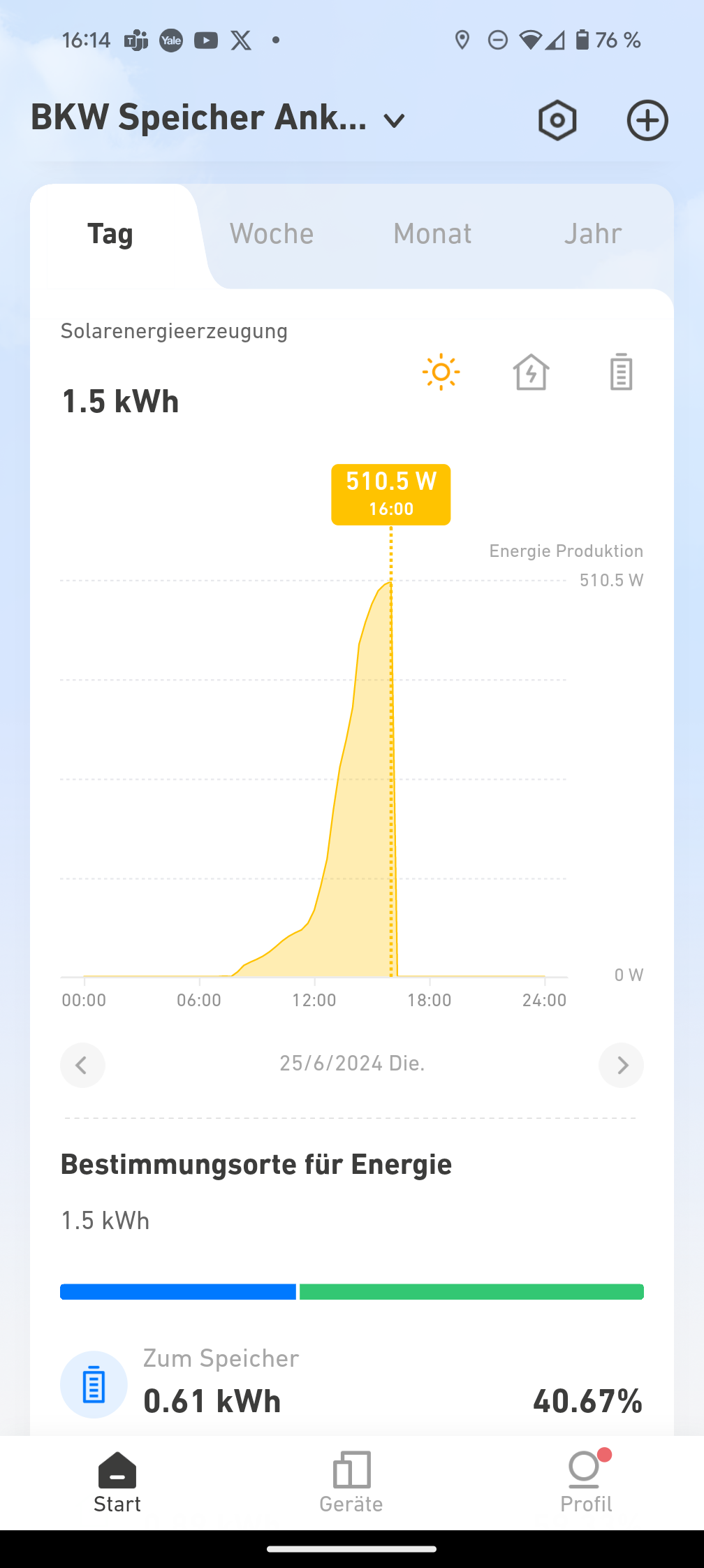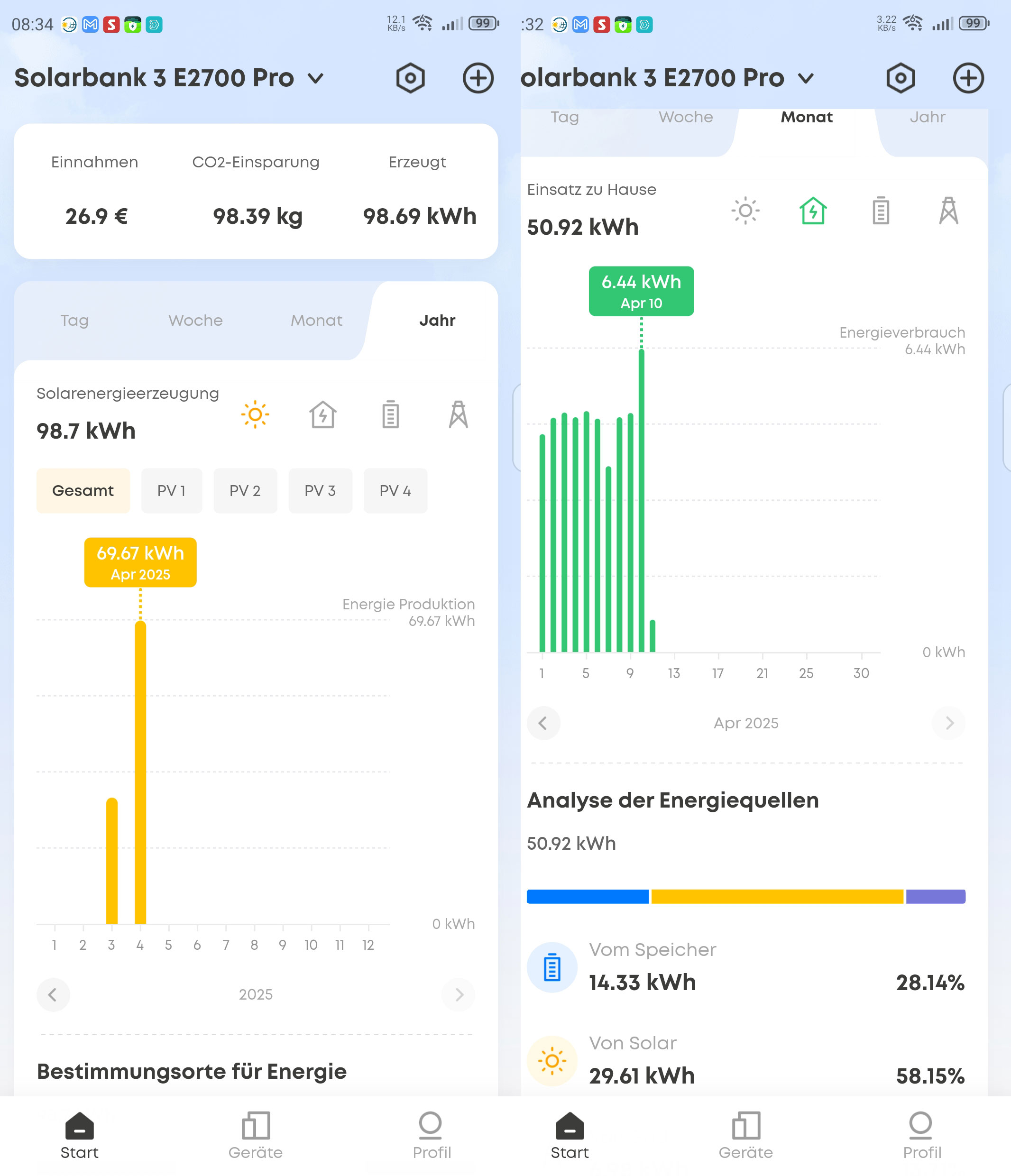 Verbesserungspotenzial bieten auch die Verlaufsdiagramme in der App zur produzierten Menge an Strom. So meldet die Tagesstatistik einen niedrigeren Wert als die Monatsstatistik für den betreffenden Tag. Ein Tages-,Wochen- oder Monats-Verlaufsdiagramm des Speicherstatus gibt es bislang nicht, soll aber noch kommen. Aktuell sieht man den Verlauf nur über einige Stunden. Wünschenswert wäre außerdem eine getrennte Auflistung der Leistungsabgabe nach Netzeinspeisung und Ausgabe der Notstromsteckdose. Aktuell liefert die App nur einen Wert für die Gesamtausgabe (AC-Leistung).