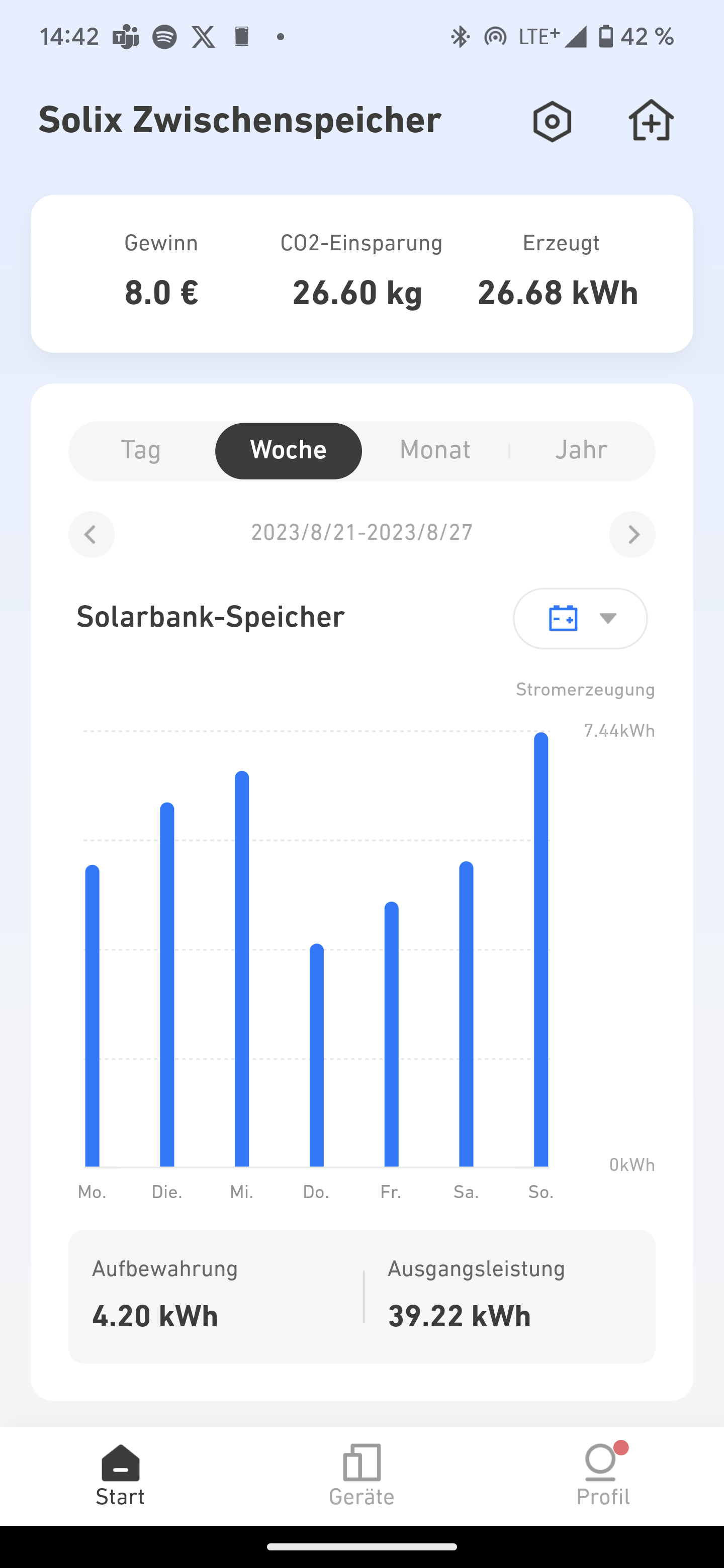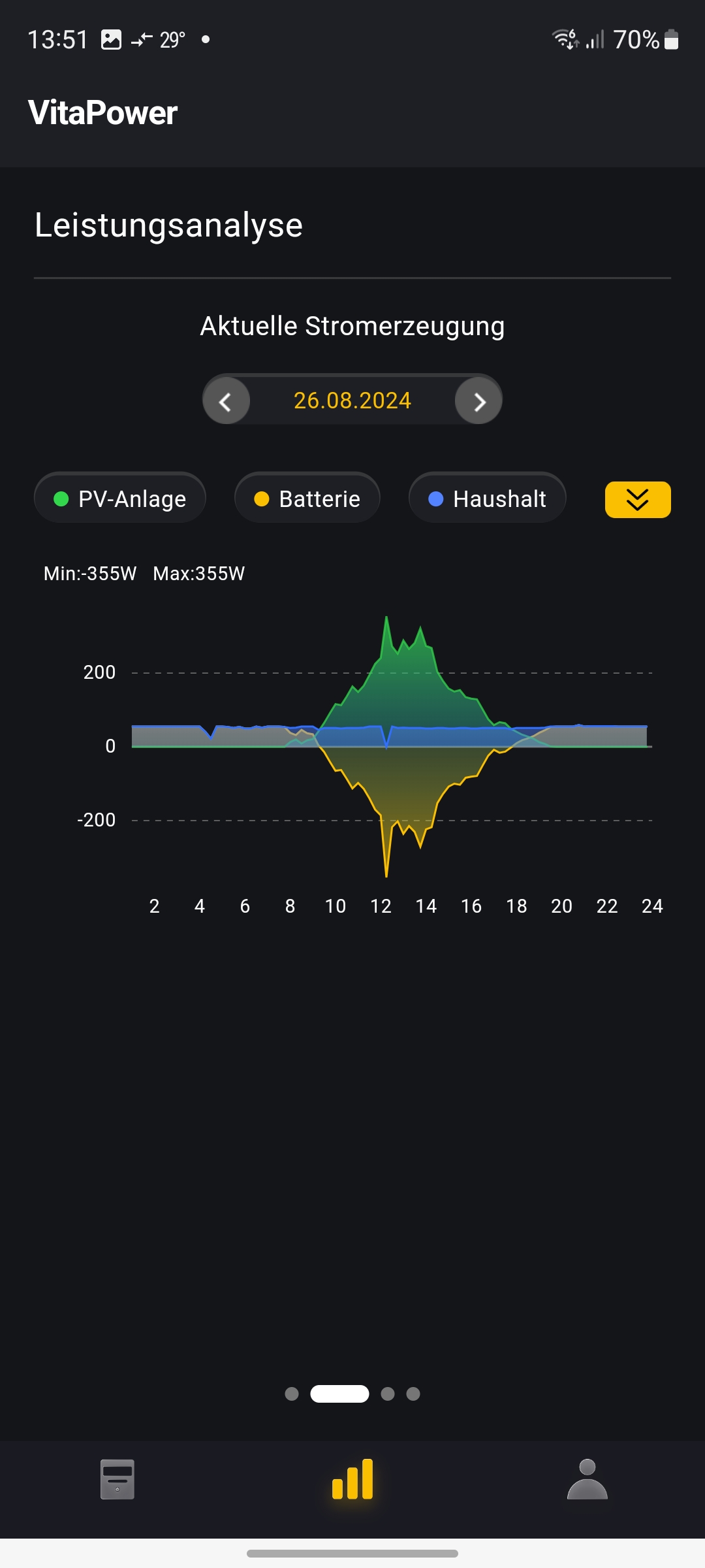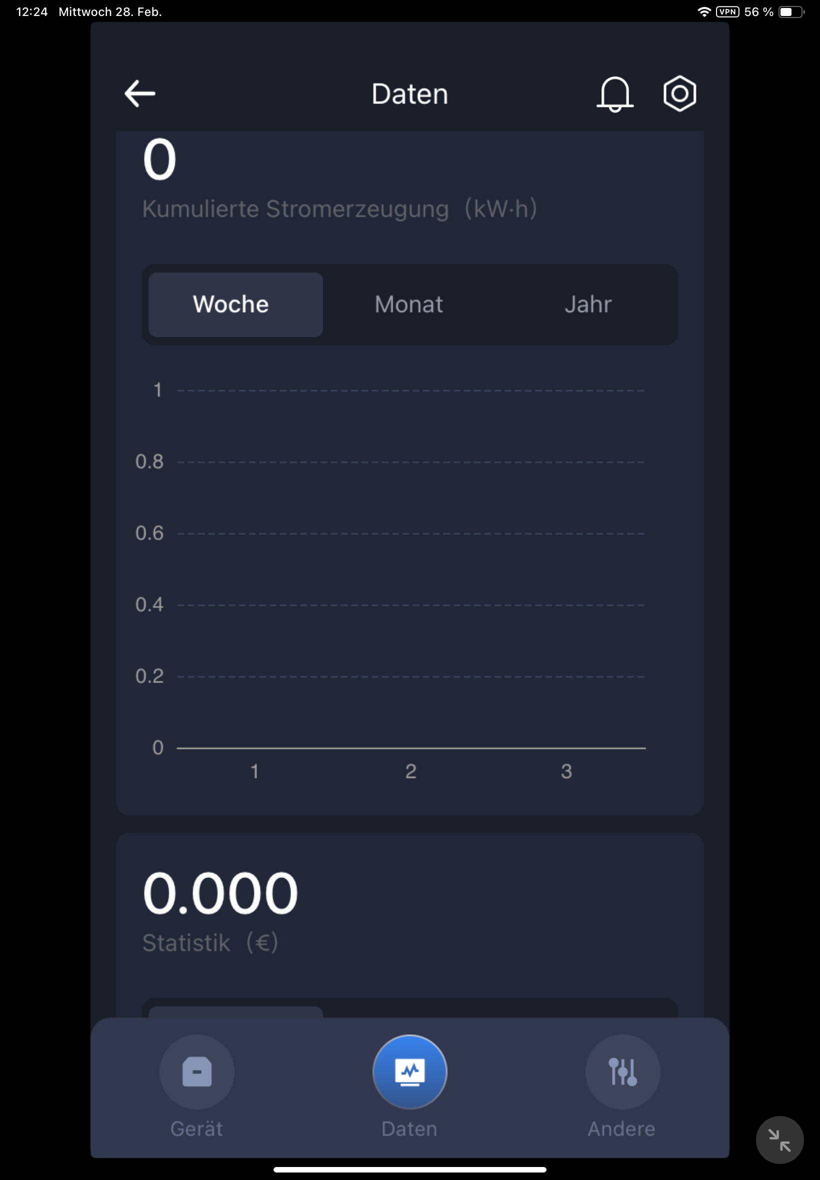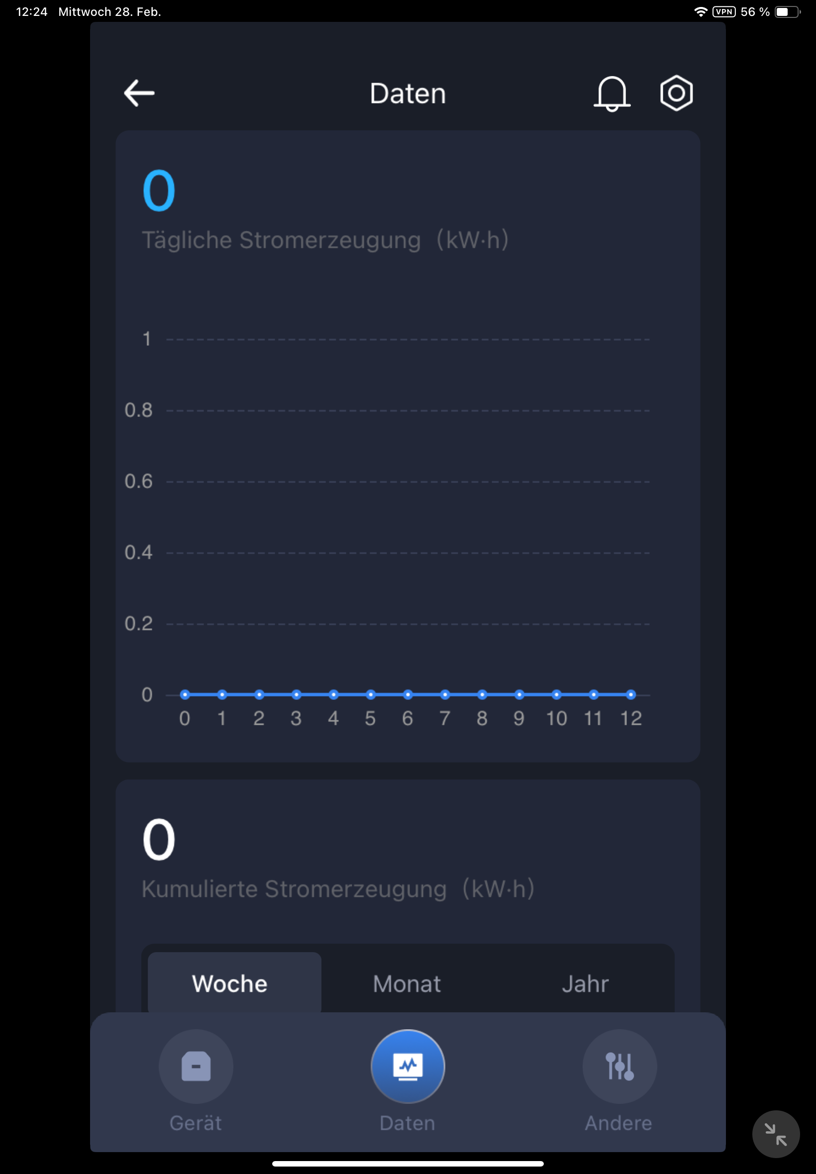 Verbesserungspotenzial bieten auch die Verlaufsdiagramme in der App zur produzierten Menge an Strom. So meldet die Tagesstatistik einen niedrigeren Wert als die Monatsstatistik für den betreffenden Tag. Ein Tages-,Wochen- oder Monats-Verlaufsdiagramm des Speicherstatus gibt es bislang nicht, soll aber noch kommen. Aktuell sieht man den Verlauf nur über einige Stunden. Wünschenswert wäre außerdem eine getrennte Auflistung der Leistungsabgabe nach Netzeinspeisung und Ausgabe der Notstromsteckdose. Aktuell liefert die App nur einen Wert für die Gesamtausgabe (AC-Leistung).