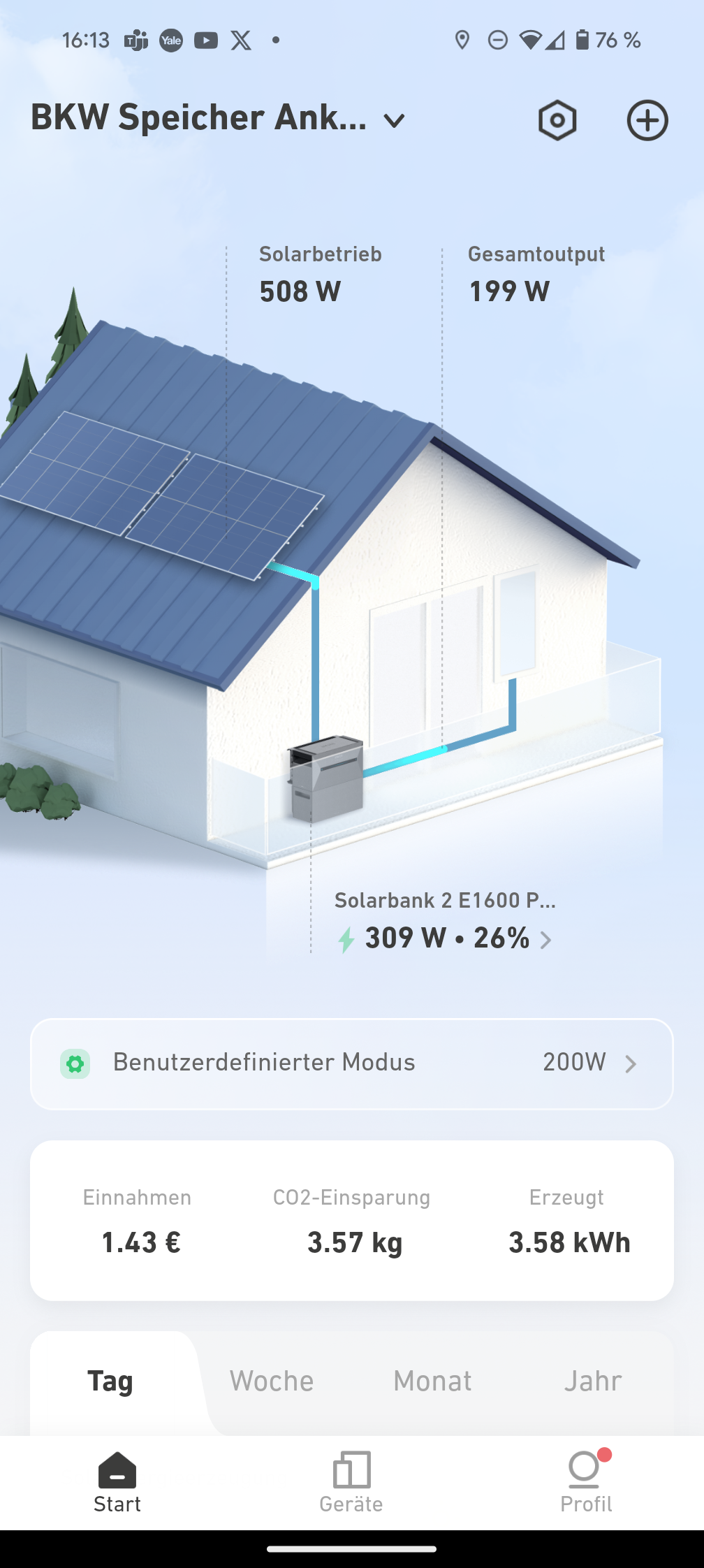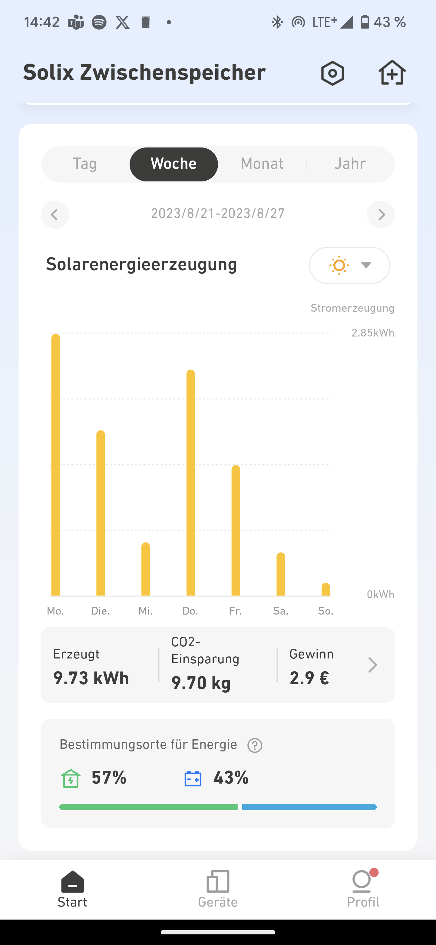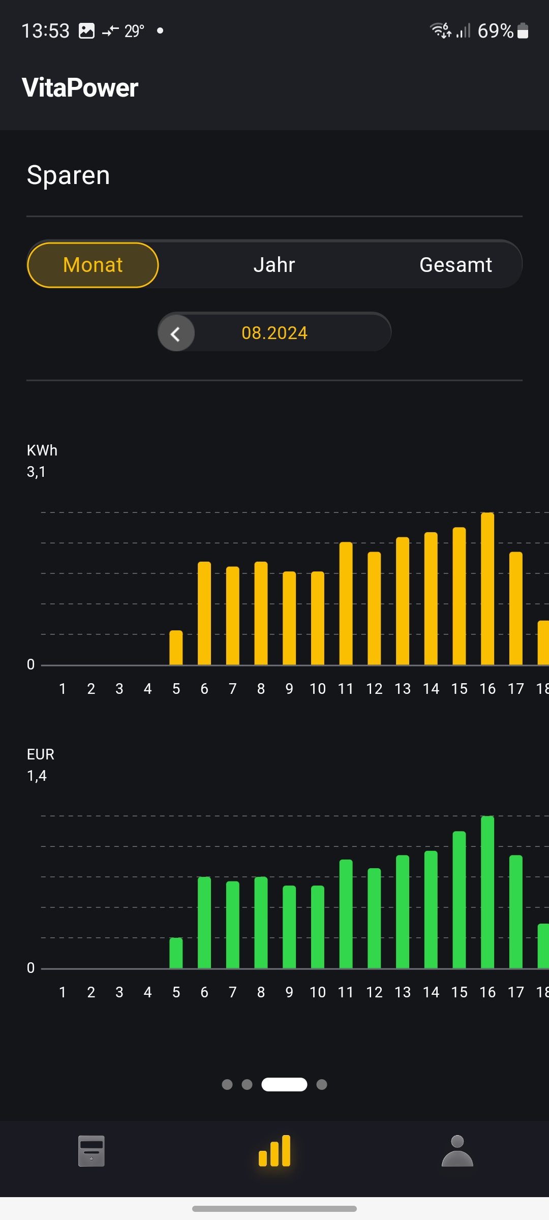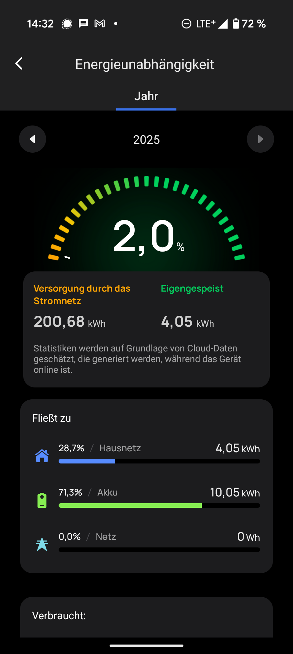 Verbesserungspotenzial bieten auch die Verlaufsdiagramme in der App zur produzierten Menge an Strom. So meldet die Tagesstatistik einen niedrigeren Wert als die Monatsstatistik für den betreffenden Tag. Ein Tages-,Wochen- oder Monats-Verlaufsdiagramm des Speicherstatus gibt es bislang nicht, soll aber noch kommen. Aktuell sieht man den Verlauf nur über einige Stunden. Wünschenswert wäre außerdem eine getrennte Auflistung der Leistungsabgabe nach Netzeinspeisung und Ausgabe der Notstromsteckdose. Aktuell liefert die App nur einen Wert für die Gesamtausgabe (AC-Leistung).