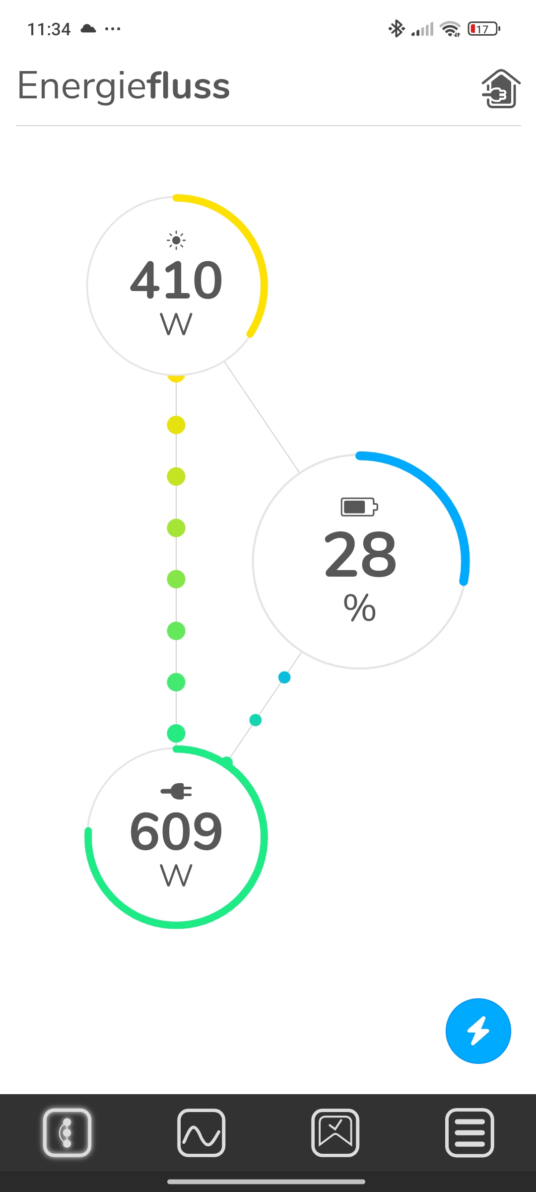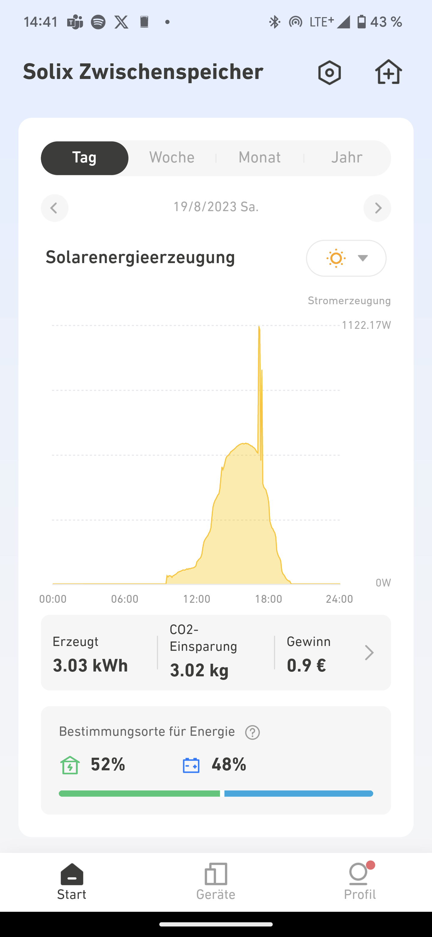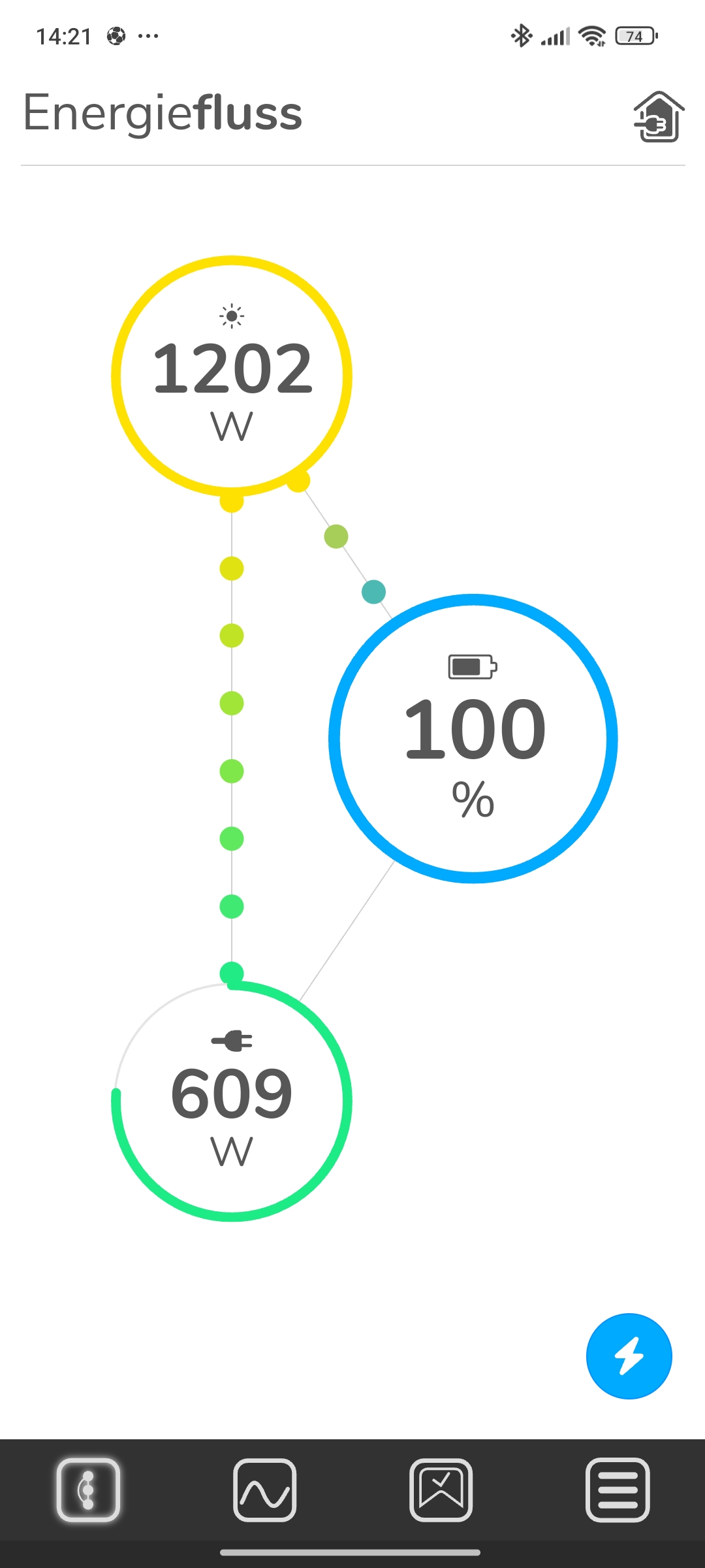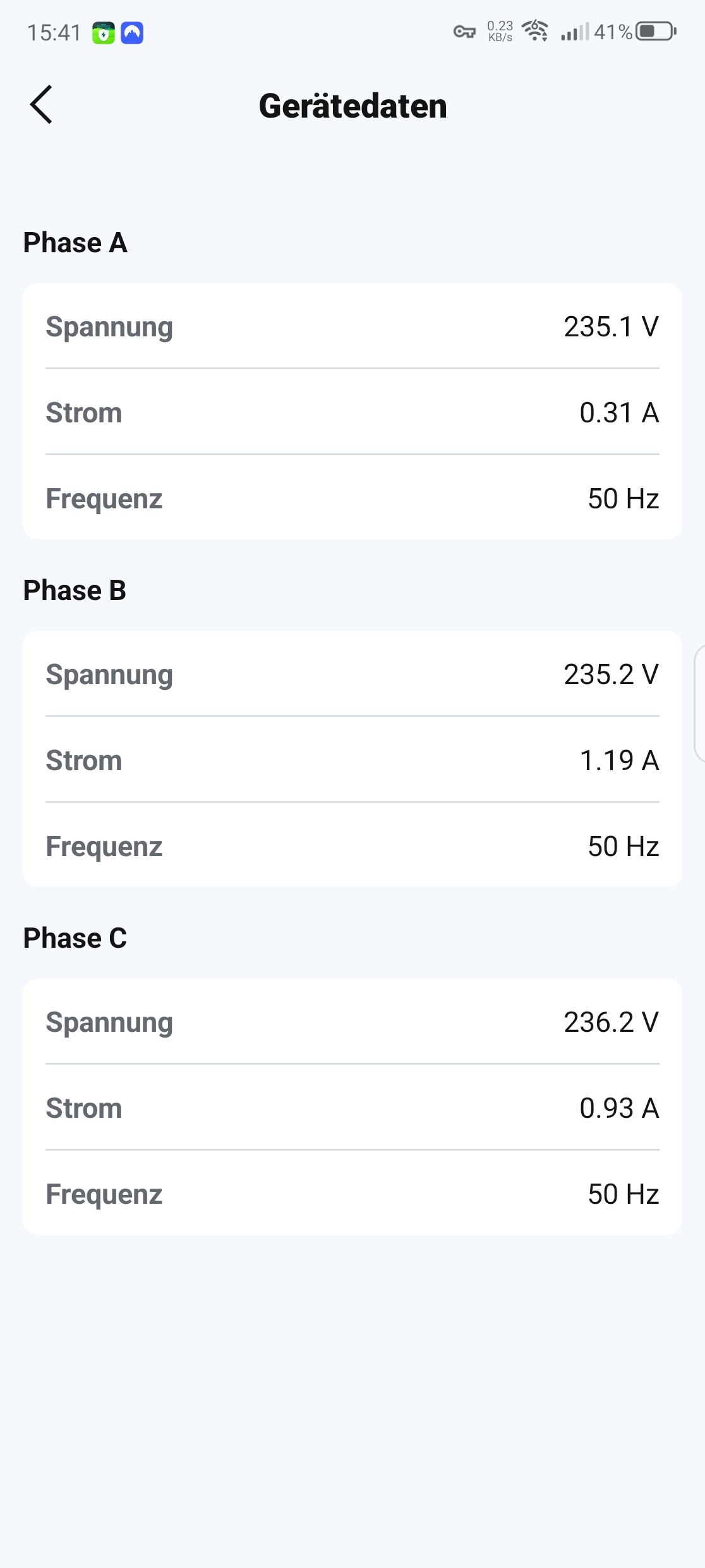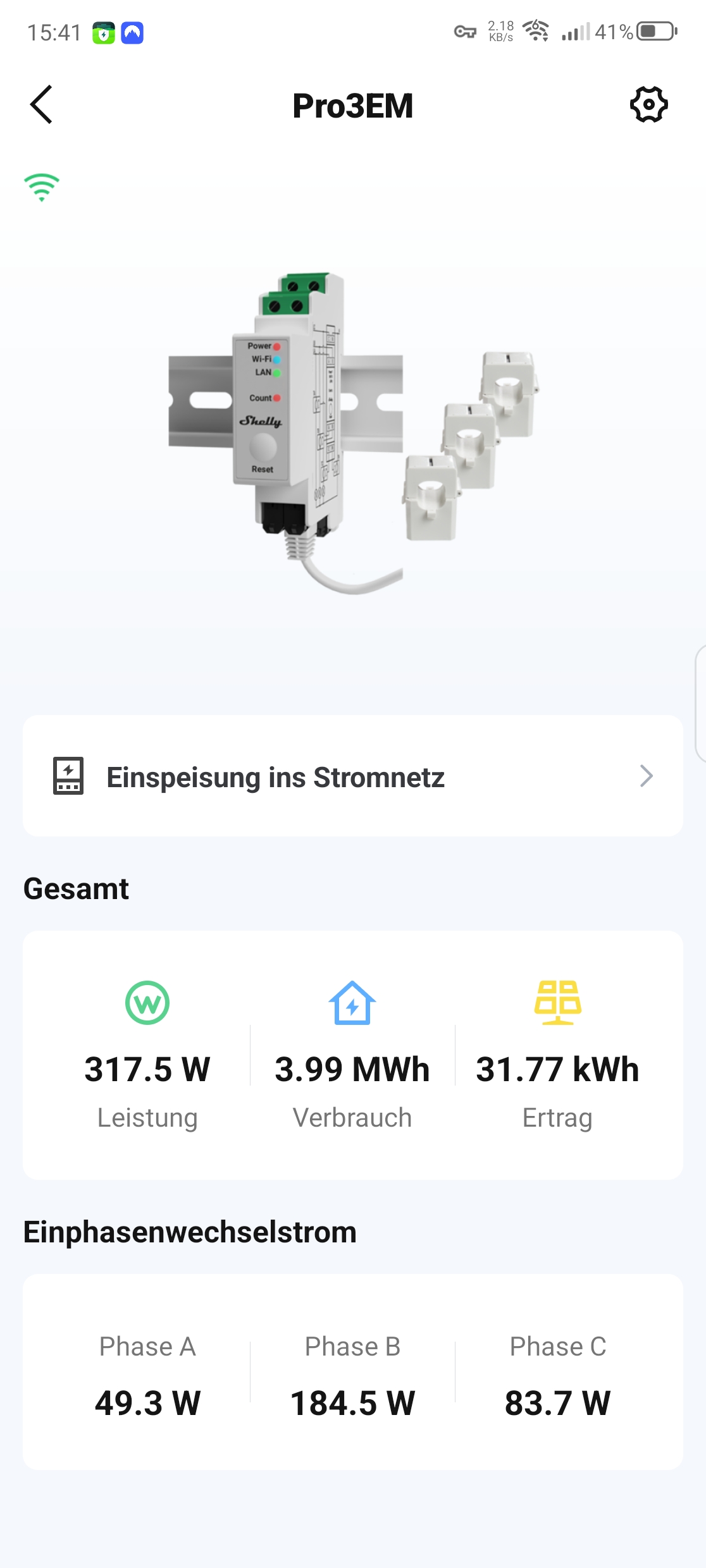 Der Blick auf den Shelly ist auch dann empfehlenswert, wenn man an Echtzeitdaten interessiert ist. Die Solakon-App stellt noch nicht alle Daten so schnell dar. Bei einigen Werten wie dem aktuellen Stromfluss, PV-Erzeugung, AC-Ausgabe, Speicherentladung, Smart Meter liegt die Aktualisierungsrate bei wenigen Sekunden, die PV-Leistung im großen Diagramm wird aber nur alle fünf Minuten aktualisiert.