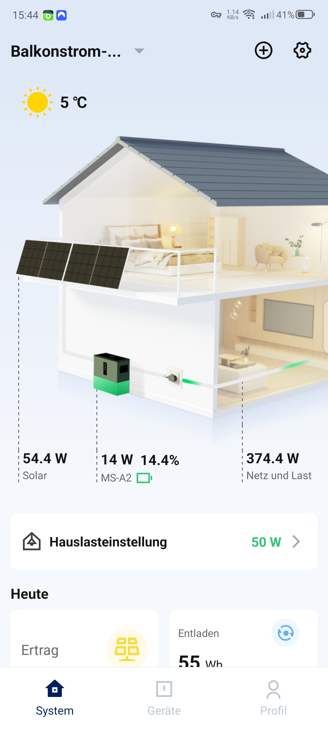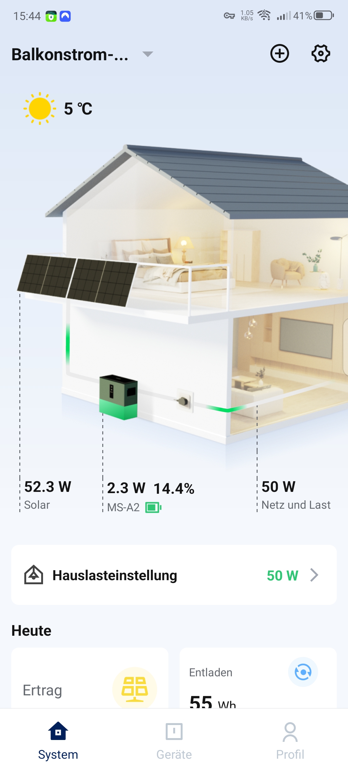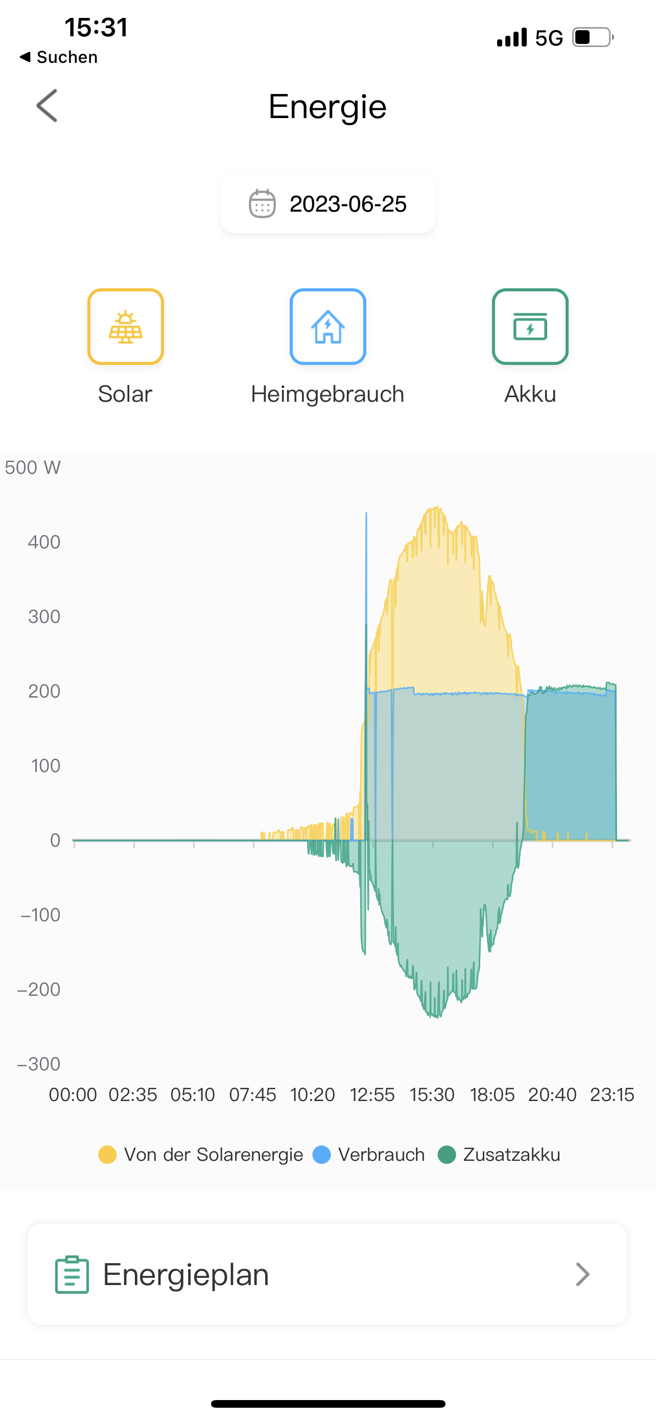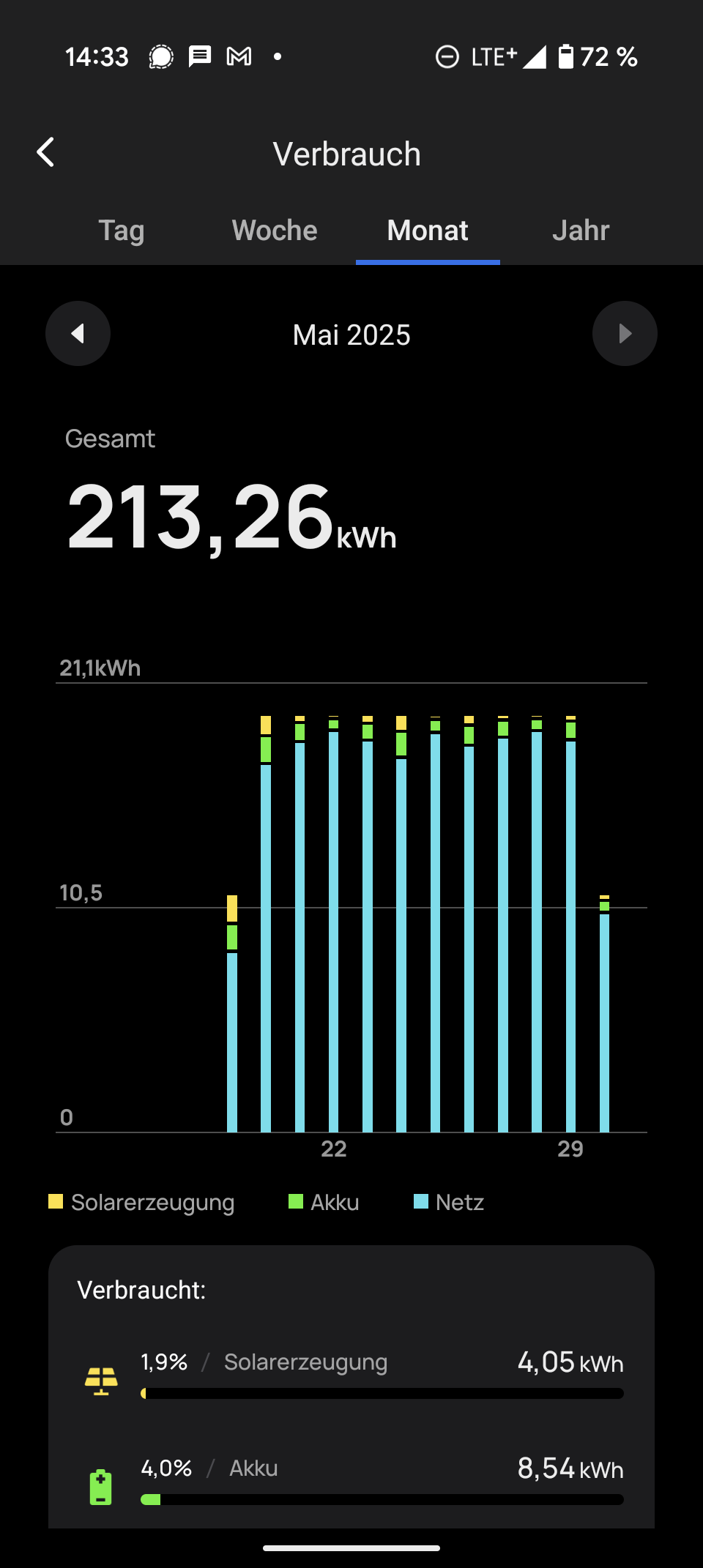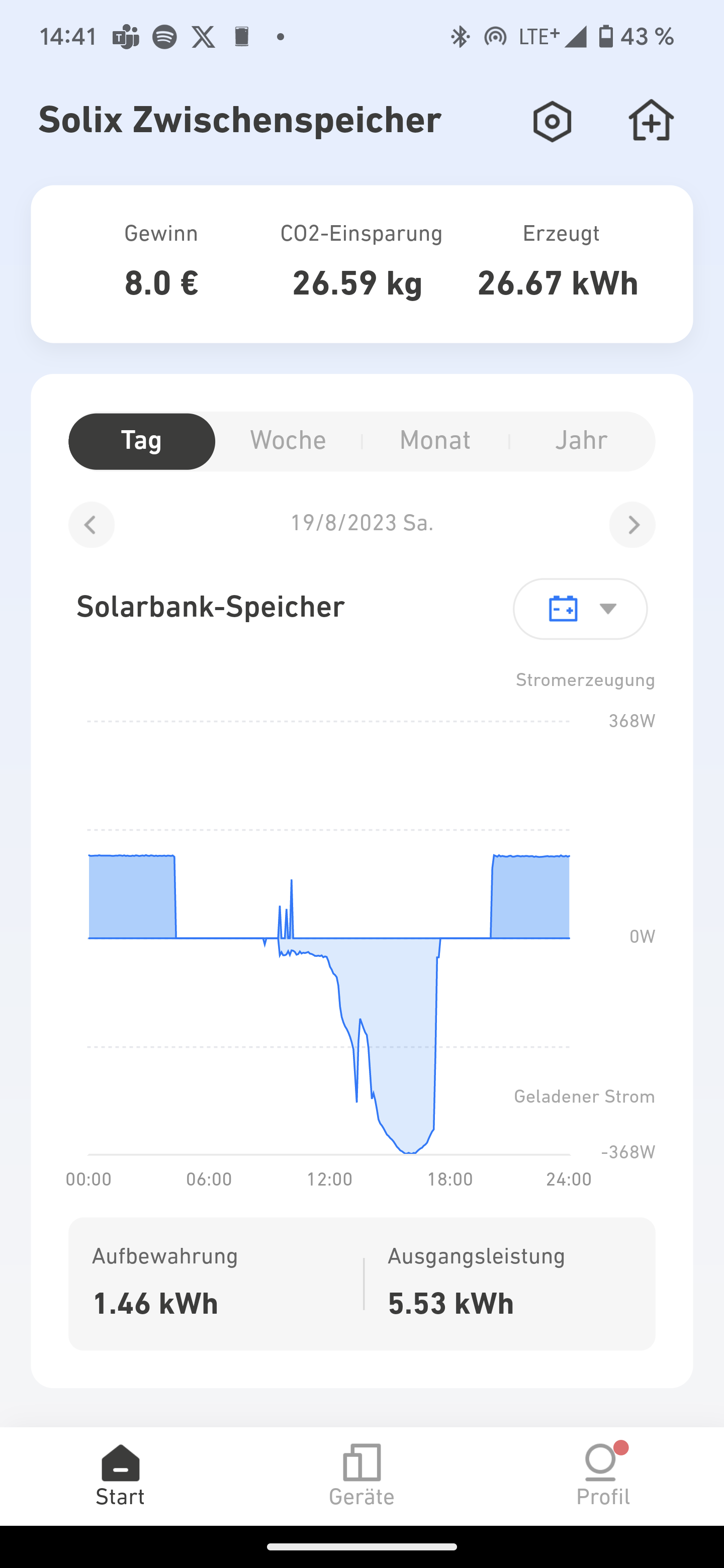Der Blick auf den Shelly ist auch dann empfehlenswert, wenn man an Echtzeitdaten interessiert ist. Die Solakon-App stellt noch nicht alle Daten so schnell dar. Bei einigen Werten wie dem aktuellen Stromfluss, PV-Erzeugung, AC-Ausgabe, Speicherentladung, Smart Meter liegt die Aktualisierungsrate bei wenigen Sekunden, die PV-Leistung im großen Diagramm wird aber nur alle fünf Minuten aktualisiert.
