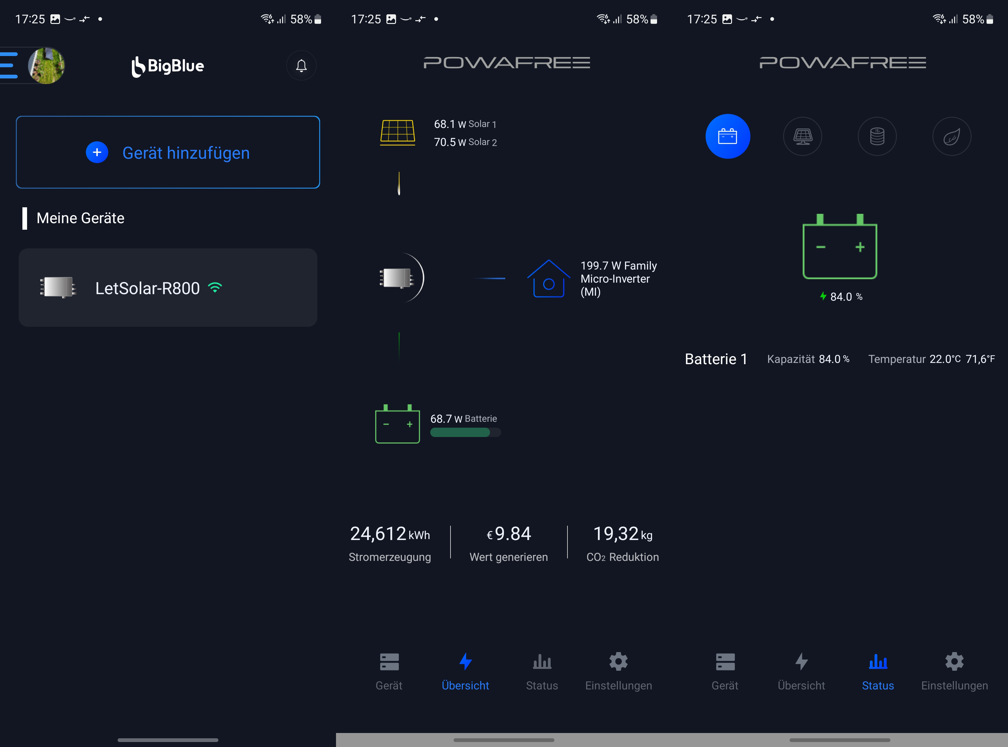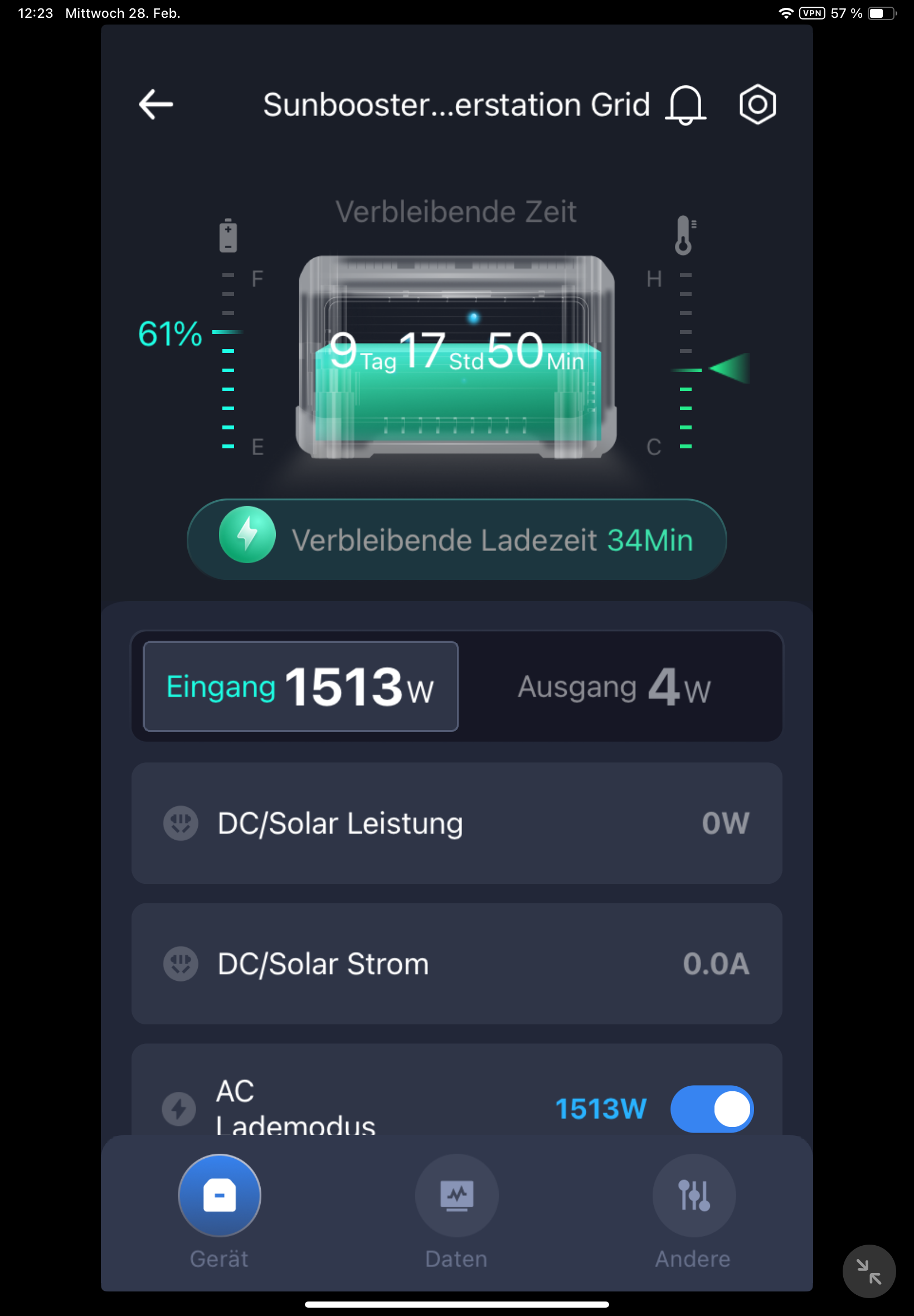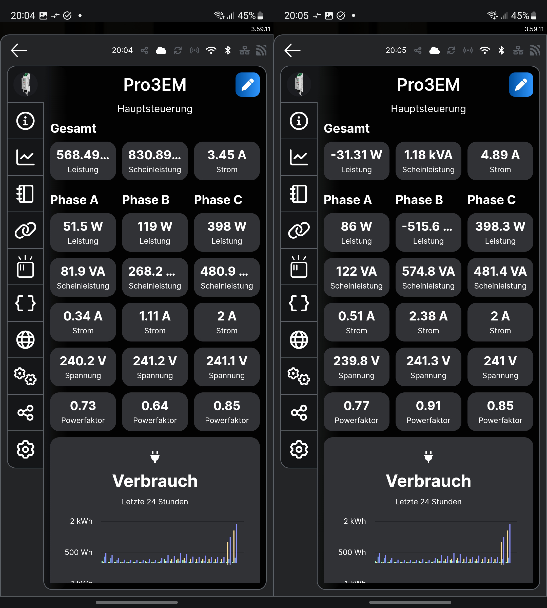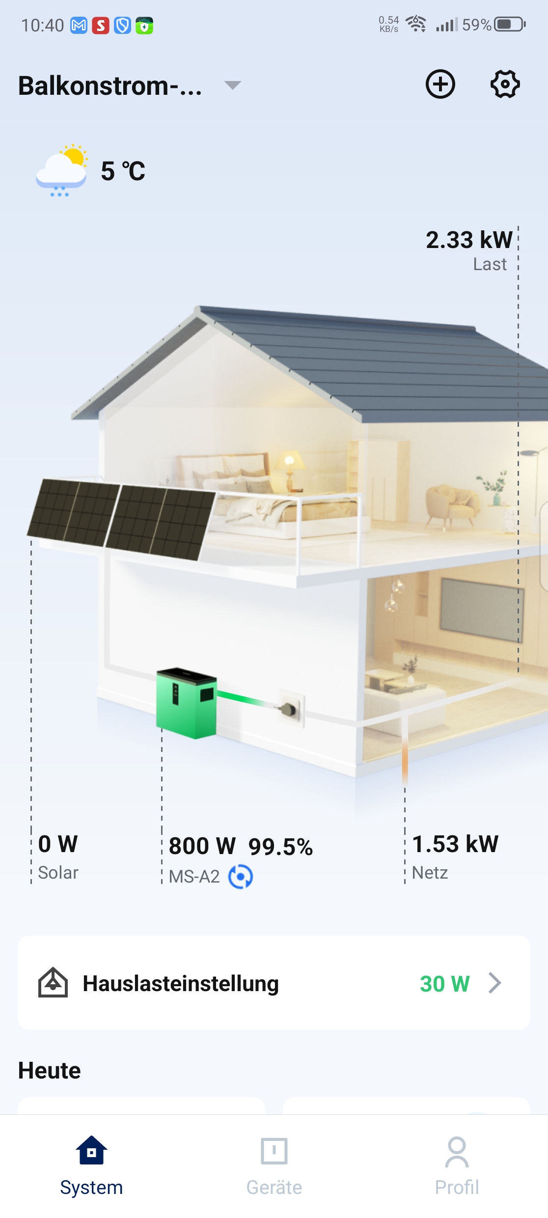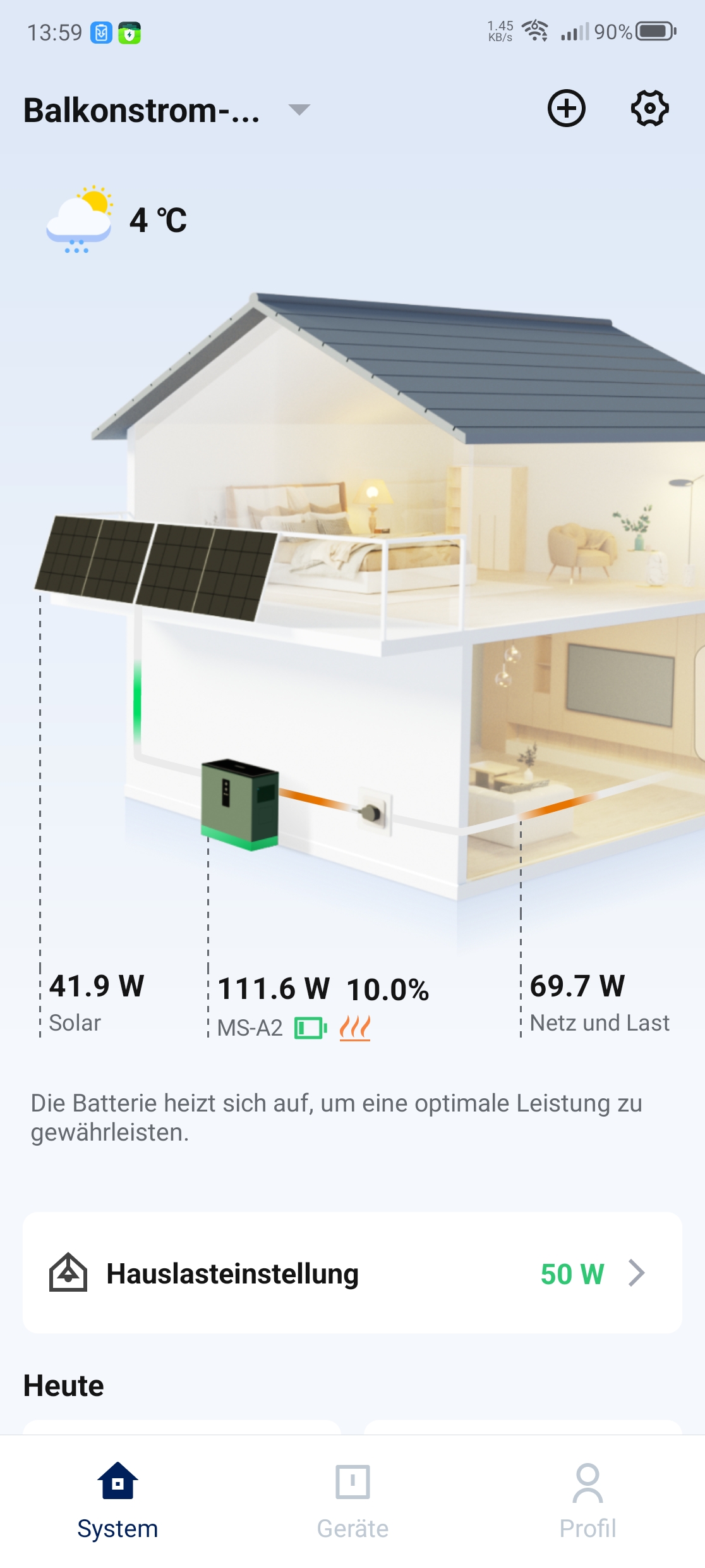 Der Blick auf den Shelly ist auch dann empfehlenswert, wenn man an Echtzeitdaten interessiert ist. Die Solakon-App stellt noch nicht alle Daten so schnell dar. Bei einigen Werten wie dem aktuellen Stromfluss, PV-Erzeugung, AC-Ausgabe, Speicherentladung, Smart Meter liegt die Aktualisierungsrate bei wenigen Sekunden, die PV-Leistung im großen Diagramm wird aber nur alle fünf Minuten aktualisiert.