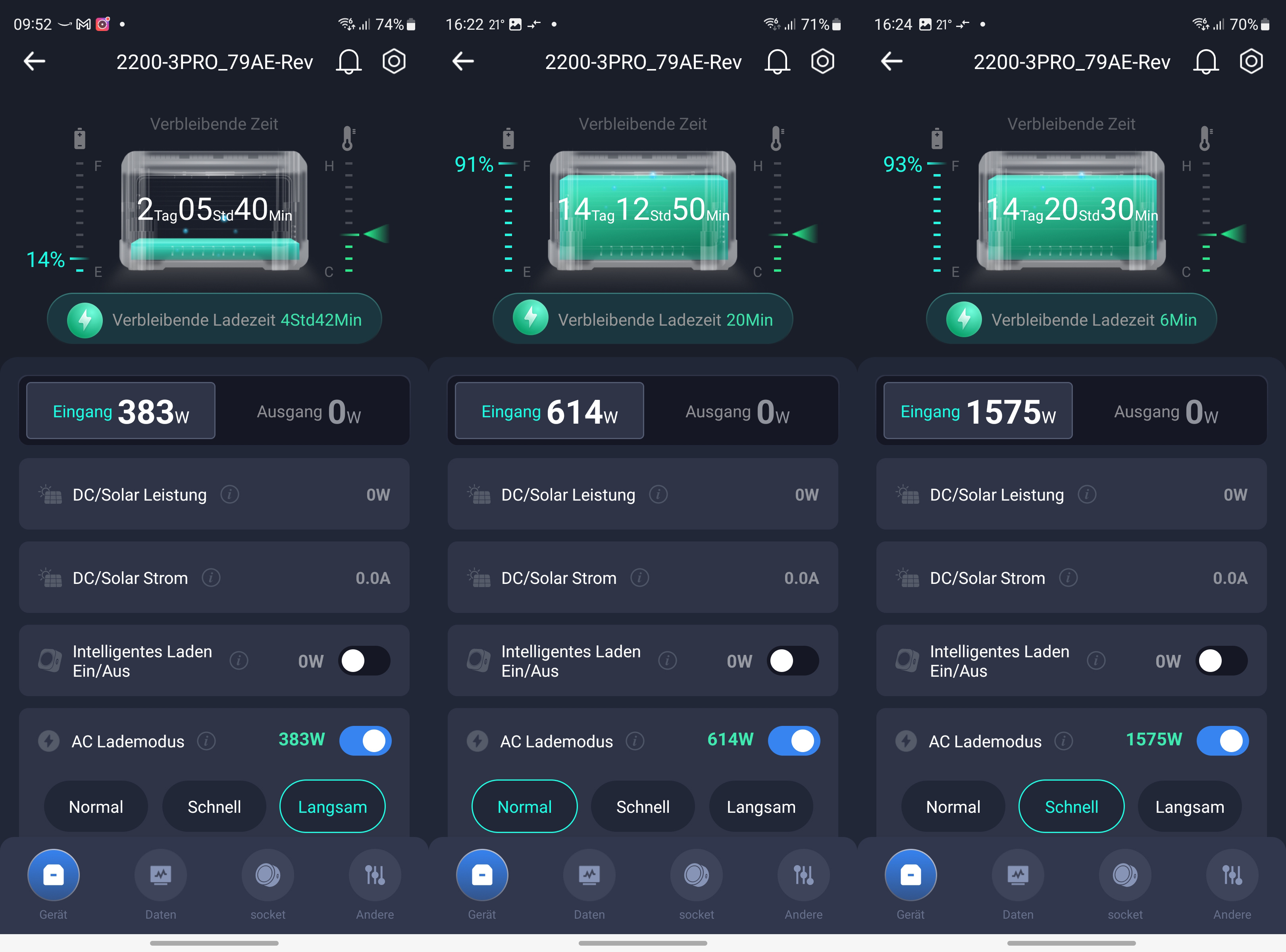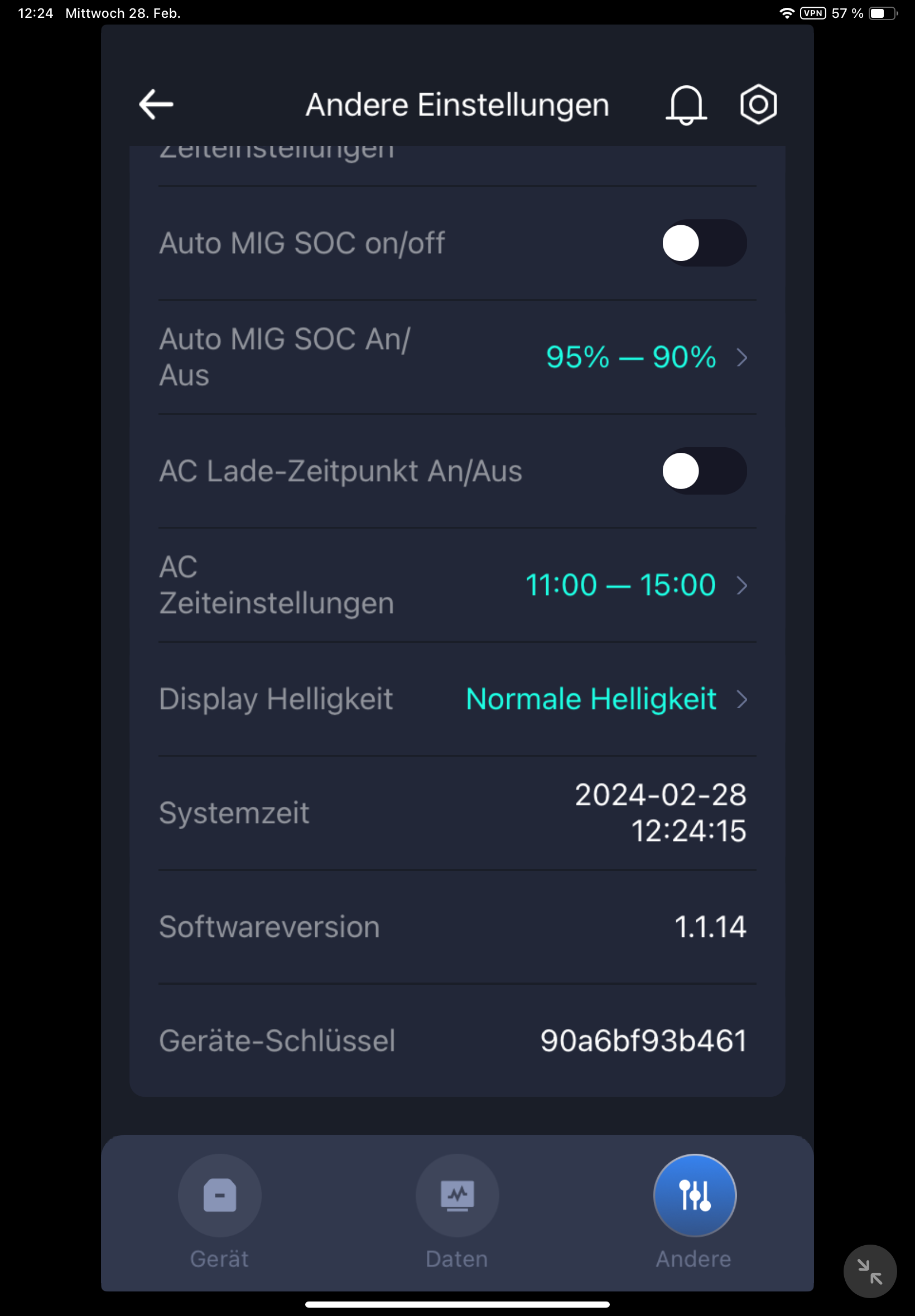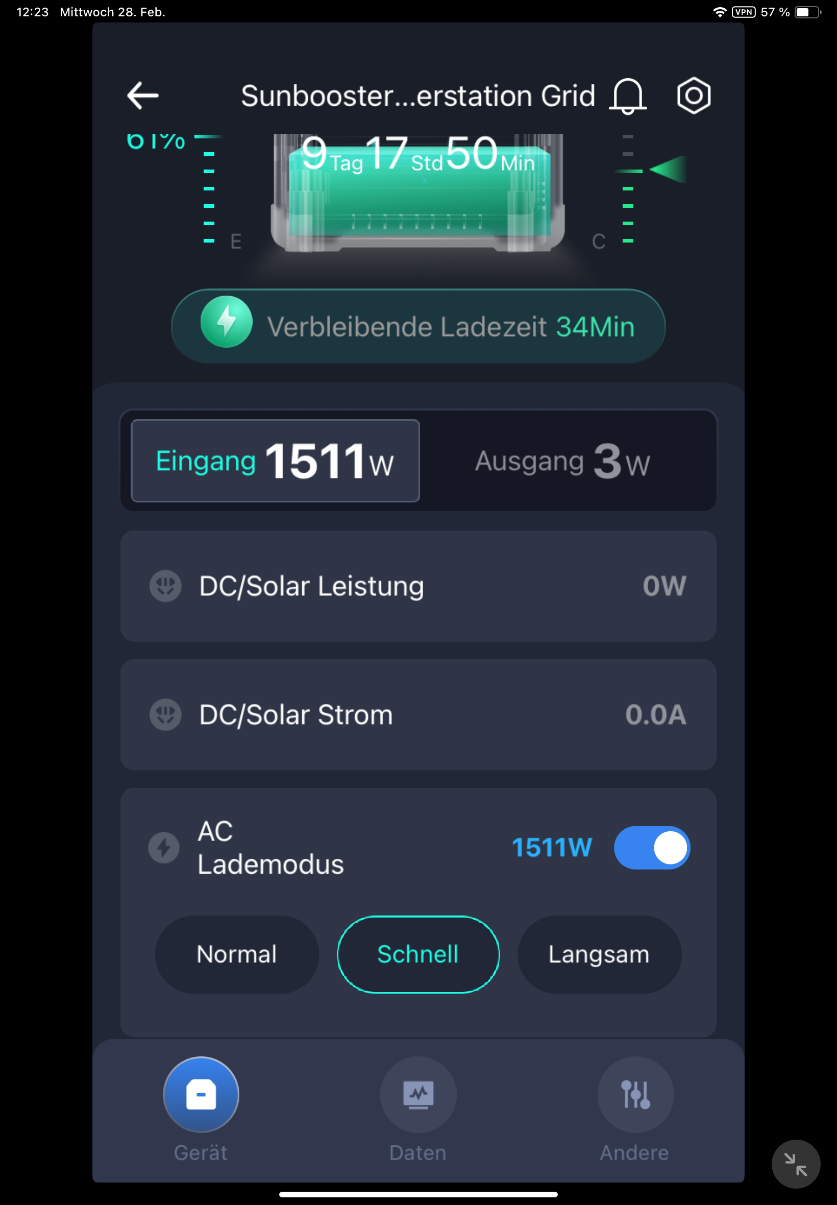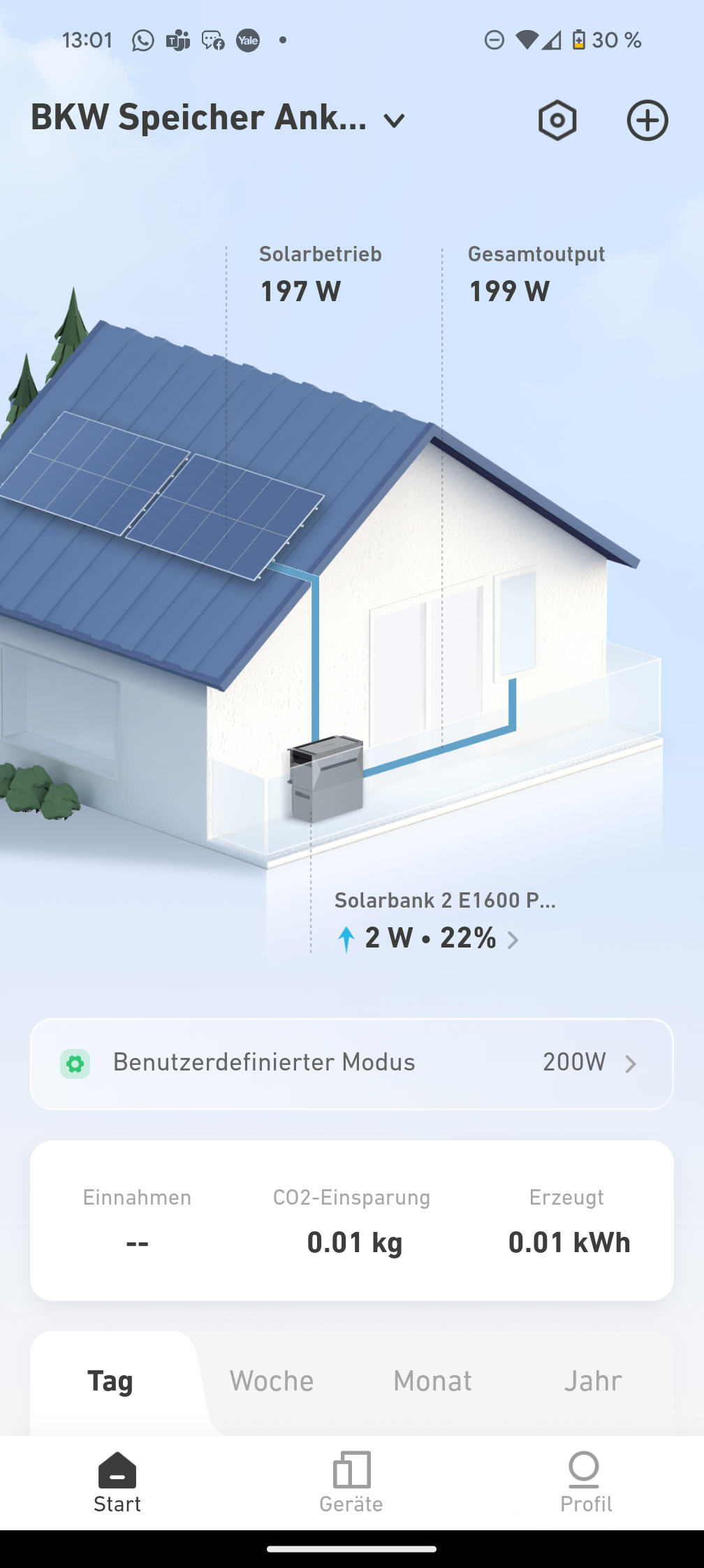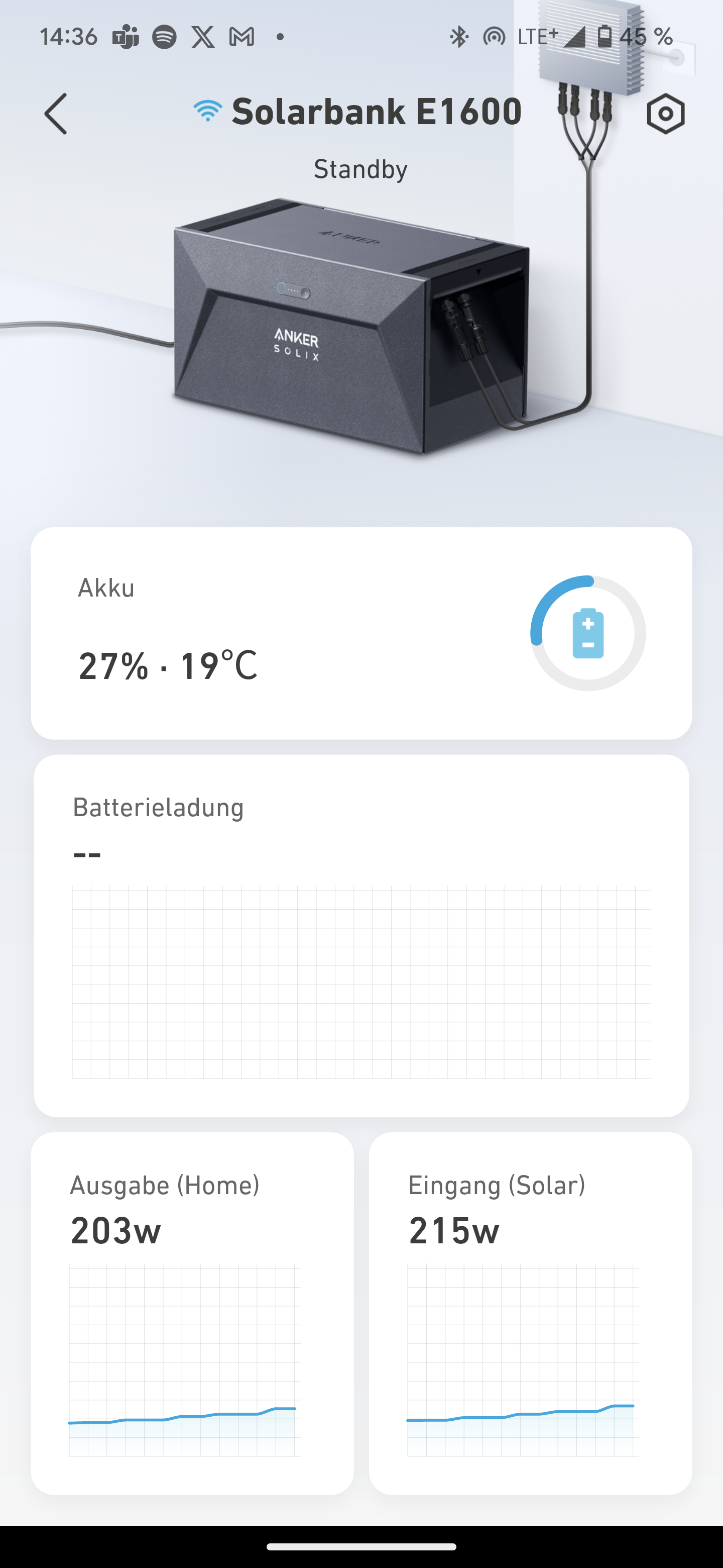 Der Blick auf den Shelly ist auch dann empfehlenswert, wenn man an Echtzeitdaten interessiert ist. Die Solakon-App stellt noch nicht alle Daten so schnell dar. Bei einigen Werten wie dem aktuellen Stromfluss, PV-Erzeugung, AC-Ausgabe, Speicherentladung, Smart Meter liegt die Aktualisierungsrate bei wenigen Sekunden, die PV-Leistung im großen Diagramm wird aber nur alle fünf Minuten aktualisiert.