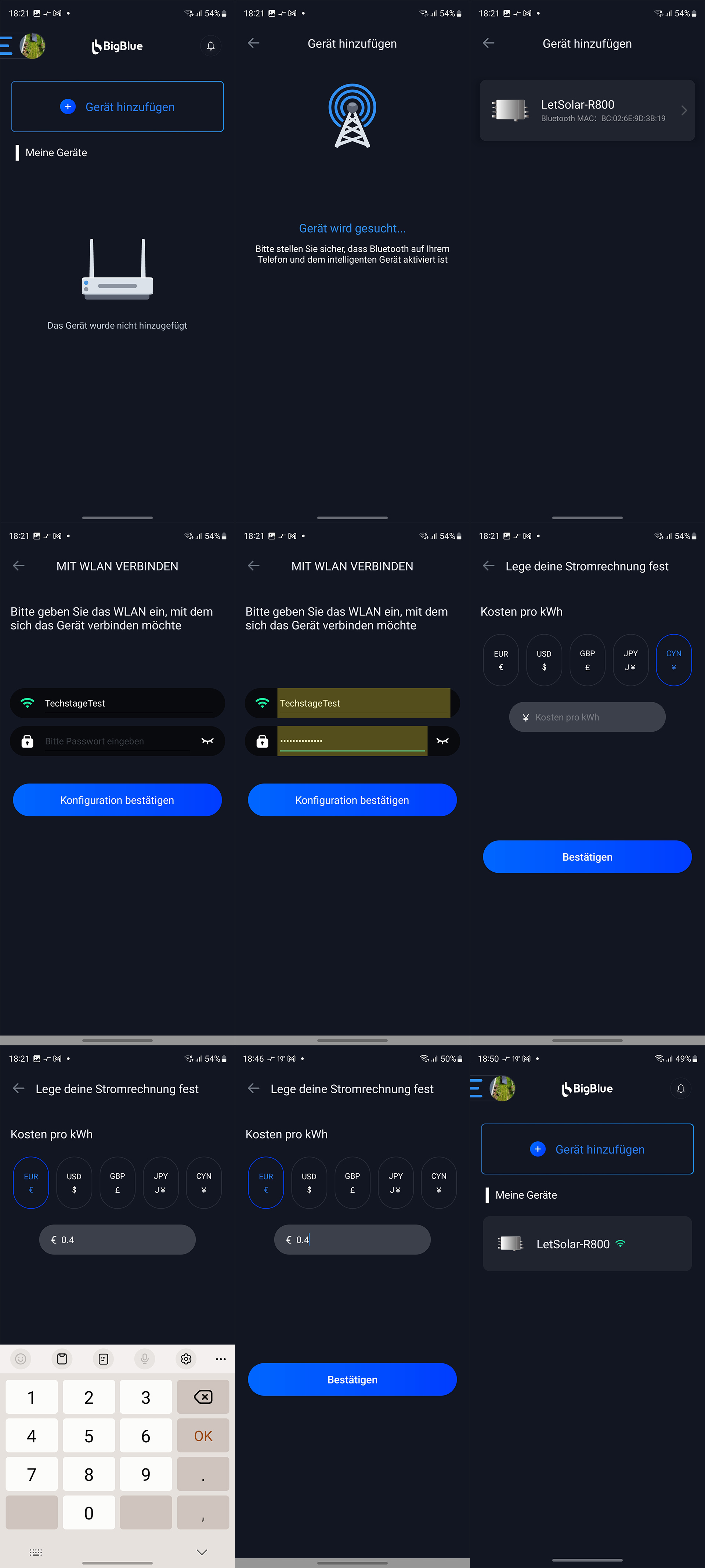 Anschließen wählt man aus den Optionen Balkonkraftwerk, Balkonkraftwerk mit Speicher und Solakon One, letztere aus, legt die Anzahl der angeschlossenen Solarmodule fest und benennt die Anlage. Dann folgt die Konfiguration, die einen Hinweis zum Anbringen der Antenne zeigt. Über Bluetooth erfolgt nun die Verbindung zum Speicher, den man mit dem heimischen Router koppelt. Weitere Einzelheiten zeigt die Bildergalerie.