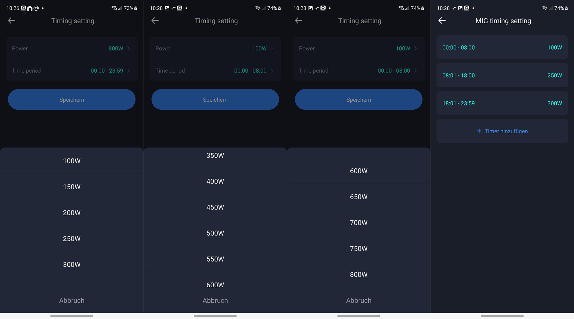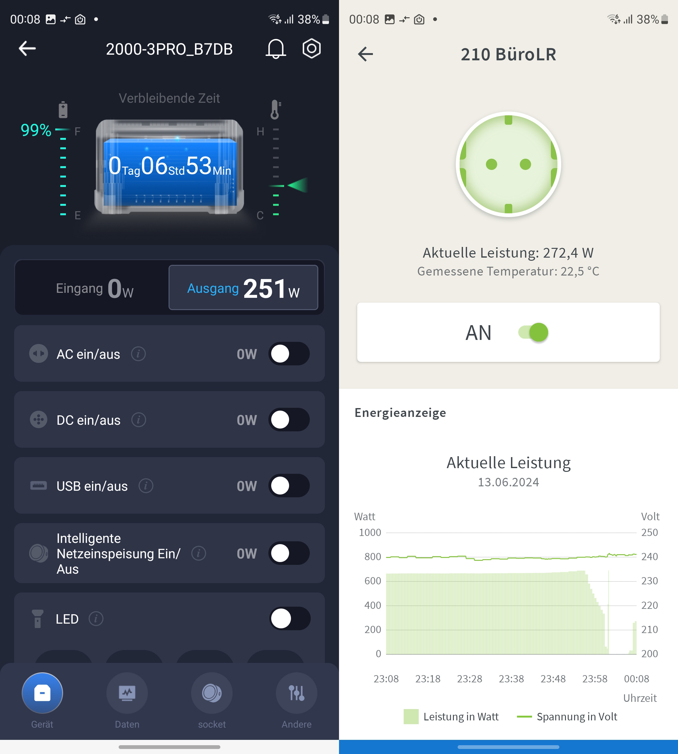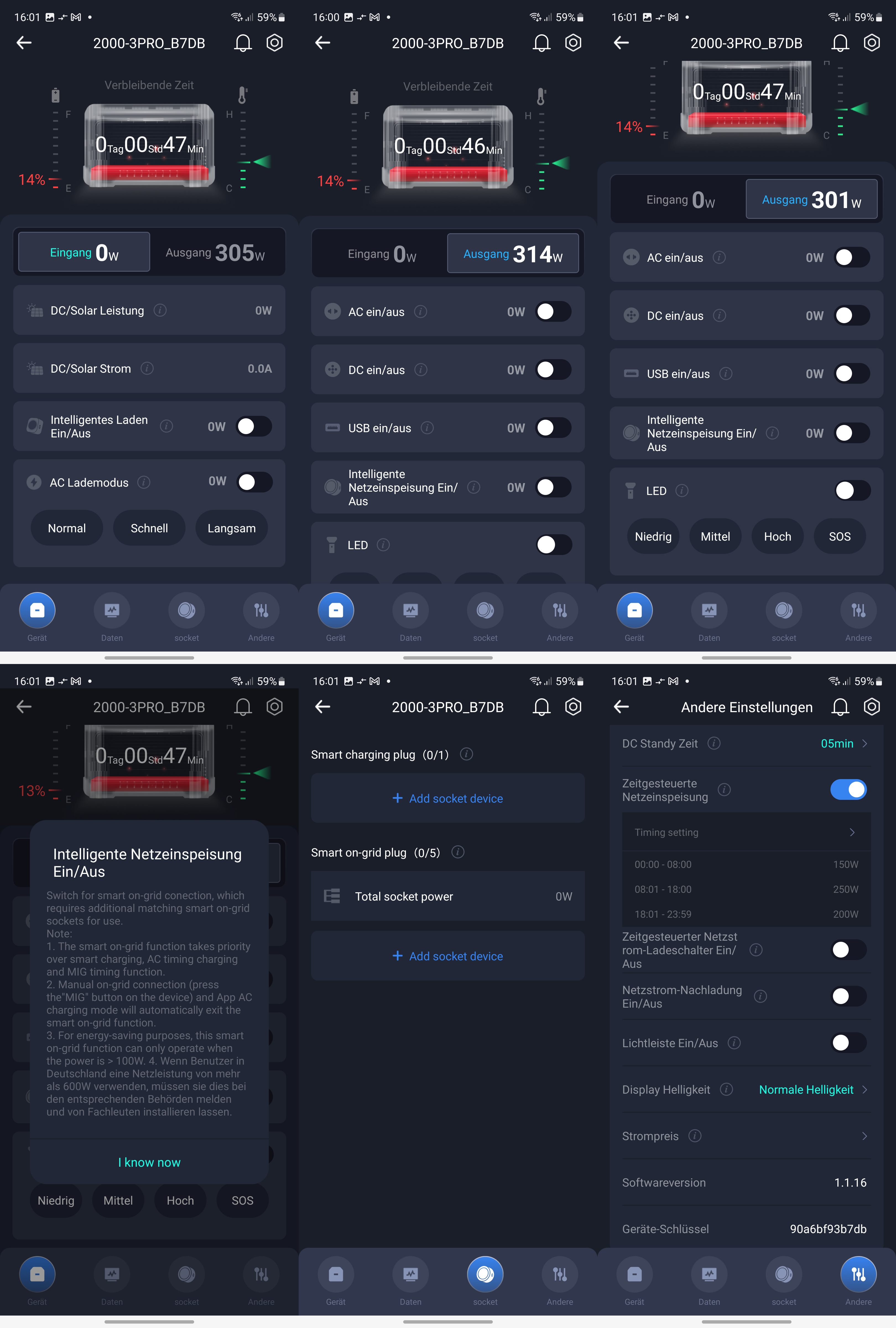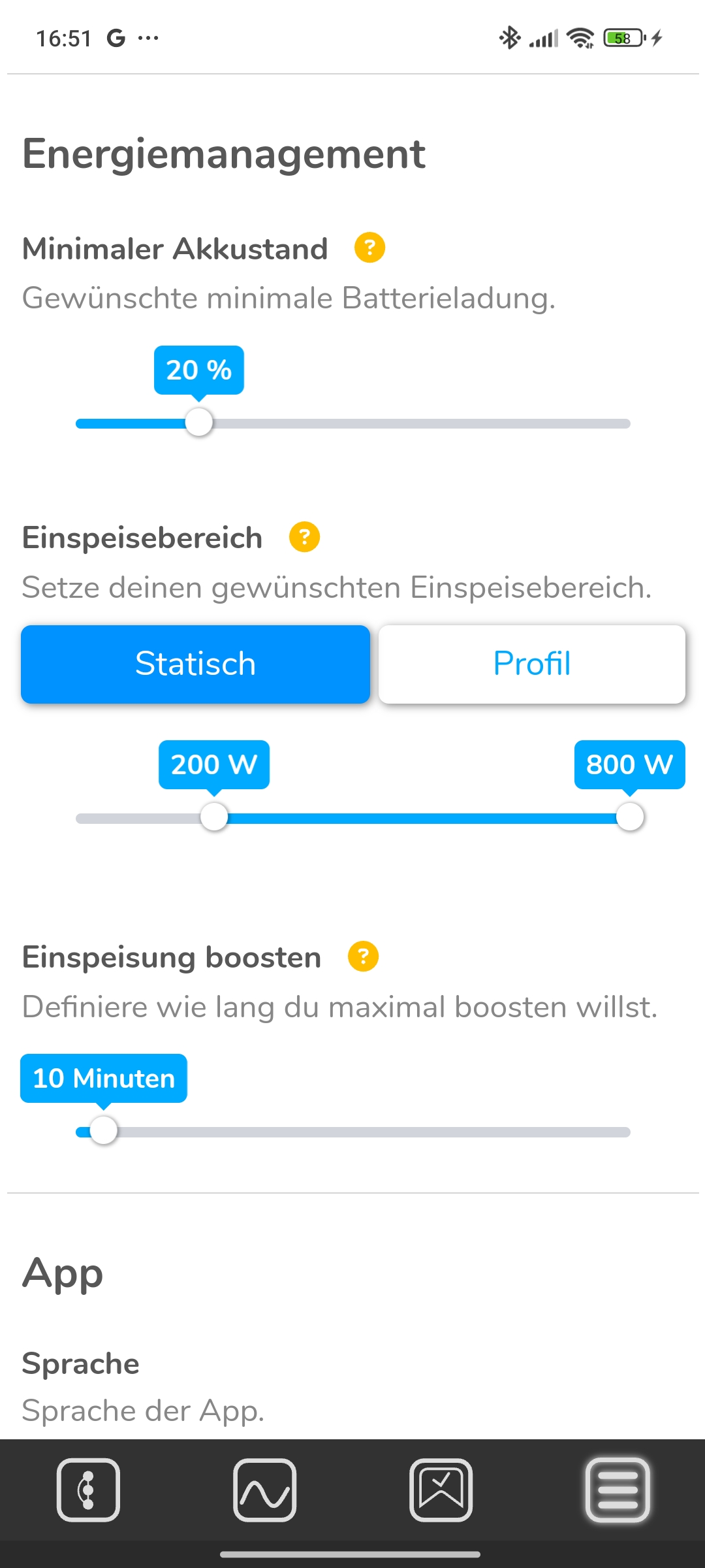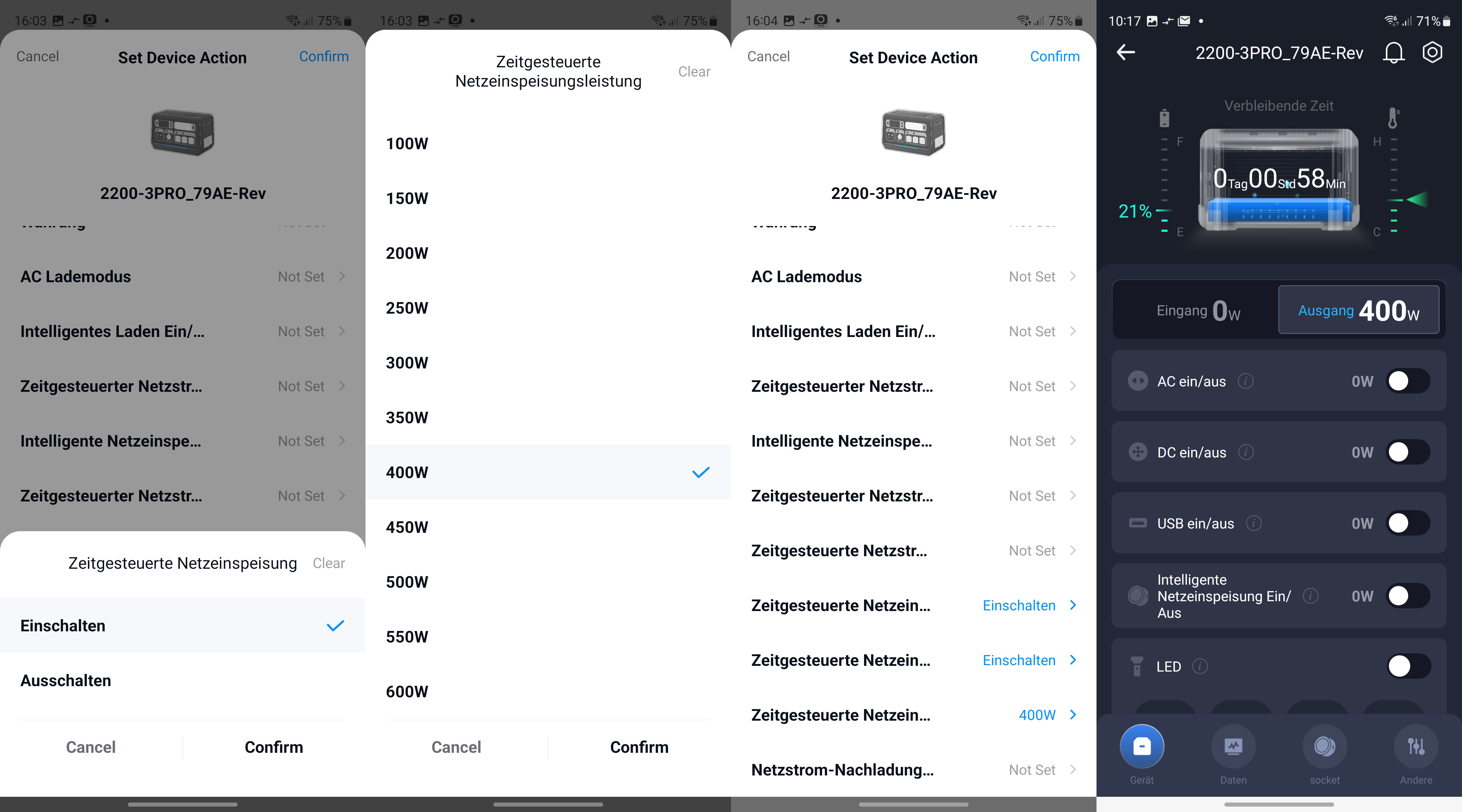 Wer will, kann die Einspeisung ins Hausnetz zwar auch direkt an der Powerstation starten, dann fließen allerdings immer fix 200 Watt ins Hausnetz. Wer das volle Potenzial nutzen will, benötigt deshalb die App. Die bietet in ihrer neuesten Version eine manuelle Einstellung der Einspeiseleistung in 50-Watt-Schritten zwischen 100 und 800 Watt. Wann exakt wie viel Leistung fließt, kann bequem per Zeitplan eingestellt werden, was im Test zuverlässig funktioniert hat. Das haben wir mit einer smarten Steckdose mit Verbrauchsmessung (Bestenliste) überprüft.