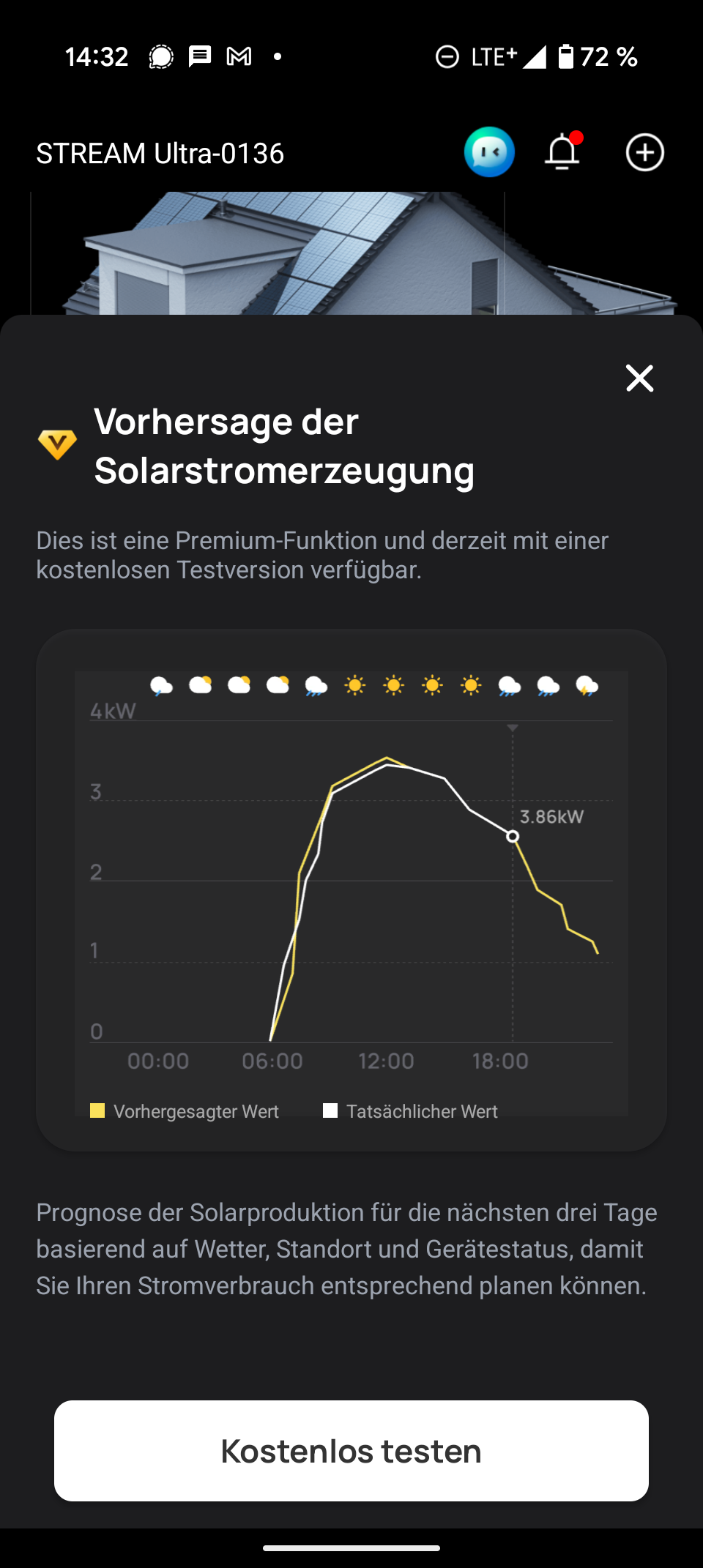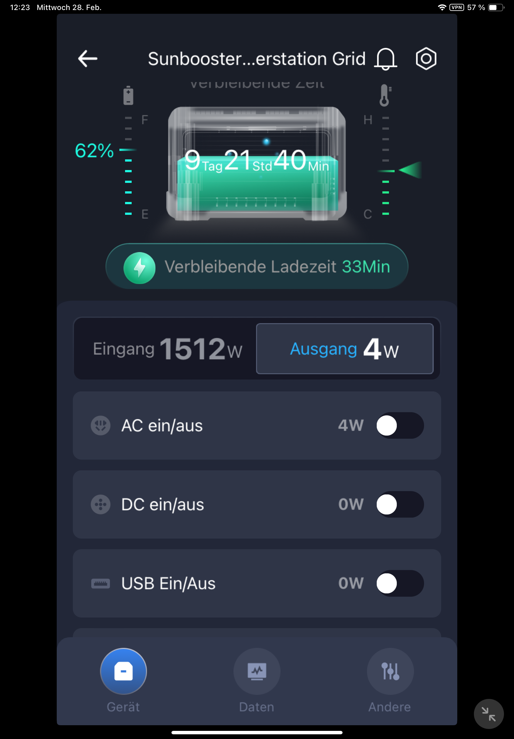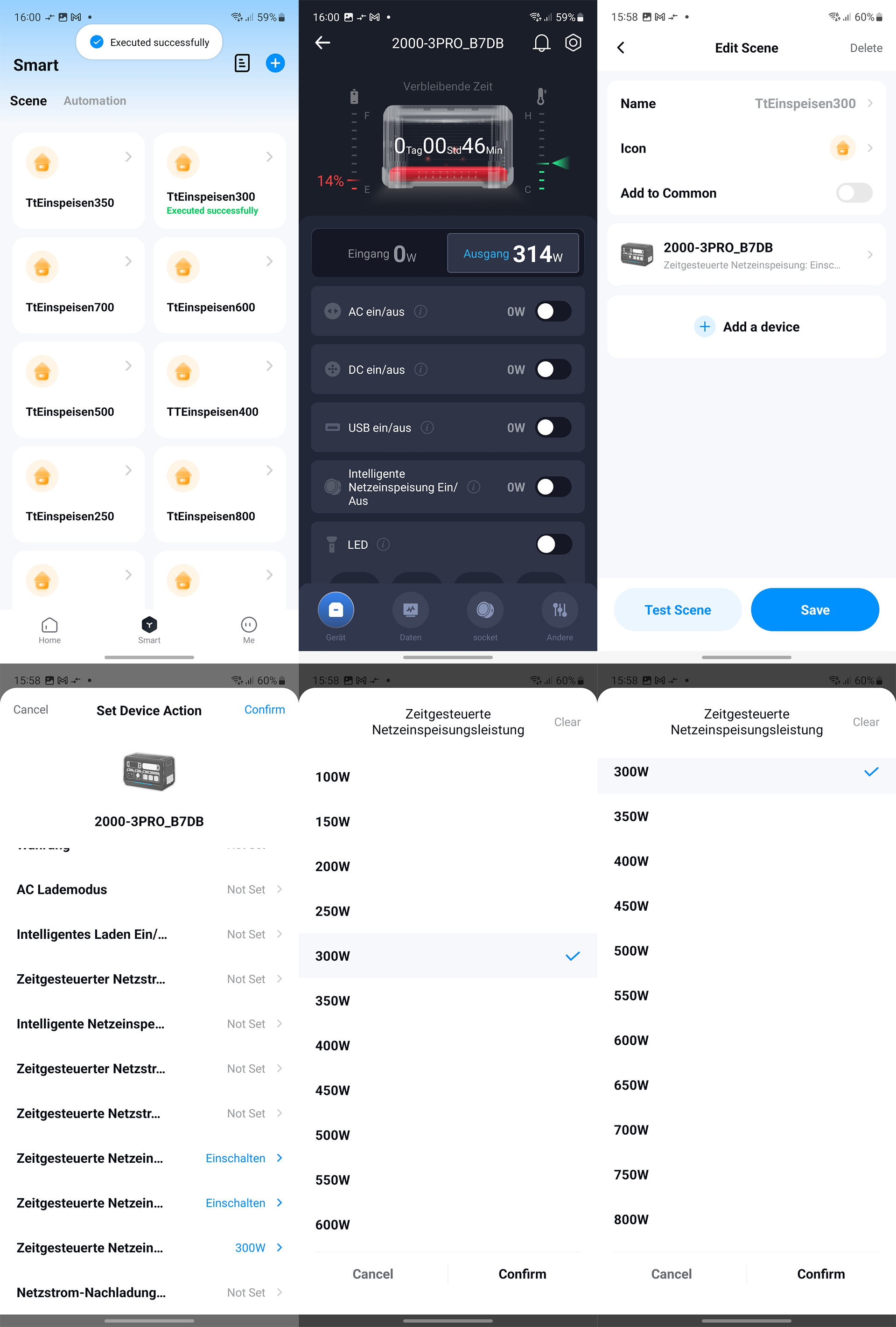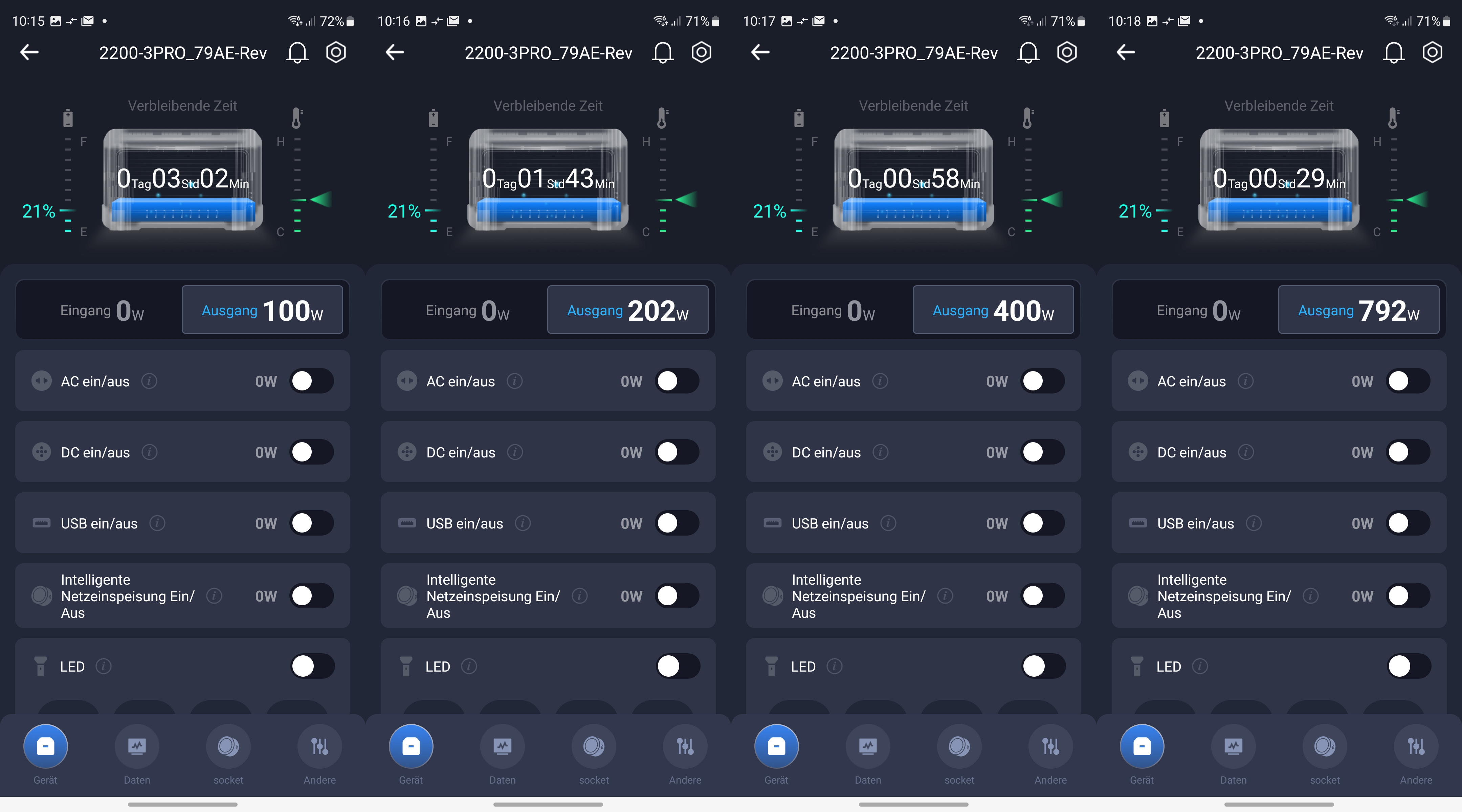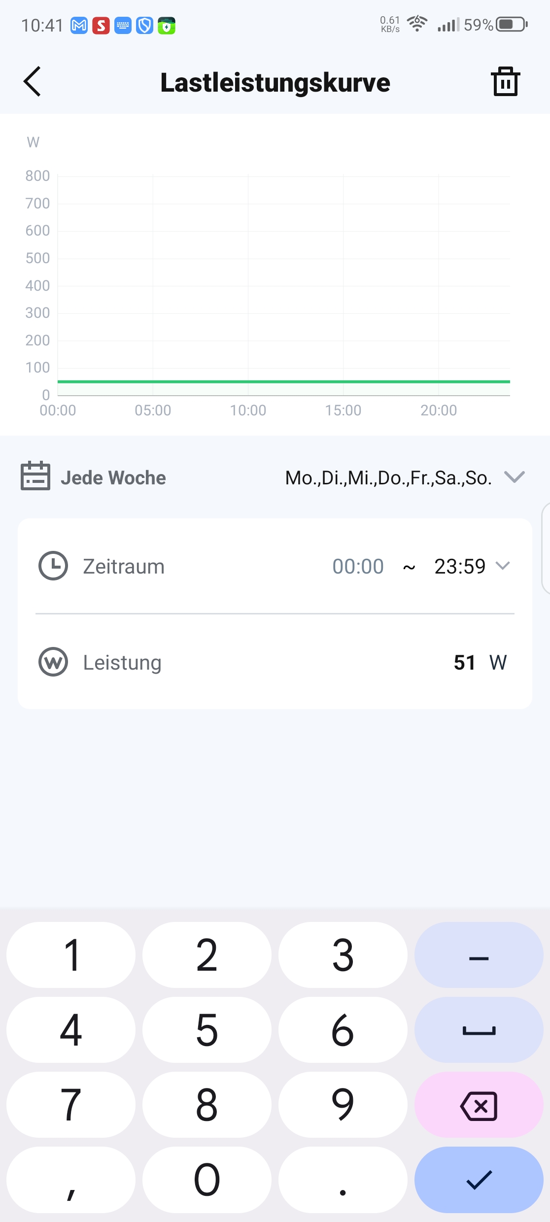 Wer will, kann die Einspeisung ins Hausnetz zwar auch direkt an der Powerstation starten, dann fließen allerdings immer fix 200 Watt ins Hausnetz. Wer das volle Potenzial nutzen will, benötigt deshalb die App. Die bietet in ihrer neuesten Version eine manuelle Einstellung der Einspeiseleistung in 50-Watt-Schritten zwischen 100 und 800 Watt. Wann exakt wie viel Leistung fließt, kann bequem per Zeitplan eingestellt werden, was im Test zuverlässig funktioniert hat. Das haben wir mit einer smarten Steckdose mit Verbrauchsmessung (Bestenliste) überprüft.