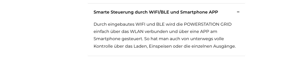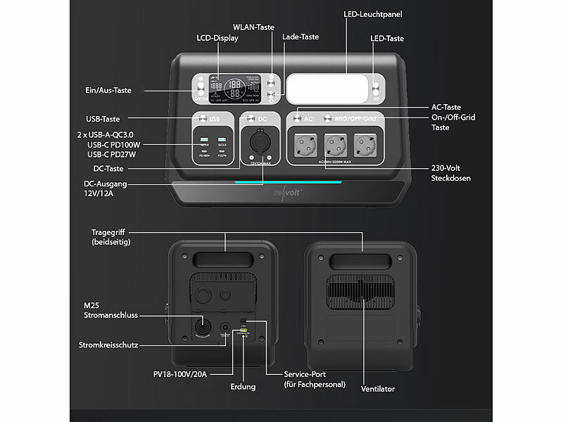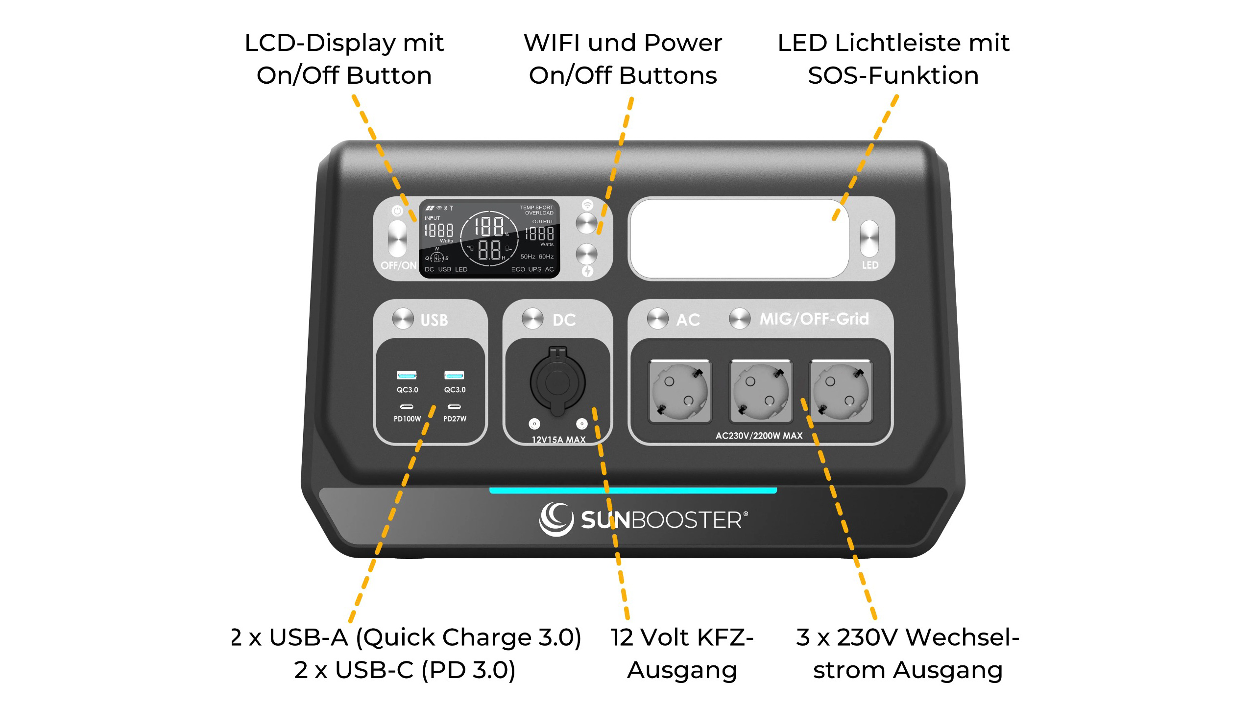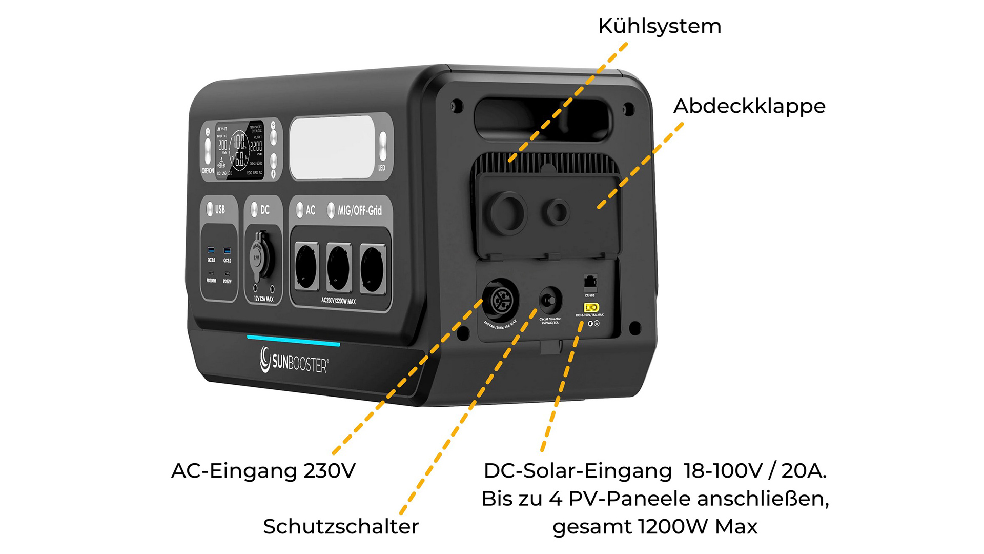 - Notstromsteckdose mit 1200 Watt im Off-Grid-Betriebt und 2200 Watt bei Netzanschluss