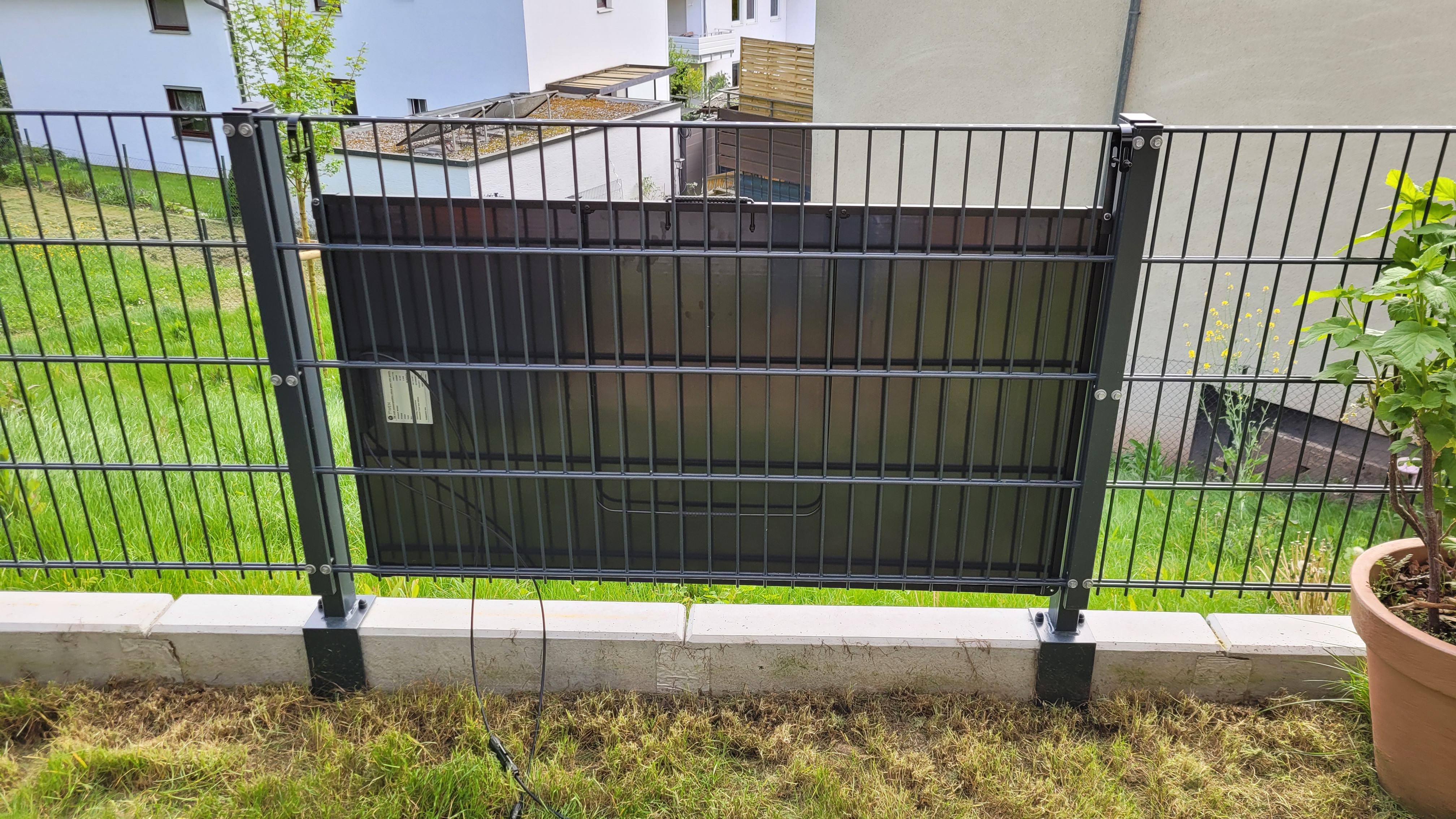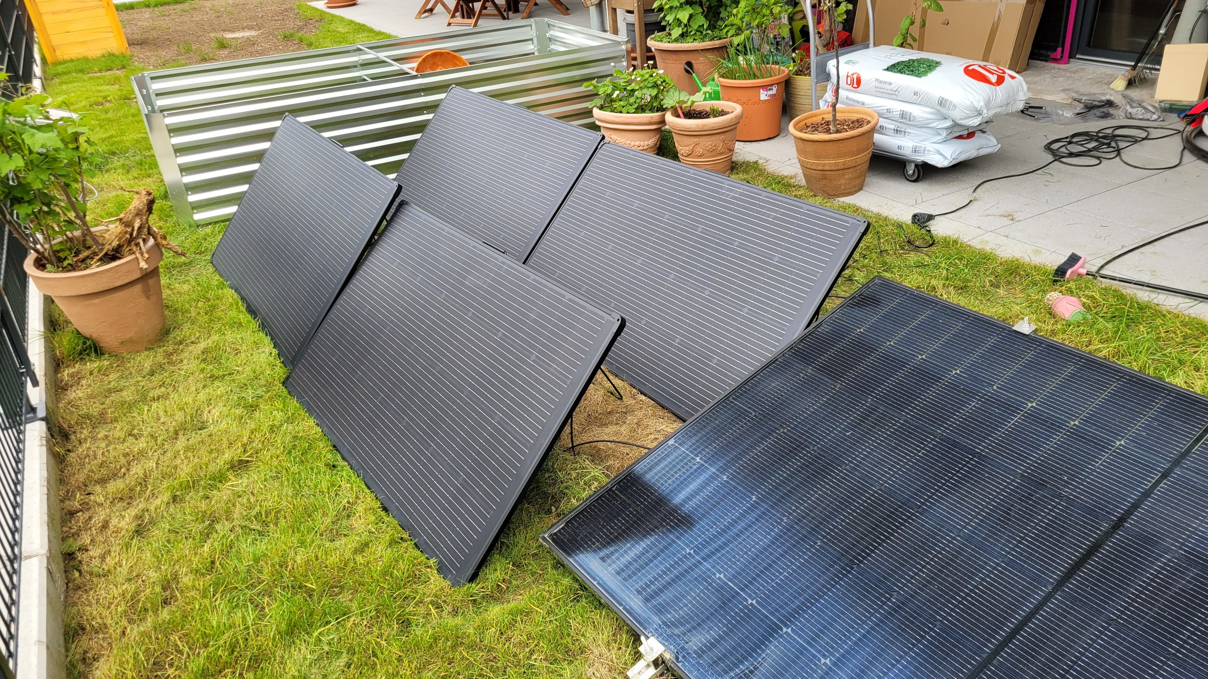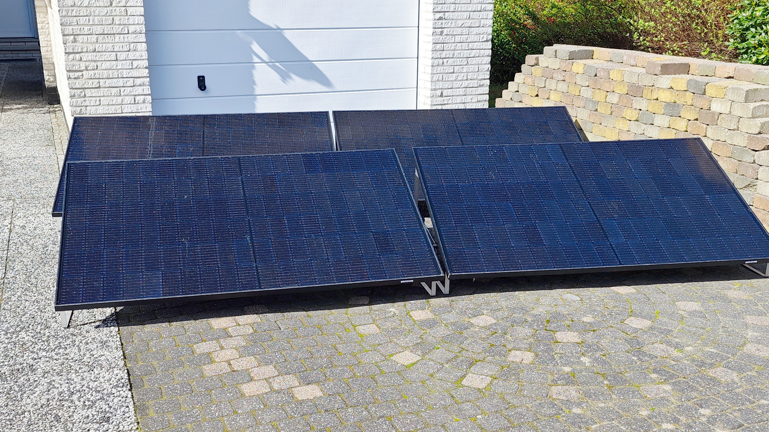 Der Aufbau des Balkonkraftwerks ist keine große Herausforderung. Wegen der ausladenden Abmessungen der Panels benötigt man allerdings spätestens zur Dach- oder Balkonmontage helfende Hände. Dann sind die beiden Panels mit silbernem Alurahmen schnell ausgepackt, mit unserer Aufständerung zusammengeschraubt und aufgestellt. Da wir das Set nur kurzfristig für den Test nutzen, begnügen wir uns mit dem Aufbau in unserer Einfahrt.