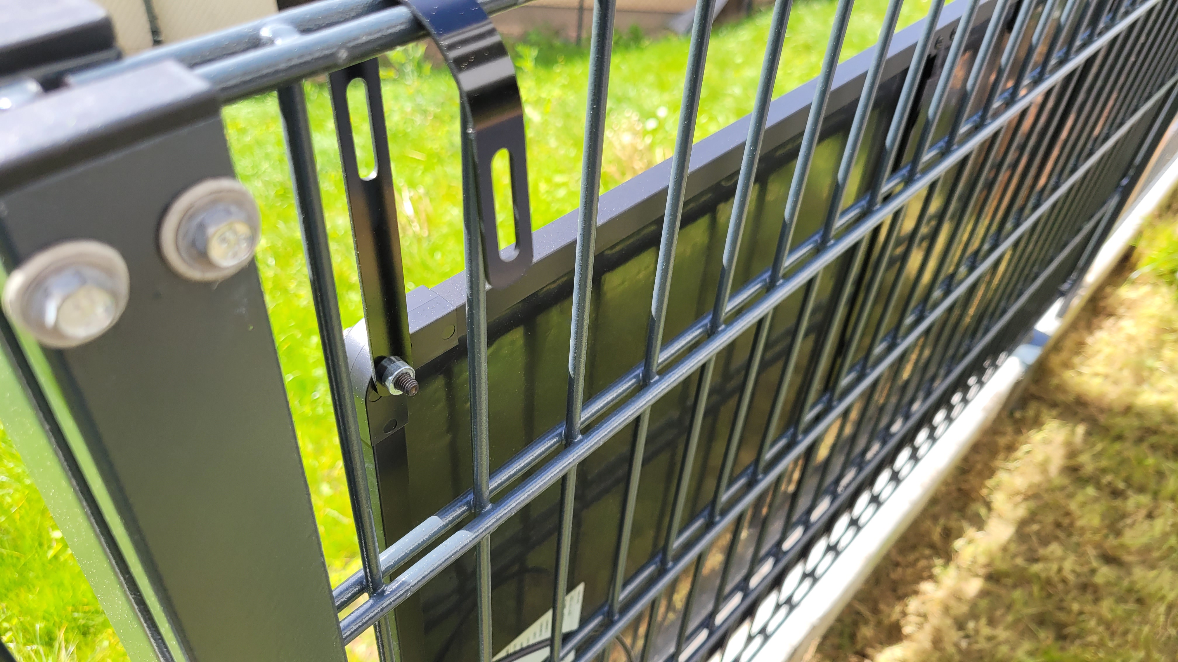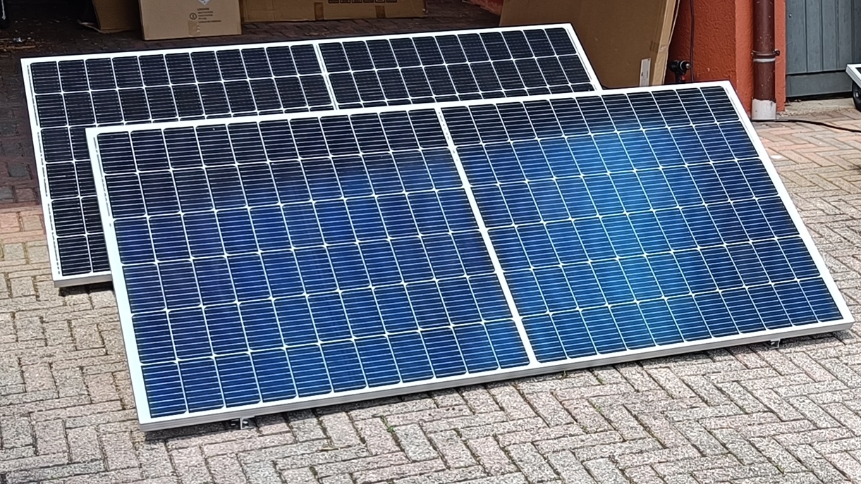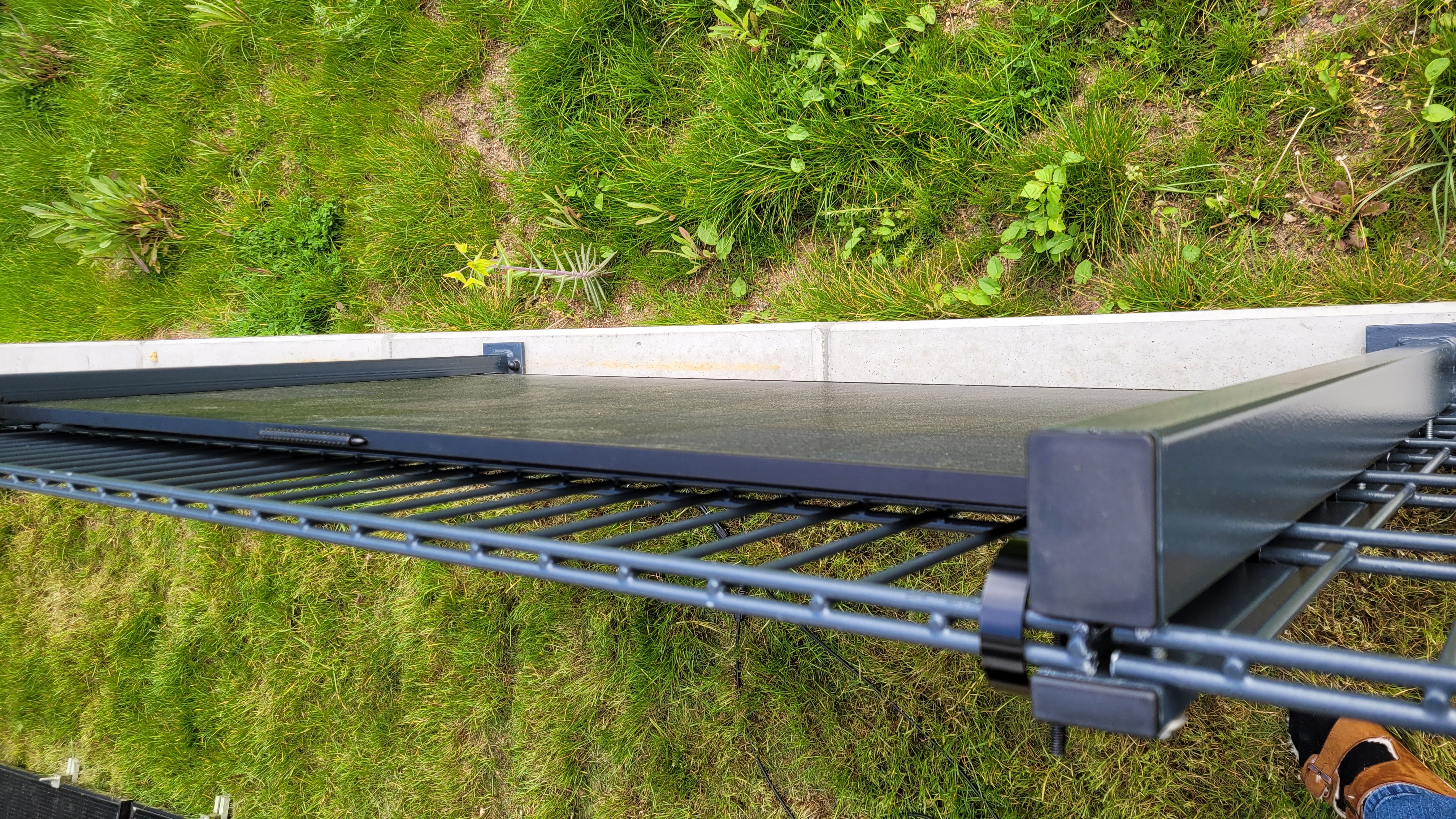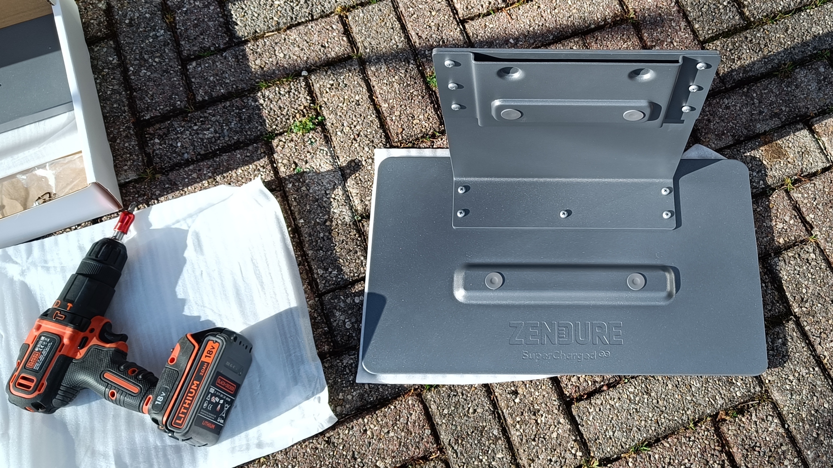 Der Aufbau des Balkonkraftwerks ist keine große Herausforderung. Wegen der ausladenden Abmessungen der Panels benötigt man allerdings spätestens zur Dach- oder Balkonmontage helfende Hände. Dann sind die beiden Panels mit silbernem Alurahmen schnell ausgepackt, mit unserer Aufständerung zusammengeschraubt und aufgestellt. Da wir das Set nur kurzfristig für den Test nutzen, begnügen wir uns mit dem Aufbau in unserer Einfahrt.