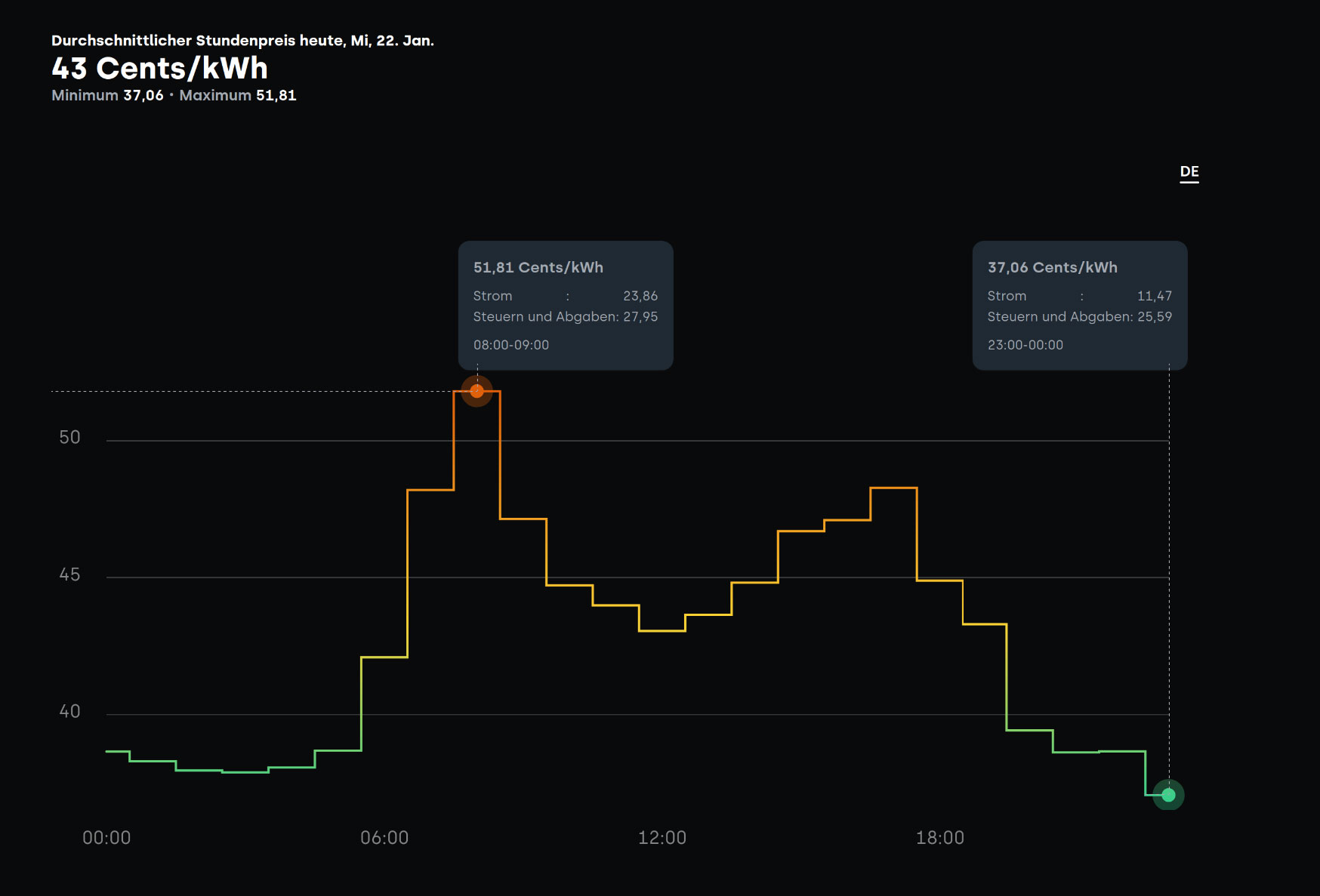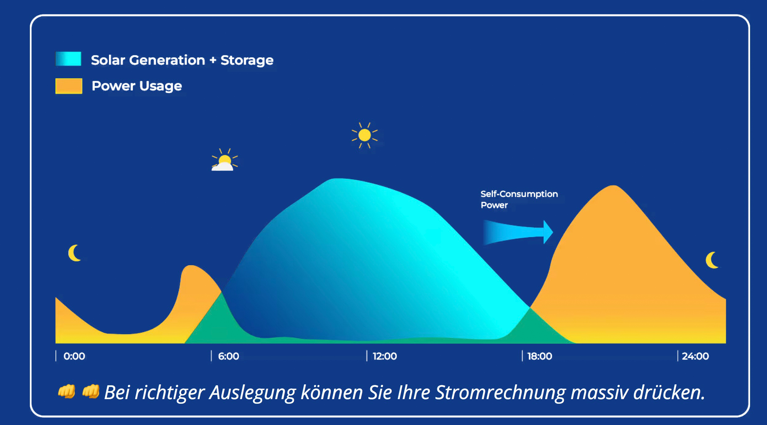 Das ist zeitlich aber oft nicht möglich, da Verbraucher wie Herd, Ofen, Waschmaschine und Trockner in der Regel erst abends und zu Feierabend eingeschaltet werden – nicht aber zur Mittagszeit, wenn der Stromertrag am höchsten ist. In der Praxis verschenkt man so tagsüber Strom, den man in den Abend- und Nachtstunden teuer bezahlen muss.