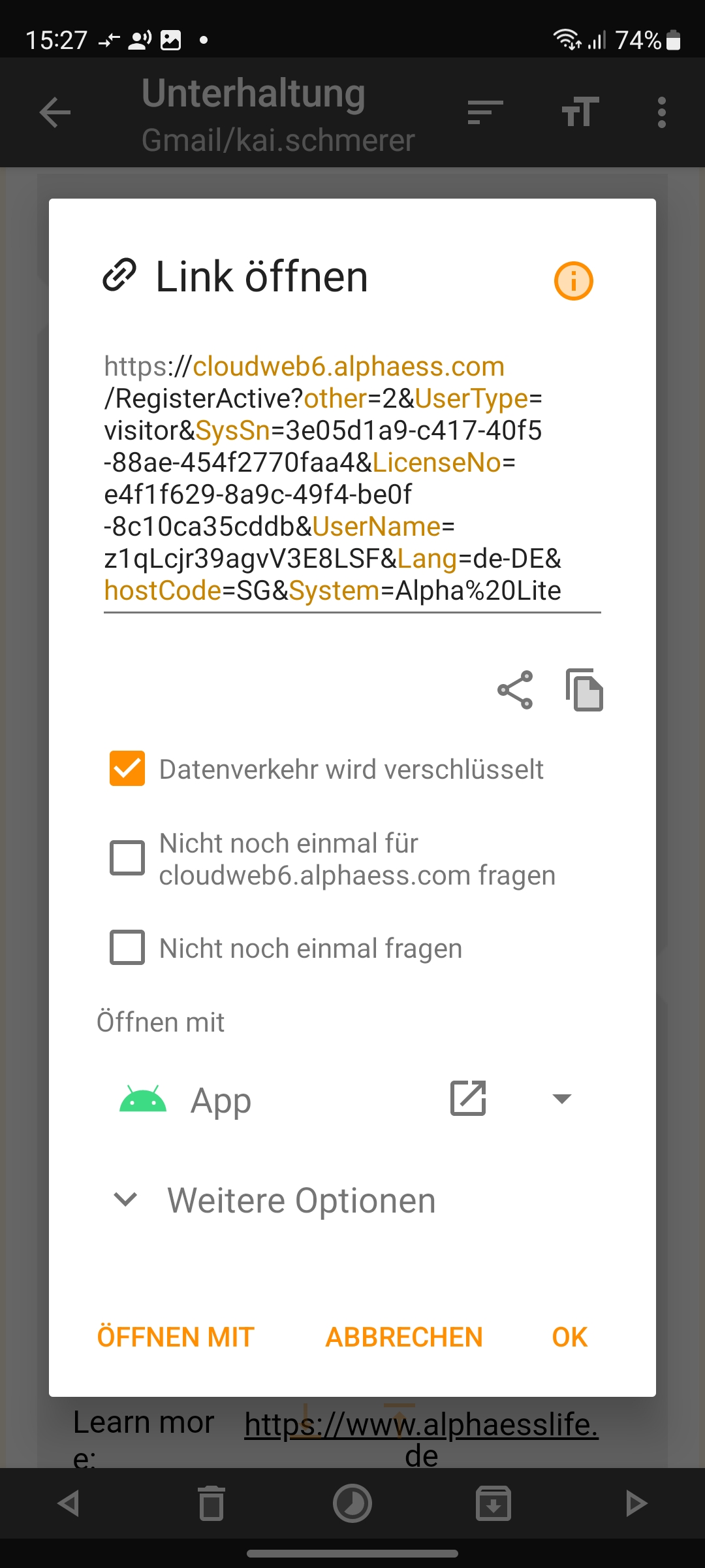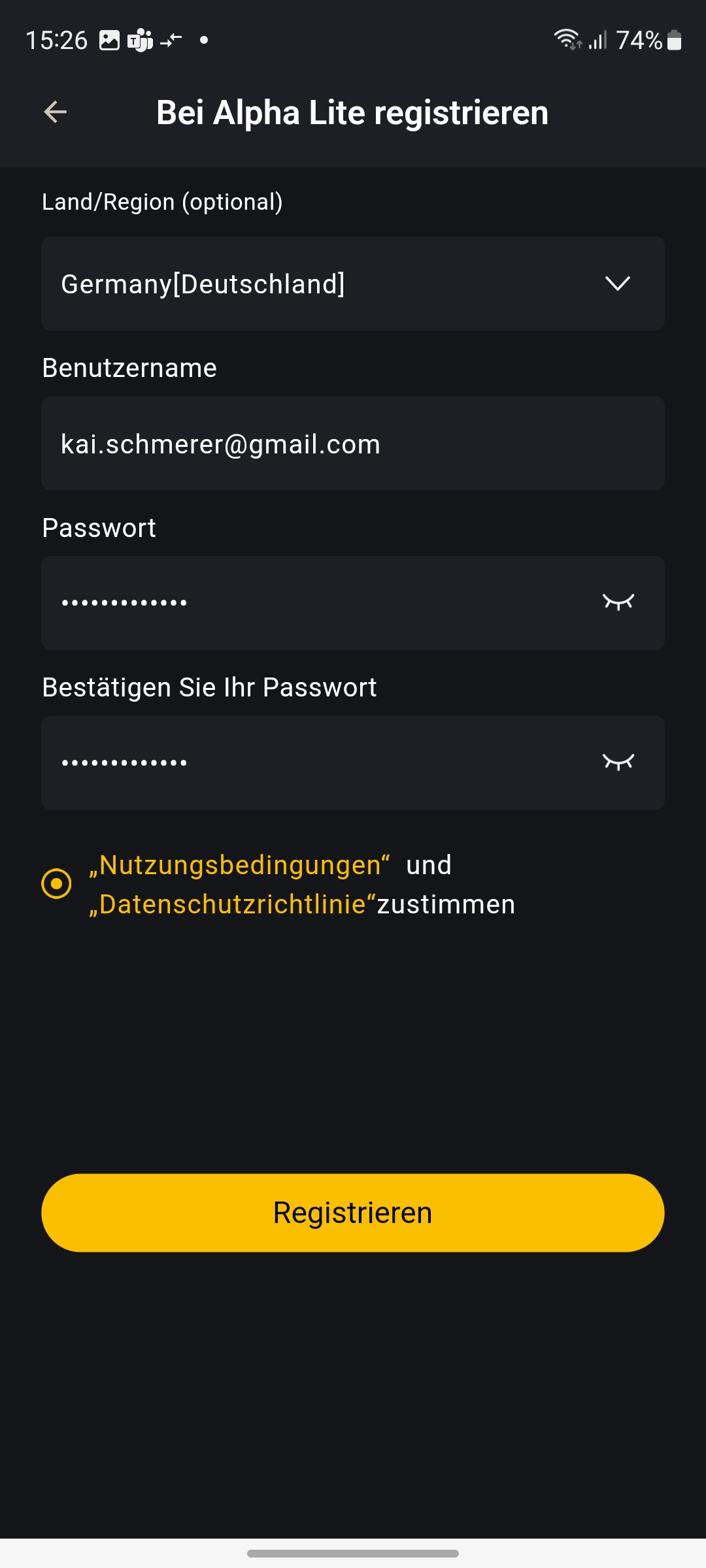 Für die Nutzung der Solakon-App muss man sich per E-Mail registrieren. Anschließend erhält man einen sechsstelligen Zahlencode. Ein Passwort ist nicht nötig, da ein neuer Logincode verschickt wird, sobald eine neue Anmeldung erforderlich ist.