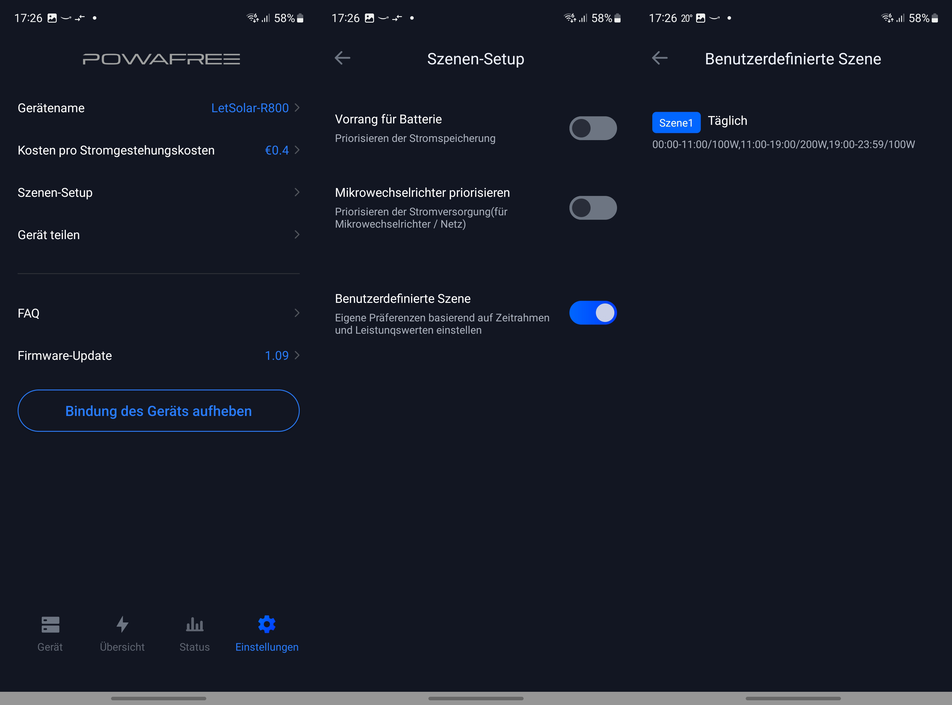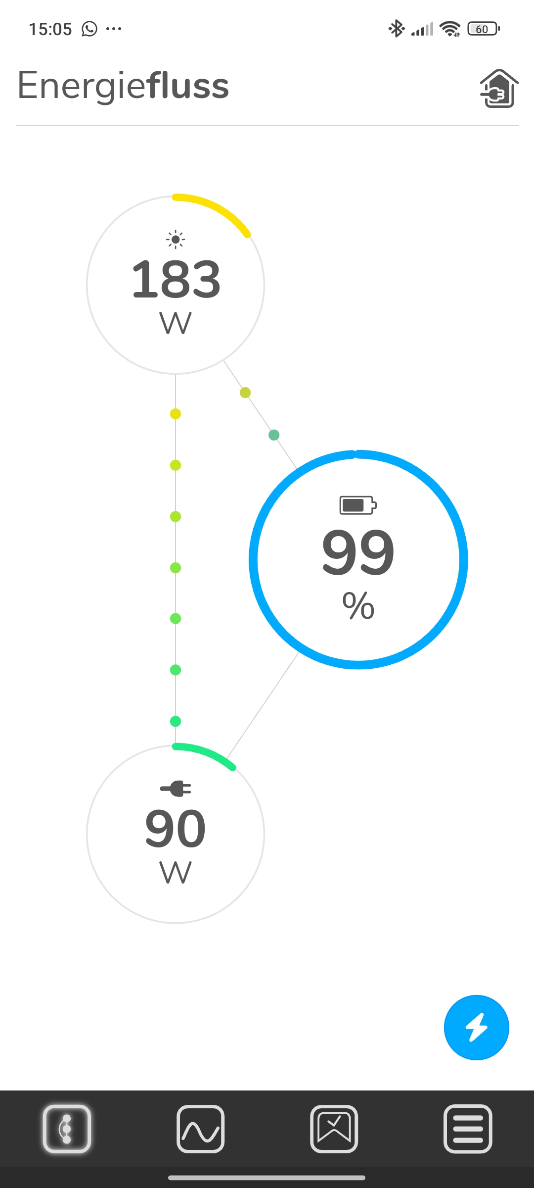 Speist die Powerstation Strom ein, reduziert sich unser Stromverbrauch um die Höhe der Einspeiseleistung. Liegt in die ausgewählte Einspeiseleistung höher als der Gesamtverbrauch, gelangt der nicht benötigte Strom aber ohne Vergütung im allgemeinen Stromnetz. Alternativ lassen sich die Einspeisewerte auch über Szenen einstellen und dann per Fingerzeig auswählen.