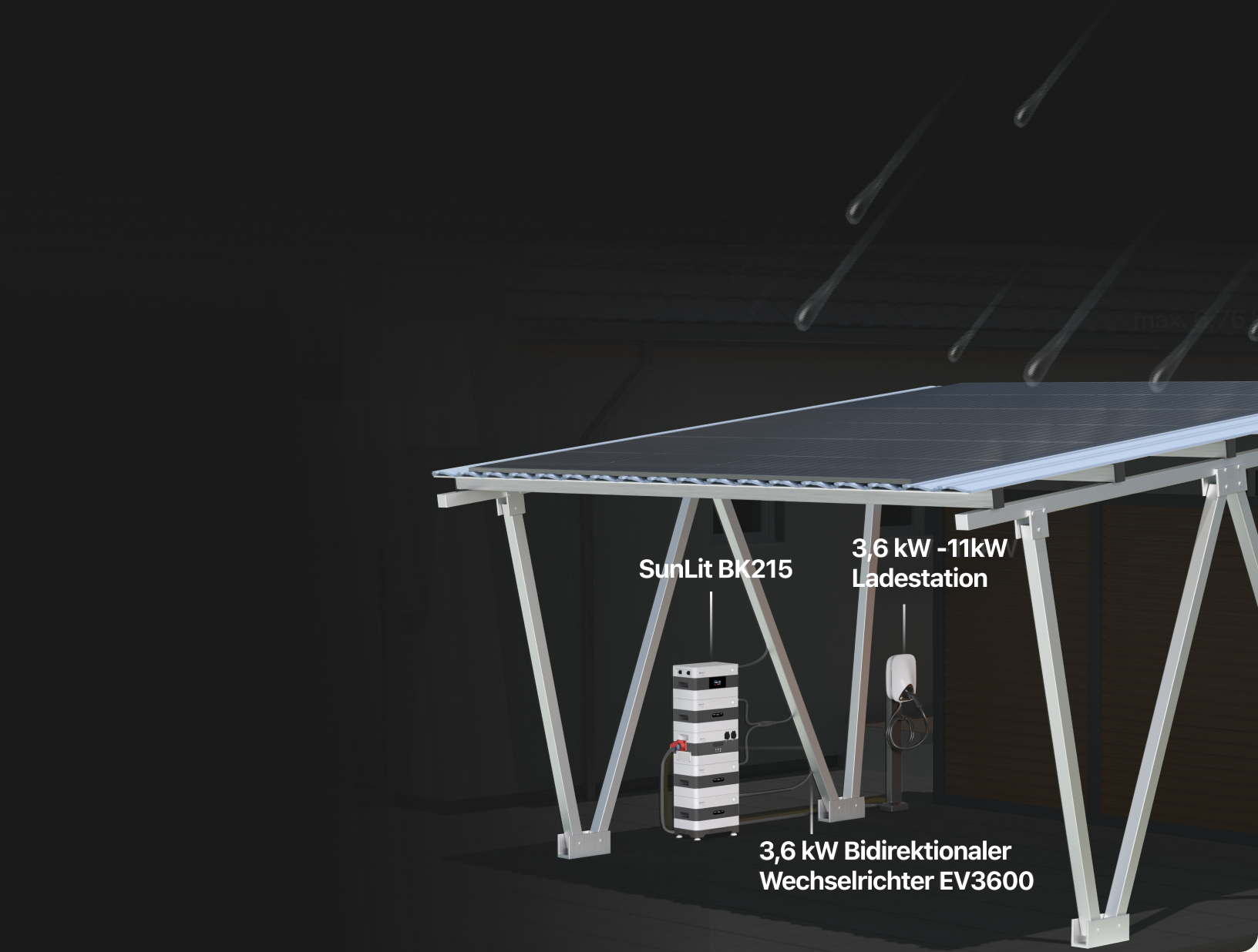 Inzwischen gibt es auch Lösungen, die die Grenze von Standard-BKWs und großen PV-Anlagen verwischen. Sunlit bietet mit seiner Speicherlösung BK215 und der Erweiterungseinheit B215 ein System an, das eine Kapazität von bis zu 8,6 kWh bietet und in Verbindung mit dem optional erhältlichen bidirektionalen Wechselrichter EV3600 sogar das Laden eines E-Autos unterstützt. Das funktioniert sogar autark im Inselbetrieb, allerdings nur bis zu einer Leistung von 3,7 kW. Das mag für reinrassige E-Autos mit Batteriegrößen von bis zu über 100 kWh zu wenig sein, aber für Hybrid-Fahrzeuge reicht das zumindest für eine Teilladung. Verteilt auf zwei Tage gelingt der Lösung, die meisten Hybrid-Fahrzeuge voll aufzuladen. Wer das System zudem mit einem Starkstromanschluss verbindet, erreicht eine Ladeleistung von bis zu 11 kW.