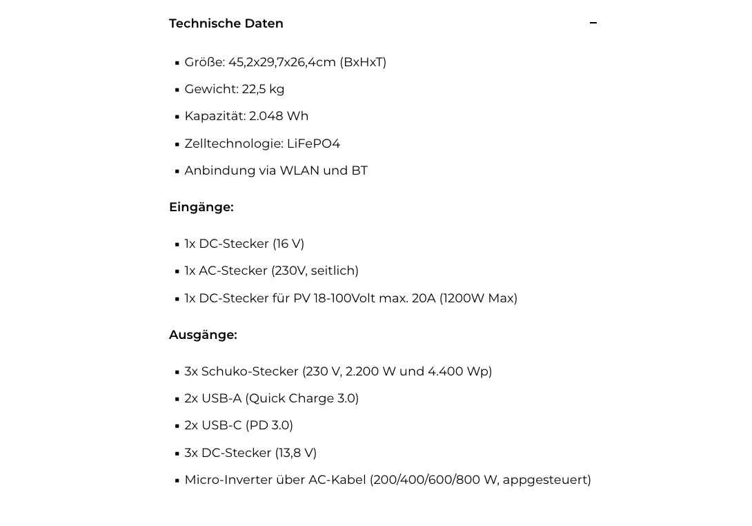 - Grundeinheit mit bidirektionaler Lademöglichkeit mit bis zu 1200 Watt und 2,11 kWh Kapazität auf Basis von LiFePO4-Batteriezellen