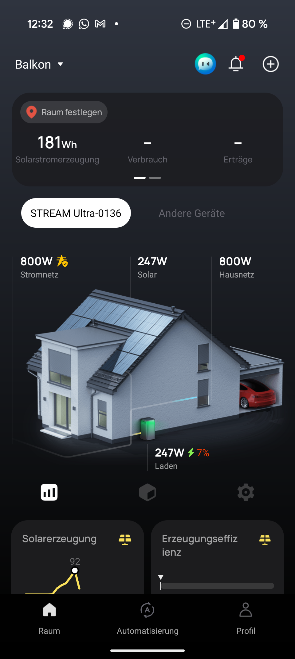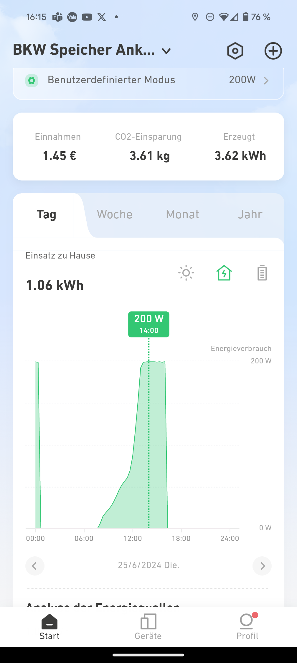Die Anlage erzielte am 6. September den Tagesrekord mit einer Solarproduktion von 7,6 kWh. In der Spitze ernteten die vier Solarpanels (2x 500 Watt, 2x 420 Watt) 1577 Watt, was nahe dem theoretischen Maximum von 1840 Watt entspricht. Am 18. September schien zwar auch den ganzen Tag die Sonne, doch ist die Tageslänge über 30 Minuten kürzer als am Rekordtag. Außerdem werden die PV-Module aufgrund des niedrigeren Sonnenstands früher von den umliegenden Gebäuden verschattet. Während die vier PV-Module um 18 Uhr am Rekordtag noch 395 Watt lieferten, waren es am 18. September zur gleichen Zeit nur noch 77 Watt. Und so betrug der Gesamtertrag „nur“ 5,8 kWh. Begonnen hat die Tagesproduktion bereits um 6.42 Uhr. Das deckt sich mit Werten anderer Speicher wie Anker Solarbank 3 und Zendure Solarflow 800 Pro, die mit denselben Modulen ähnlich früh den Betrieb aufnehmen.