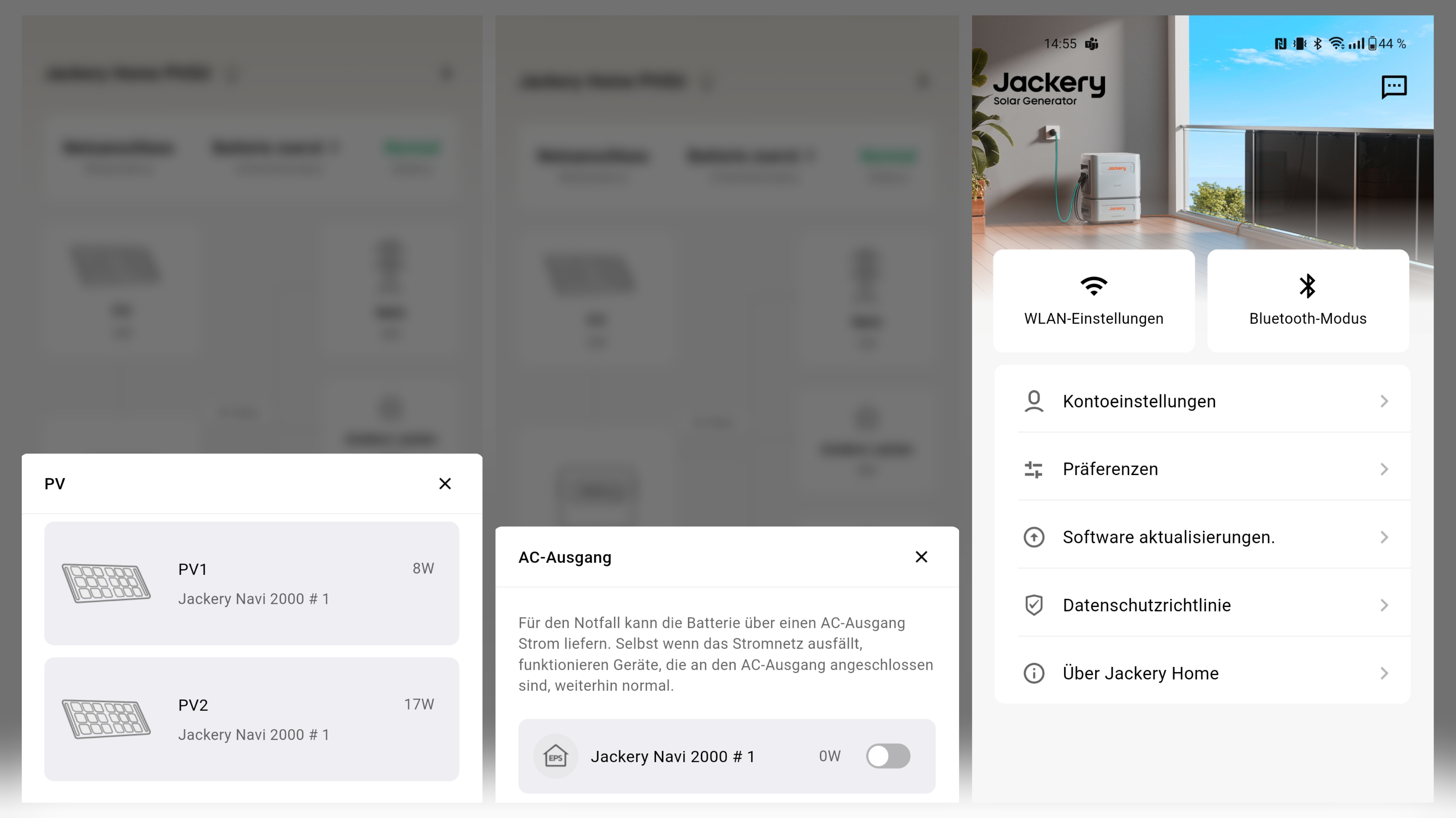 Jetzt werden noch die Solarpanels an die MC4-Dosen des Navi 2000 angeschlossen und der AC-Stecker mit dem Stromnetz verbunden. Nun ist das System bereit und es fehlen nur noch die Einstellungen, wie Leistung und Zeit der Einspeisung. Hier kommt statt der bisher gewohnten App Jackery die neue Variante Jackery Home zum Einsatz. Wer das Gerät mobil nutzen will, entfernt Panels und AC-Kabel.