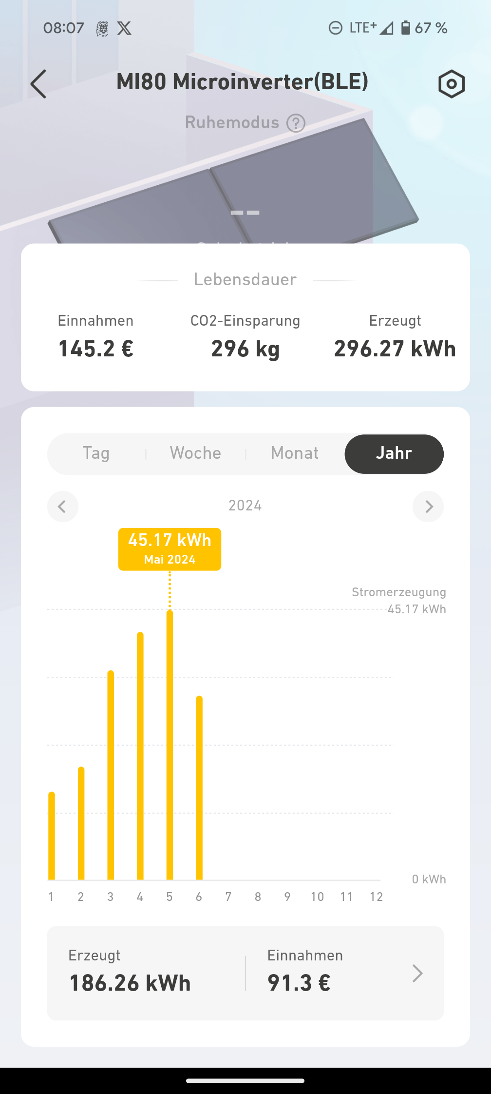 Trotz mäßiger Wetterbedingungen im Testzeitraum, beträgt unser Tagesertrag an den sonnigen Tagen zwischen 2 kWh und 3 kWh – das ist hinsichtlich der nicht ganz idealen Platzierung mit Teilbeschattung ein ordentliches Ergebnis. Die maximale Einspeisung erreichte zwar nur selten die zulässigen 800 Watt, bei gutem Wetter sind aber 600 bis 700 Watt realistisch. Bei einem angenommen hohen Strompreis von 40 Cent je kWh entspricht das etwa 80 bis 120 Cent Ersparnis am Tag in den Monaten März bis Oktober.