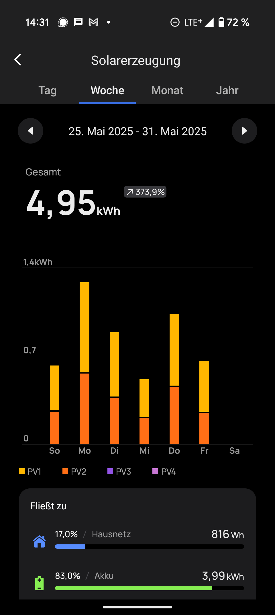 Solakon One: Die Ertragsstatistiken in der Solakon-App unterscheiden zwischen Gesamtertrag und den einzelnen MPPTs. TechStage.de