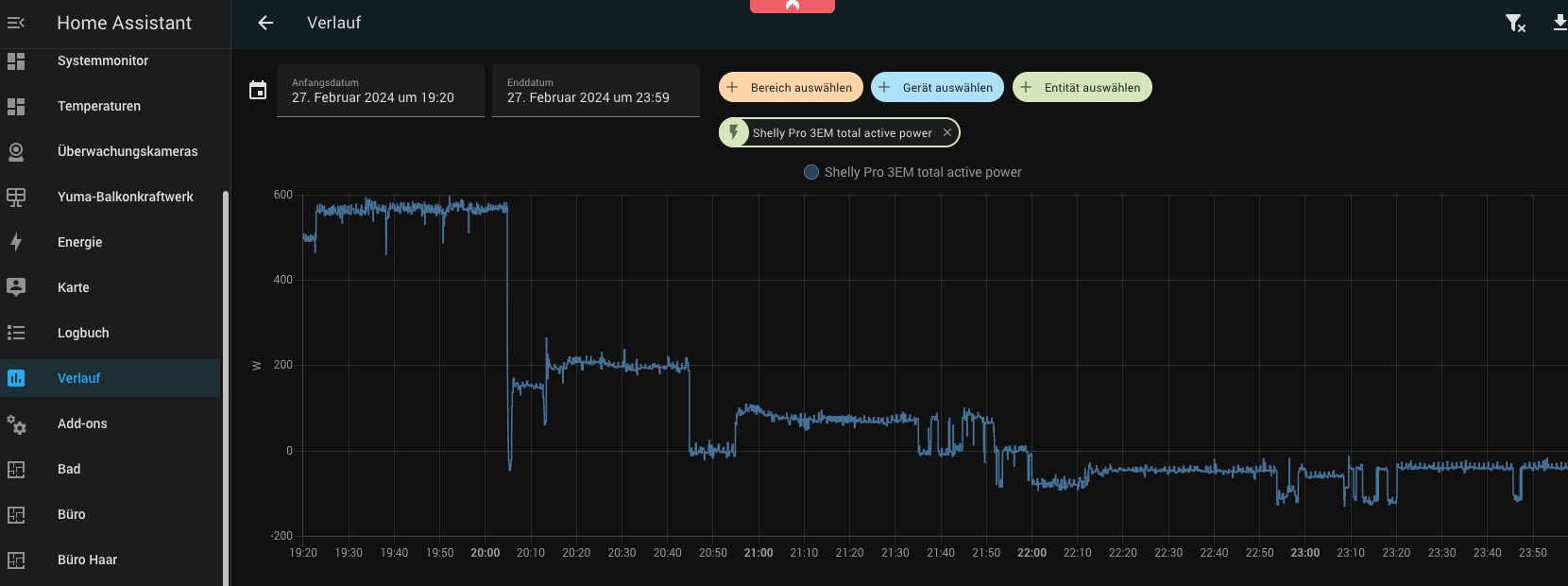 Während der gut dreiwöchigen Testphase hat der Solakon One einwandfrei und zuverlässig funktioniert. Nach dem Problem mit dem zweiten Shelly Pro 3EM gab es auch an der dynamischen Einspeisung nichts auszusetzen. Bis der Stromspeicher mit integriertem Wechselrichter die Einspeiseleistung anpasst, vergehen ein paar Sekunden, was auch bei den Mitbewerbern der Fall ist, aber in der Praxis kaum relevant ist. Den genauen Verlauf der Einspeiseleistung kann man anhand der Daten des Shelly Pro 3EM sehr genau nachvollziehen. Da die Solakon-App derzeit diese nur rudimentär darstellt, nutzt man dafür entweder die Shelly-App oder Home Assistant (siehe obiges Diagramm).