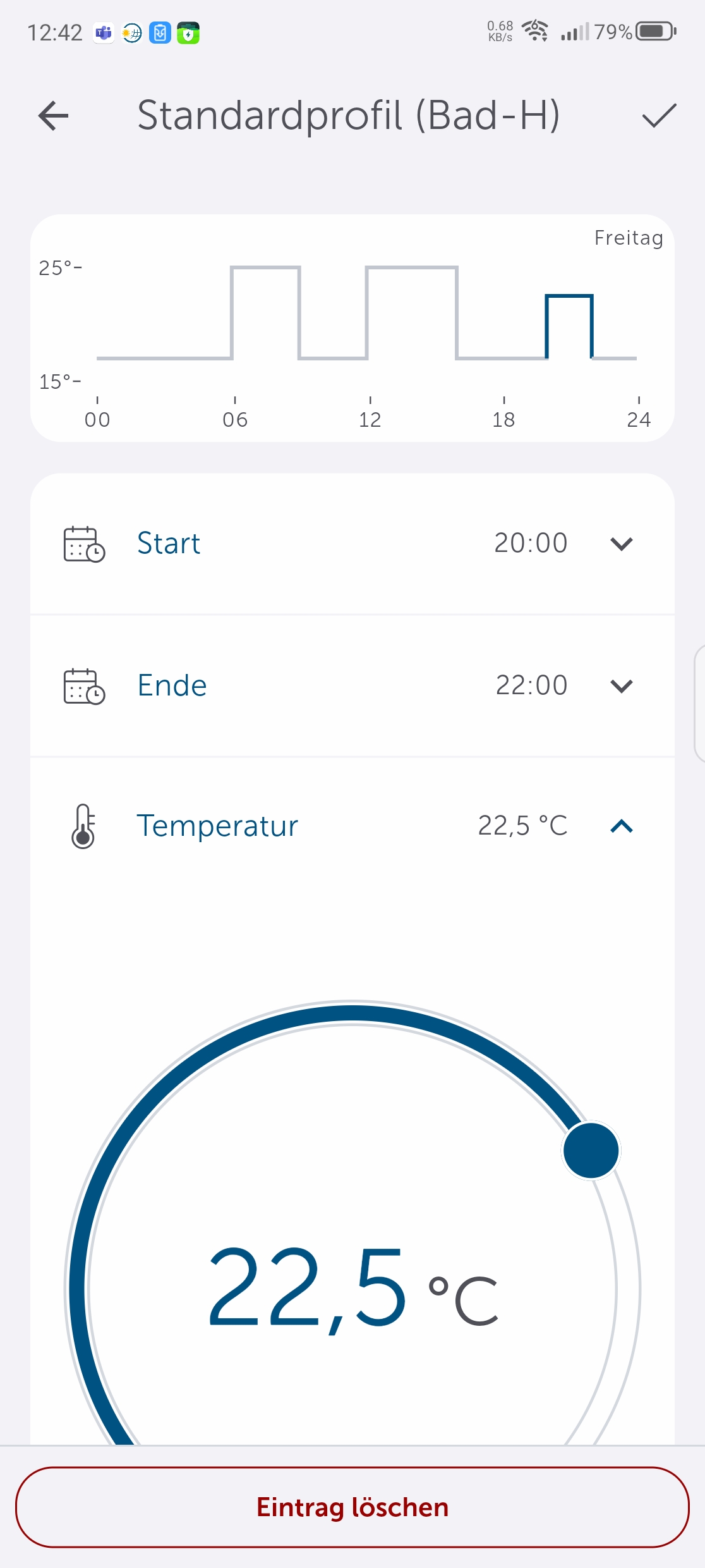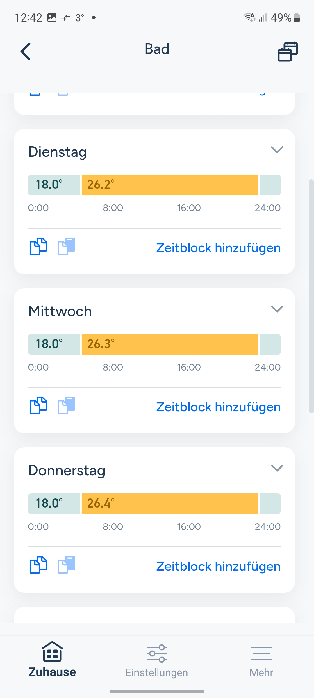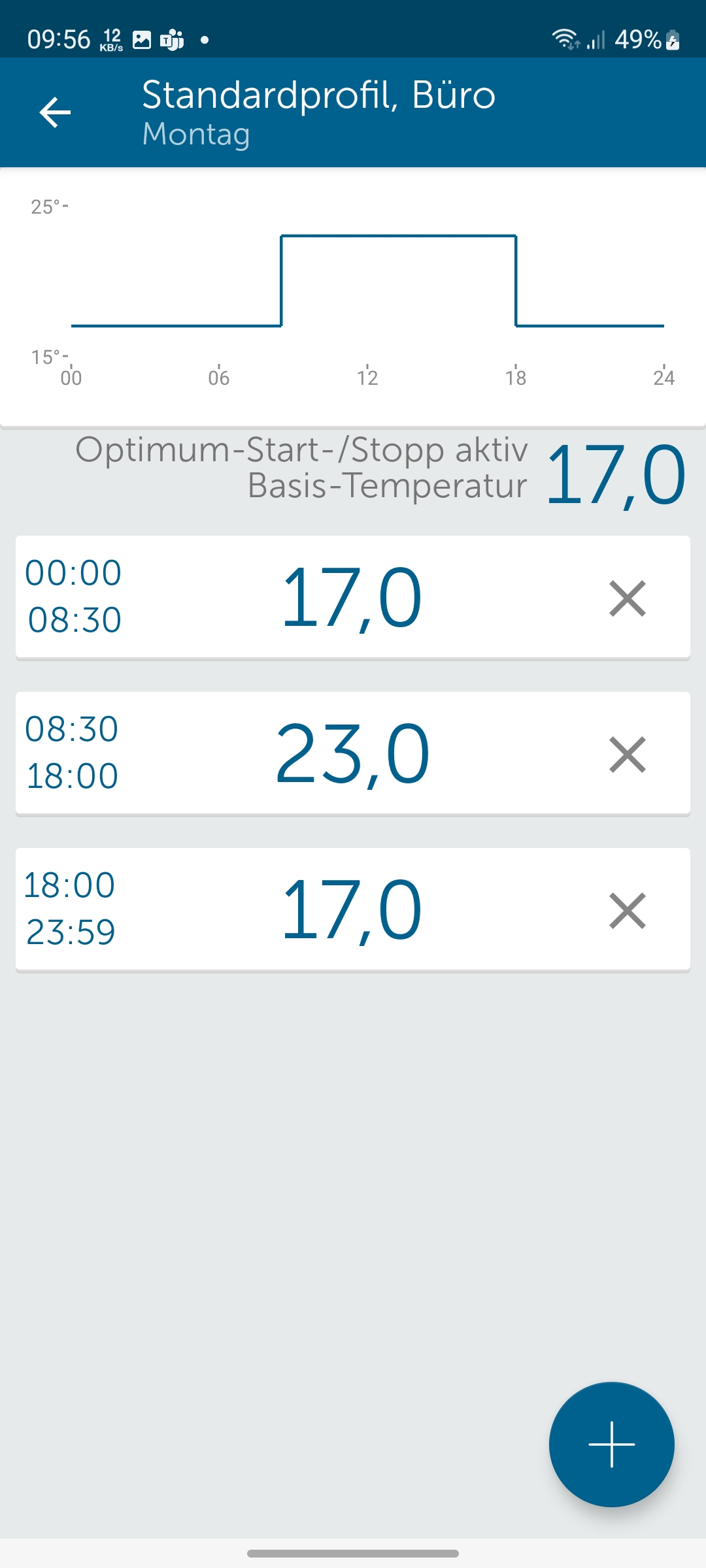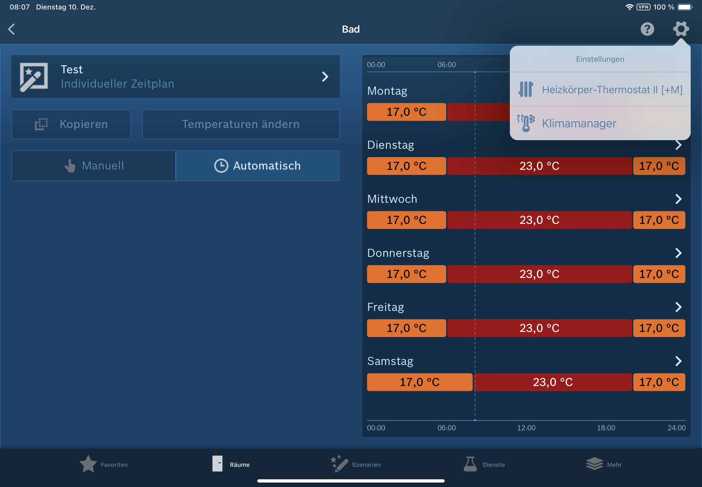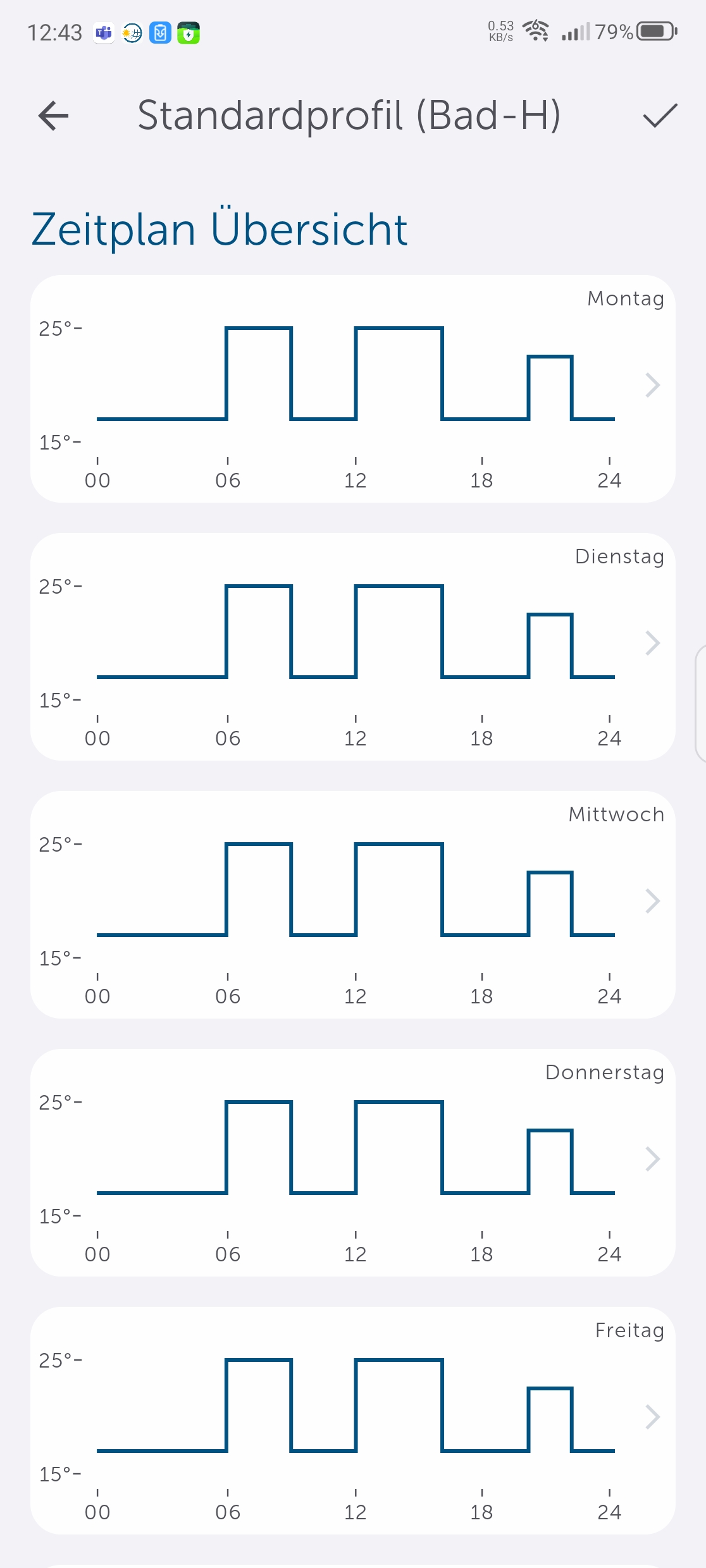 Die Anpassung der Heizprofile ist etwas umständlich über das Hauptmenü und der Auswahl Mehr im Abschnitt Raumklima möglich. Dort lässt sich die Temperatur nach Wochentag und Uhrzeit definieren. Pro Tag sind bis zu 13 Temperaturänderungen möglich. Zudem können Anwender noch zwei weitere Alternativprofile anlegen.