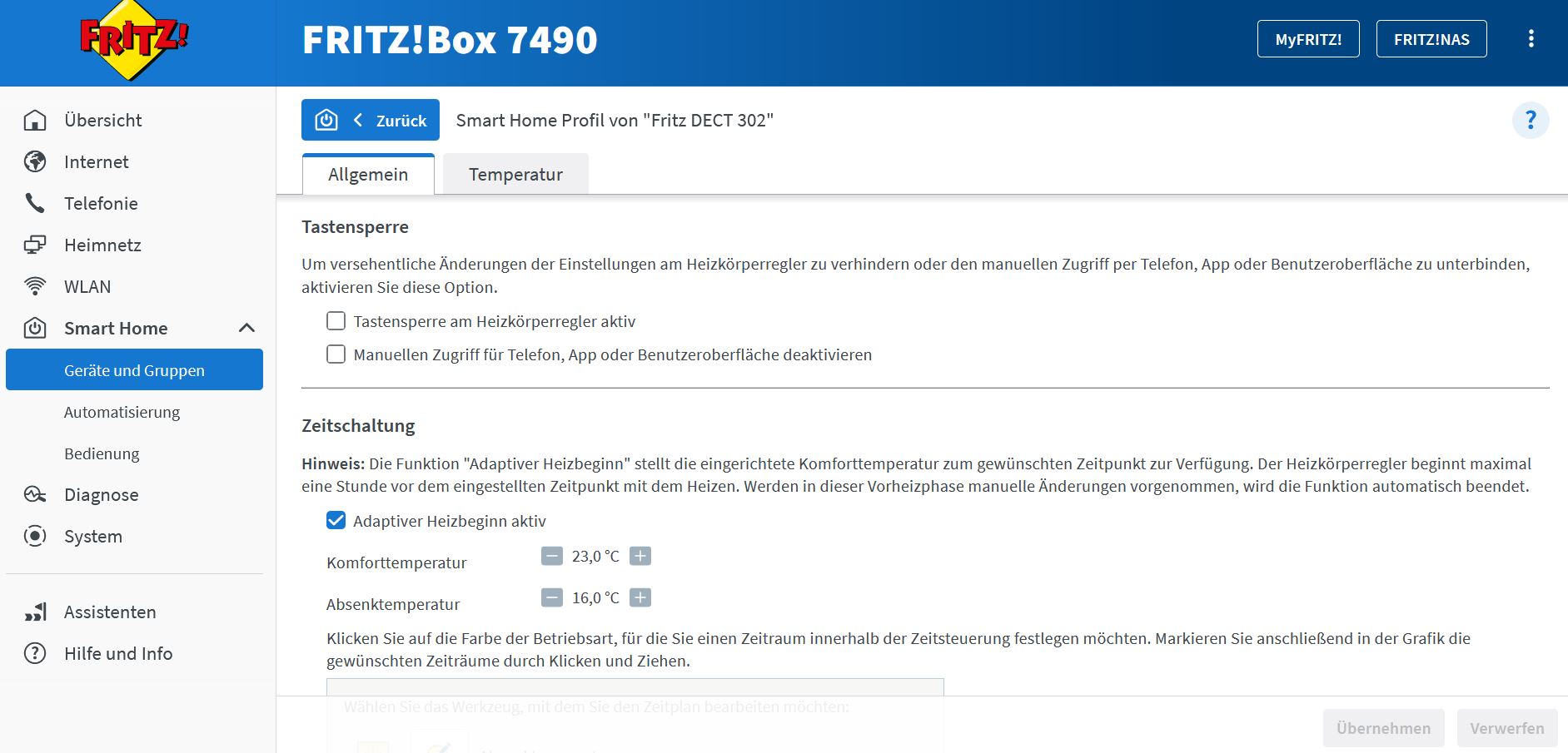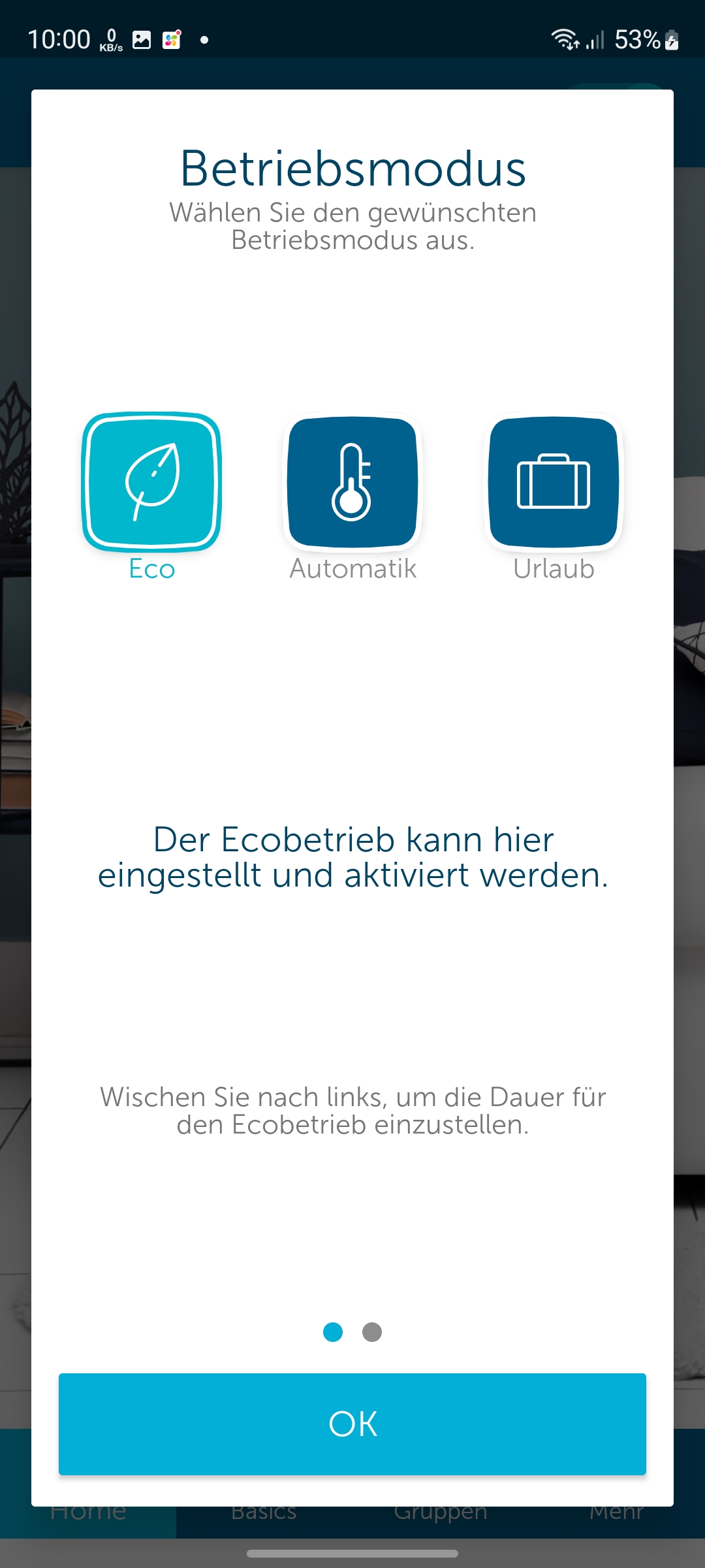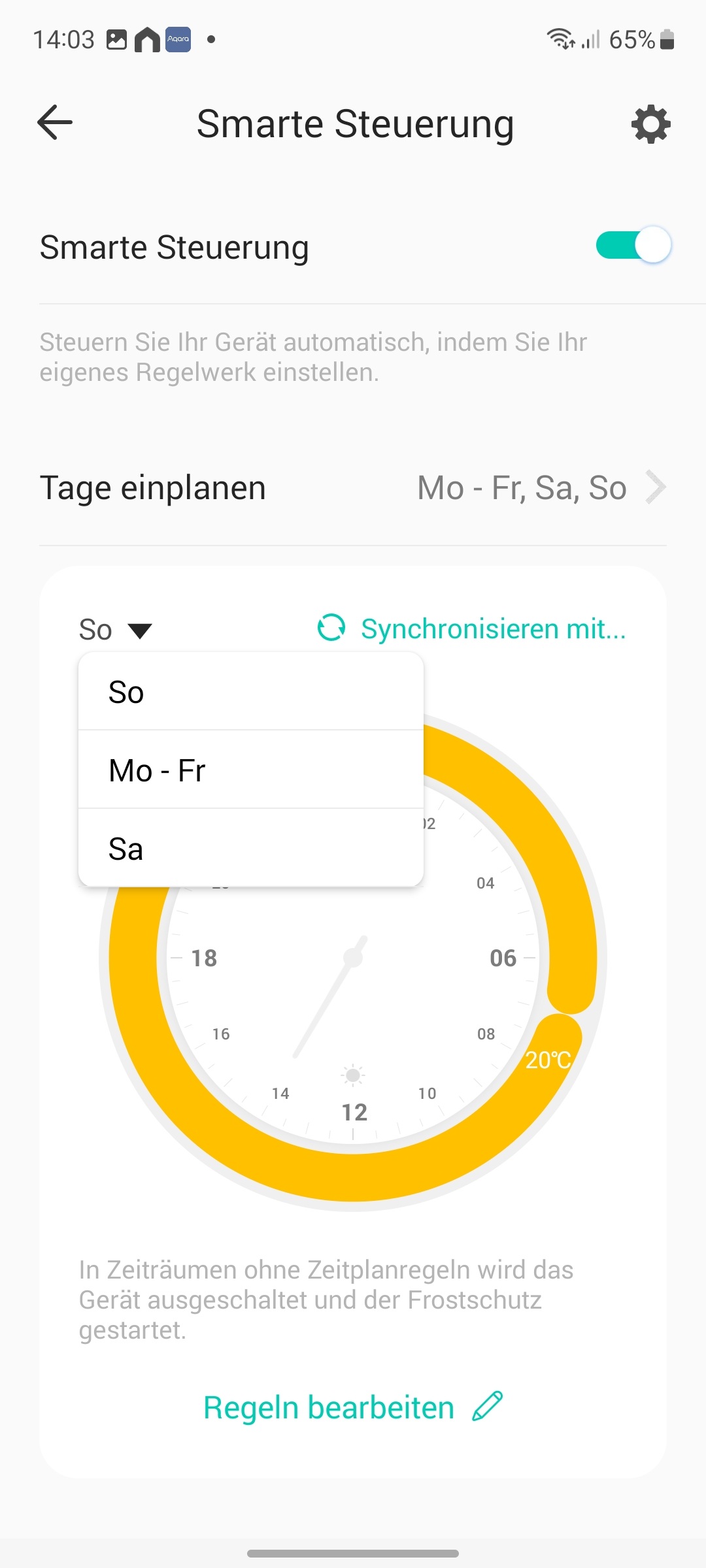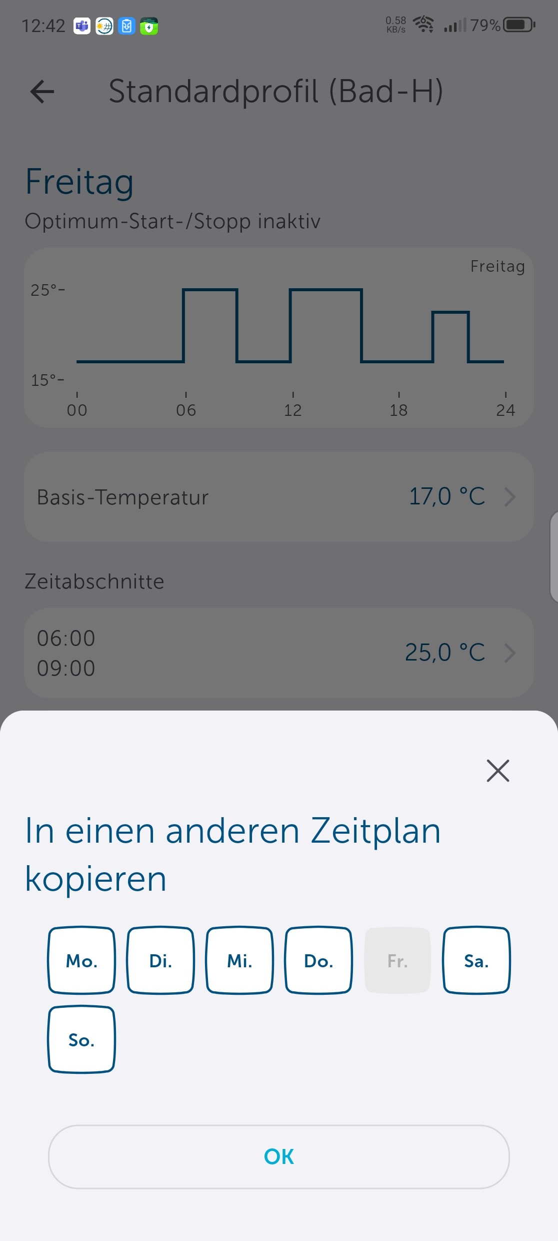 Die Anpassung der Heizprofile ist etwas umständlich über das Hauptmenü und der Auswahl Mehr im Abschnitt Raumklima möglich. Dort lässt sich die Temperatur nach Wochentag und Uhrzeit definieren. Pro Tag sind bis zu 13 Temperaturänderungen möglich. Zudem können Anwender noch zwei weitere Alternativprofile anlegen.