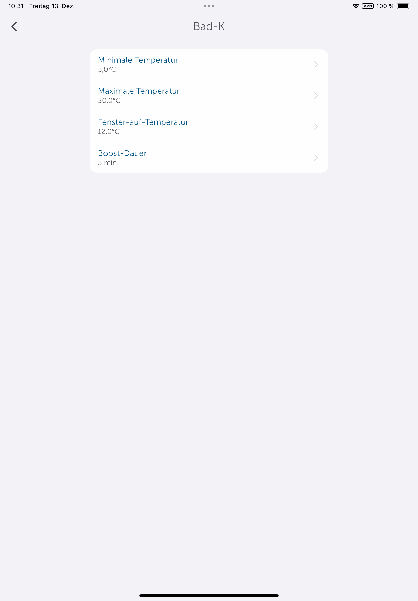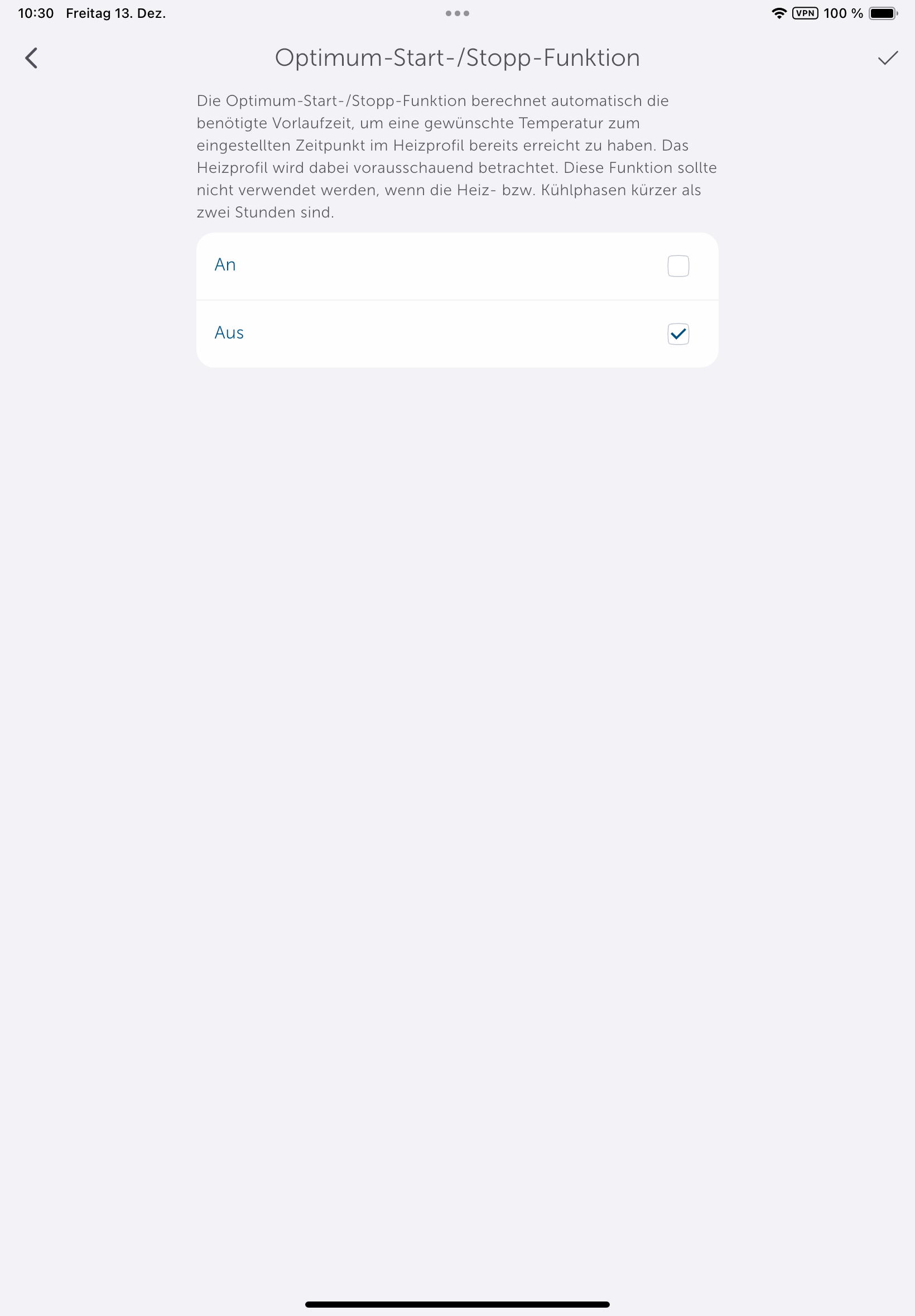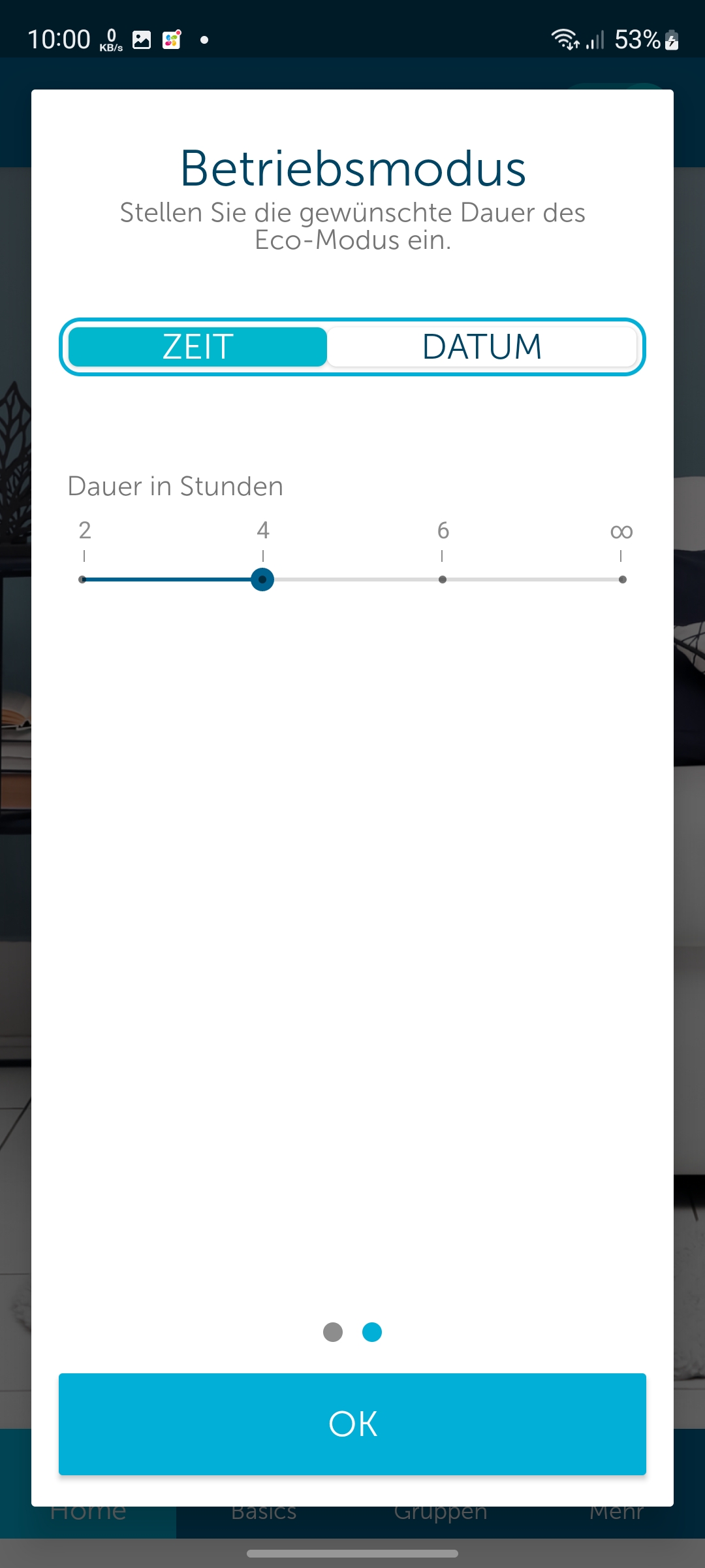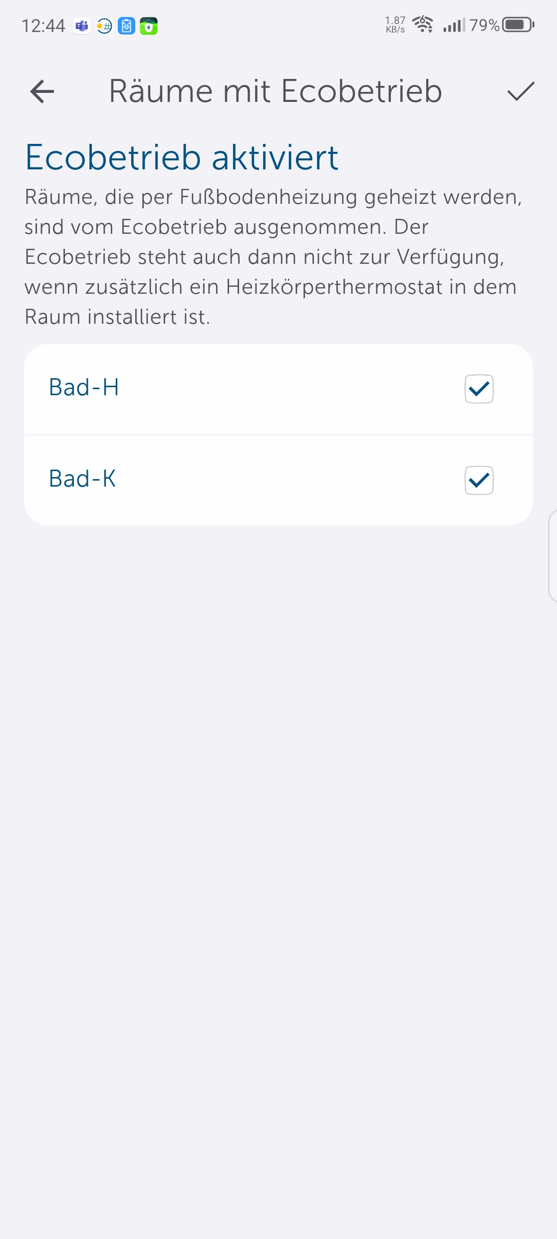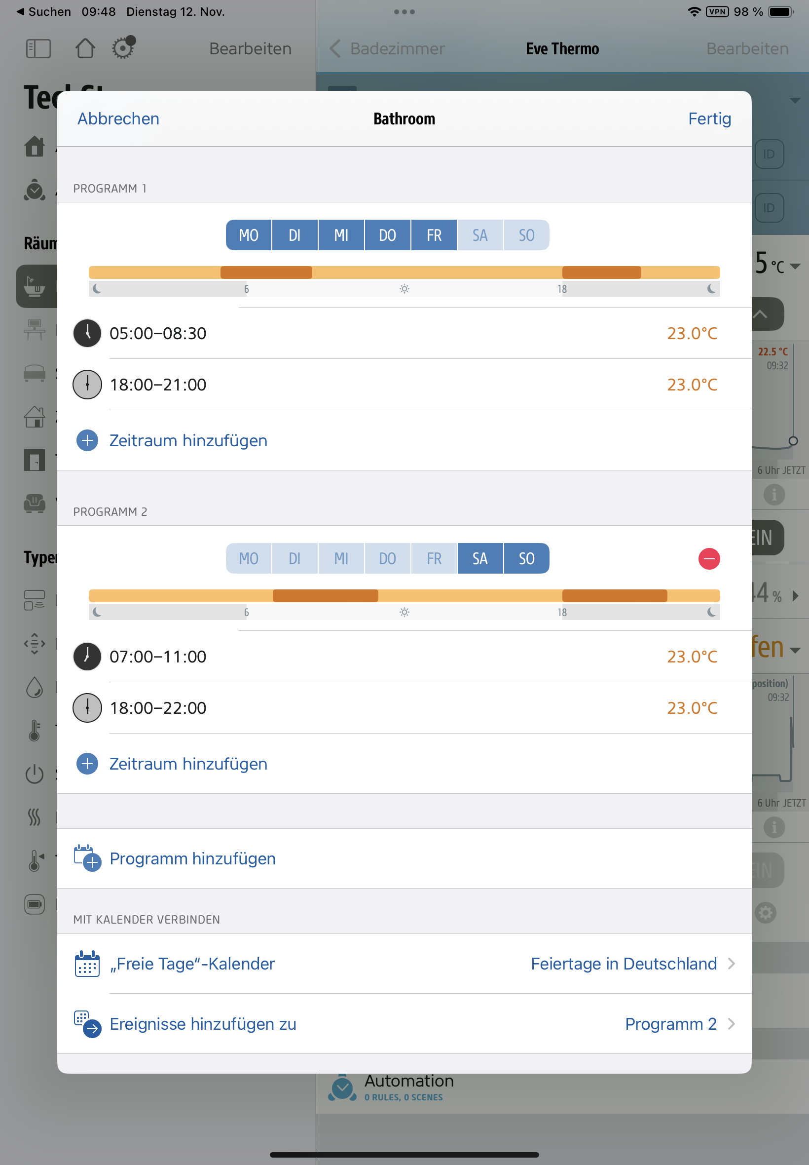 Die Anpassung der Heizprofile ist etwas umständlich über das Hauptmenü und der Auswahl Mehr im Abschnitt Raumklima möglich. Dort lässt sich die Temperatur nach Wochentag und Uhrzeit definieren. Pro Tag sind bis zu 13 Temperaturänderungen möglich. Zudem können Anwender noch zwei weitere Alternativprofile anlegen.