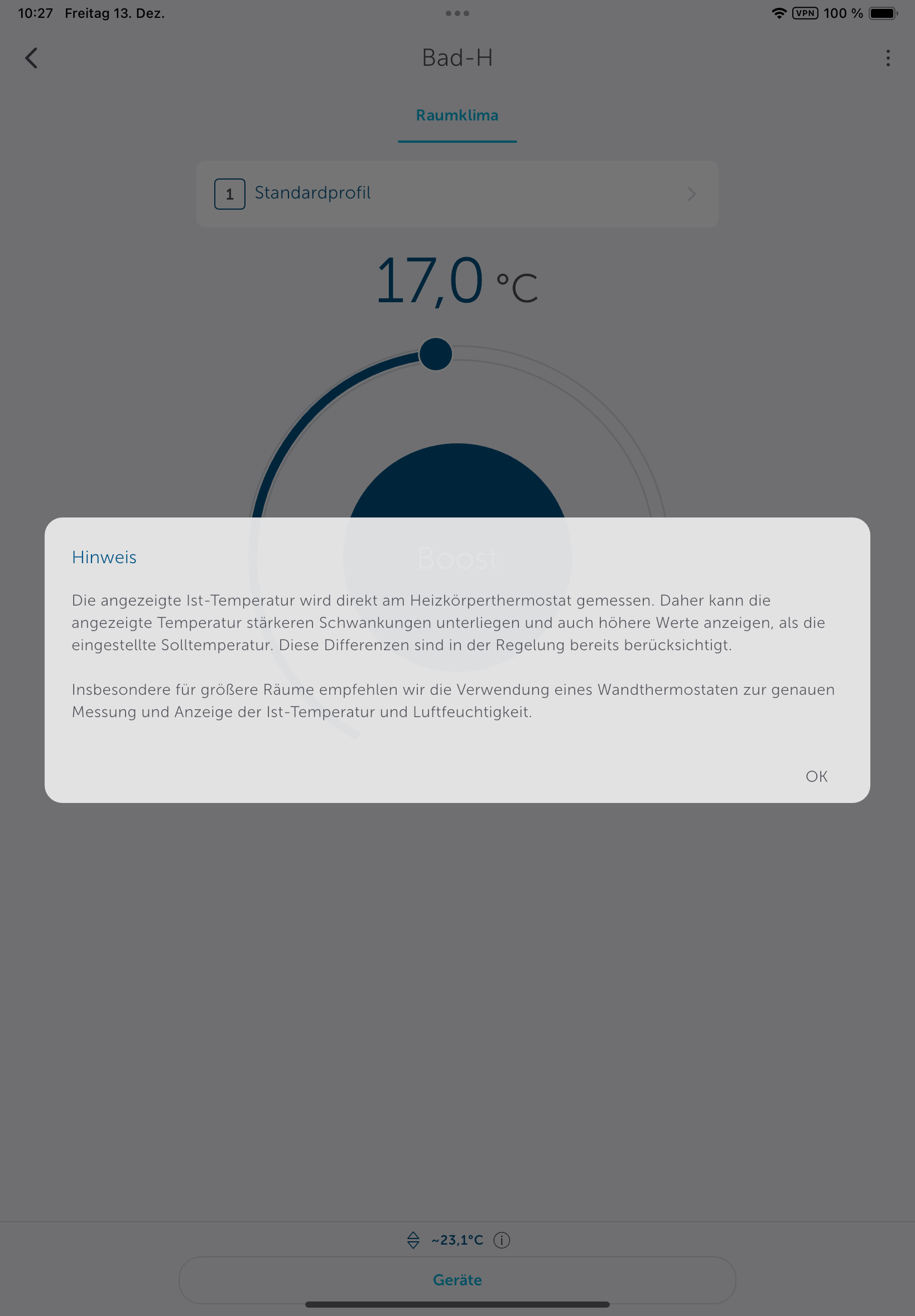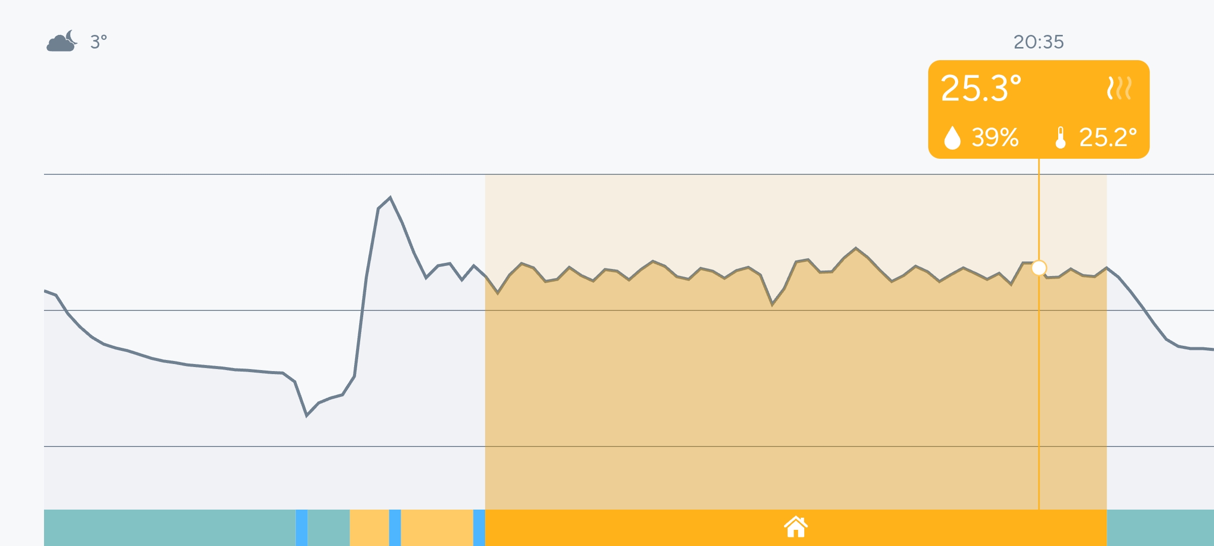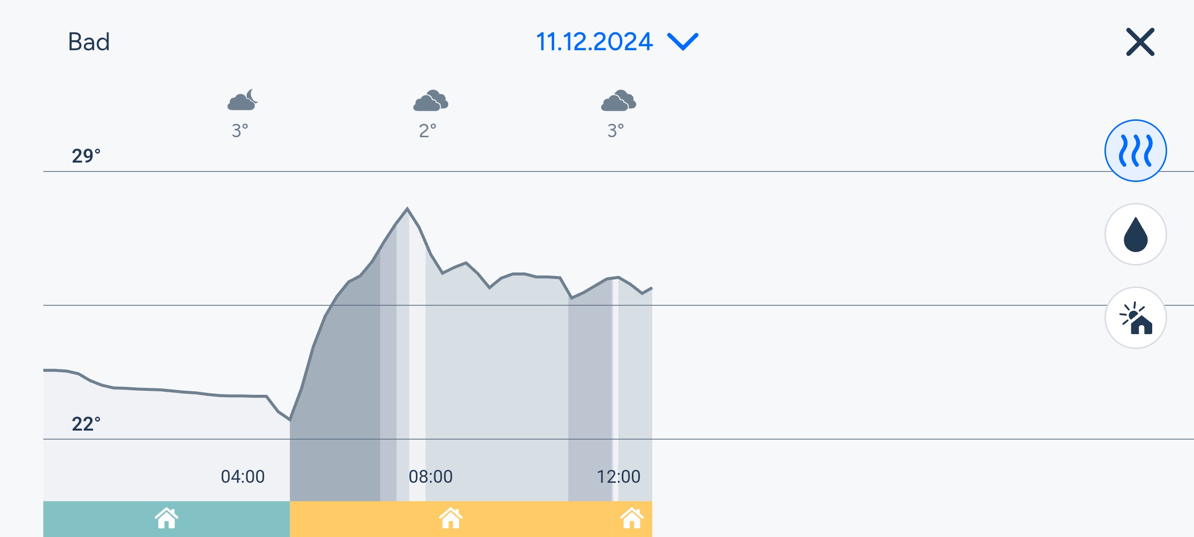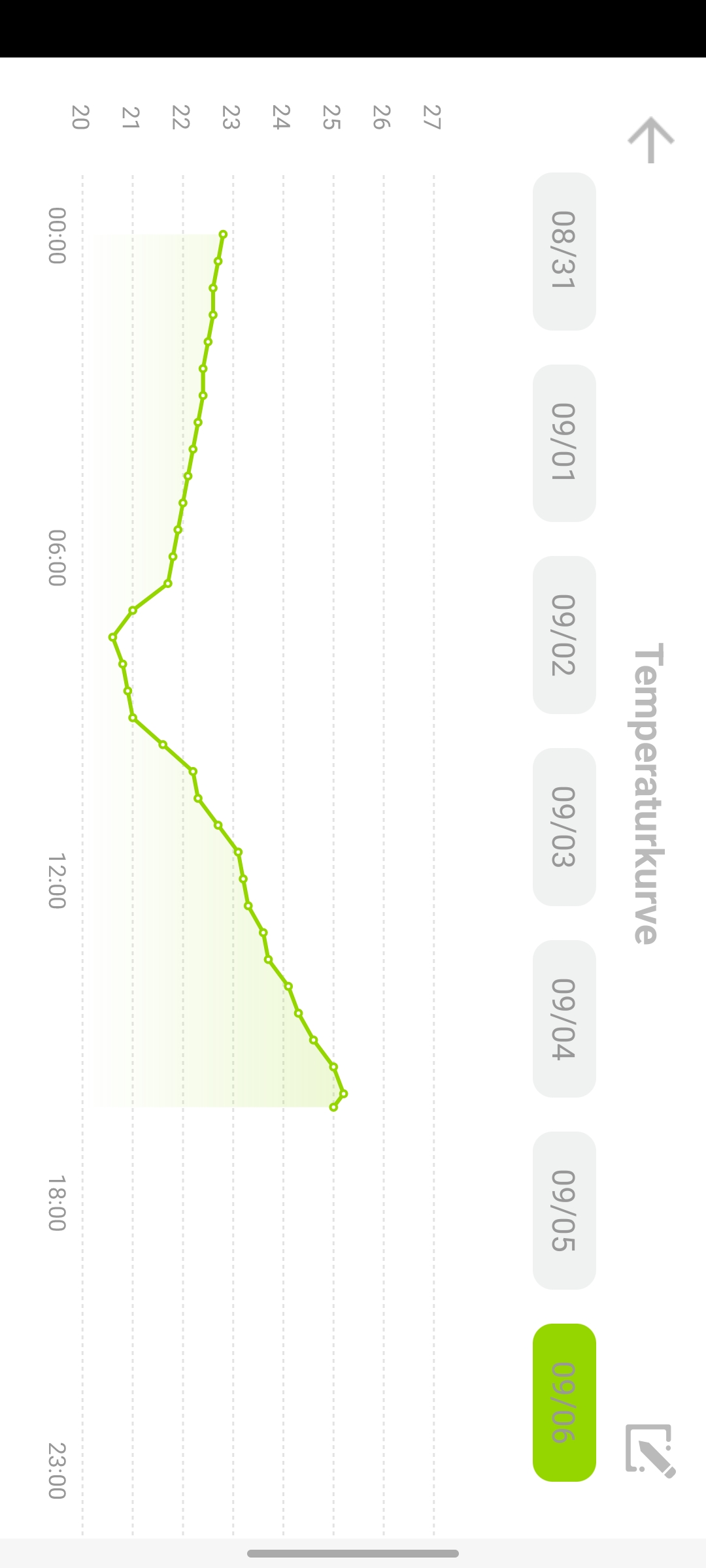 Prominent und groß zeigt das Feld auf der Übersichtsseite die Ist-Temperatur an, die Solltemperatur versteckt sich klein darunter. Wir hätten es bevorzugt, wann stattdessen die Soll-Temperatur groß dargestellt wäre.