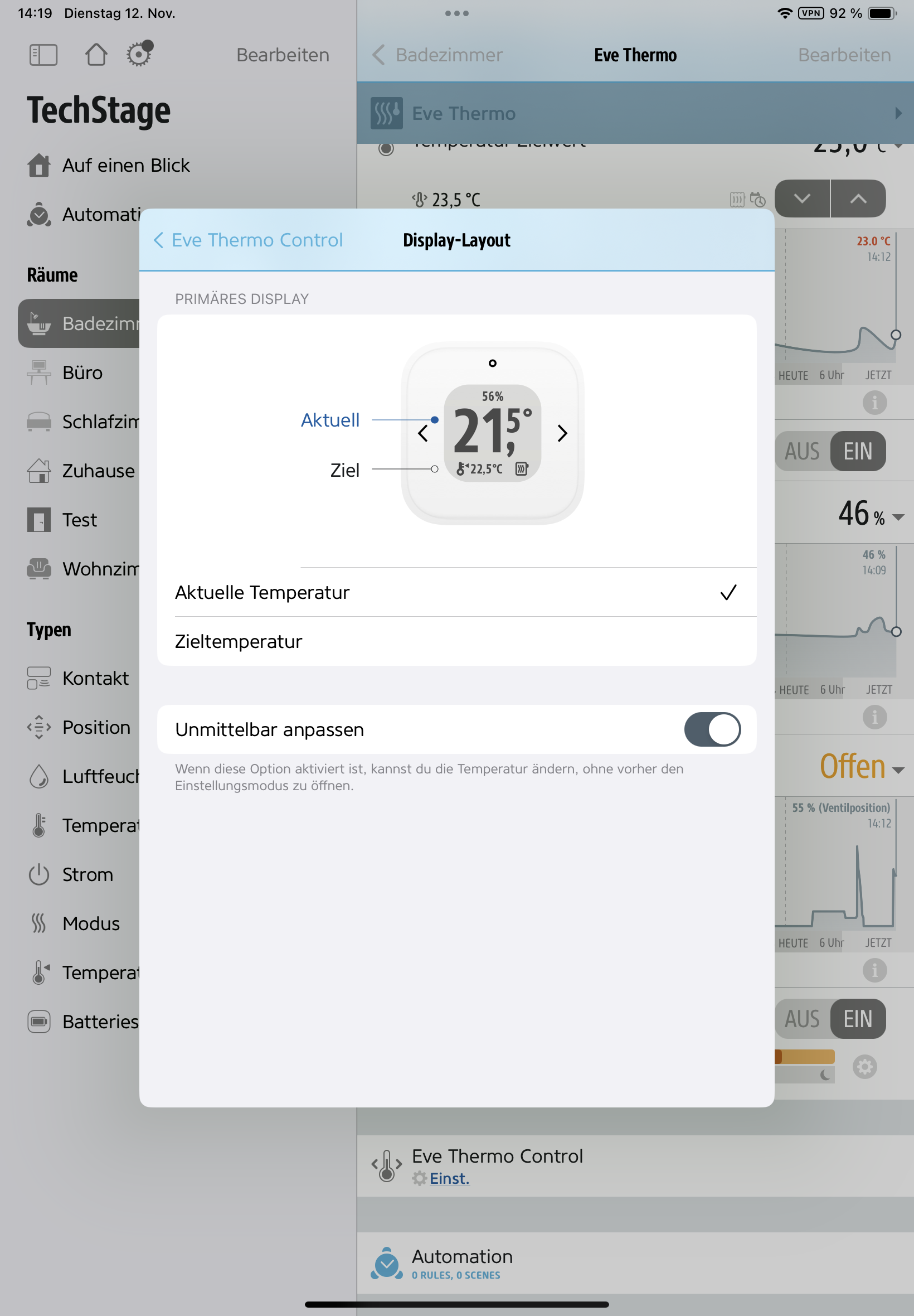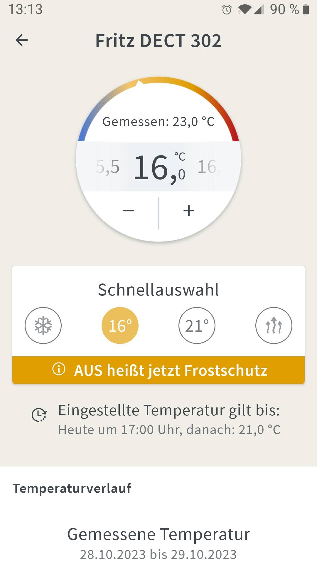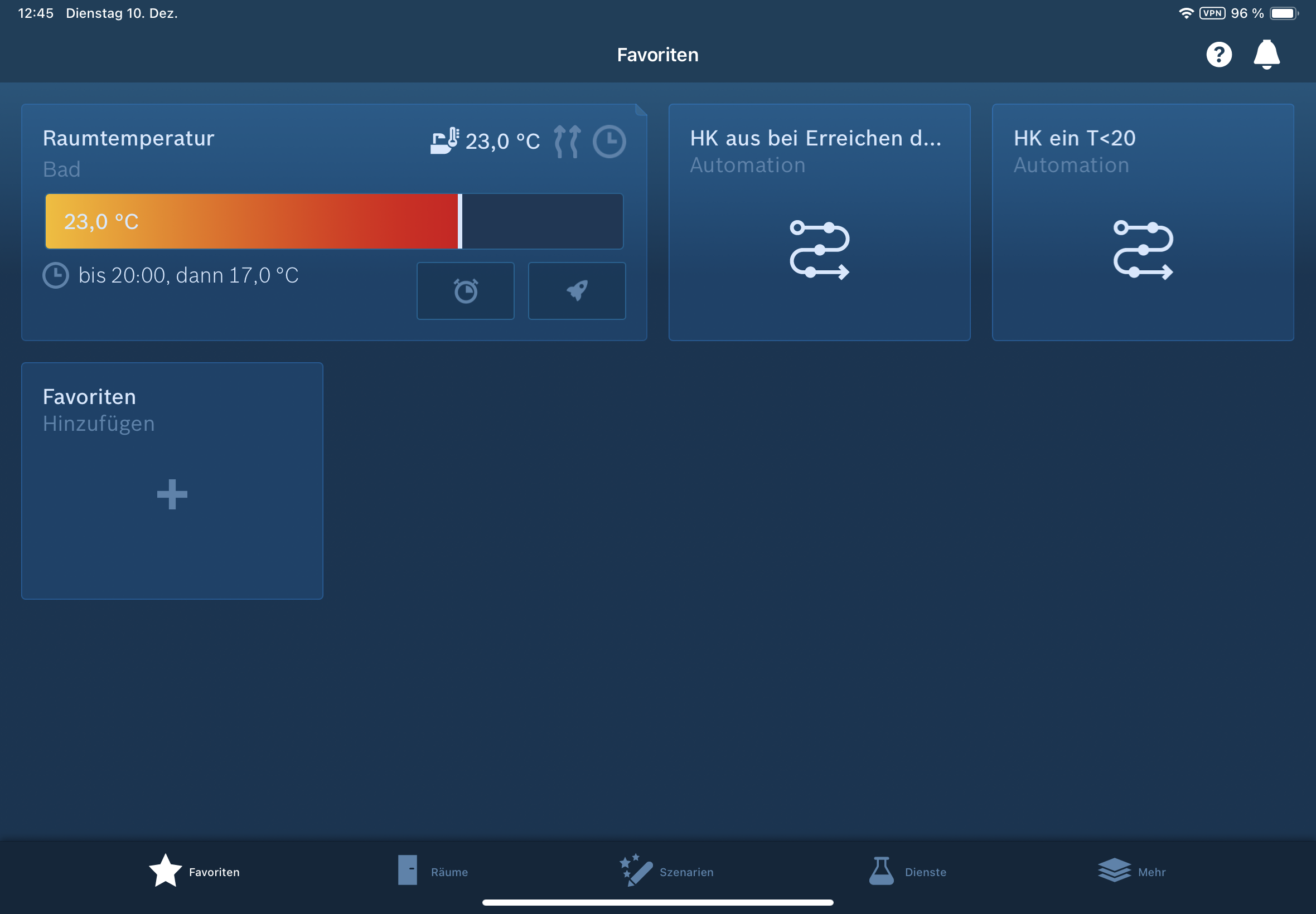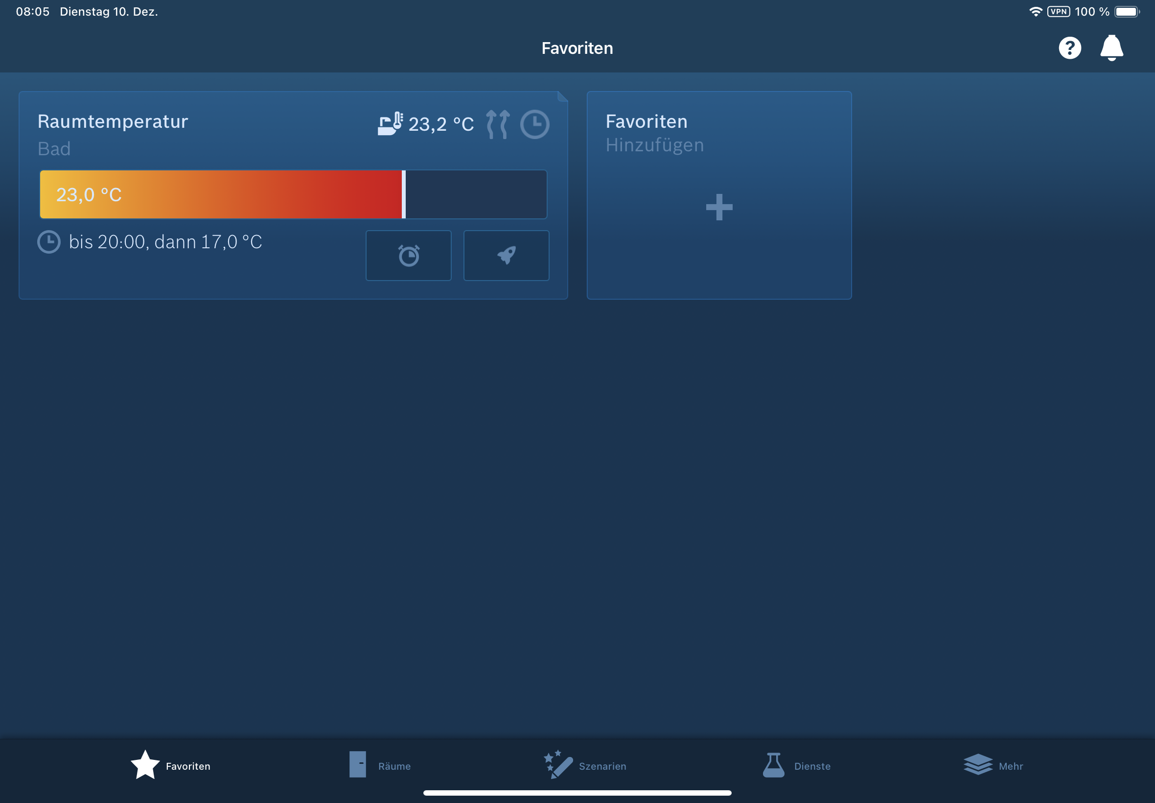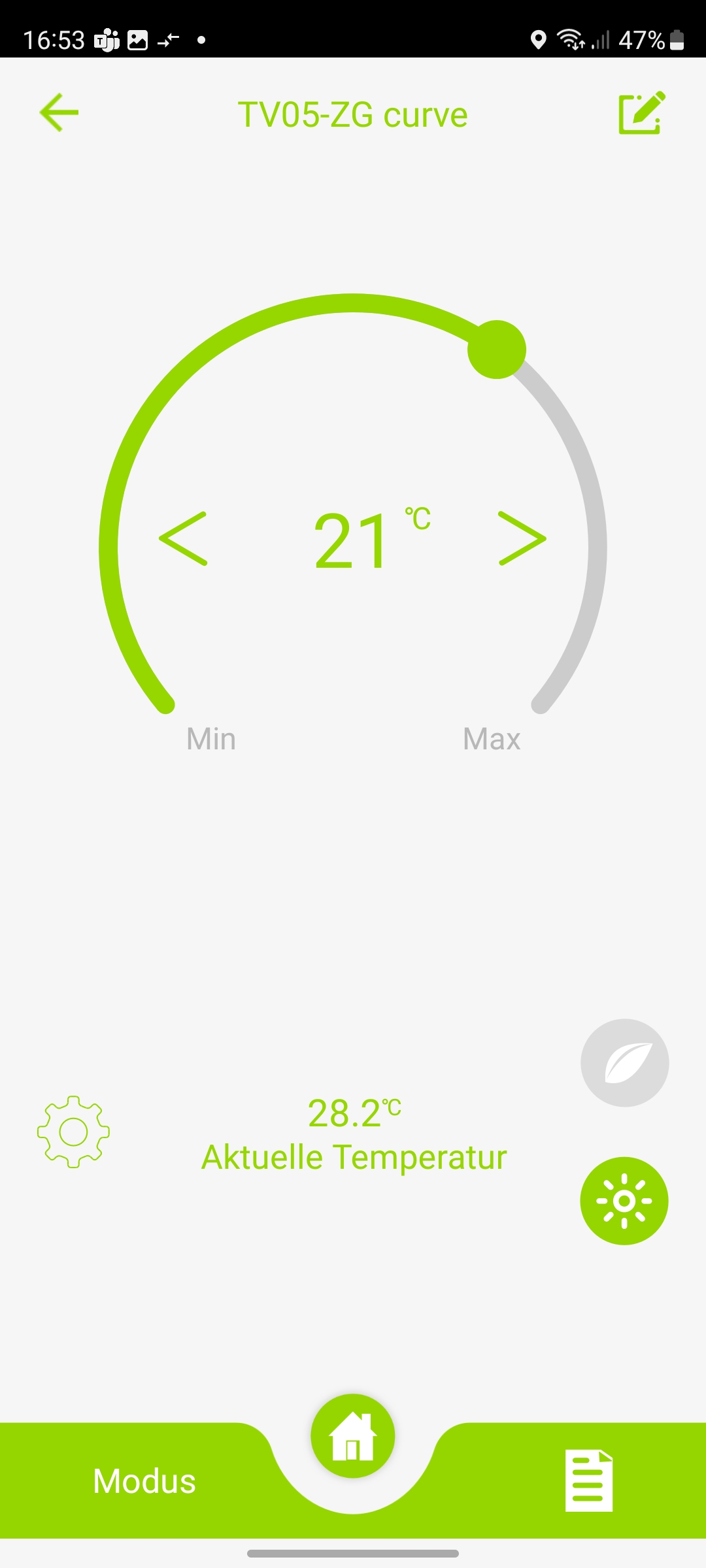 Prominent und groß zeigt das Feld auf der Übersichtsseite die Ist-Temperatur an, die Solltemperatur versteckt sich klein darunter. Wir hätten es bevorzugt, wann stattdessen die Soll-Temperatur groß dargestellt wäre.