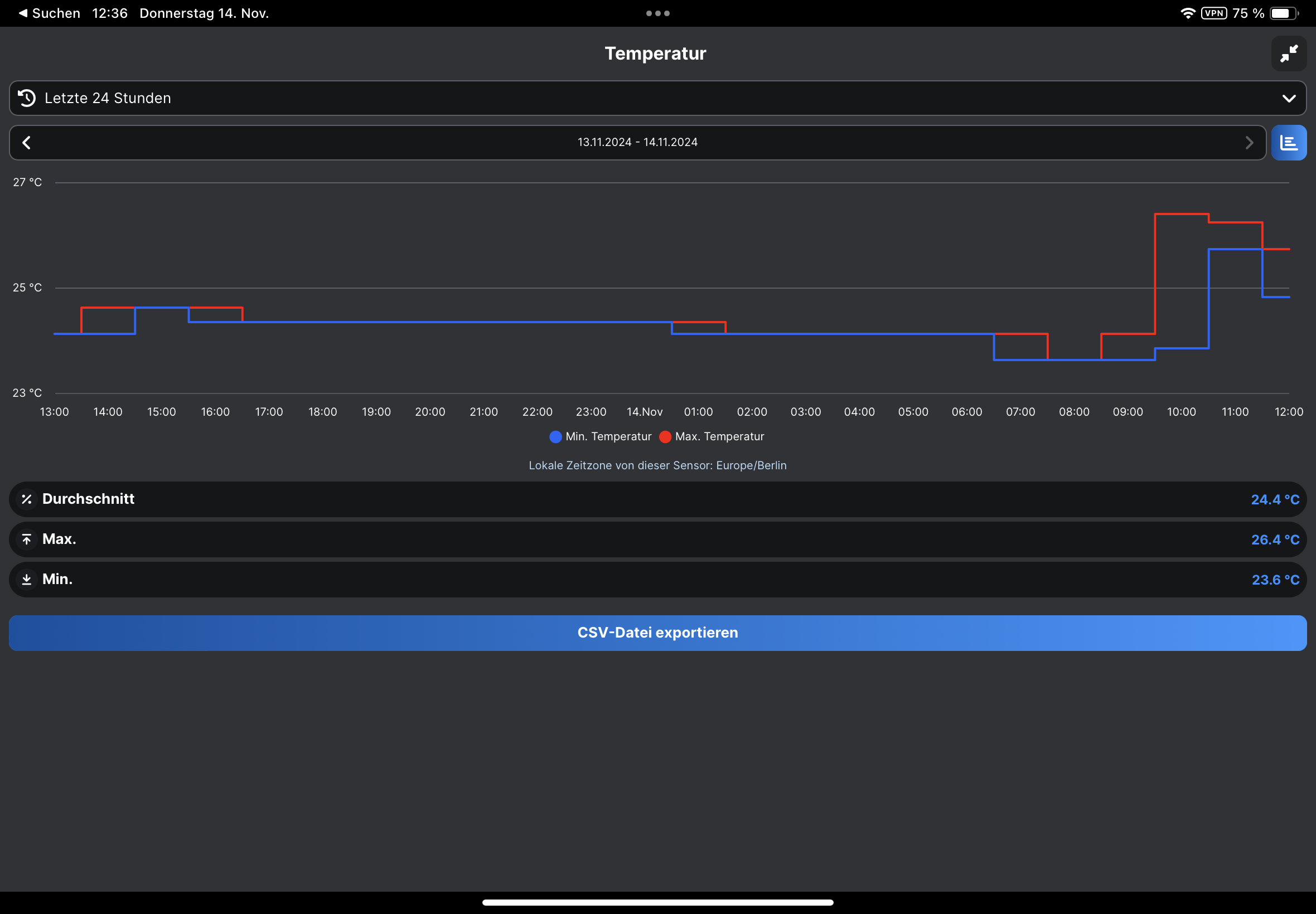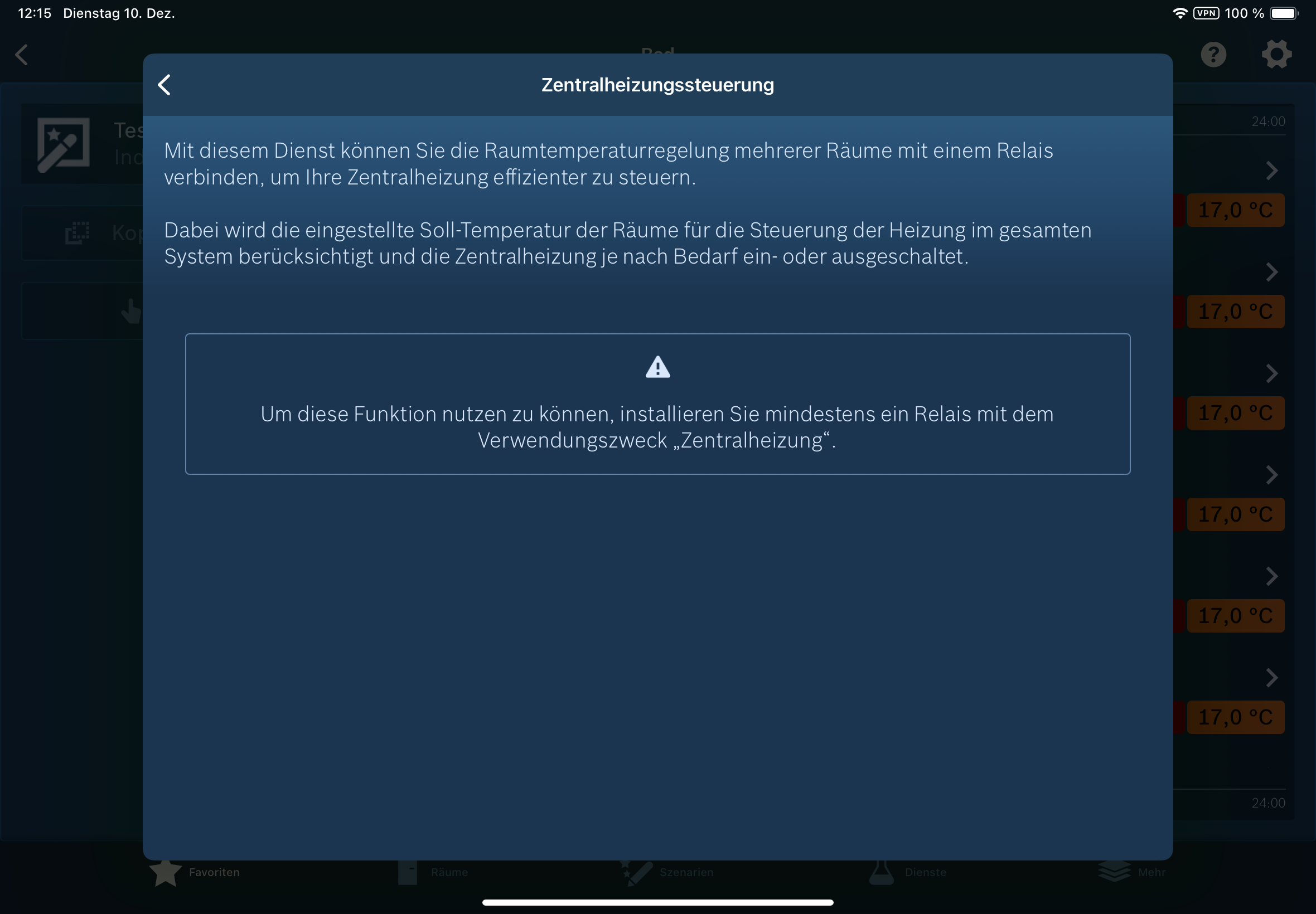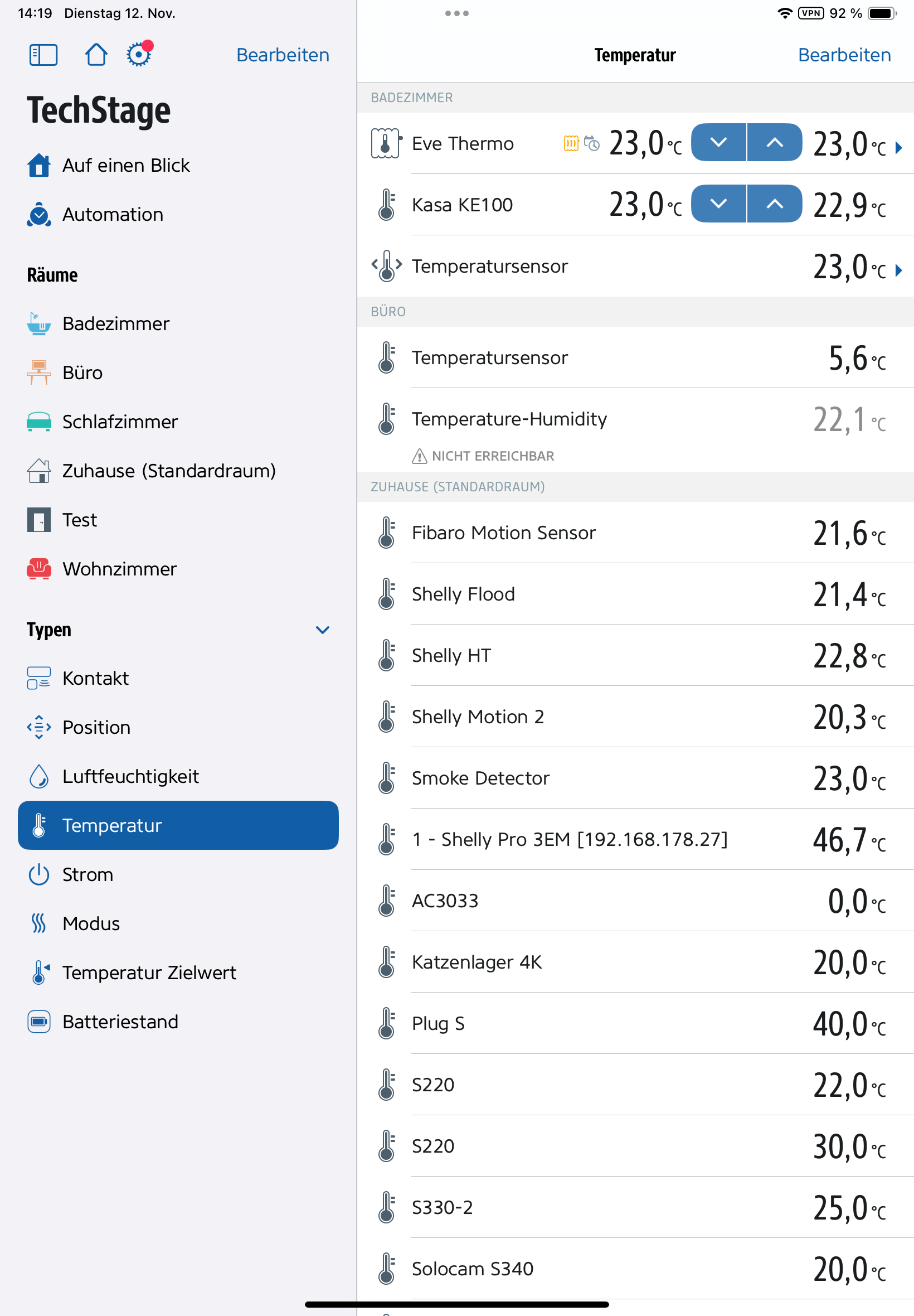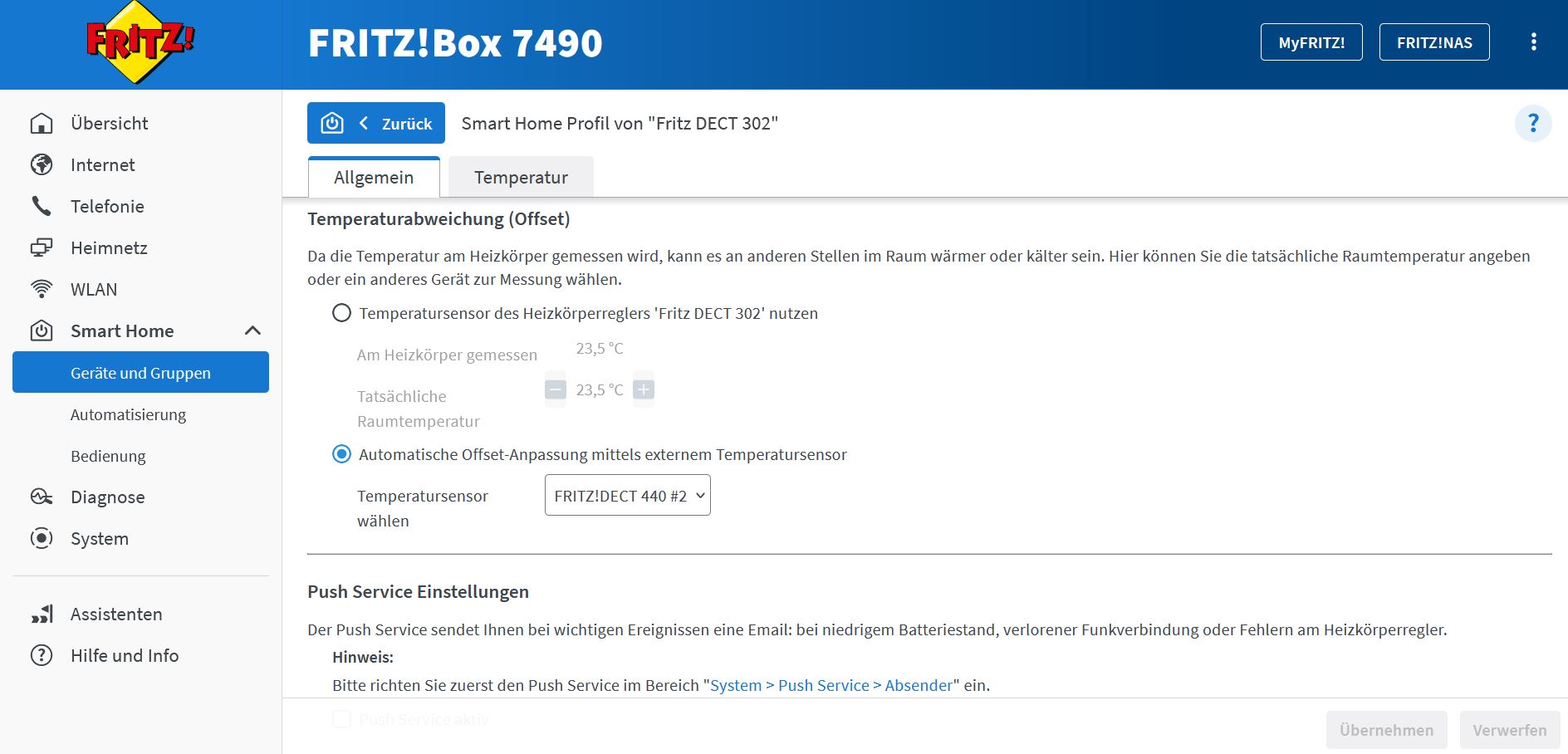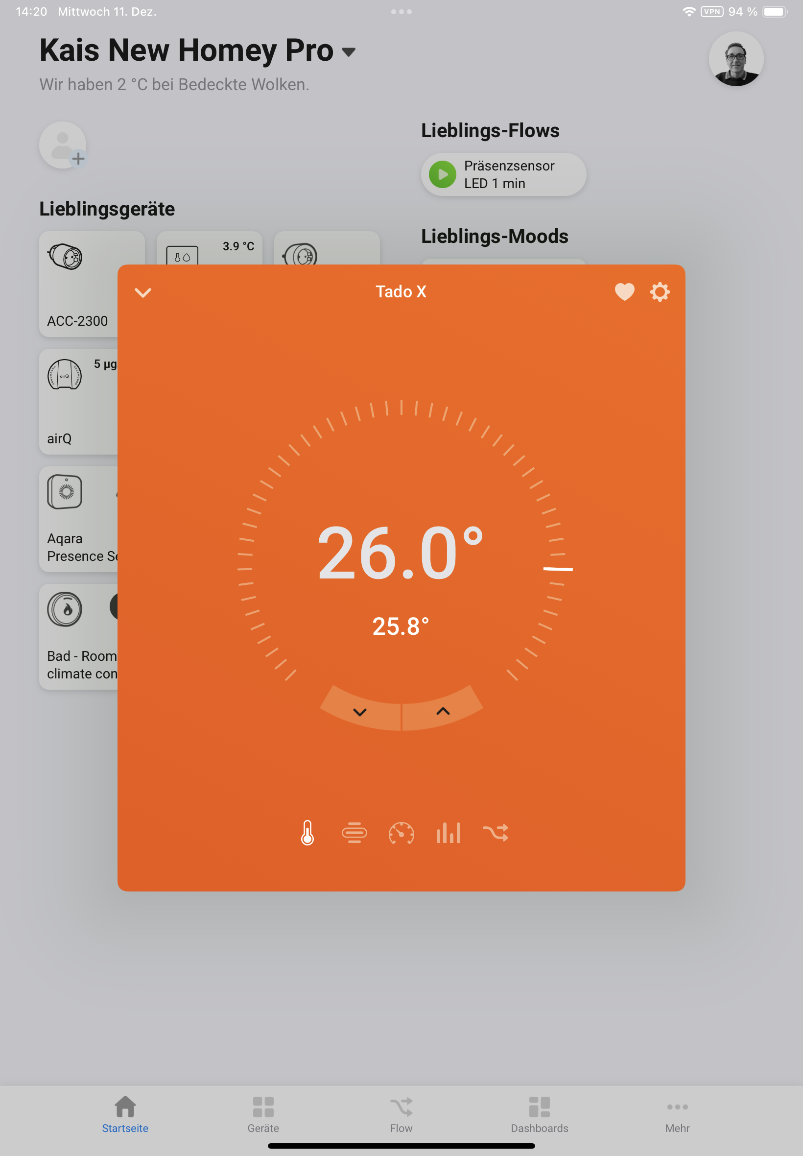 Prominent und groß zeigt das Feld auf der Übersichtsseite die Ist-Temperatur an, die Solltemperatur versteckt sich klein darunter. Wir hätten es bevorzugt, wann stattdessen die Soll-Temperatur groß dargestellt wäre.