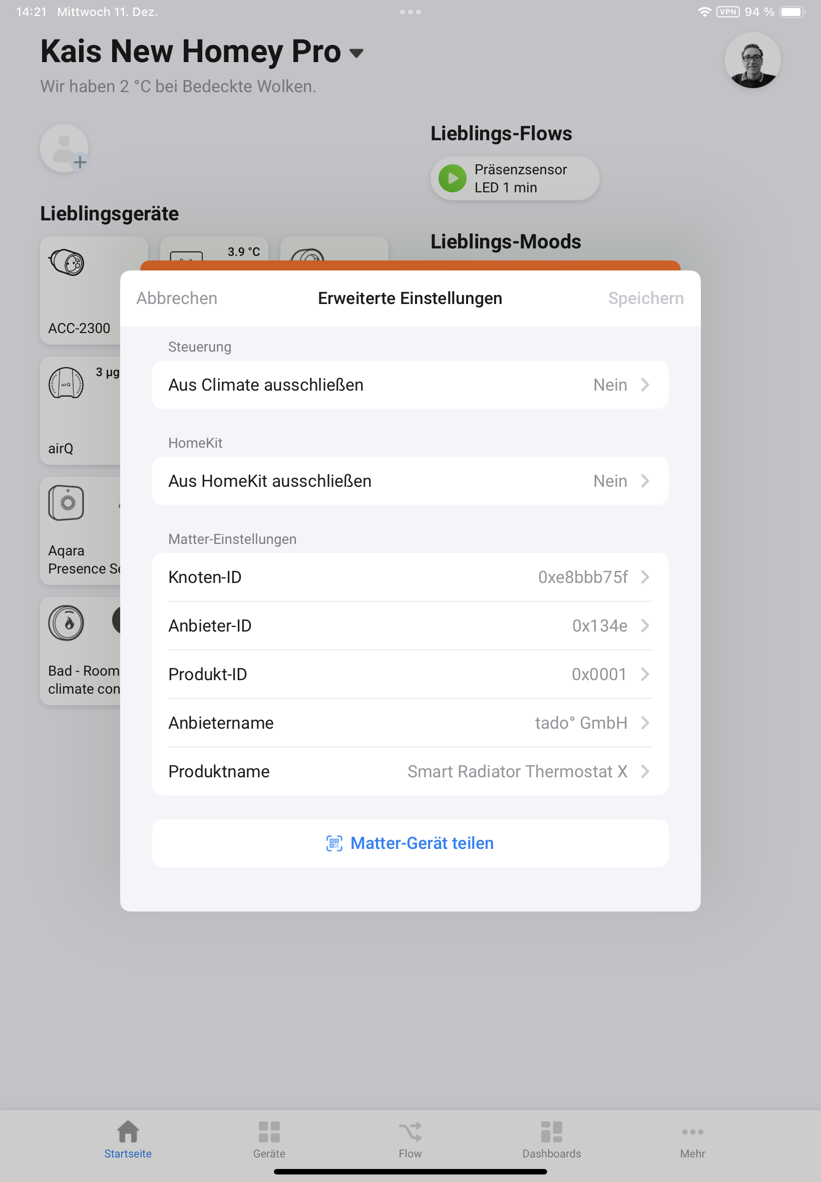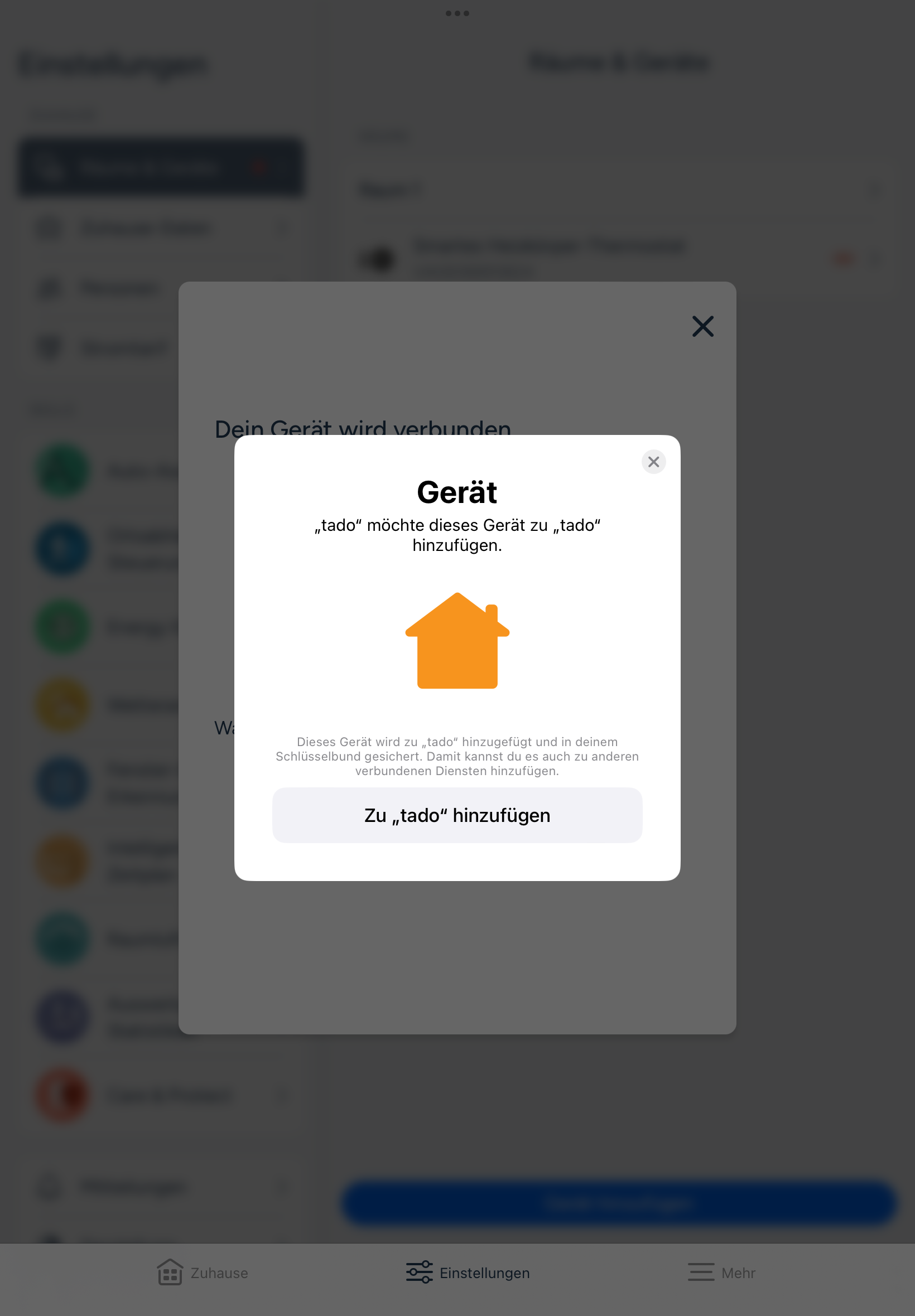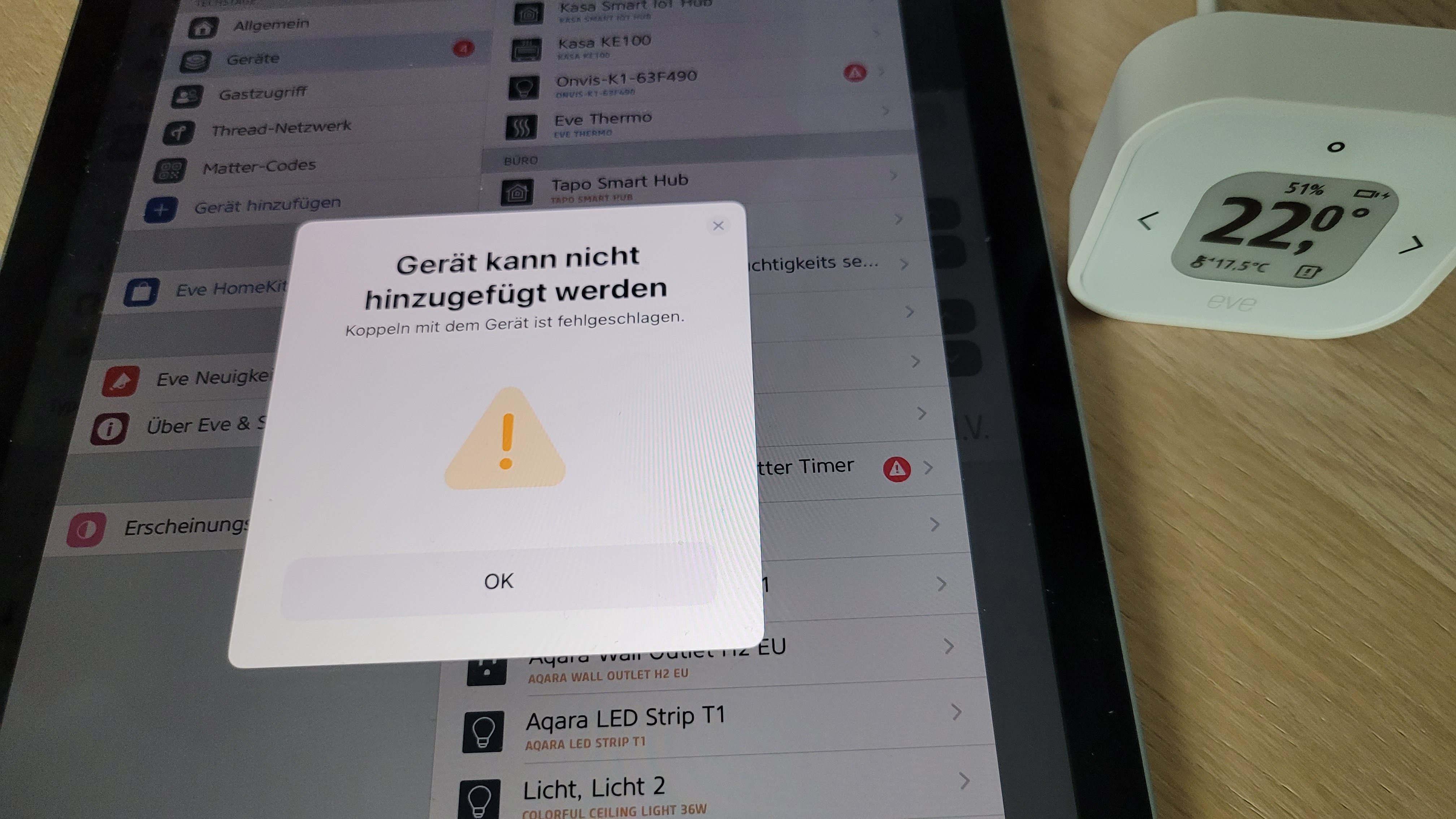 Beim direkten Anschluss an einen Thread-Border-Router ist die Bridge nicht nötig. Im Test haben wir das Thermostat zunächst über den beiliegenden QR-Code direkt mit Homey Pro per Thread verbunden. Mit demselben Code gelingt auch die Koppelung mit der Tado-App. Allerdings konnten wir im Test keine weiteren Smart-Home-Zentralen mit dem Thermostat verbinden. Das gelingt allerdings, wenn das Gerät direkt an ein Apple TV 4K angebunden ist. Damit haben wir das Gerät auch mit Home Assistant verbunden. Eine Koppelung an Samsung Smartthings und Amazon Echo Hub, die ebenfalls einen Thread-Border-Router bieten, hat hingegen nicht funktioniert.