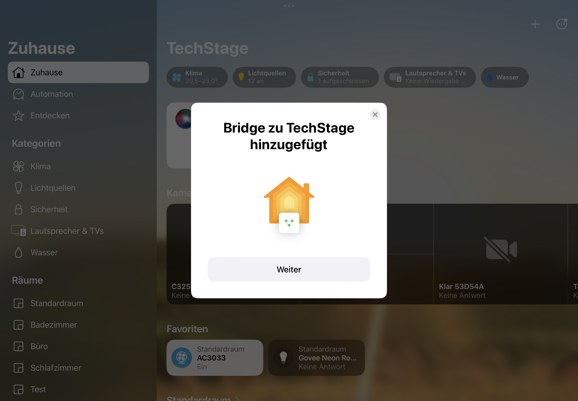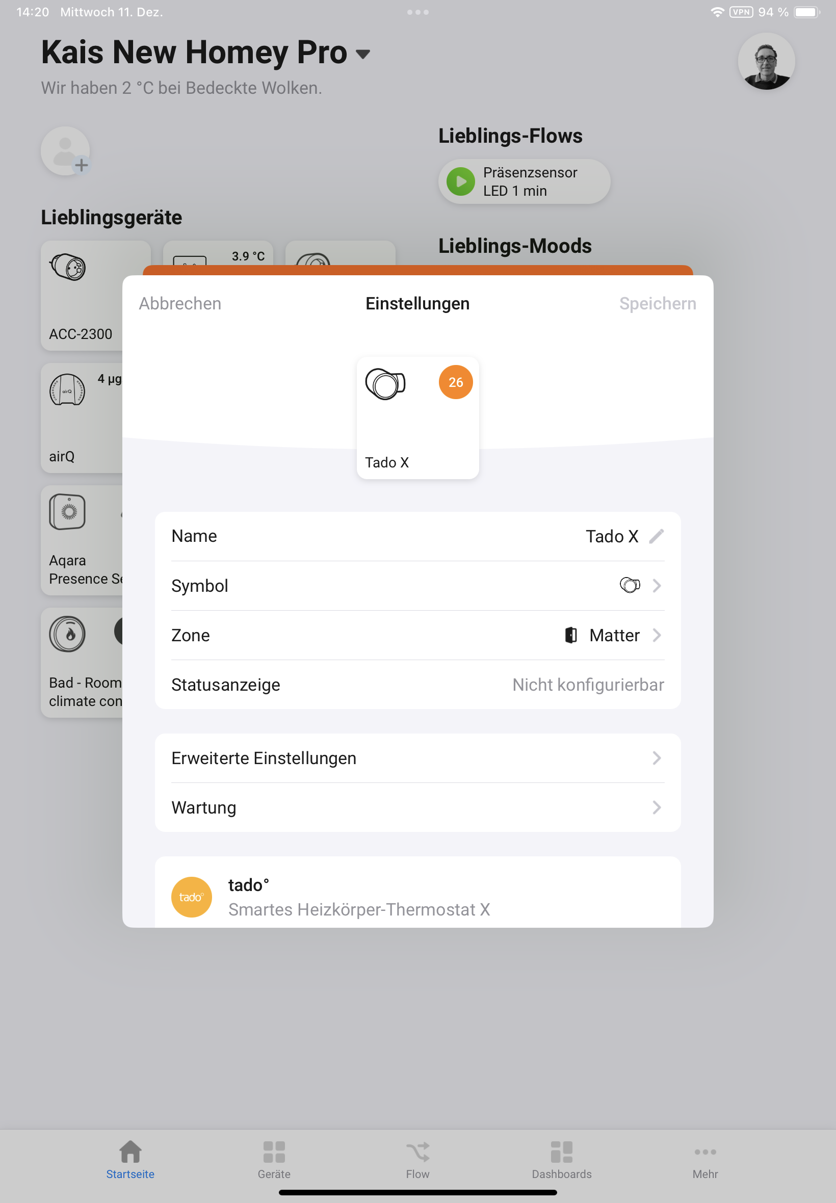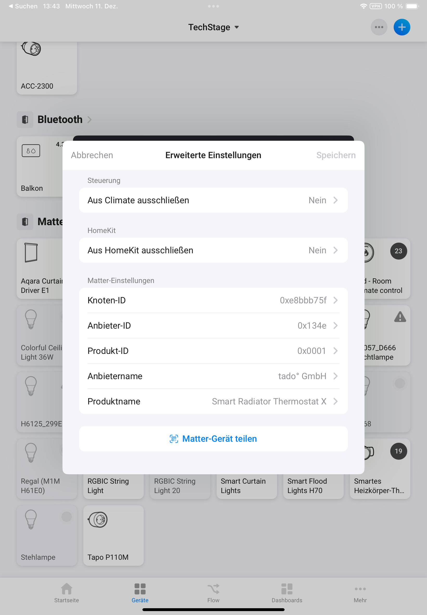 Beim direkten Anschluss an einen Thread-Border-Router ist die Bridge nicht nötig. Im Test haben wir das Thermostat zunächst über den beiliegenden QR-Code direkt mit Homey Pro per Thread verbunden. Mit demselben Code gelingt auch die Koppelung mit der Tado-App. Allerdings konnten wir im Test keine weiteren Smart-Home-Zentralen mit dem Thermostat verbinden. Das gelingt allerdings, wenn das Gerät direkt an ein Apple TV 4K angebunden ist. Damit haben wir das Gerät auch mit Home Assistant verbunden. Eine Koppelung an Samsung Smartthings und Amazon Echo Hub, die ebenfalls einen Thread-Border-Router bieten, hat hingegen nicht funktioniert.