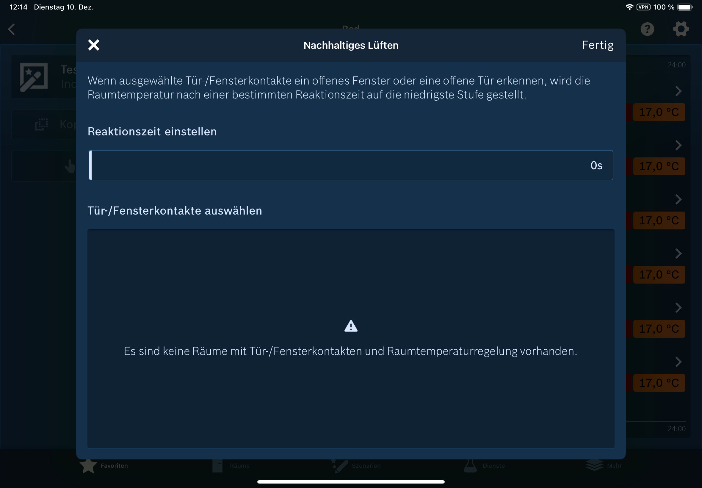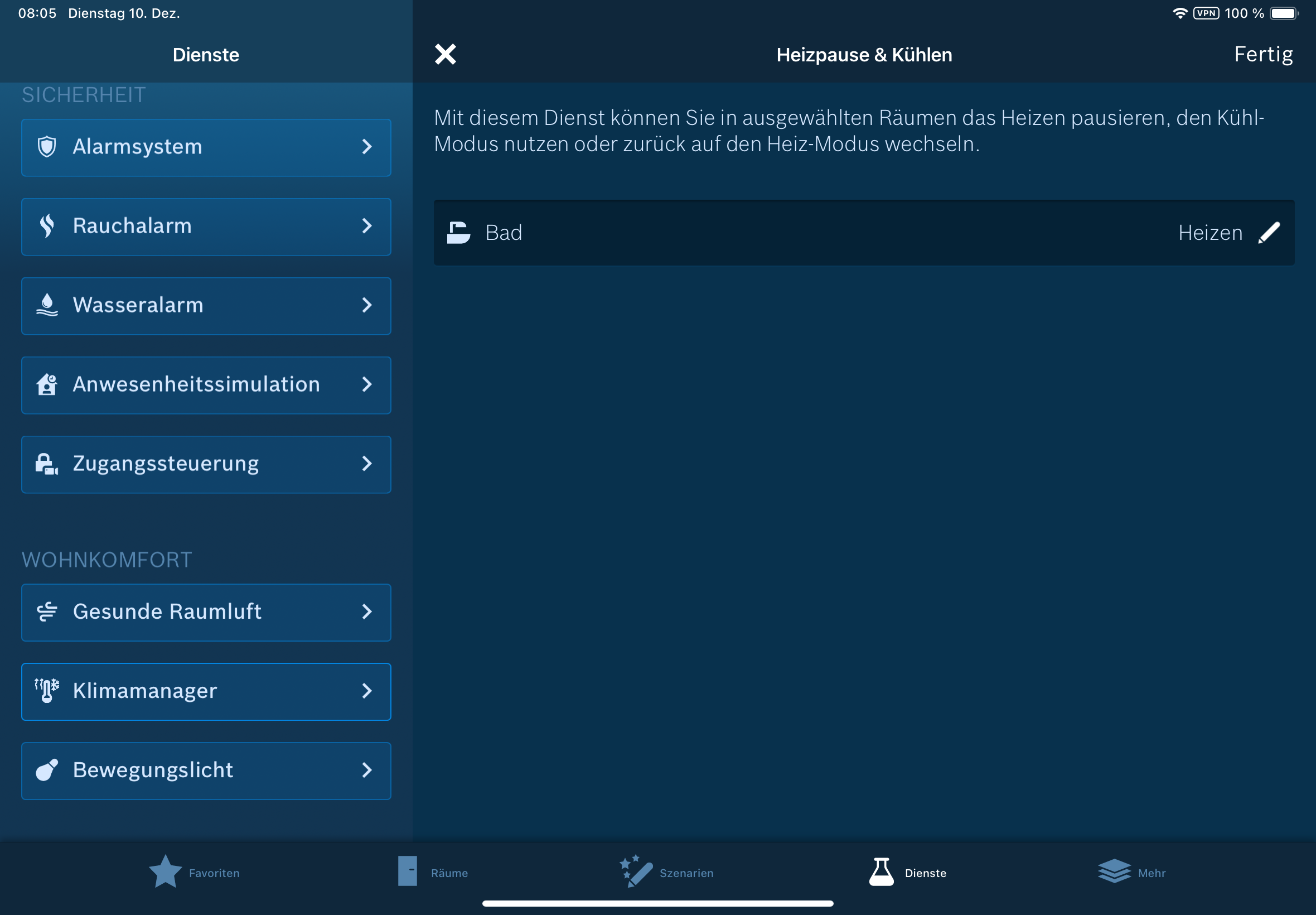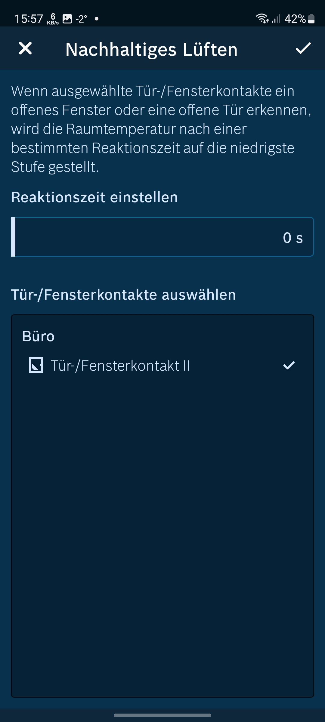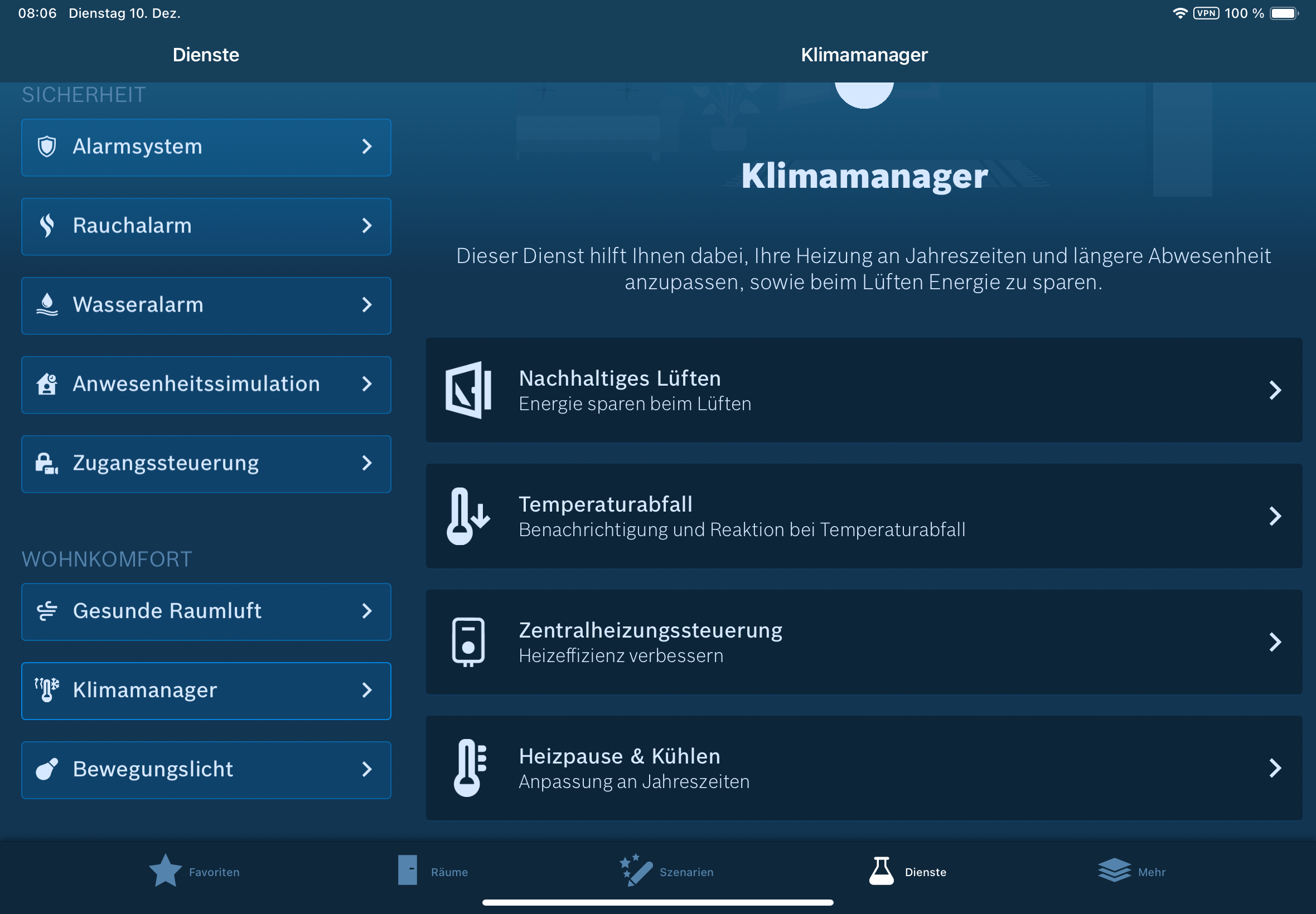 Unter Dienste im Bereich Wohnkomfort können Anwender mit dem Klimamanager weitere Einstellungen und Automatisierungen festlegen. Mit der Option Heizpause & Kühlen kann so das Thermostat bei längerer Abwesenheit oder zu bestimmten Jahreszeiten mit Aktivierung der Einstellung Heizpause ausgeschaltet werden. Mit der Option „Nachhaltiges Lüften“ wird der Tür-/Fensterkontakt mit dem Thermostat gekoppelt. Erkennt der Sensor, dass ein Fenster geöffnet ist, schaltet das Thermostat den Heizkörper sofort ab. Optional kann man eine Verzögerung von bis zu 180 Sekunden einstellen, sodass bei einem kurzen Öffnen des Fensters das Thermostat nicht reagiert.
