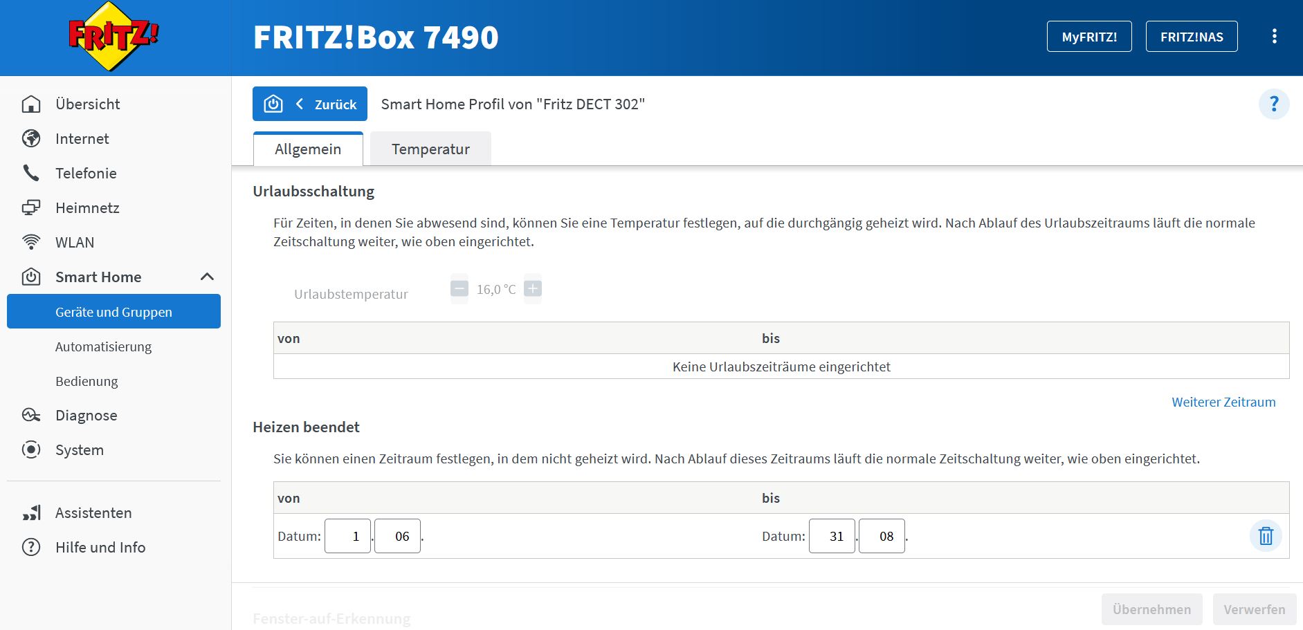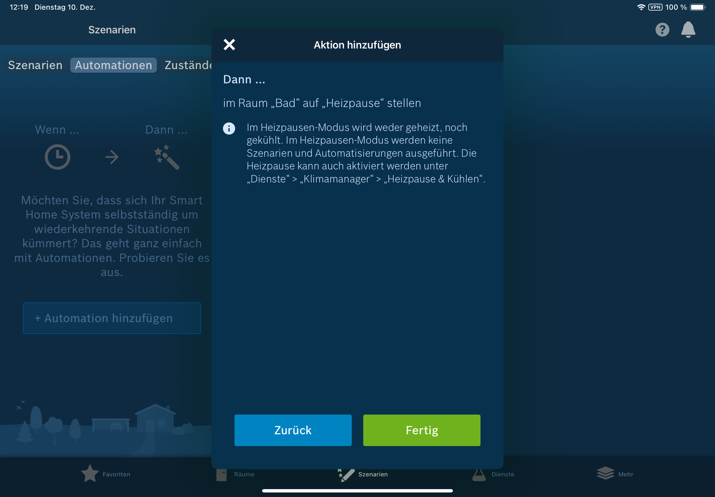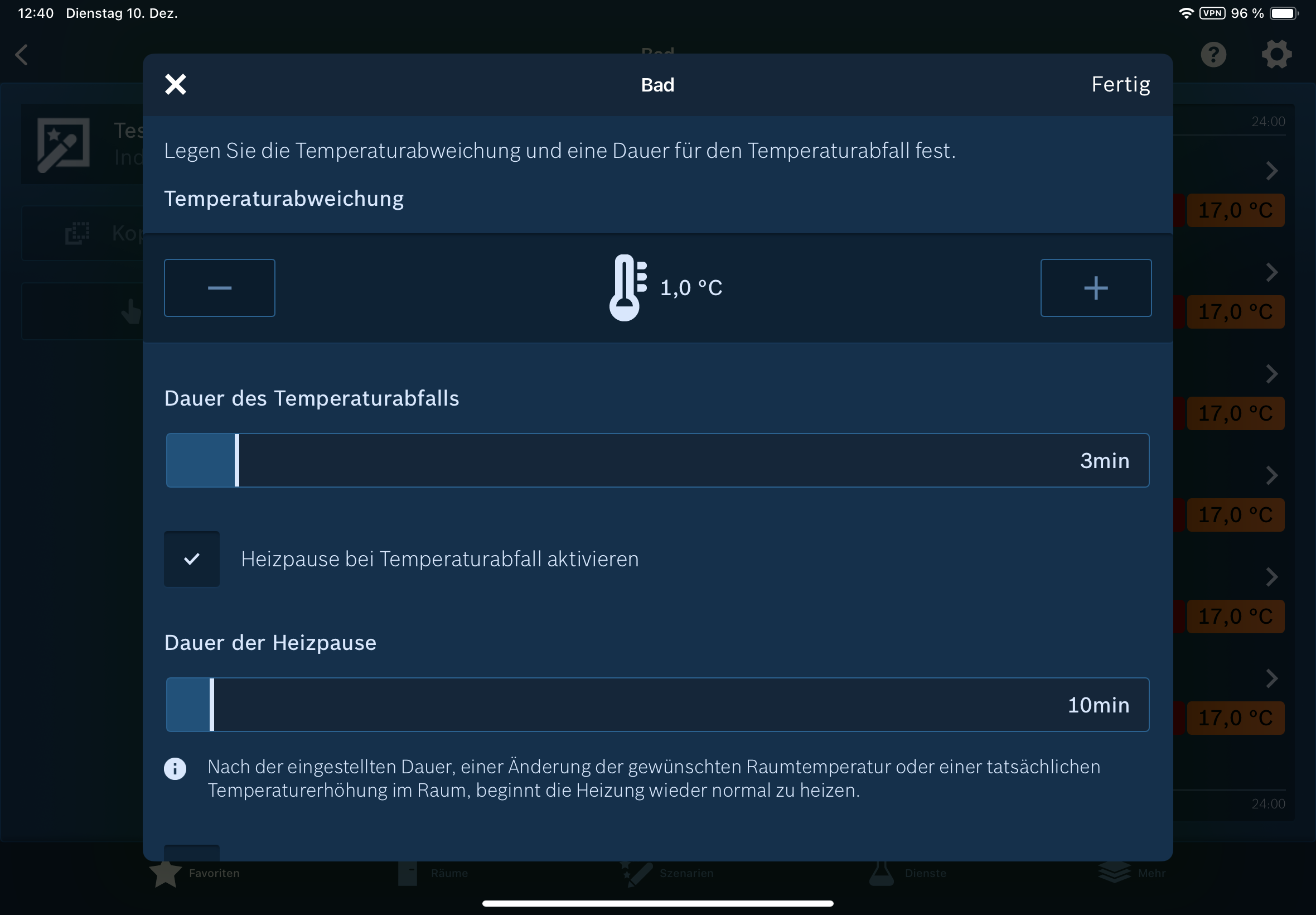 Unter Dienste im Bereich Wohnkomfort können Anwender mit dem Klimamanager weitere Einstellungen und Automatisierungen festlegen. Mit der Option Heizpause & Kühlen kann so das Thermostat bei längerer Abwesenheit oder zu bestimmten Jahreszeiten mit Aktivierung der Einstellung Heizpause ausgeschaltet werden. Mit der Option „Nachhaltiges Lüften“ wird der Tür-/Fensterkontakt mit dem Thermostat gekoppelt. Erkennt der Sensor, dass ein Fenster geöffnet ist, schaltet das Thermostat den Heizkörper sofort ab. Optional kann man eine Verzögerung von bis zu 180 Sekunden einstellen, sodass bei einem kurzen Öffnen des Fensters das Thermostat nicht reagiert.