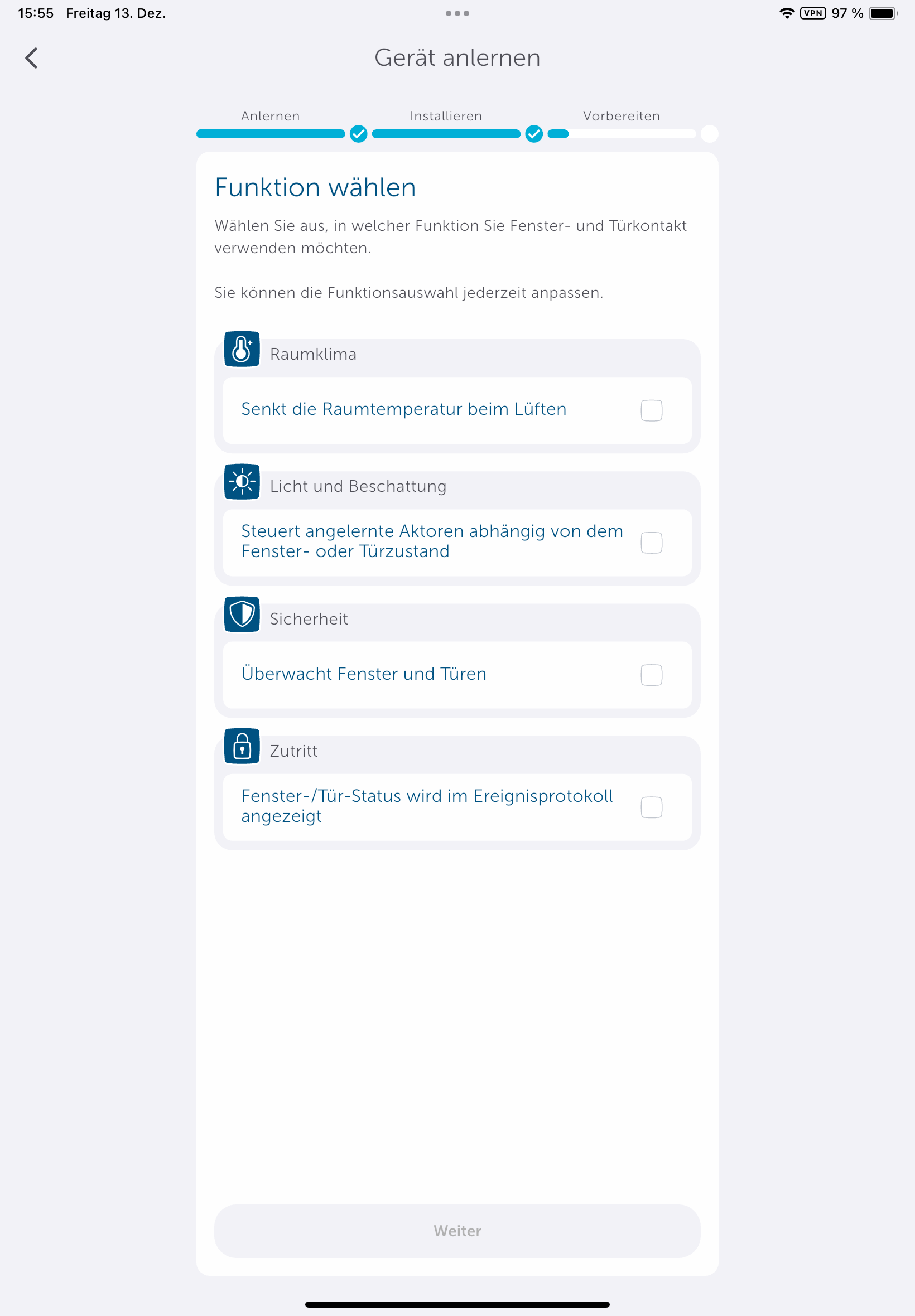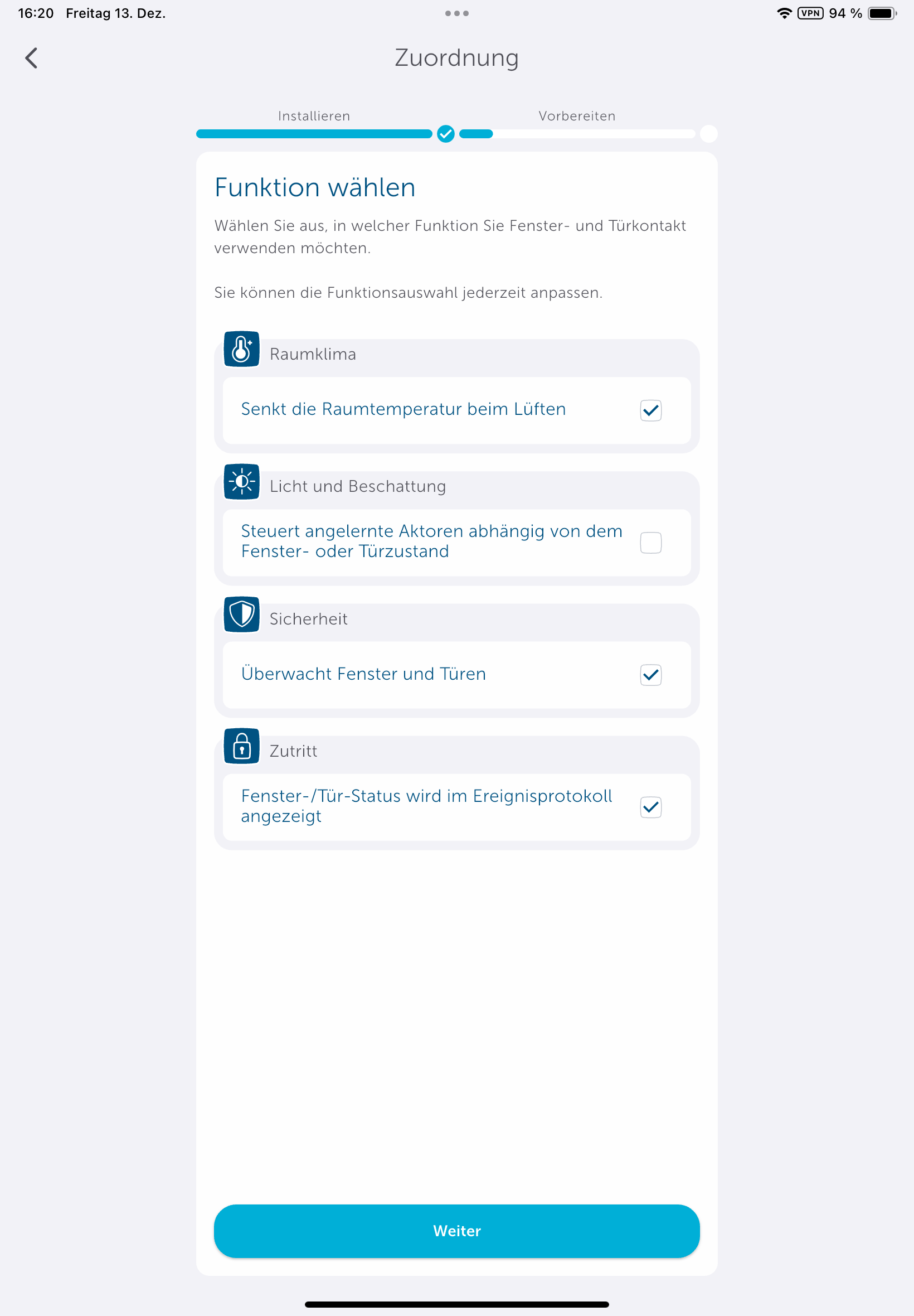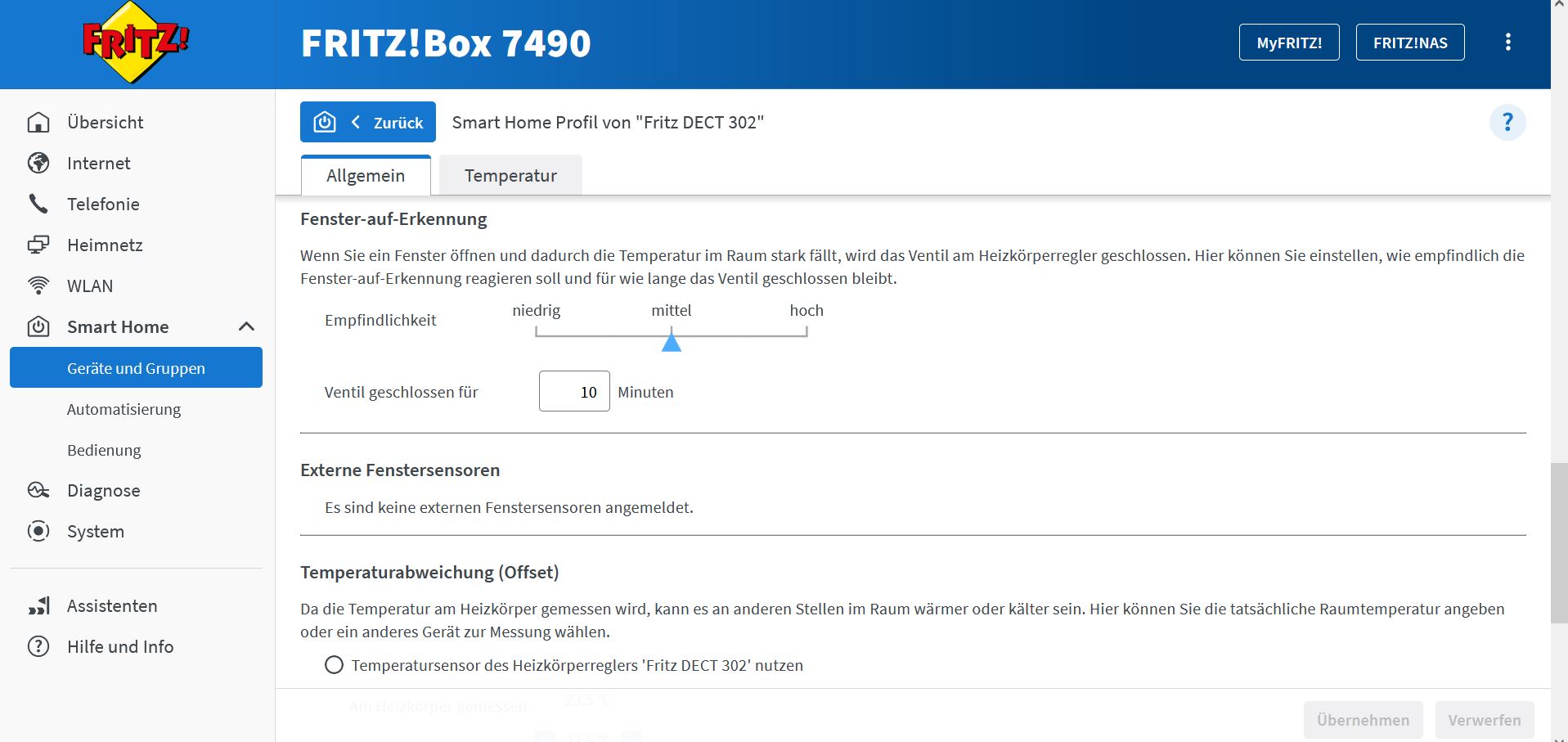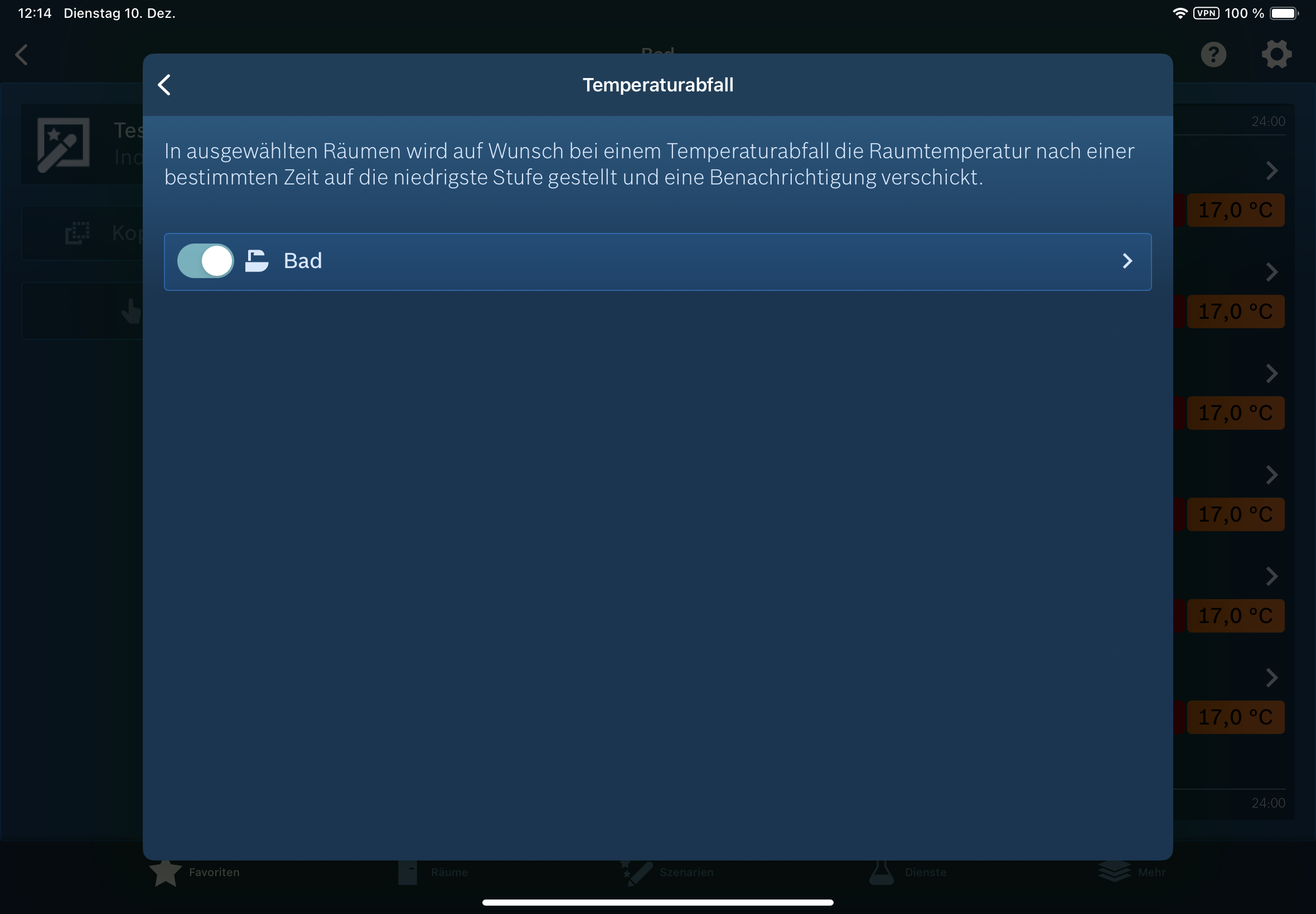 Unter Dienste im Bereich Wohnkomfort können Anwender mit dem Klimamanager weitere Einstellungen und Automatisierungen festlegen. Mit der Option Heizpause & Kühlen kann so das Thermostat bei längerer Abwesenheit oder zu bestimmten Jahreszeiten mit Aktivierung der Einstellung Heizpause ausgeschaltet werden. Mit der Option „Nachhaltiges Lüften“ wird der Tür-/Fensterkontakt mit dem Thermostat gekoppelt. Erkennt der Sensor, dass ein Fenster geöffnet ist, schaltet das Thermostat den Heizkörper sofort ab. Optional kann man eine Verzögerung von bis zu 180 Sekunden einstellen, sodass bei einem kurzen Öffnen des Fensters das Thermostat nicht reagiert.