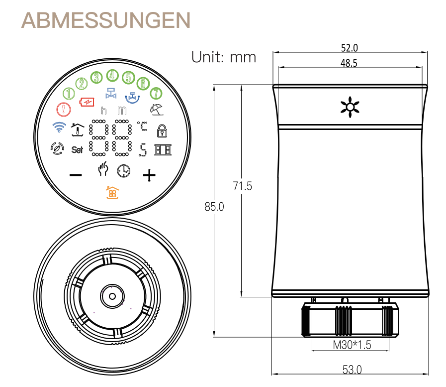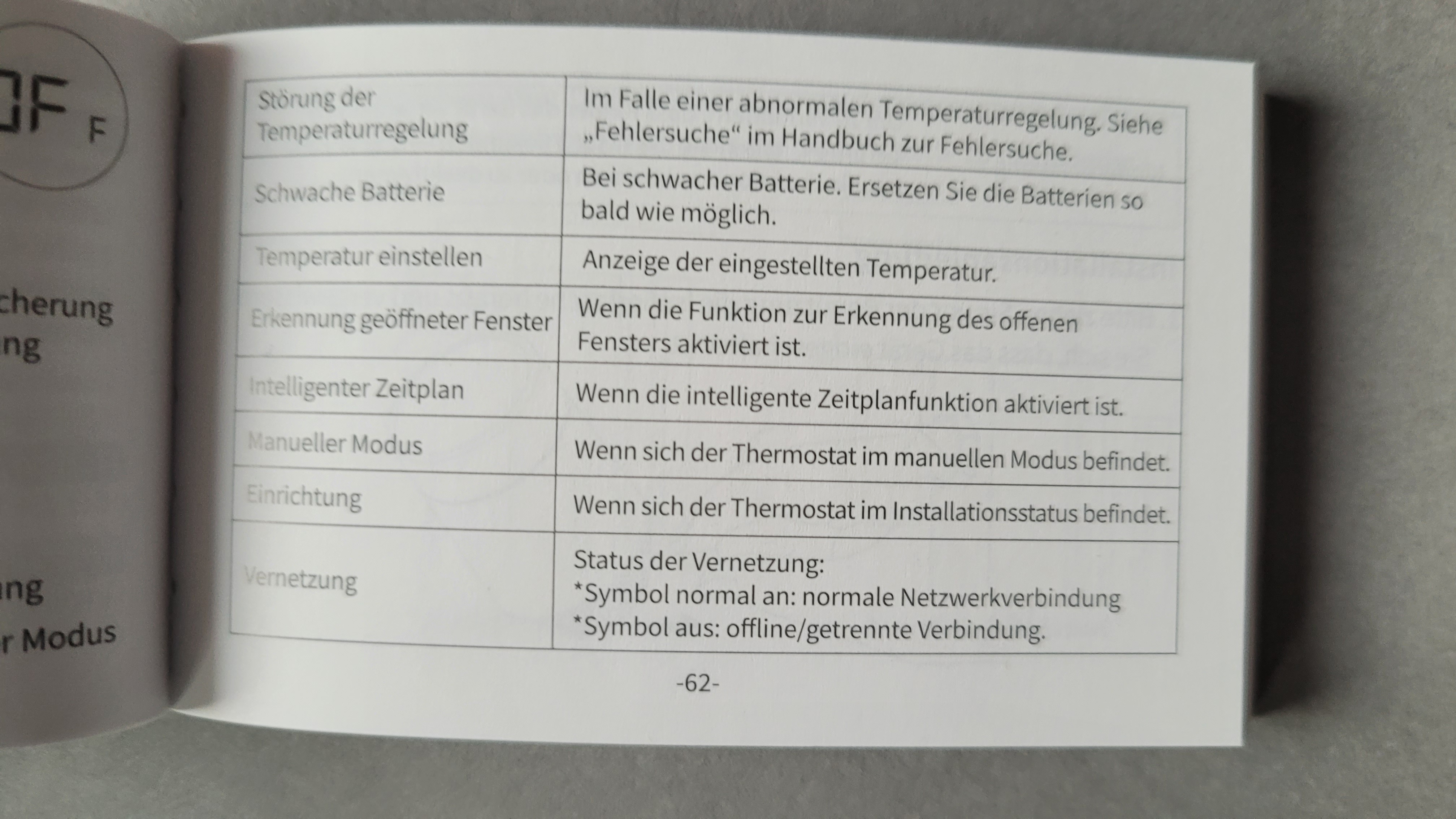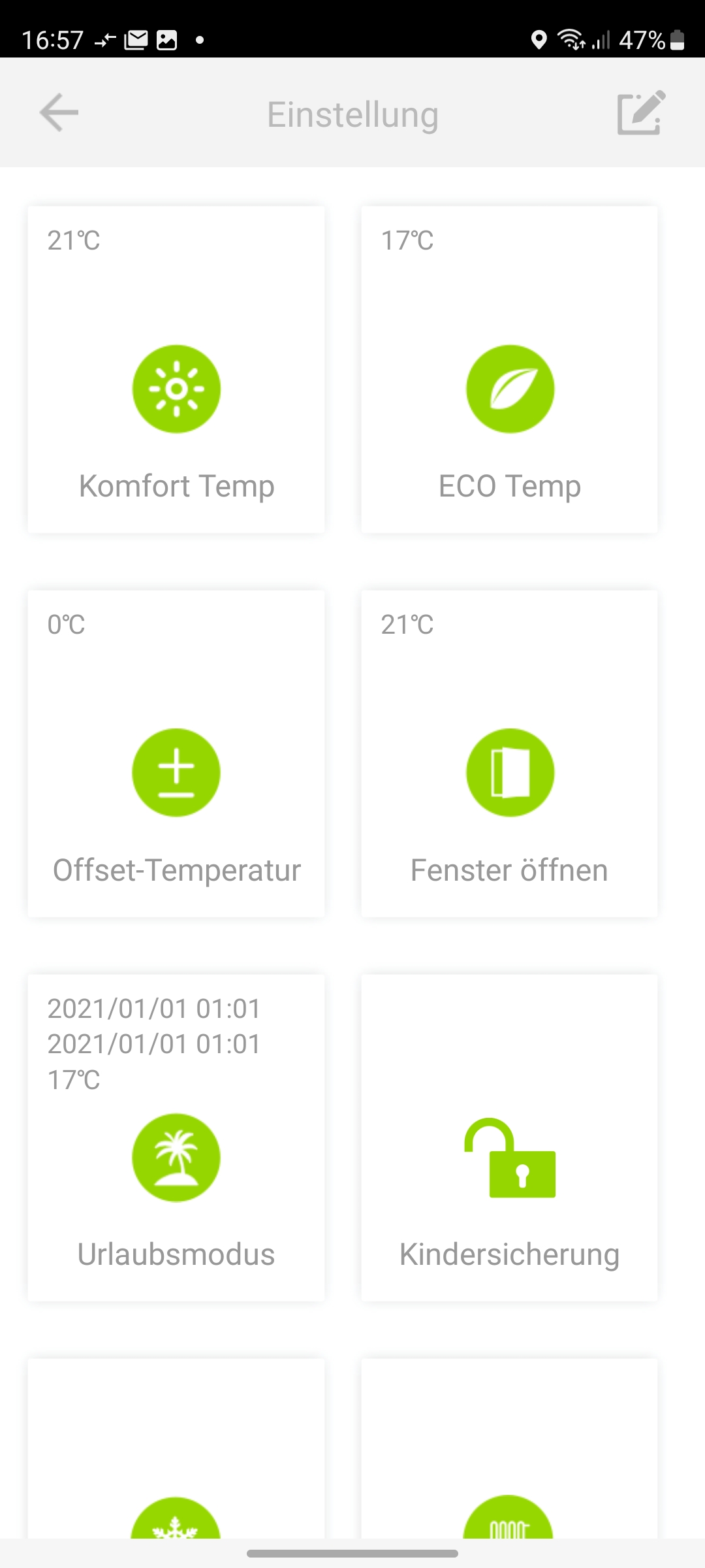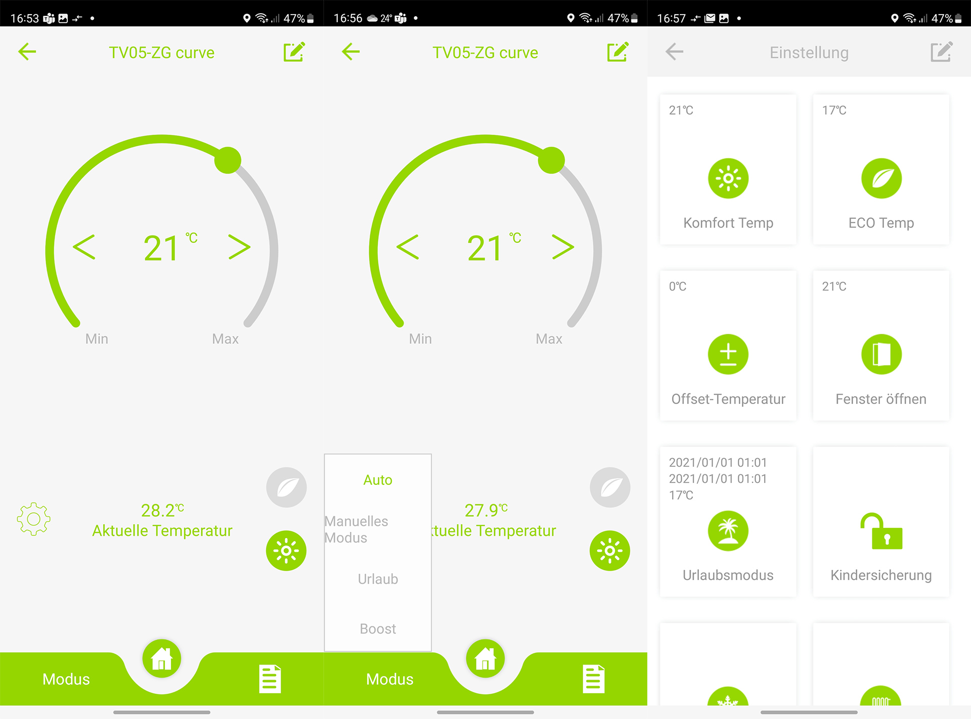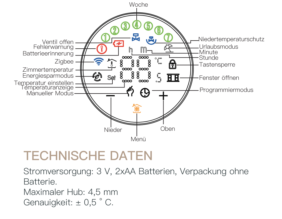 Unterhalb der Temperaturanzeige befinden sich die Schaltflächen für den Automatikmodus (links), den manuellen Modus und für den Frostschutzmodus. Darunter gibt es noch Schaltflächen für bestimmte Funktionen wie einer automatischen Ventilanpassung, einer Kindersicherung sowie für die Fenster-Offen-Erkennung, bei der das Thermostat für 30 Minuten nicht heizt, falls Fenster geöffnet wurde. Die Fenster-Offen-Erkennung reagiert allerdings nur auf einen starken Temperaturabfall, der über den im Heizkörper integrierten Temperatursensor erfasst wird.
