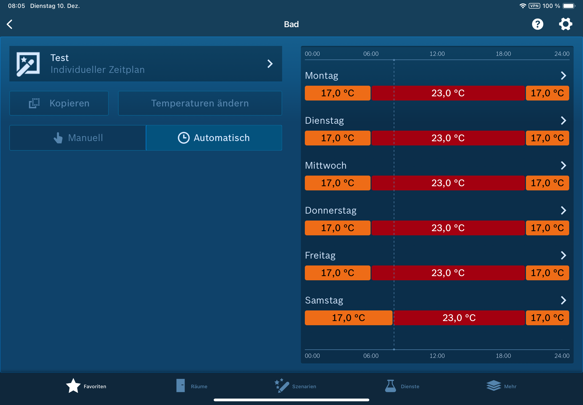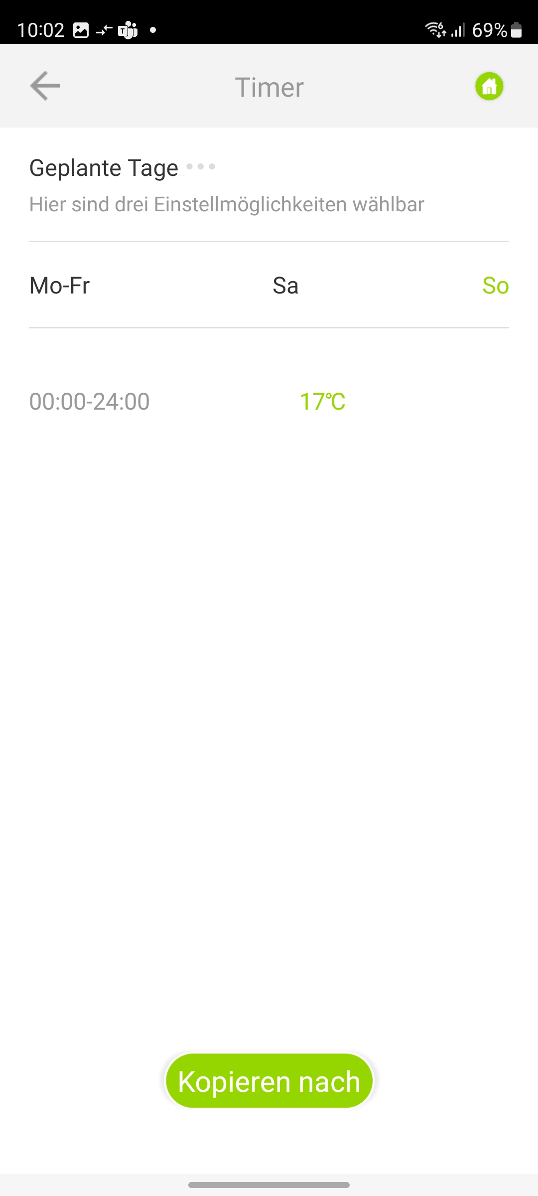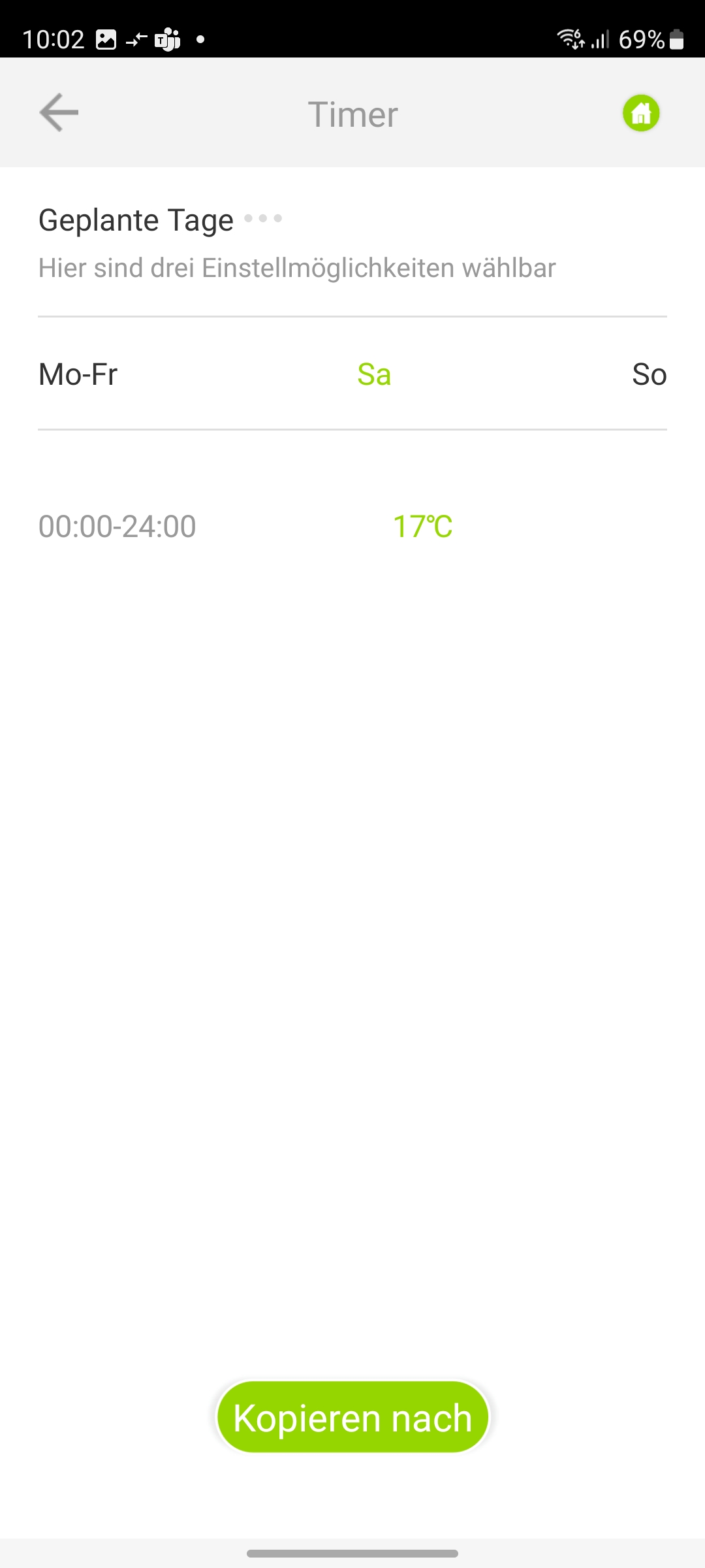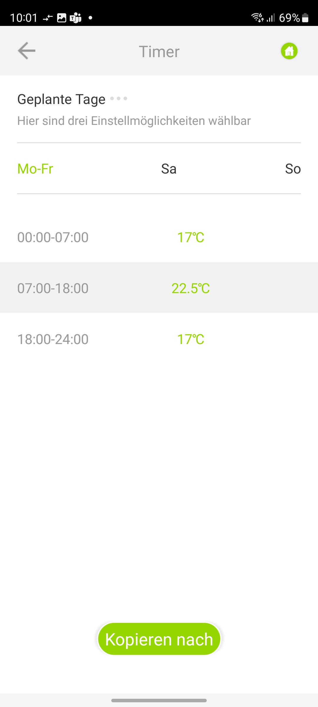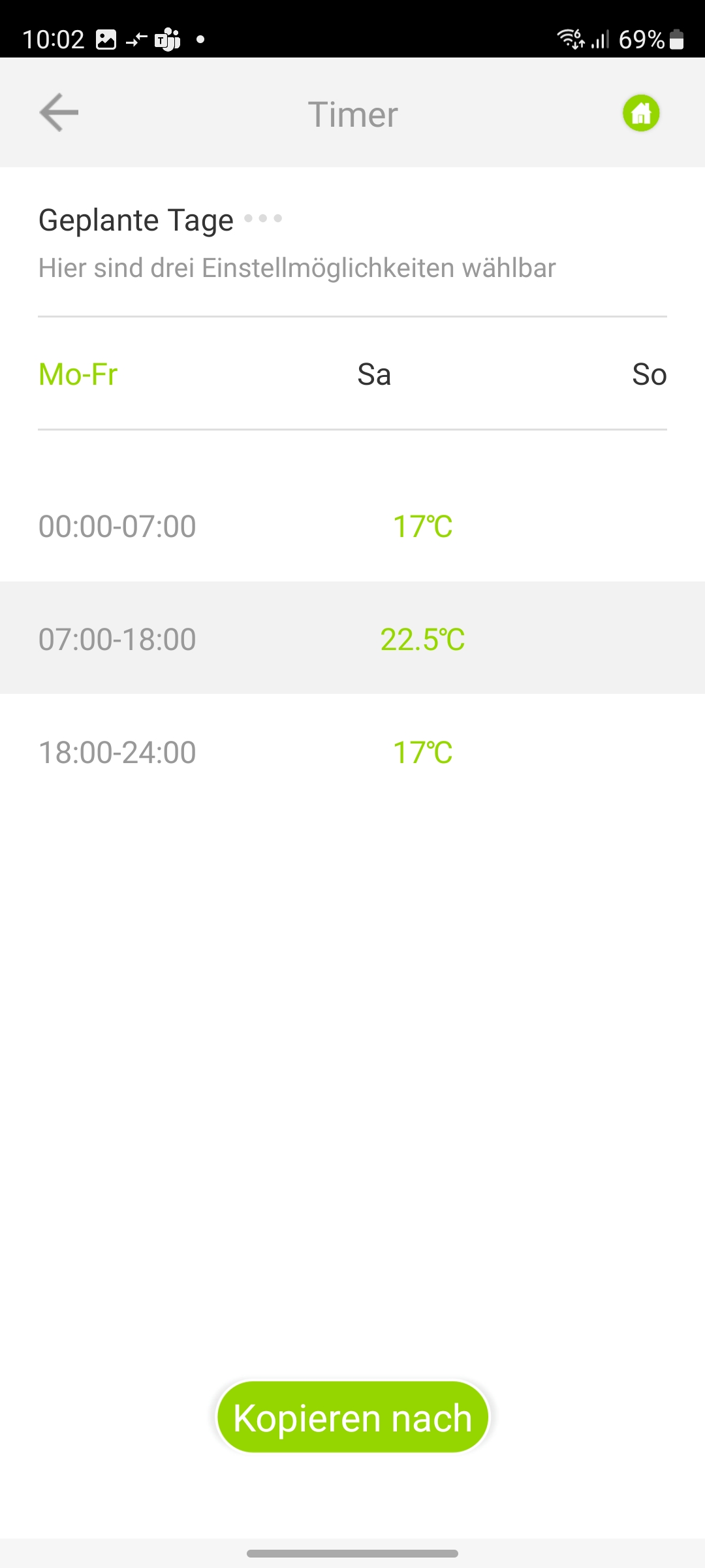 Das Erstellen von Heizplänen erfolgt über die Auswahl des Automatikmodus. Dort können Anwender Heizpläne für bestimmte Stunden und Tage erstellen. Dabei kann man diese grundsätzlich für jeden Tag oder für bestimmte Perioden wie Arbeitstage und Wochenende erstellen.