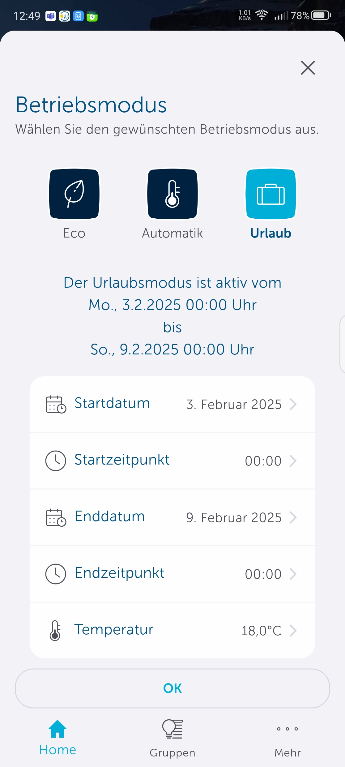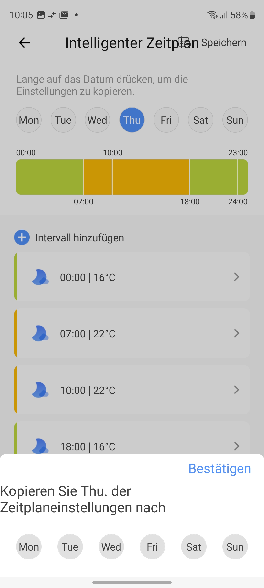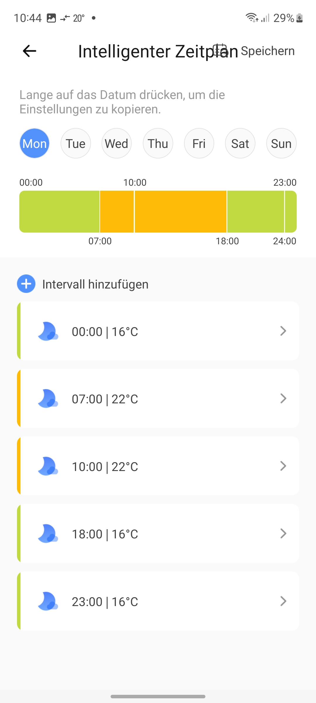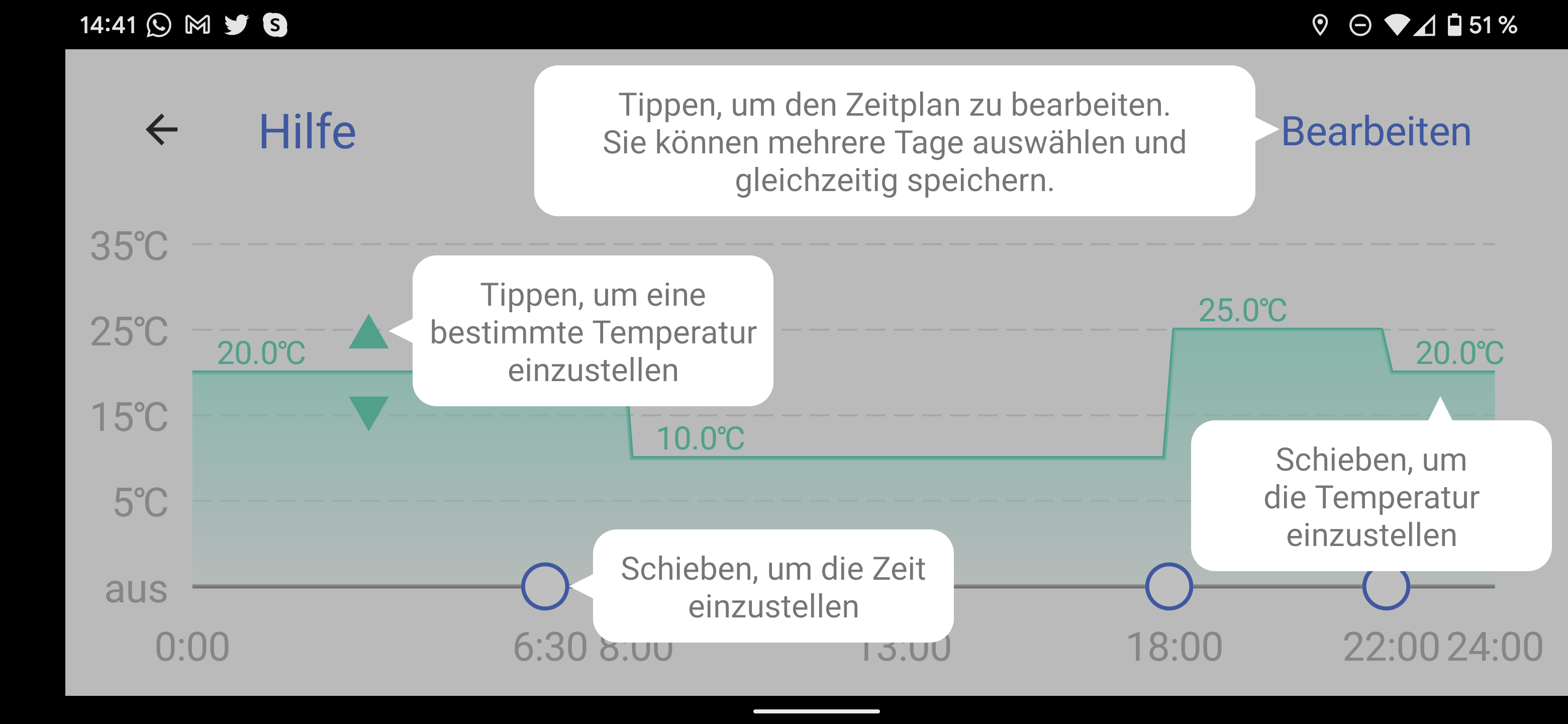 Das Erstellen von Heizplänen erfolgt über die Auswahl des Automatikmodus. Dort können Anwender Heizpläne für bestimmte Stunden und Tage erstellen. Dabei kann man diese grundsätzlich für jeden Tag oder für bestimmte Perioden wie Arbeitstage und Wochenende erstellen.