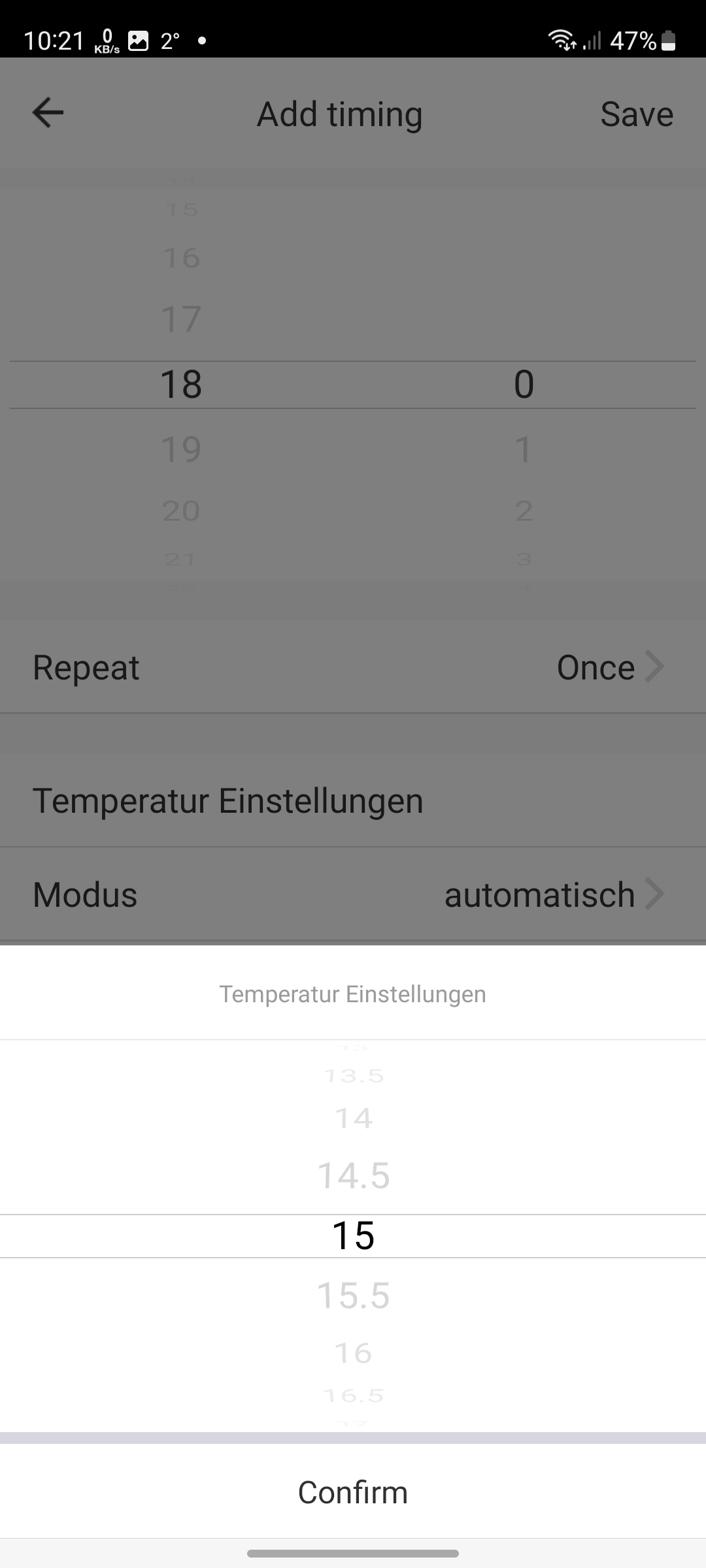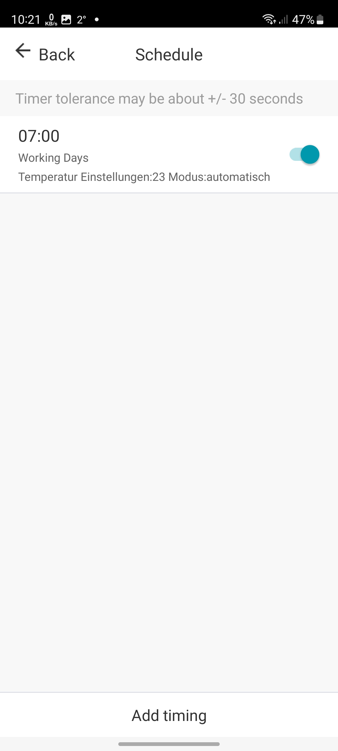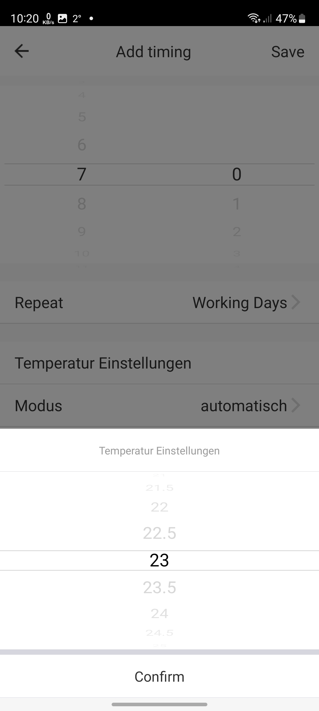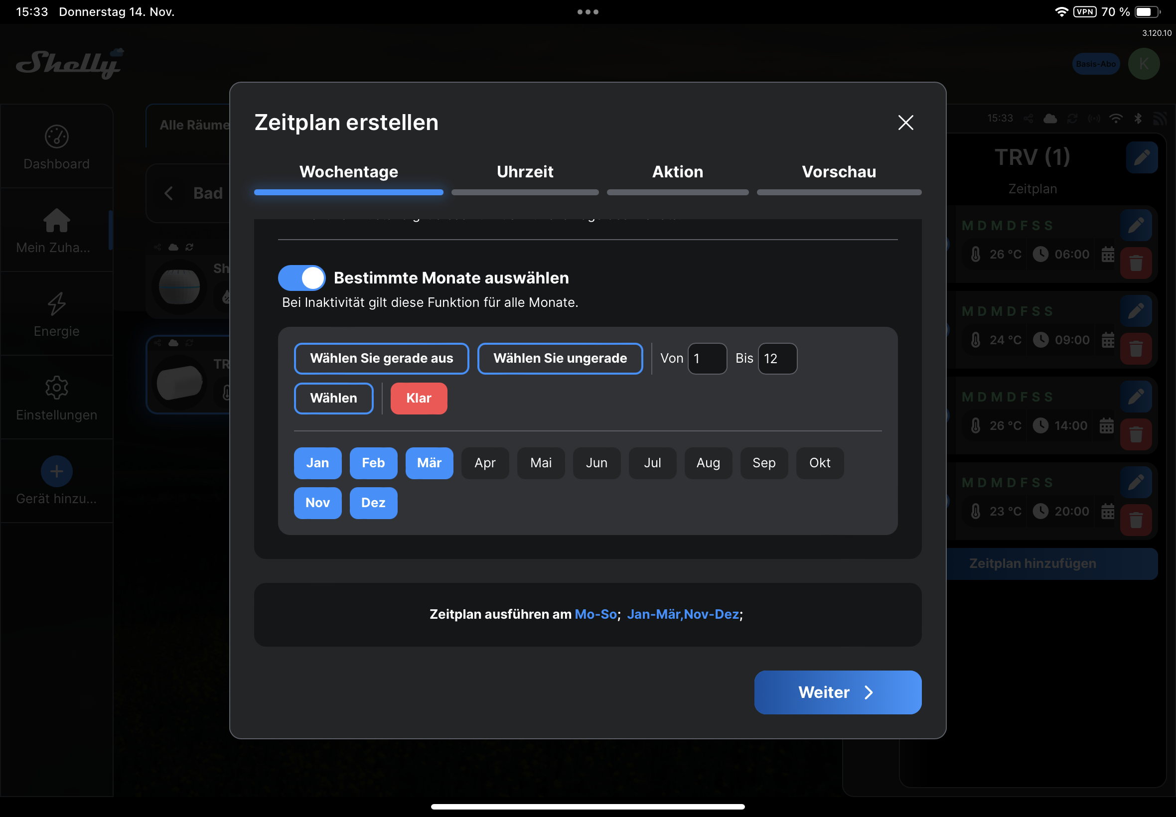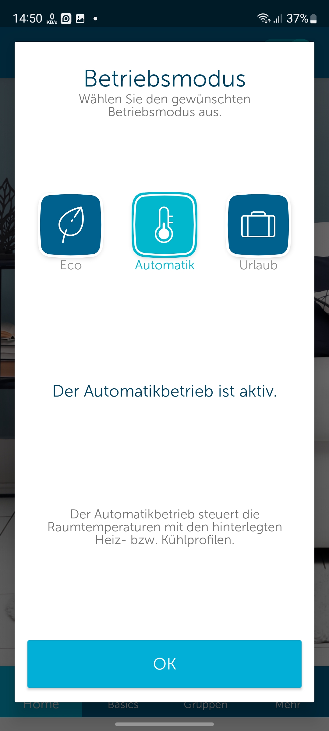 Das Erstellen von Heizplänen erfolgt über die Auswahl des Automatikmodus. Dort können Anwender Heizpläne für bestimmte Stunden und Tage erstellen. Dabei kann man diese grundsätzlich für jeden Tag oder für bestimmte Perioden wie Arbeitstage und Wochenende erstellen.