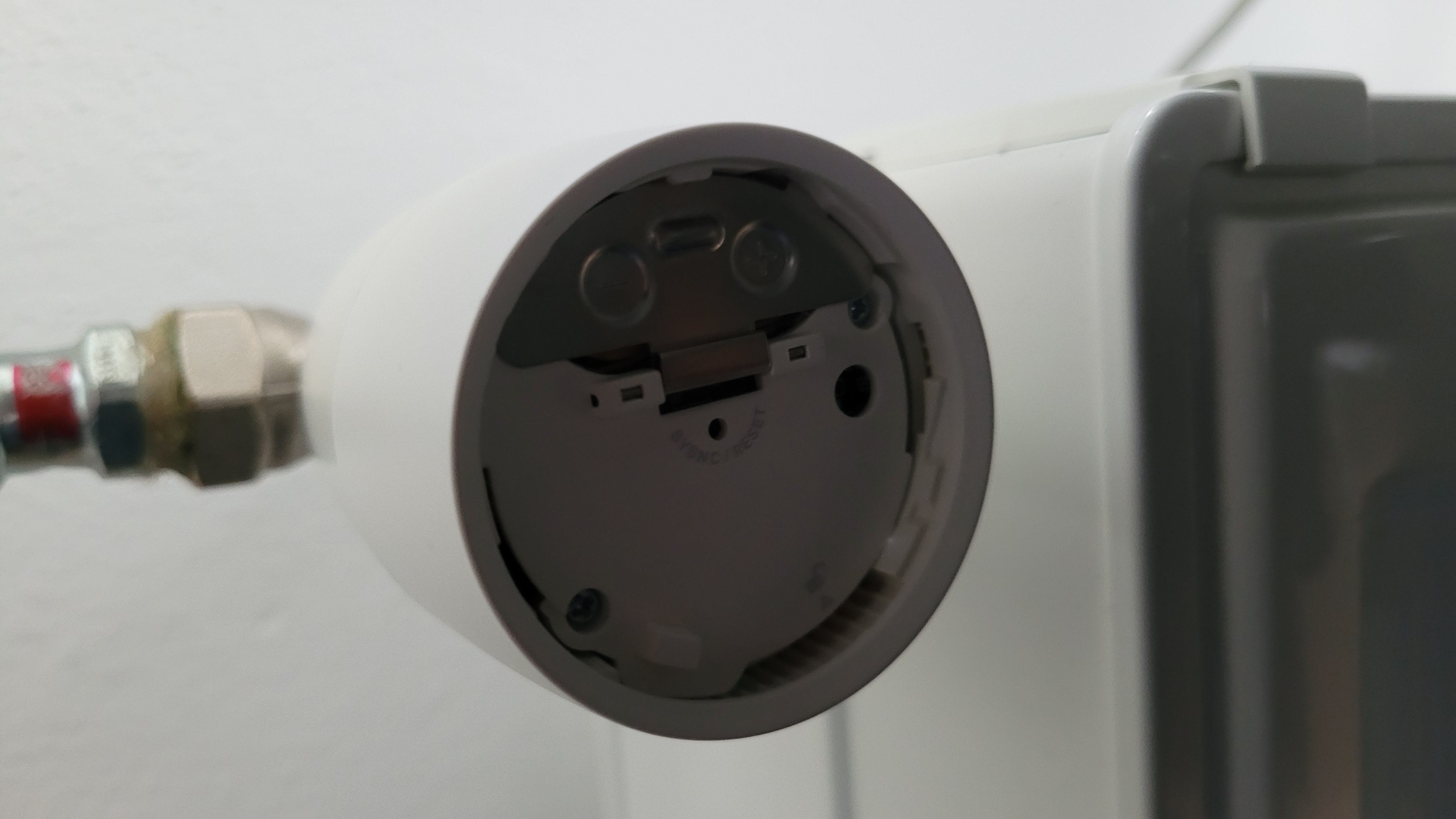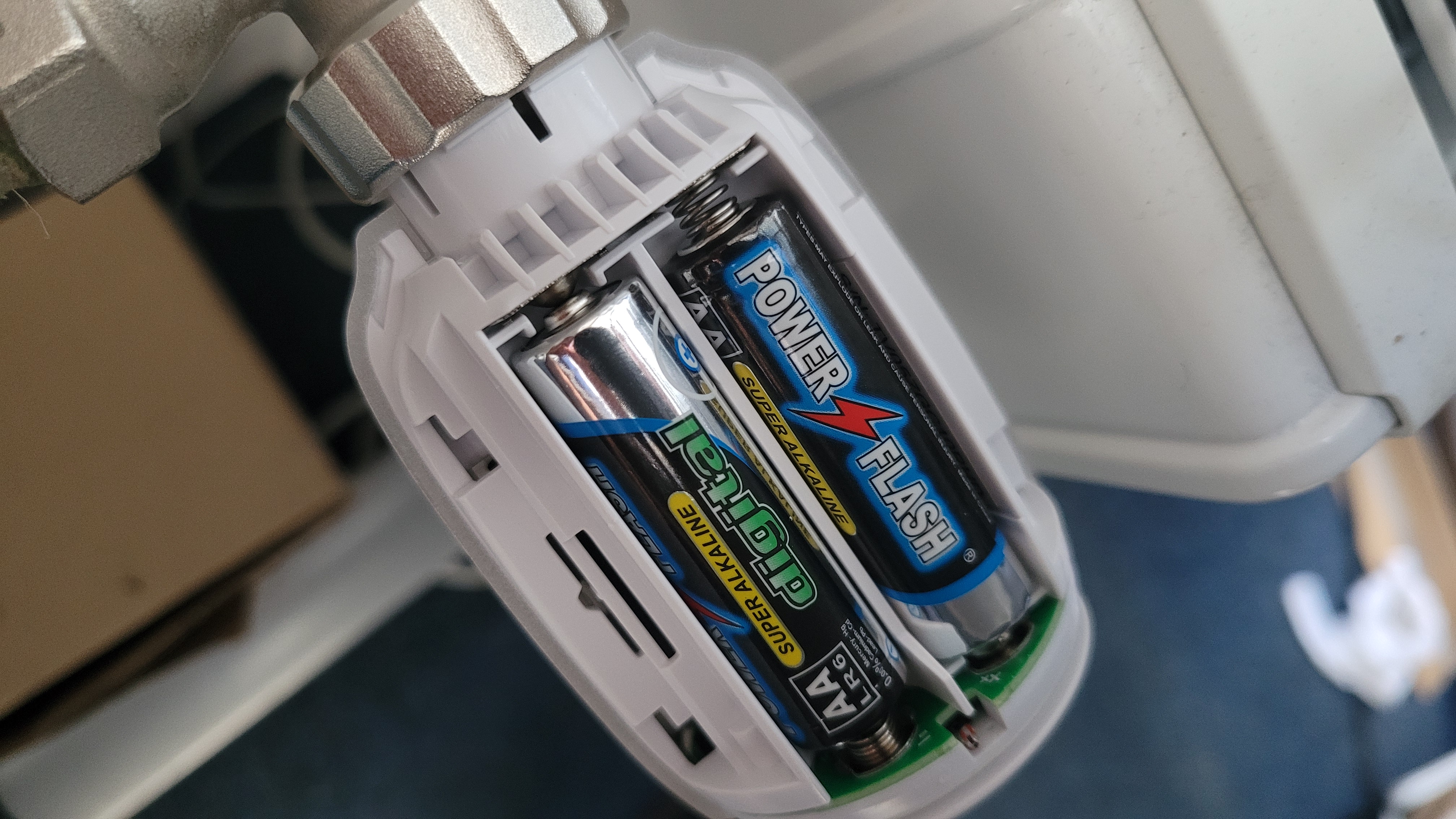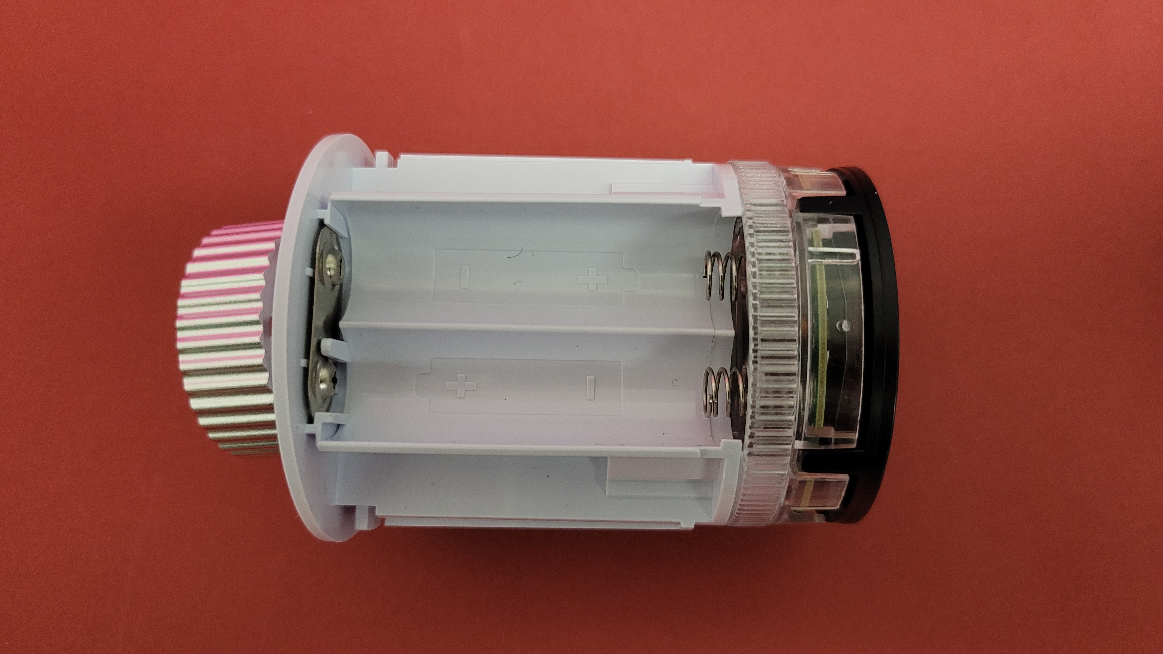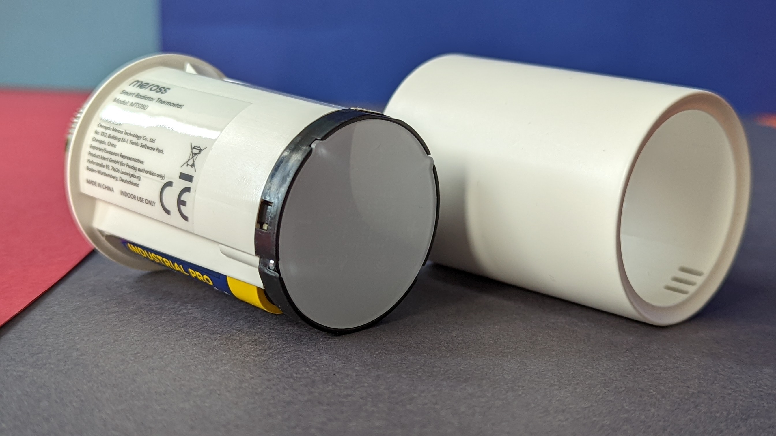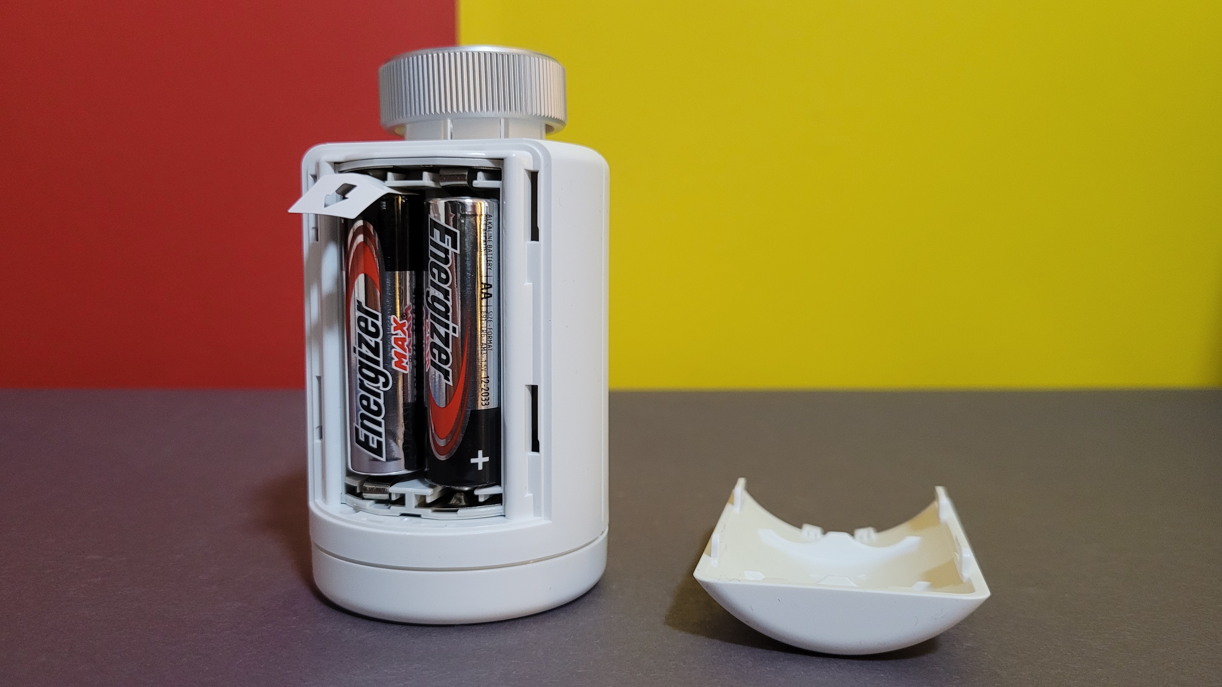 Die Meross-Thermostate benötigen zunächst zwei AA-Batterien. Diese liegen nicht bei und müssen laut Meross etwa einmal pro Jahr gewechselt werden. Um das Batteriefach zu erreichen, zieht man nach dem Drücken einer kleinen Kunststoffflasche den Zylinder von Thermostat. Das ist nicht elegant, aber funktionell. Derart gelingt der Batteriewechsel auch bei montiertem Thermostat.