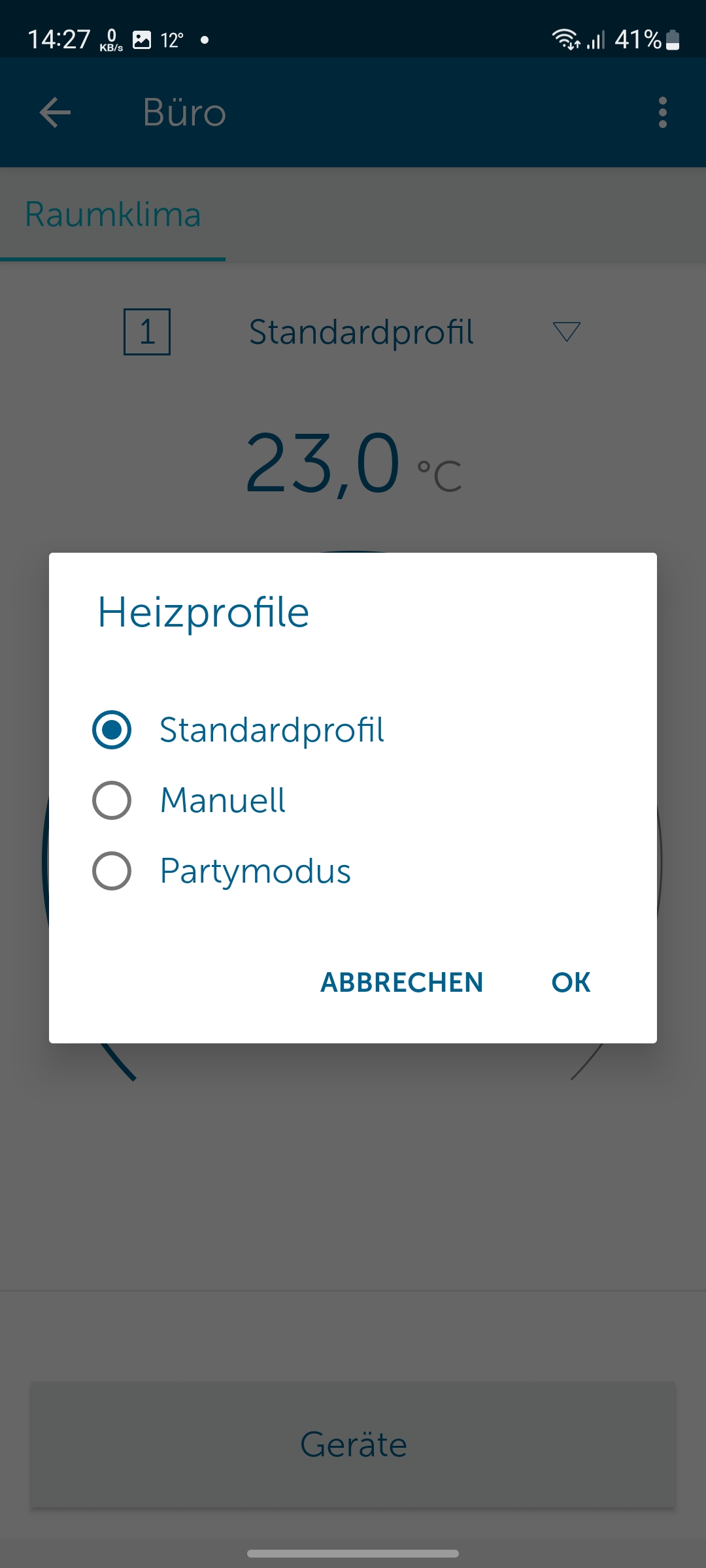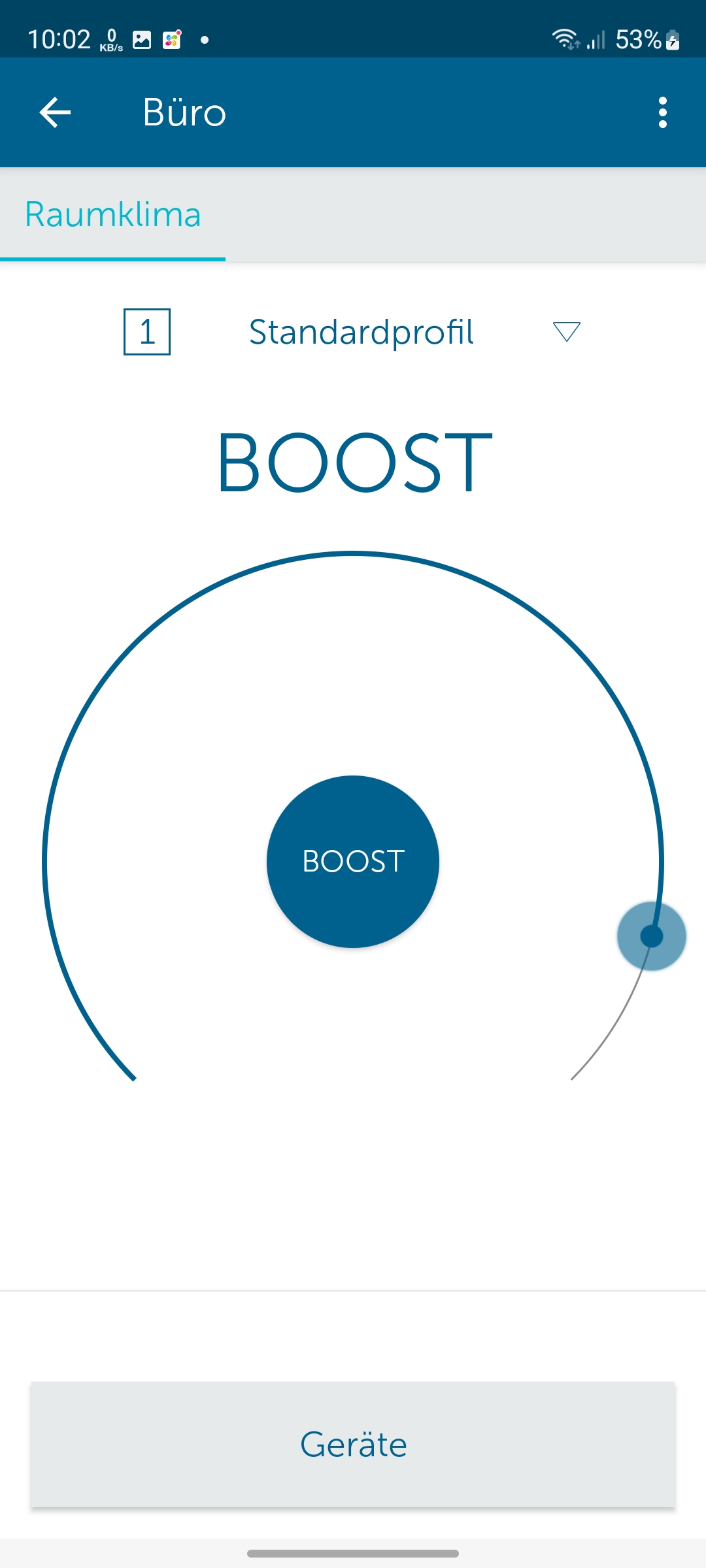 Auf der App-Startseite erscheint das Thermostat mit der eingestellten Solltemperatur. Nach einem Tipp darauf lässt sich diese ändern. Den Boost-Modus kann man hier ebenfalls aktivieren. Unten im Bildschirm erreichen wir über die Schaltfläche GERÄTE und Auswahl von Heizkörperthermostat Evo weitere Geräteeinstellungen. Unter Zuordnung kann man den Raum definieren. Die Aktivierung von Bediensperre verhindert die manuelle Steuerung am Thermostat. Wer Kinder im Haushalt hat, wird sich über dieses Feature freuen. Außerdem können noch Displayausrichtung und -Helligkeit sowie ein Temperatur-Offset justiert werden. Zudem stehen noch verschiedene Heizprofile zur Auswahl: Standardmäßig stehen dort die Optionen Standardprofil, Manuell und Partymodus parat. Der Partymodus ist eine Art Timer mit einer bestimmten Temperatur- und Zeiteinstellung. Ist die Zeit abgelaufen, wird wieder das zuvor ausgewählte Profil geladen.