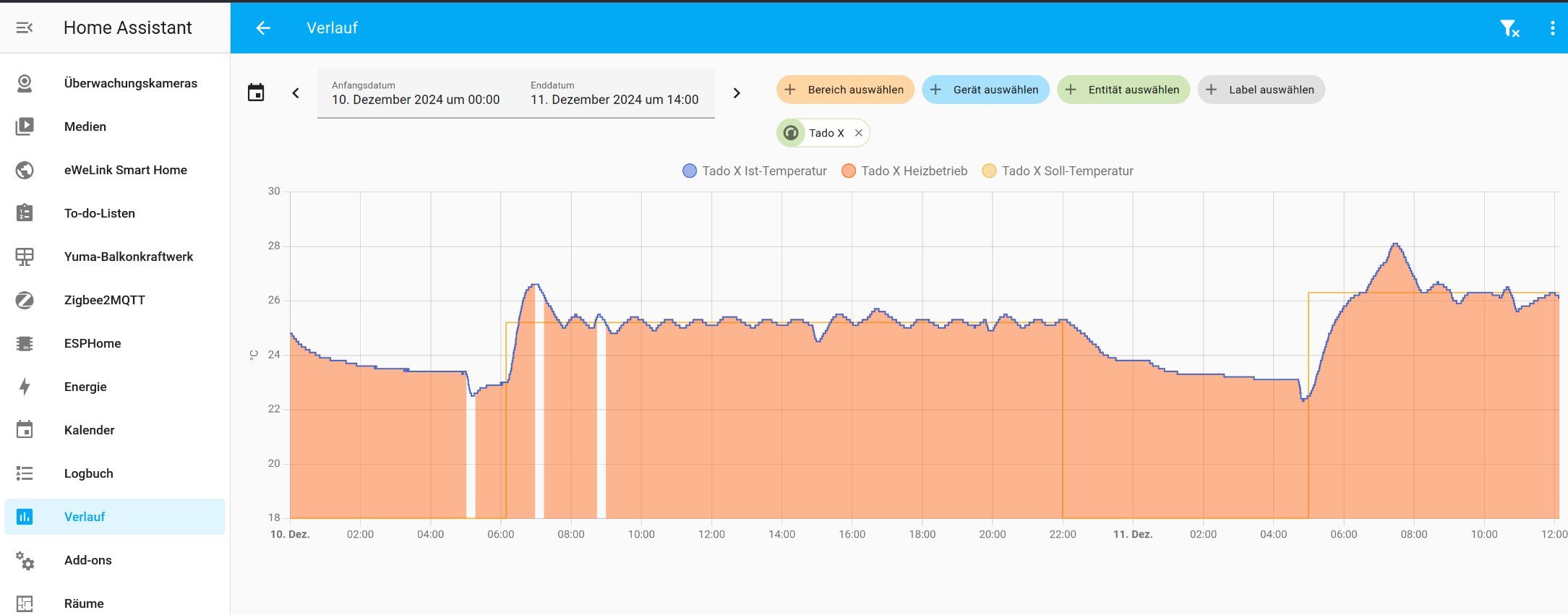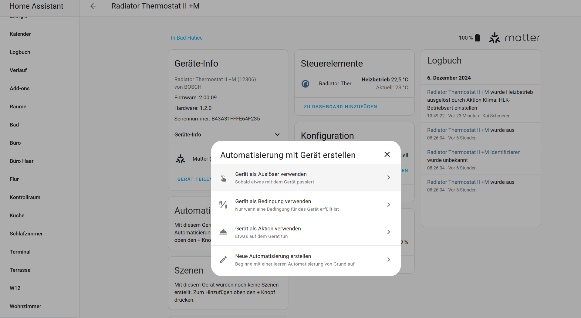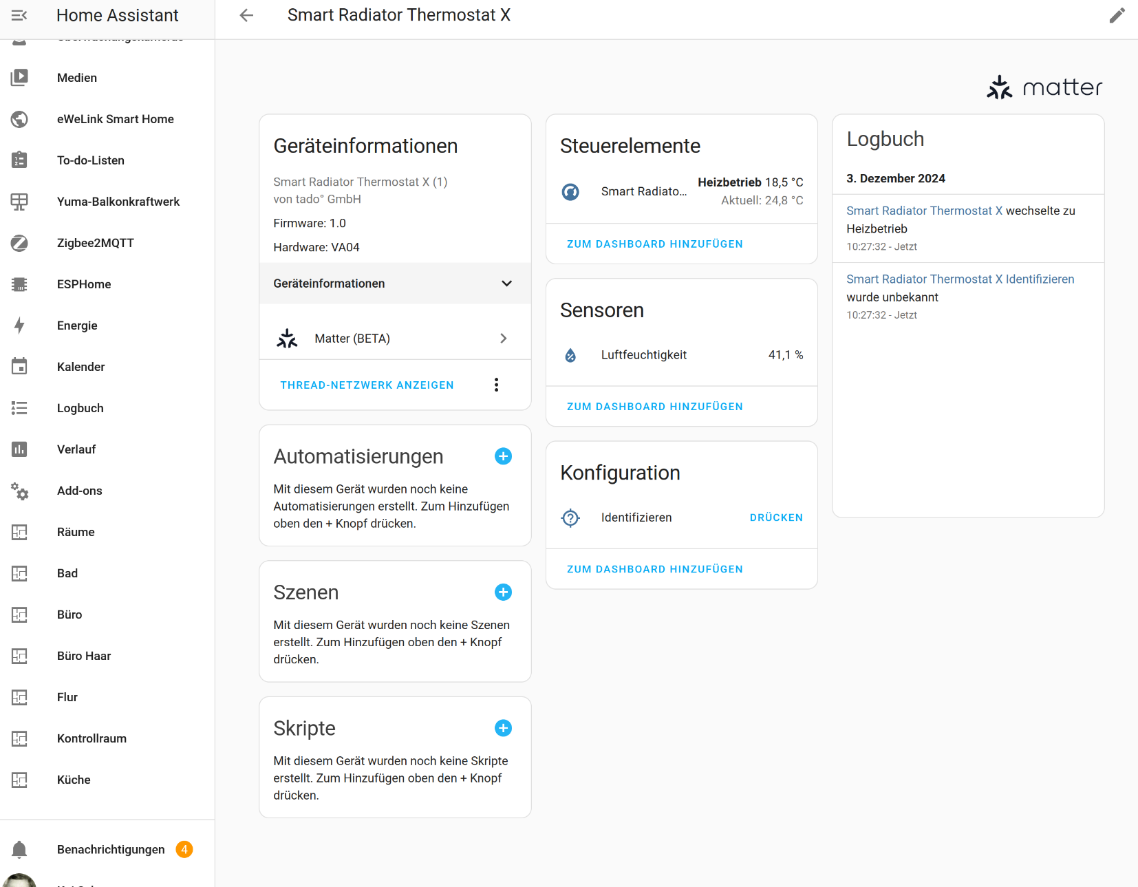 Auch unter Home Assistant funktioniert Tado X. Über Matter stehen allerdings nur wenige Funktionen zur Verfügung. Heizpläne lassen sich aber über Automatisierungen nachbilden. Und mit einem Tür-/Fenster-Sensor können Anwender eine deutlich effizientere Methode zur Fenster-Offen-Erkennung umsetzen als die auf einem Temperaturabfall basierende Methode in der Tado-App.